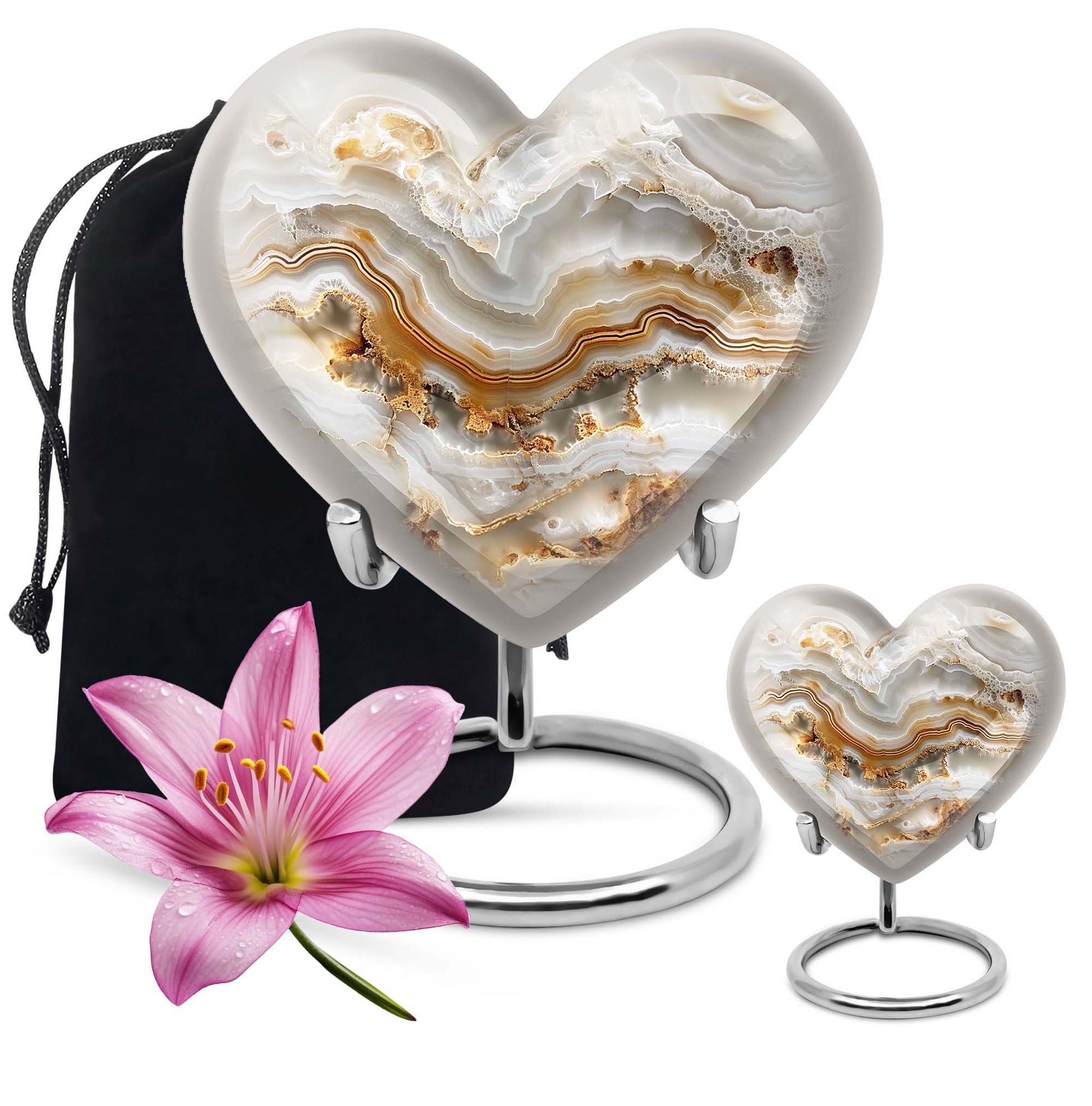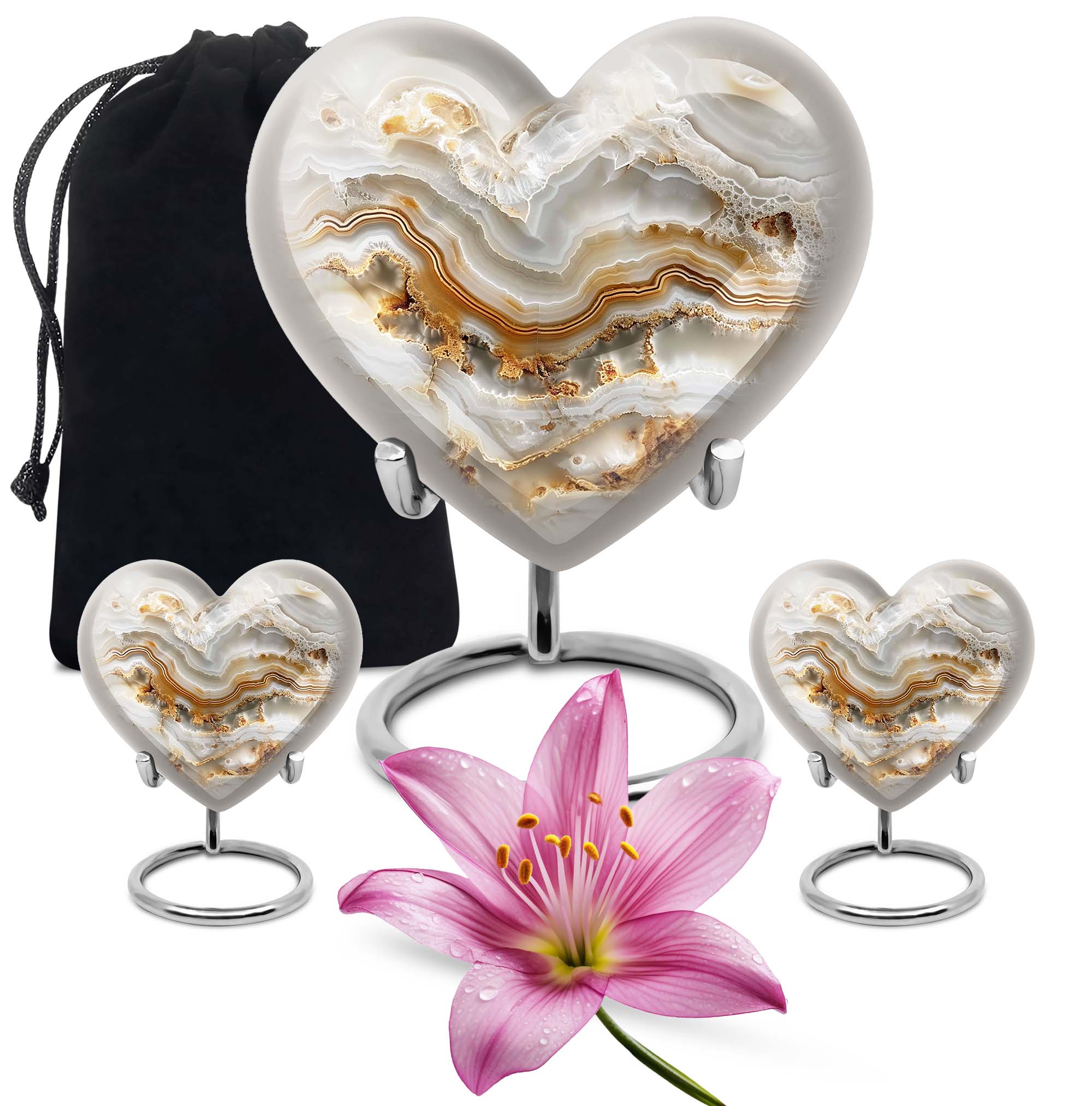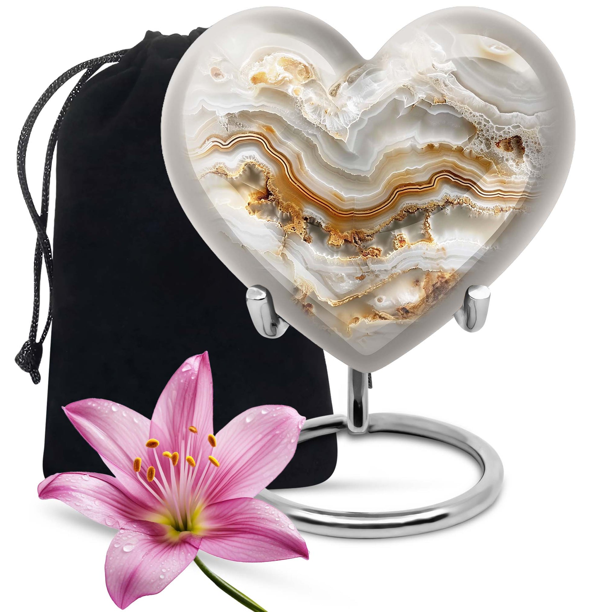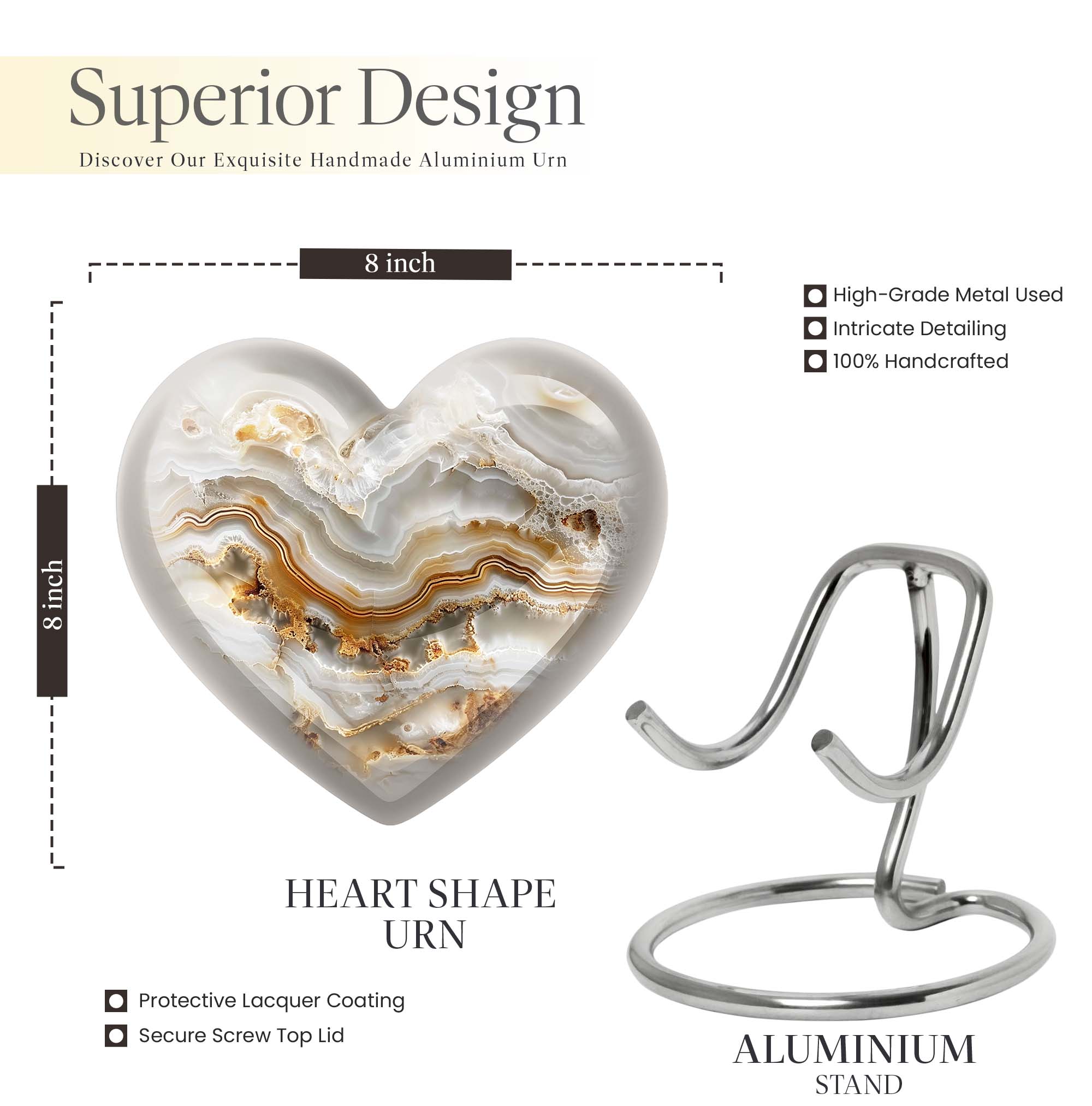 Experience a touching tribute to your loved ones with our Vibrant Swirl Urn - a memento that not only keeps the memory alive, but also serves as an artful abstract decor. Crafted from hard-wearing Aluminium, this large urn is light at just 3.3 pounds, yet sturdy to last the test of time. Respecting the scale, the 10-inch Heart Urn stands tall, housing up to 200 cubic inches of ashes. Make it more meaningful with our 'Personalize with engraved names' feature. Despite its grandeur, the urn caters to practicality through its velvet pouch provided for containment of ashes. Whether you're seeking burial urns for cremation ashes or human ash adult urns, this vibrant product caters both. The optimal choice for cremation adult urns for human ashes for men that delivers dignity with an element of style.