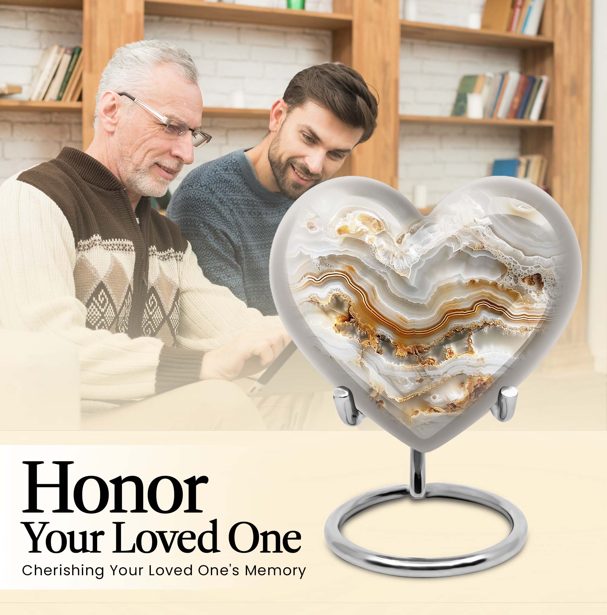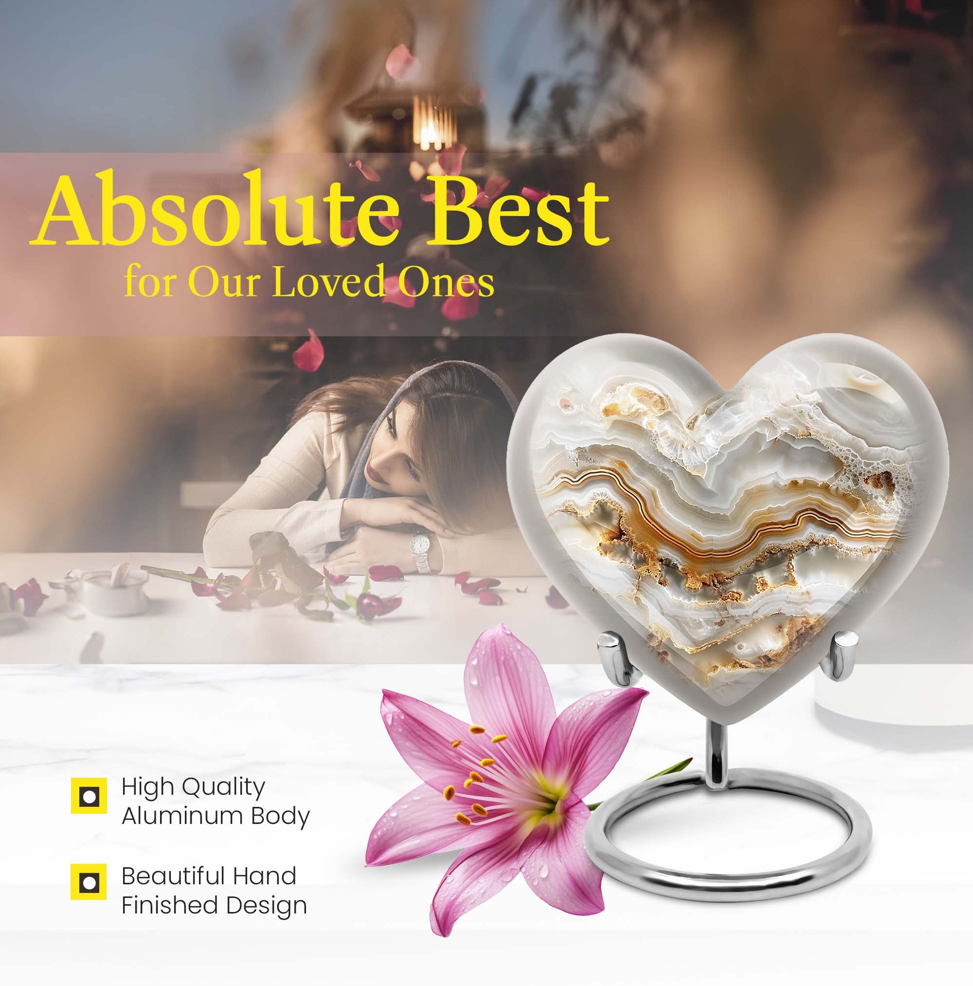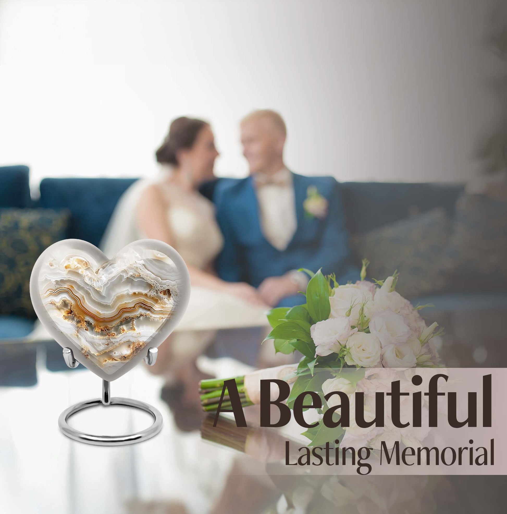 Experience a touching tribute to your loved ones with our Vibrant Swirl Urn - a memento that not only keeps the memory alive, but also serves as an artful abstract decor. Crafted from hard-wearing Aluminium, this large urn is light at just 3.3 pounds, yet sturdy to last the test of time. Respecting the scale, the 10-inch Heart Urn stands tall, housing up to 200 cubic inches of ashes. Make it more meaningful with our 'Personalize with engraved names' feature. Despite its grandeur, the urn caters to practicality through its velvet pouch provided for containment of ashes. Whether you're seeking burial urns for cremation ashes or human ash adult urns, this vibrant product caters both. The optimal choice for cremation adult urns for human ashes for men that delivers dignity with an element of style.