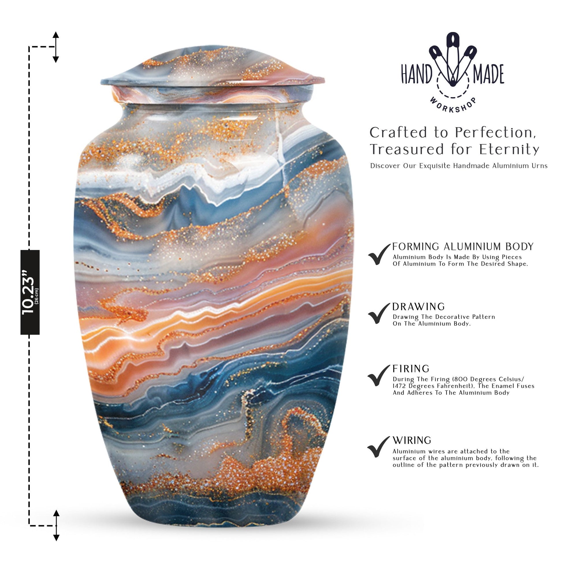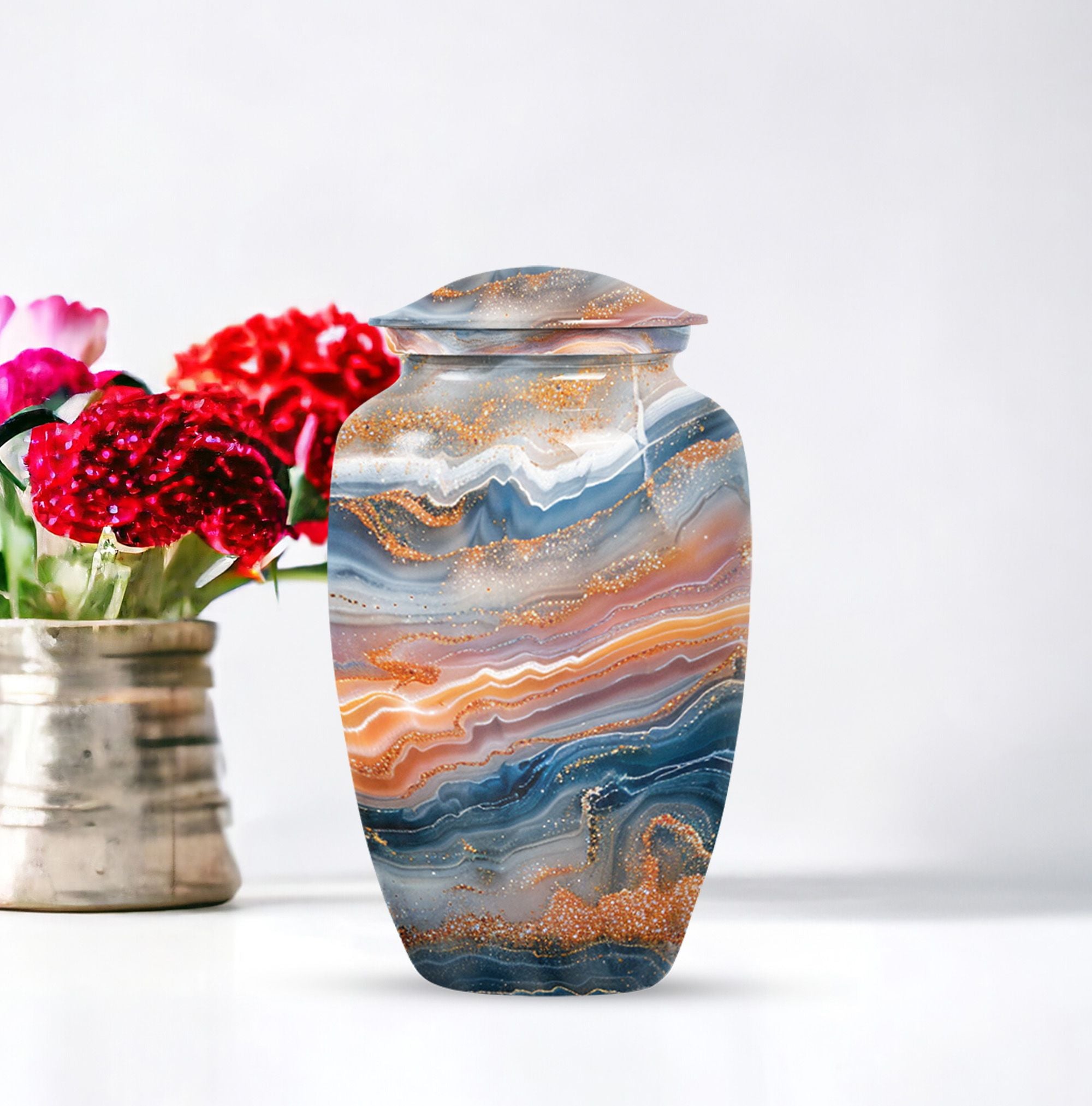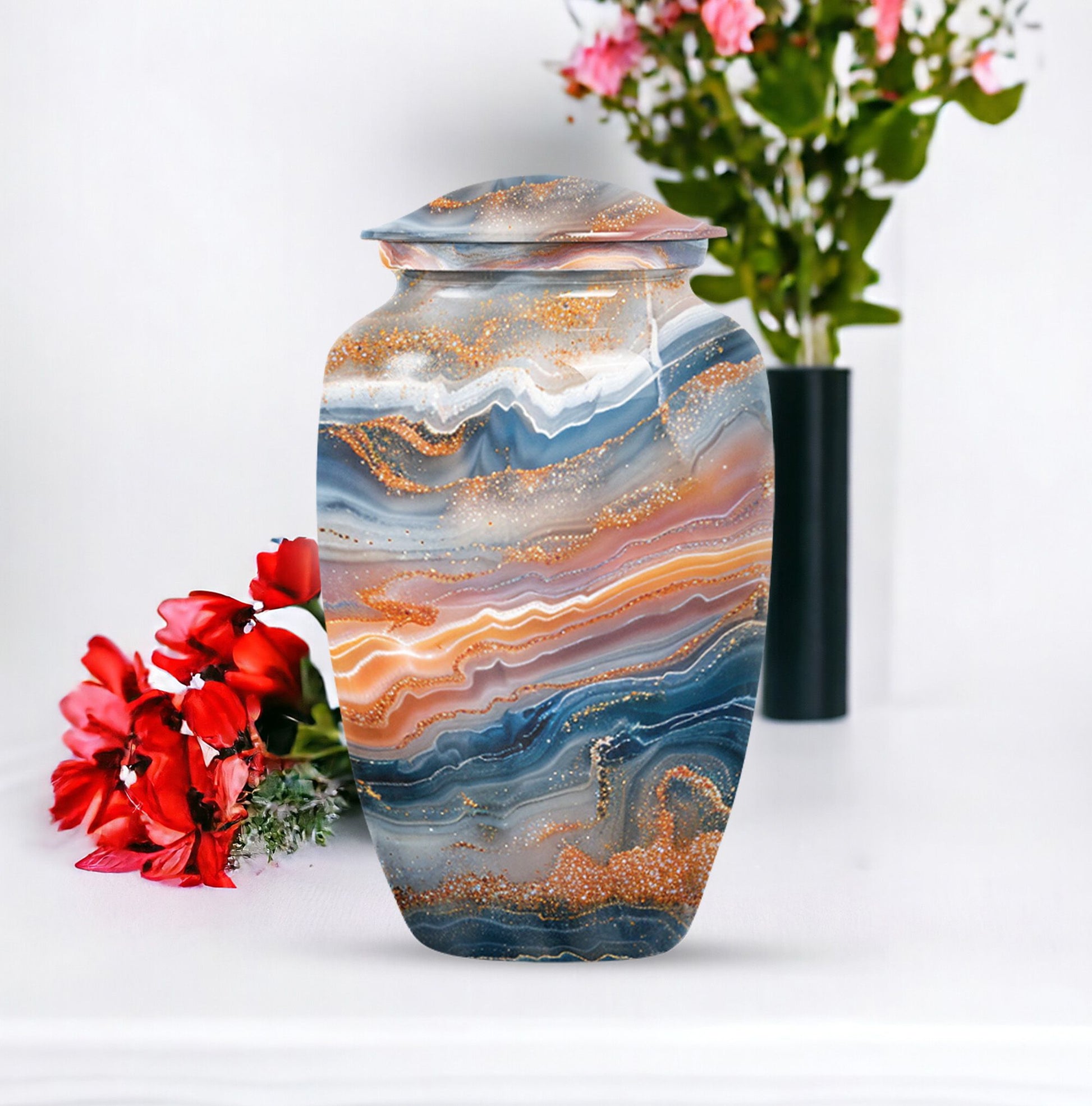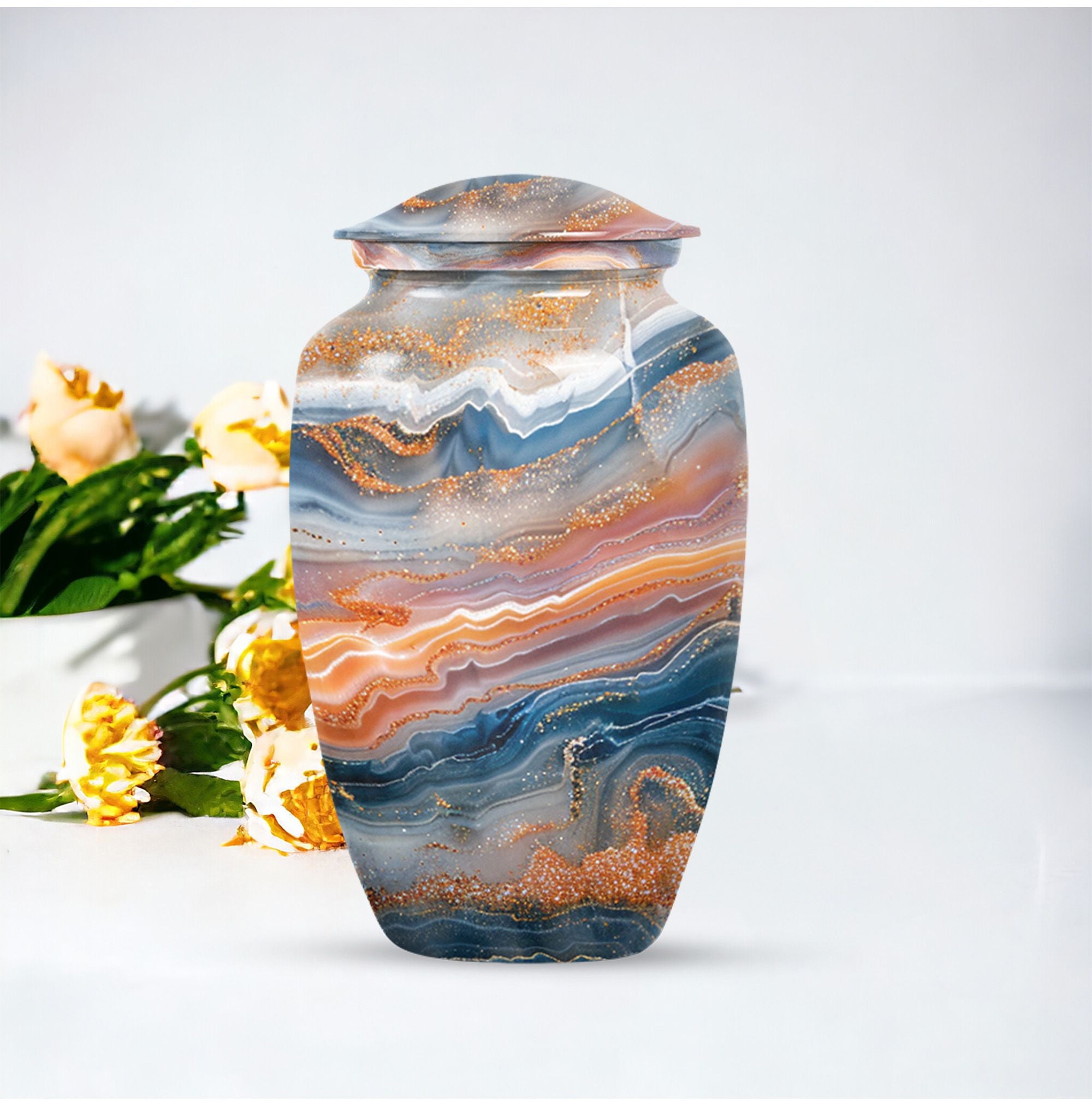Discover a discreet, dignified way to honor your dear departed with our Vibrant Swirl Urn. This 10-inch masterpiece combines utility and aesthetic appeal with a grab-worthy design that fits perfectly into any home decor. Its sturdily built from high-grade aluminium, giving it enough strength to last generations. This memorial urn for ashes for mom, or any other adult loved one, has an impressive carrying capacity of 200 cubic inches. Weighing at a substantial 3.3 pounds, it effortlessly doubles as an accent piece. Fusing intentional practicality with abstract themes, it holds a prominent spot among funeral urns for adult ashes. Our package ensures secure containment with a sophisticated velvet pouch to gently cradle the ashes. Plus, our customization option allows you to etch your loved one’s name onto this large urn, creating an intimate connection that transcends mortality. Easily doubles as an outdoor urn or a burial urn owing to its resilient metal fabrication. When it comes to memorial urns, our Vibrant Swirl Urn is a stand-alone candidate transcending pure functionality into a realm of sentimentality.