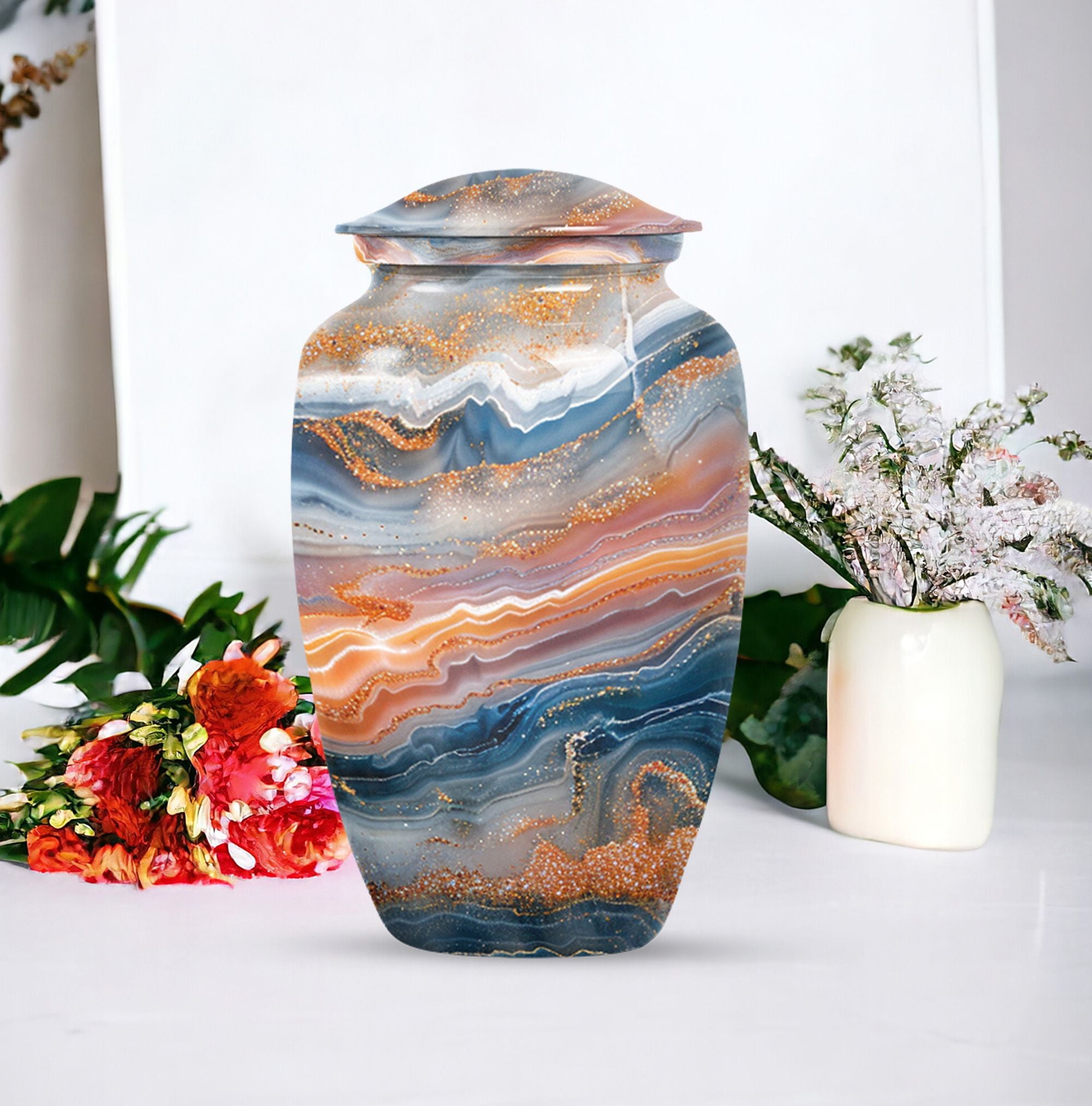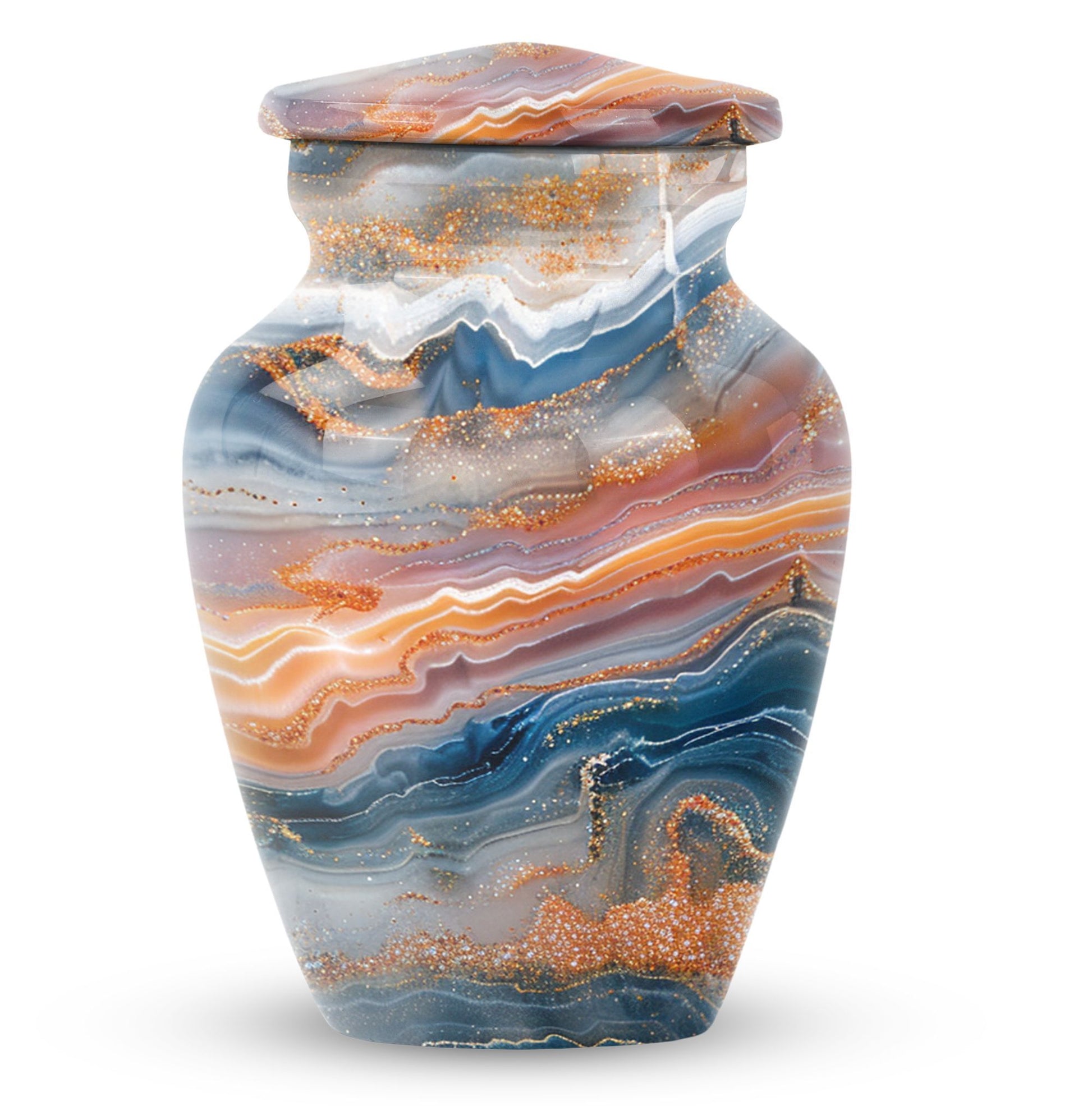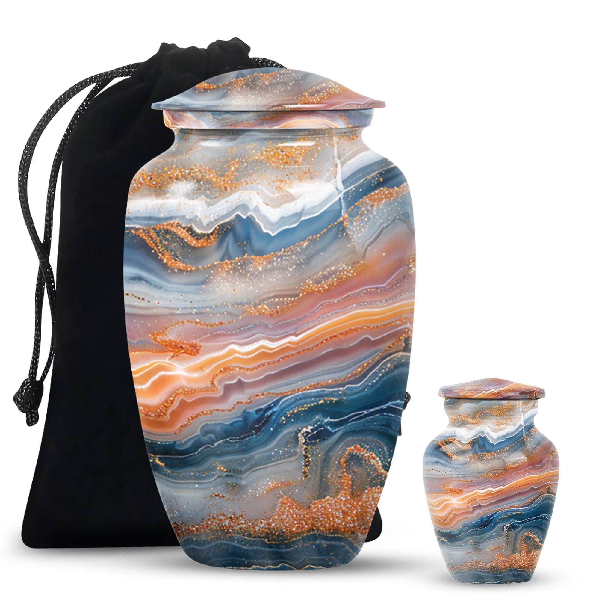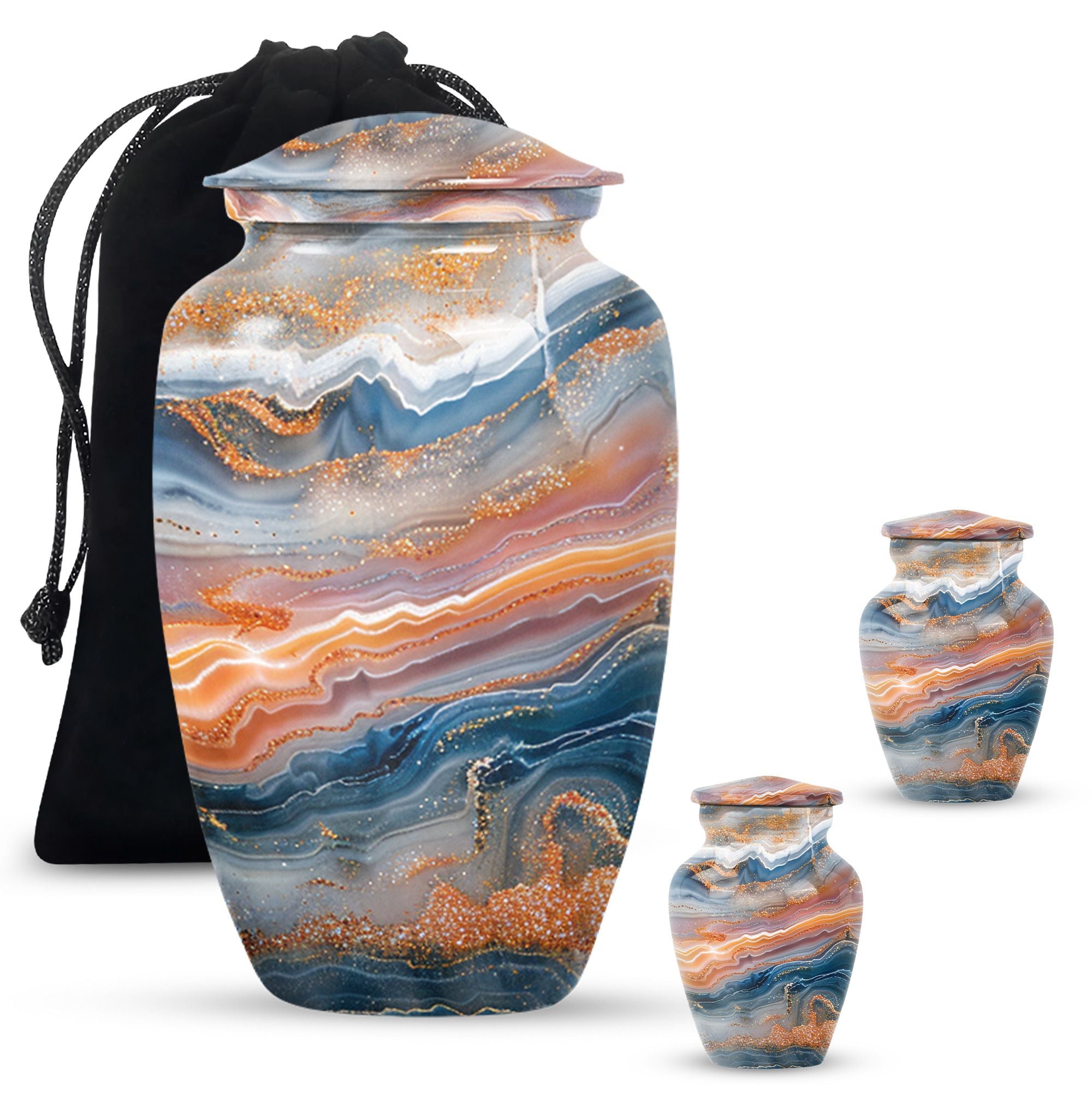 Discover a discreet, dignified way to honor your dear departed with our Vibrant Swirl Urn. This 10-inch masterpiece combines utility and aesthetic appeal with a grab-worthy design that fits perfectly into any home decor. Its sturdily built from high-grade aluminium, giving it enough strength to last generations. This memorial urn for ashes for mom, or any other adult loved one, has an impressive carrying capacity of 200 cubic inches. Weighing at a substantial 3.3 pounds, it effortlessly doubles as an accent piece. Fusing intentional practicality with abstract themes, it holds a prominent spot among funeral urns for adult ashes. Our package ensures secure containment with a sophisticated velvet pouch to gently cradle the ashes. Plus, our customization option allows you to etch your loved one’s name onto this large urn, creating an intimate connection that transcends mortality. Easily doubles as an outdoor urn or a burial urn owing to its resilient metal fabrication. When it comes to memorial urns, our Vibrant Swirl Urn is a stand-alone candidate transcending pure functionality into a realm of sentimentality.