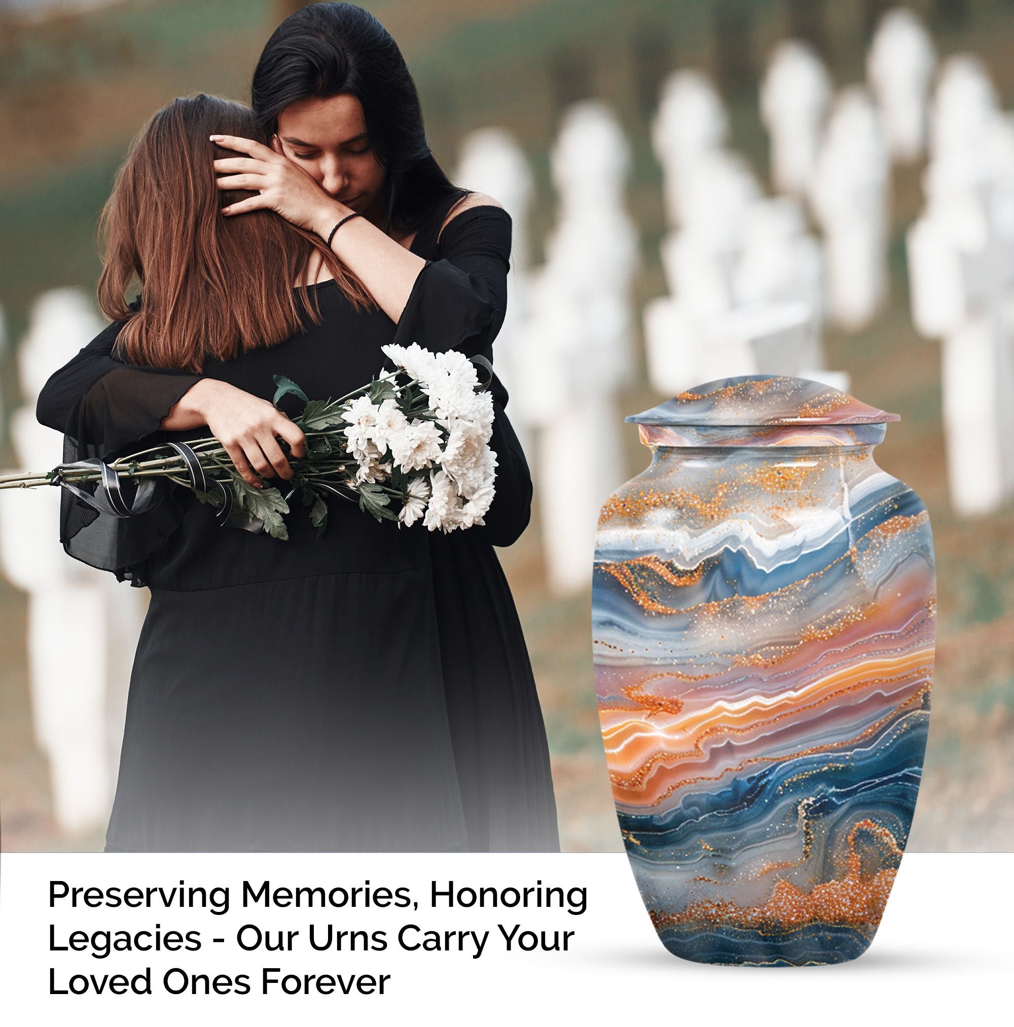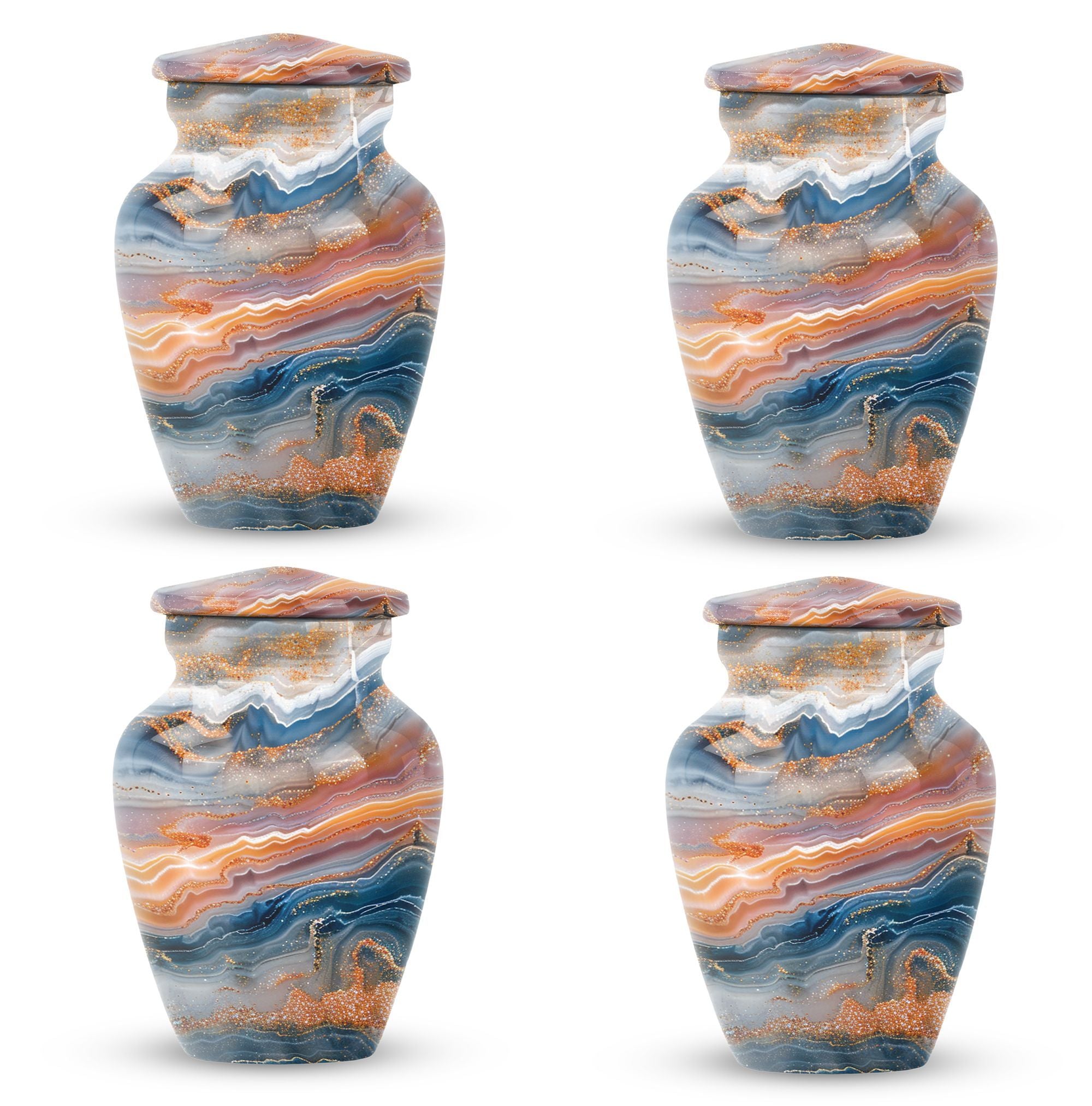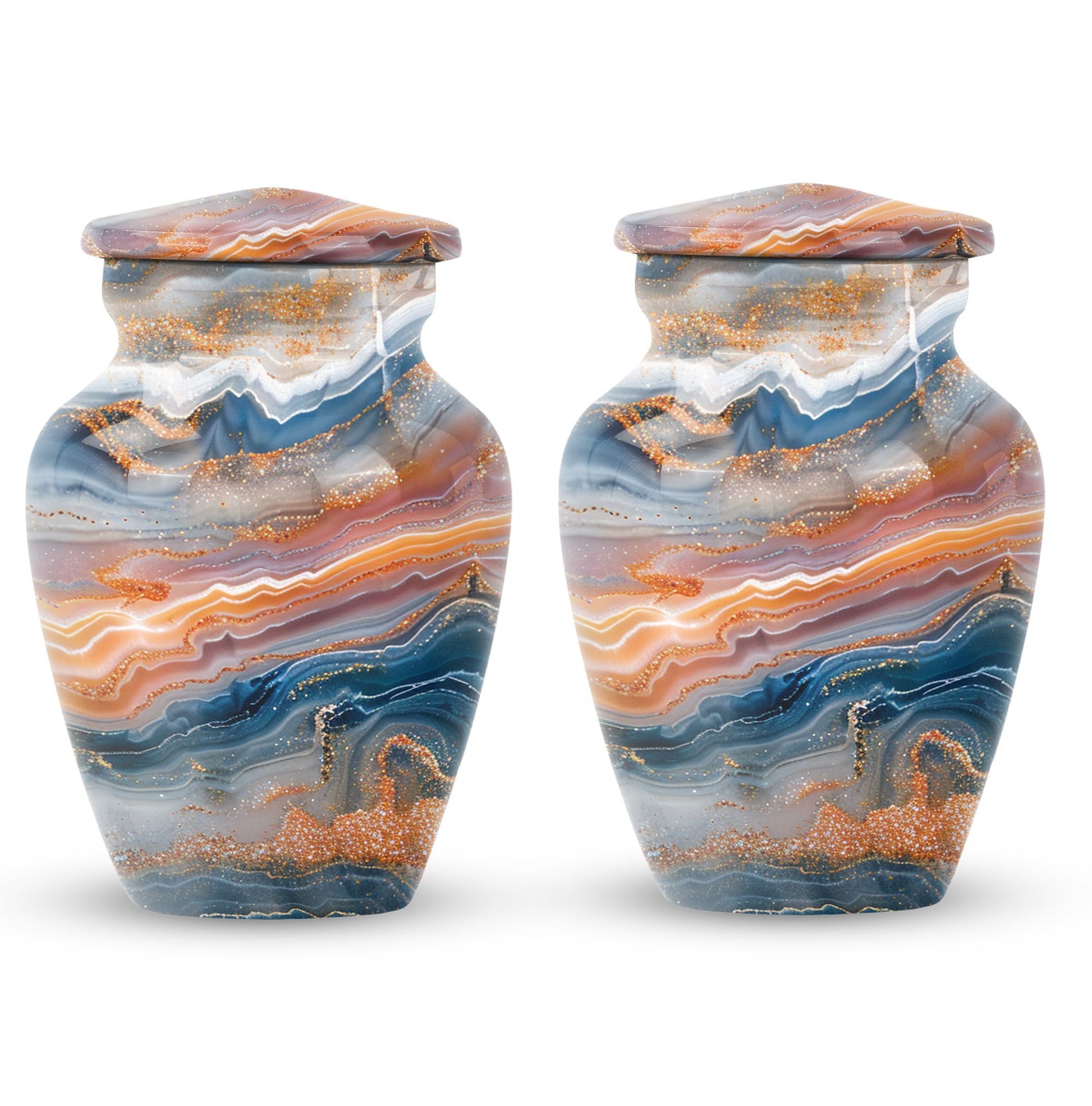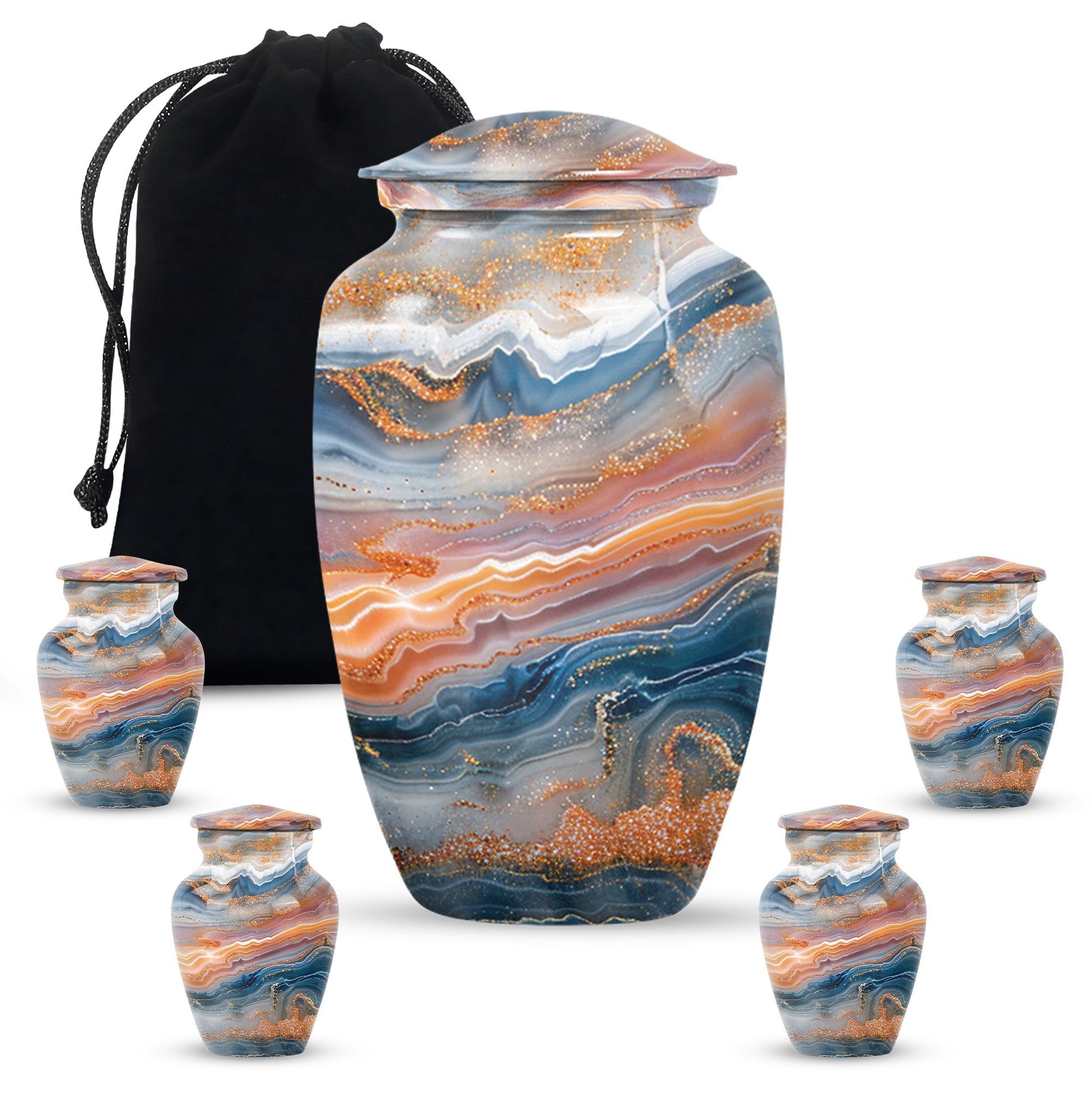 Discover a discreet, dignified way to honor your dear departed with our Vibrant Swirl Urn. This 10-inch masterpiece combines utility and aesthetic appeal with a grab-worthy design that fits perfectly into any home decor. Its sturdily built from high-grade aluminium, giving it enough strength to last generations. This memorial urn for ashes for mom, or any other adult loved one, has an impressive carrying capacity of 200 cubic inches. Weighing at a substantial 3.3 pounds, it effortlessly doubles as an accent piece. Fusing intentional practicality with abstract themes, it holds a prominent spot among funeral urns for adult ashes. Our package ensures secure containment with a sophisticated velvet pouch to gently cradle the ashes. Plus, our customization option allows you to etch your loved one’s name onto this large urn, creating an intimate connection that transcends mortality. Easily doubles as an outdoor urn or a burial urn owing to its resilient metal fabrication. When it comes to memorial urns, our Vibrant Swirl Urn is a stand-alone candidate transcending pure functionality into a realm of sentimentality.