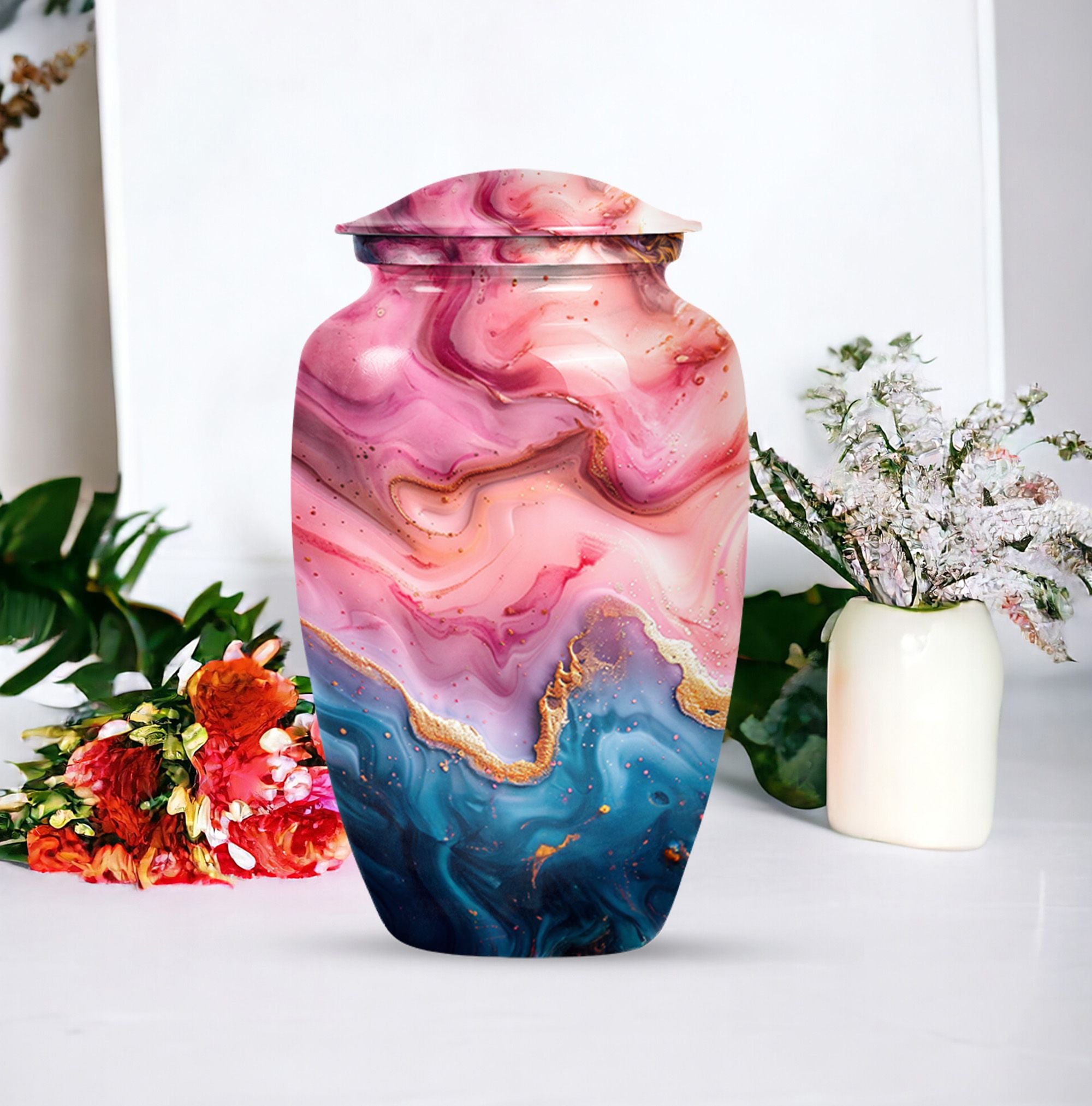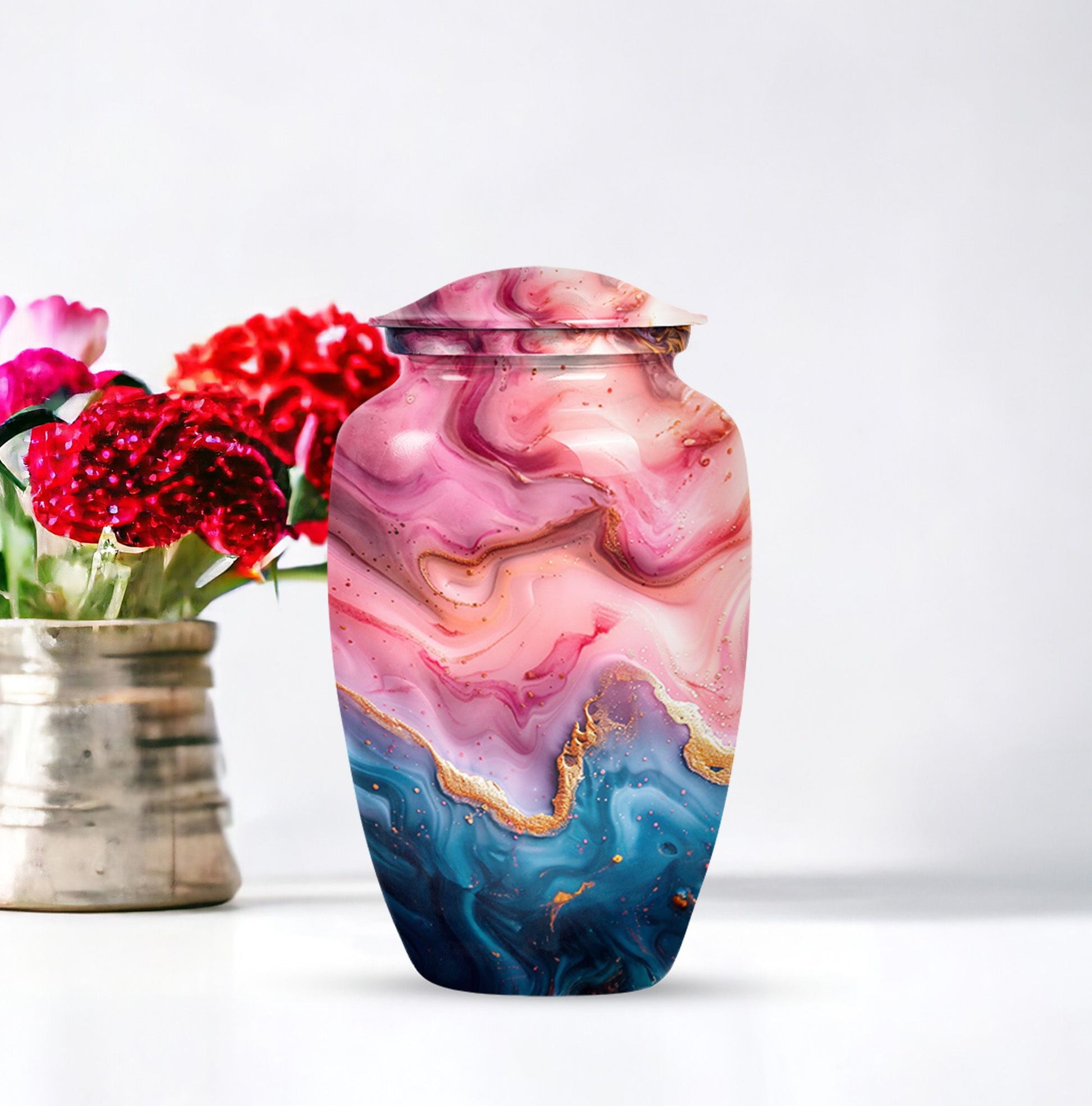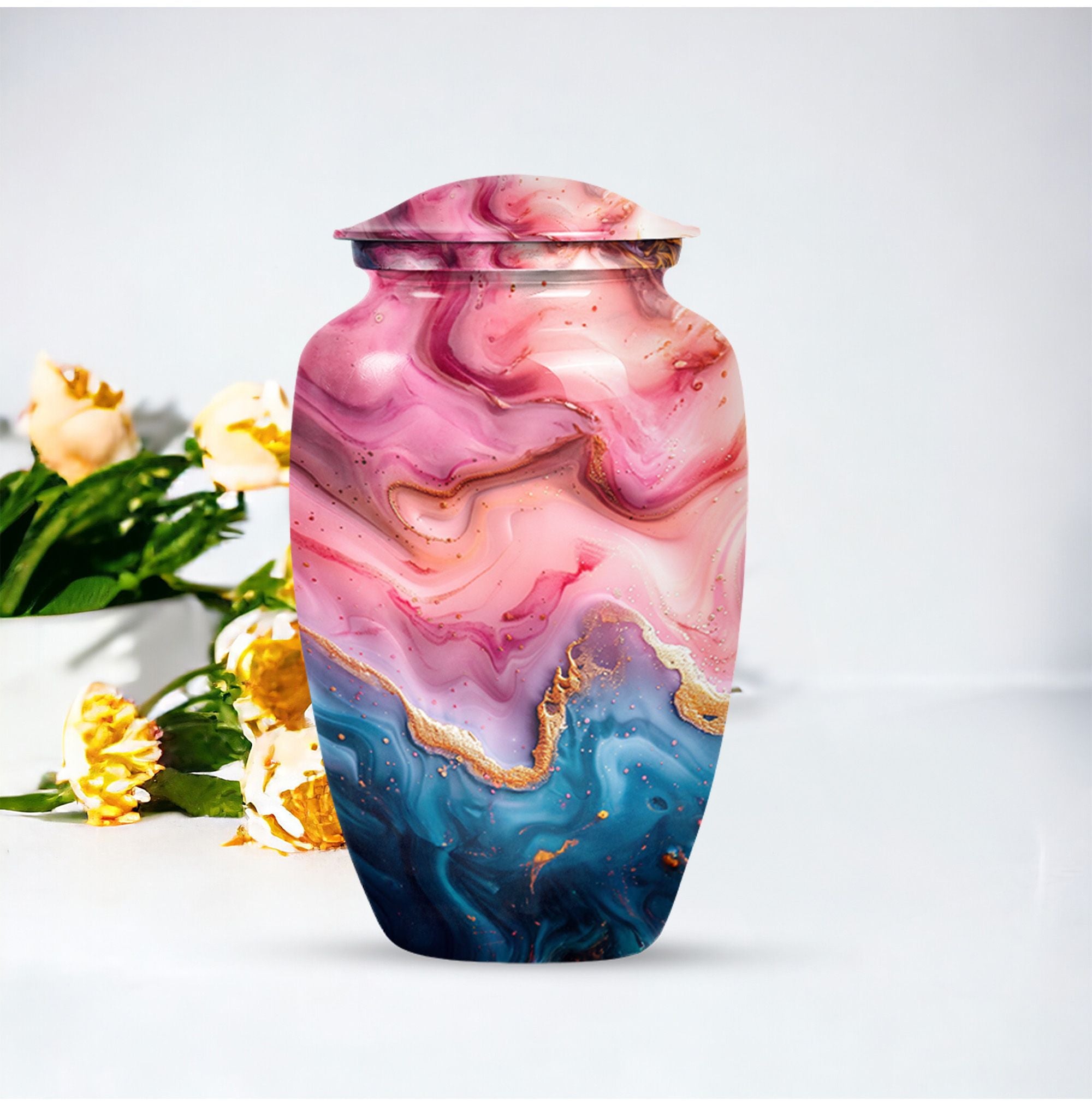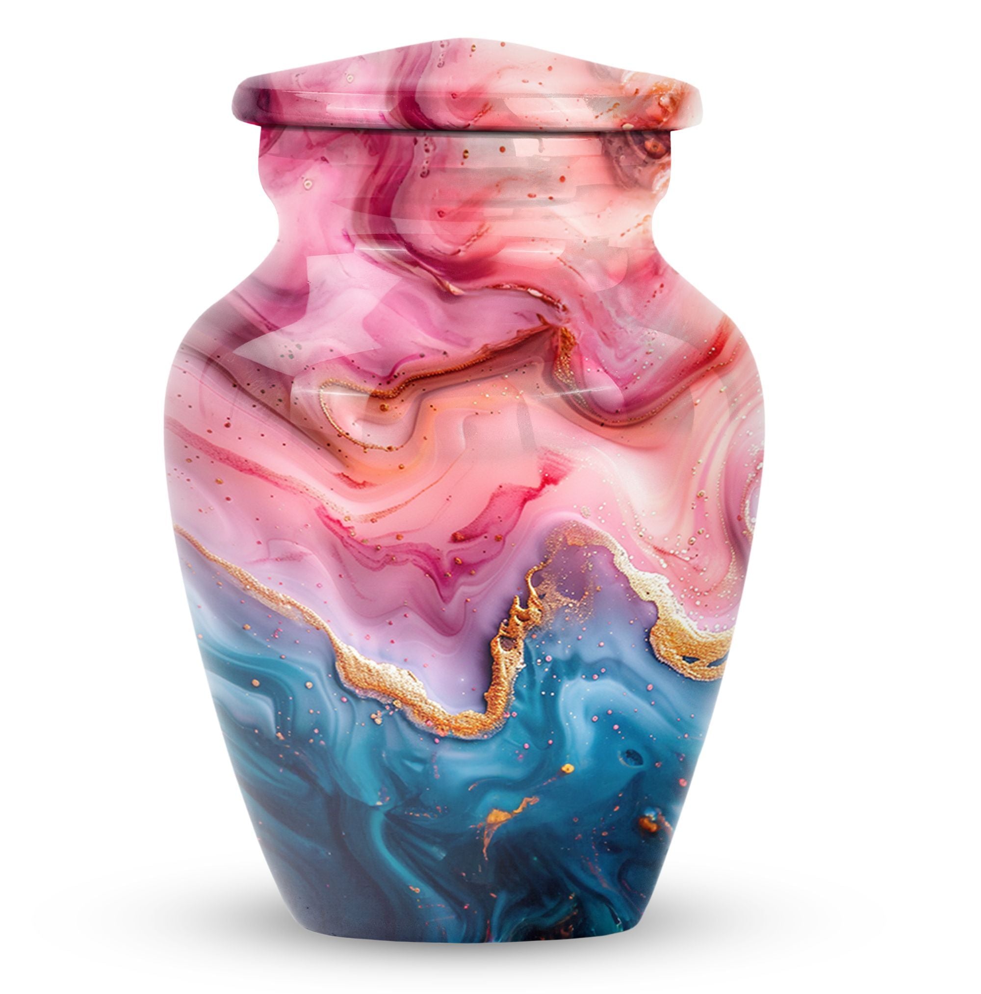 Cherish the memories of your loved ones with this Vibrant Swirl Urn, a beautifully crafted item from our memorial funeral urn selection. This large aluminium urn measures 10 inches in height and can accommodate up to 200 cubic inches of remains, making it ideal for adult use. With a unique abstract theme and a traditional classic urn style, it serves as a dignified final resting place. Balancing utility and sentimentality, this 3.3 pound urn comes with a premium velvet pouch for containment of ashes, adding an extra touch of care and respect. Boost its sentimental value by personalizing it with engraved names. Keywords such as 'Funeral urns for burial,' and 'mom cremation urn' highlight its purpose wonderfully. Acquiring this masterpiece of a memorial urn assures both solace and honor for your departed loved ones.