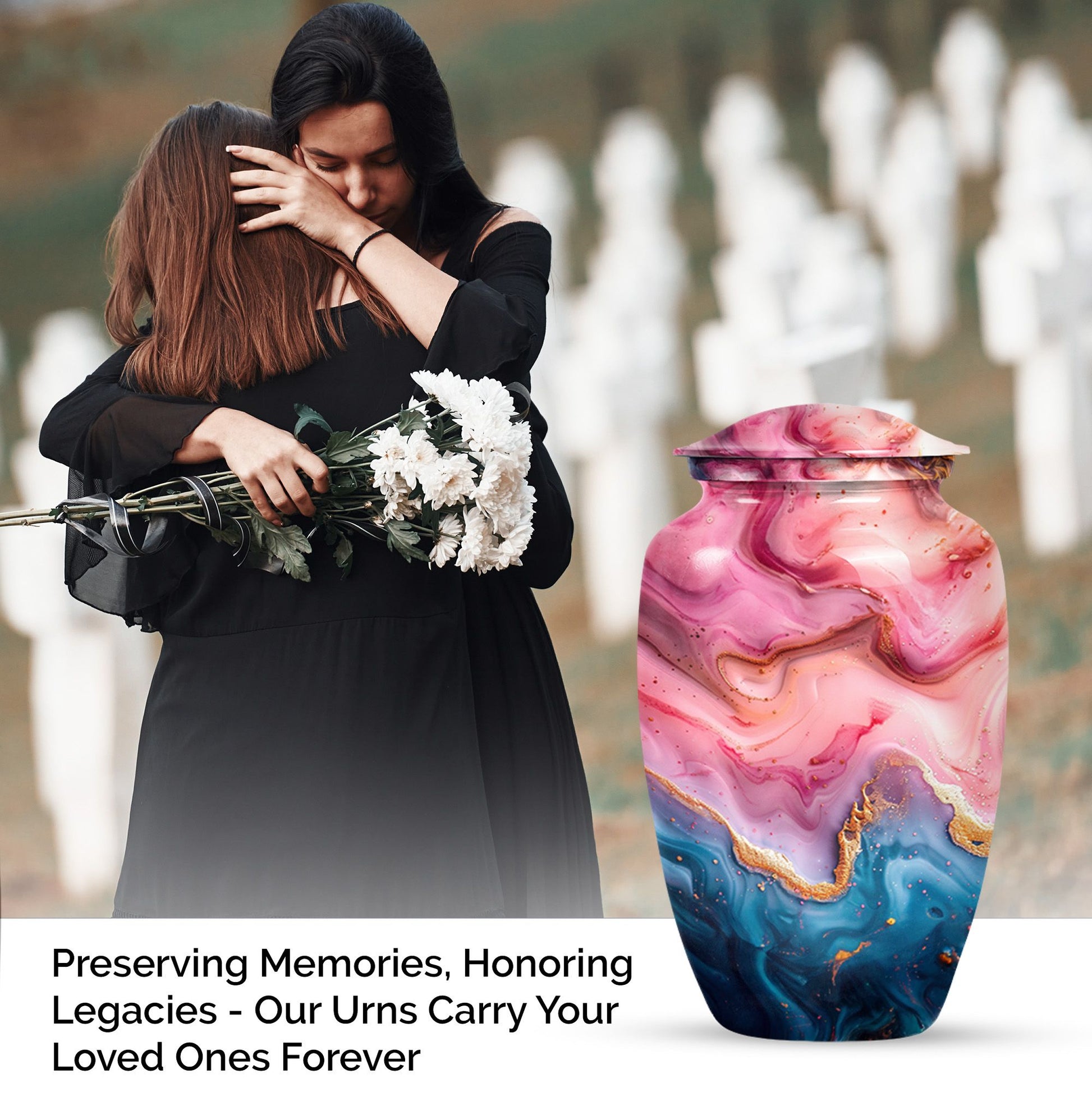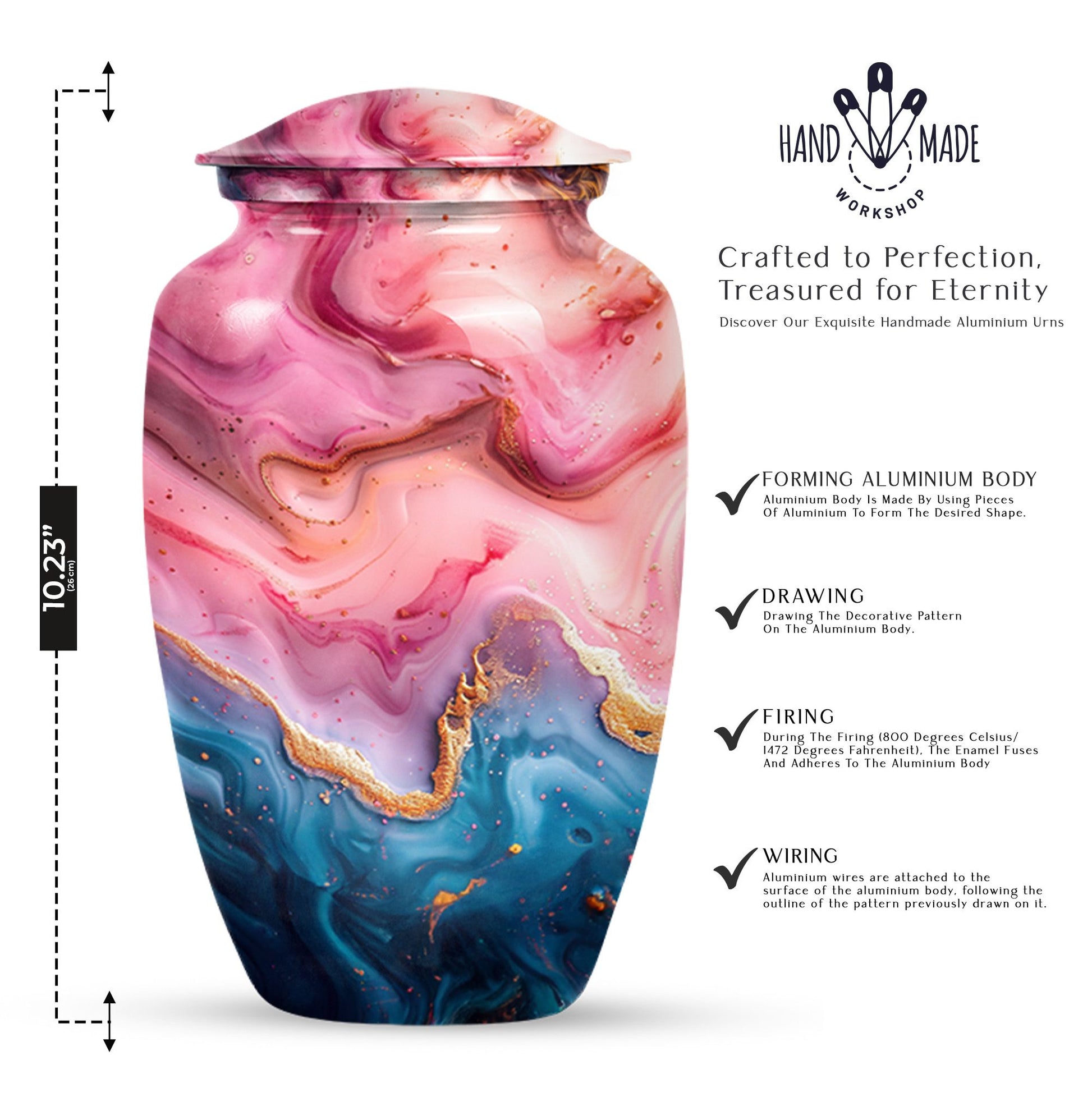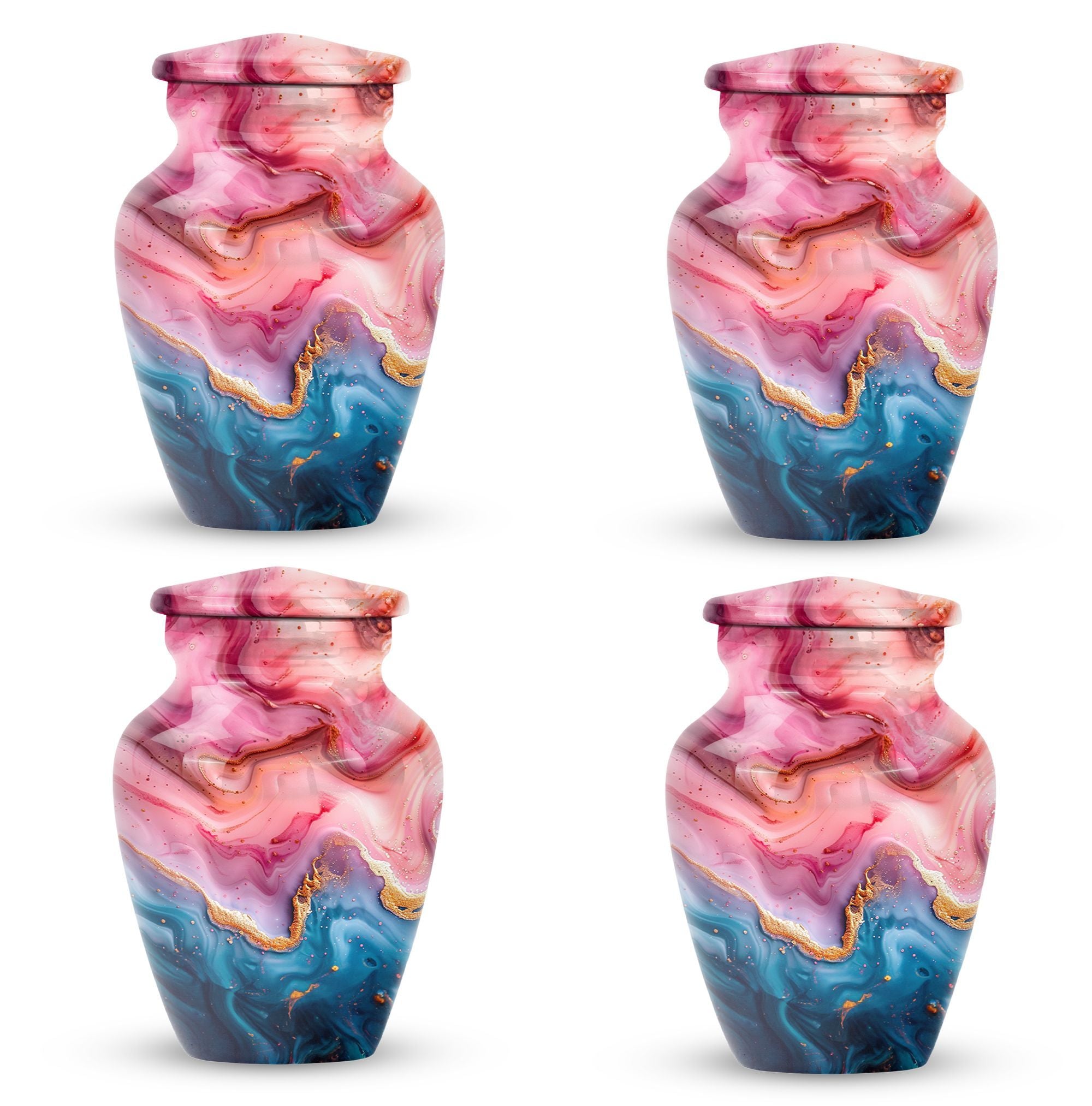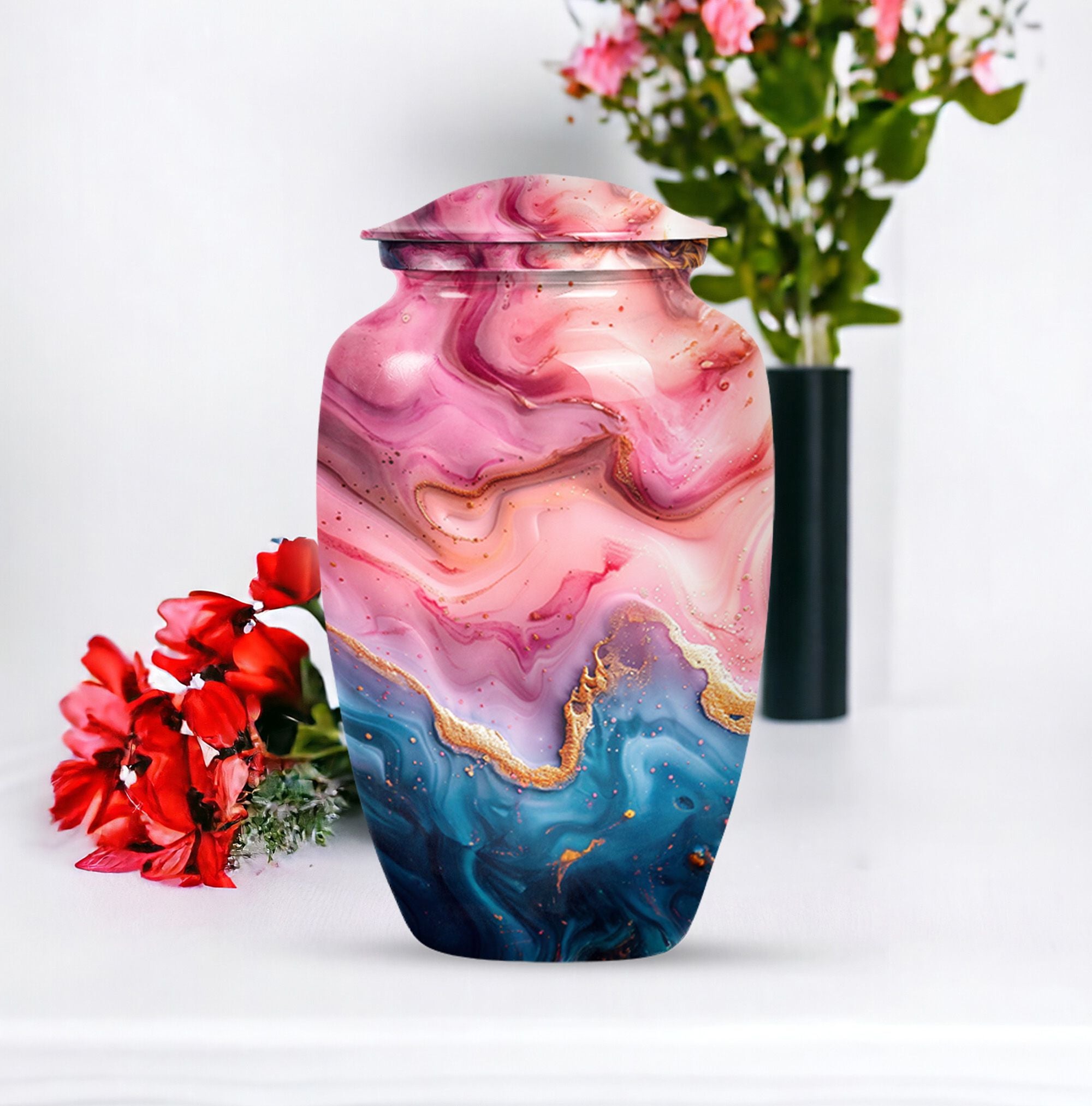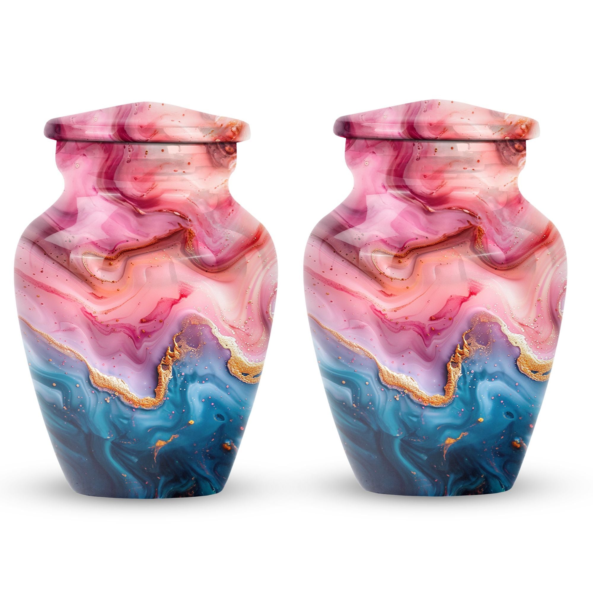 Cherish the memories of your loved ones with this Vibrant Swirl Urn, a beautifully crafted item from our memorial funeral urn selection. This large aluminium urn measures 10 inches in height and can accommodate up to 200 cubic inches of remains, making it ideal for adult use. With a unique abstract theme and a traditional classic urn style, it serves as a dignified final resting place. Balancing utility and sentimentality, this 3.3 pound urn comes with a premium velvet pouch for containment of ashes, adding an extra touch of care and respect. Boost its sentimental value by personalizing it with engraved names. Keywords such as 'Funeral urns for burial,' and 'mom cremation urn' highlight its purpose wonderfully. Acquiring this masterpiece of a memorial urn assures both solace and honor for your departed loved ones.