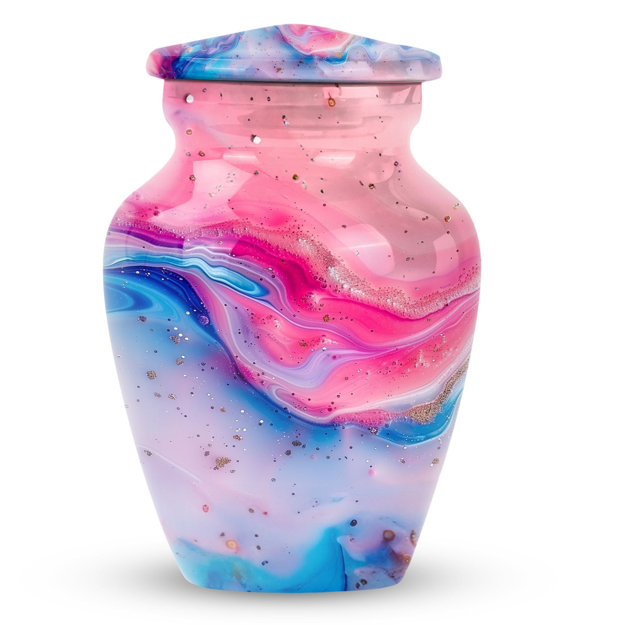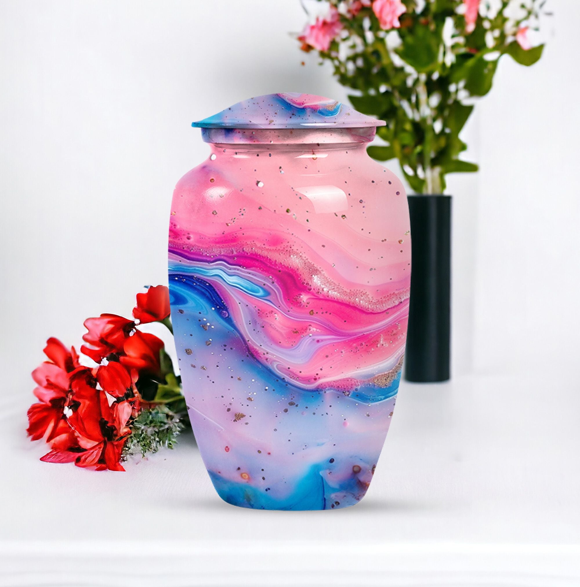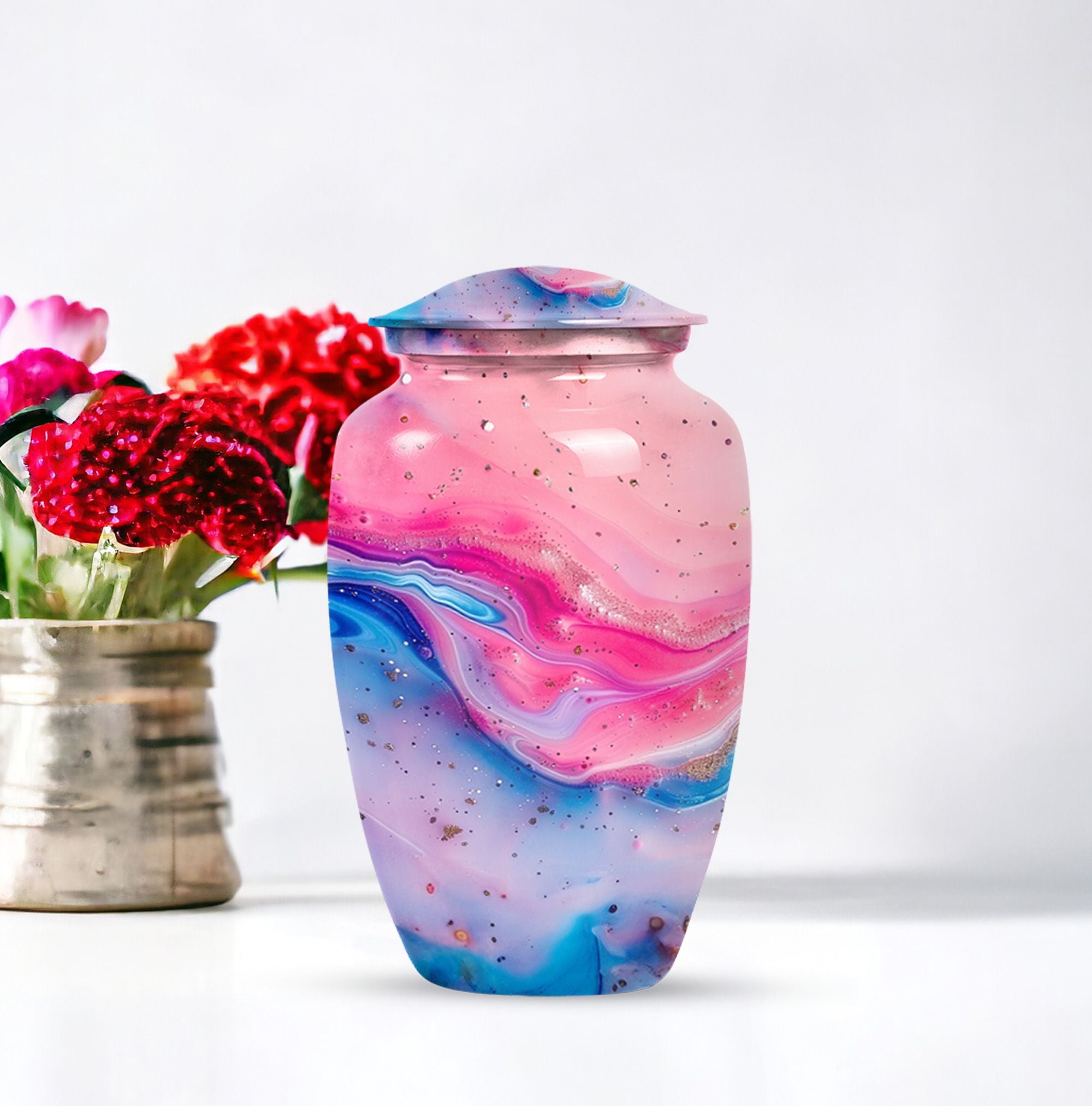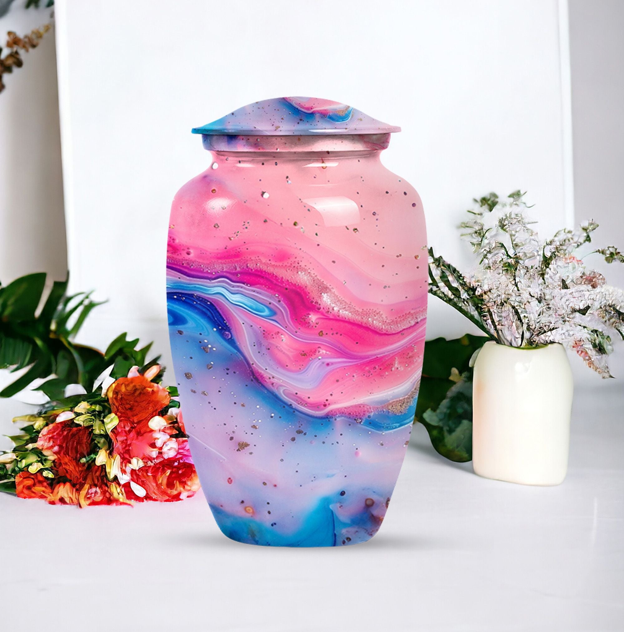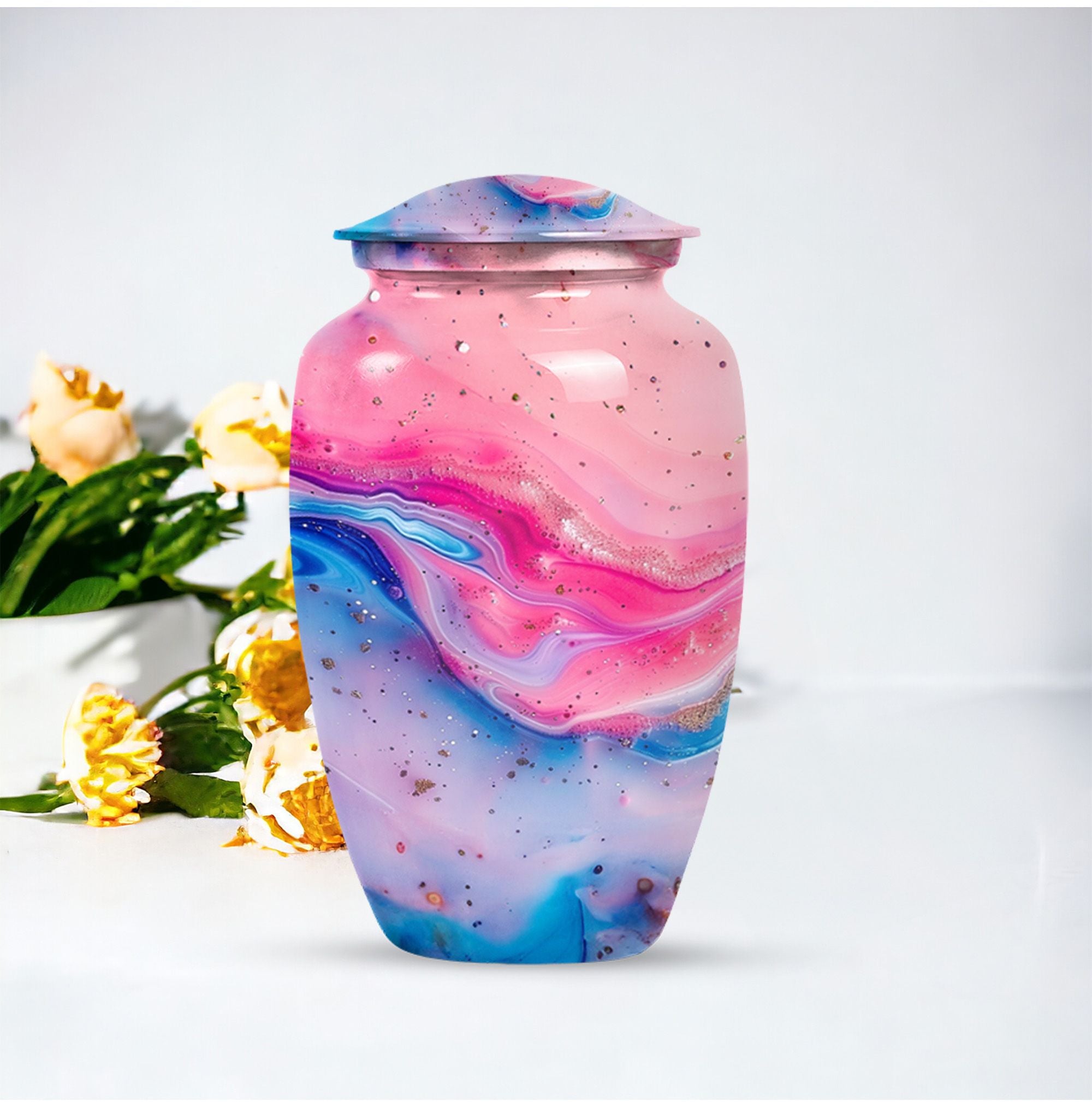 Enhance your memorial ceremony with a touch of elegance and respect with this Vibrant Swirl Urn. Made from robust and resilient Aluminium, this 10 inch, 3.3 pounds urn provides a perceptible tribute to your loved ones. With a capacity of 200 cubic inches, it comfortably retains the ashes, serving as a reverent memorial funeral urn for anyone. Its glamorous abstract theme mixed with the classic urn type complements any decor while providing a distinctive resting place for your loved one's ashes. The attention to detail extends to the velvet pouch included in the package, providing an extra layer of containment and protection. Personalize your cremation urn with engraved names to create a truly unique keepsake. Uncomplicated in its approach, yet profound in its meaning, this urn bridges the gap between style and sentiment. Keywords to remember: funeral urns for burial, human ash urns, urns for human ashes, mom cremation urn.
