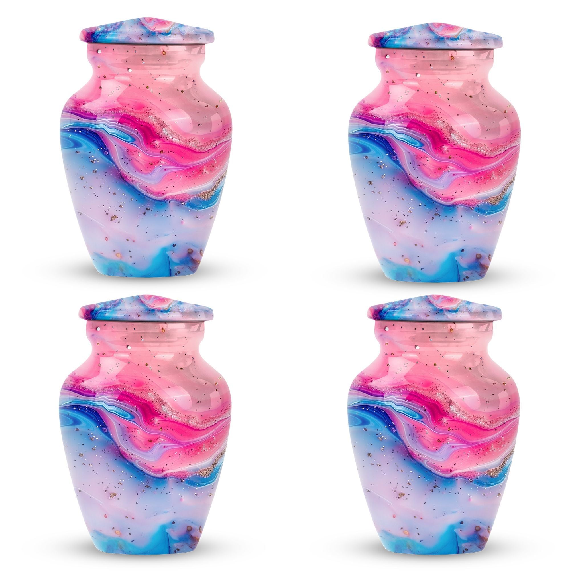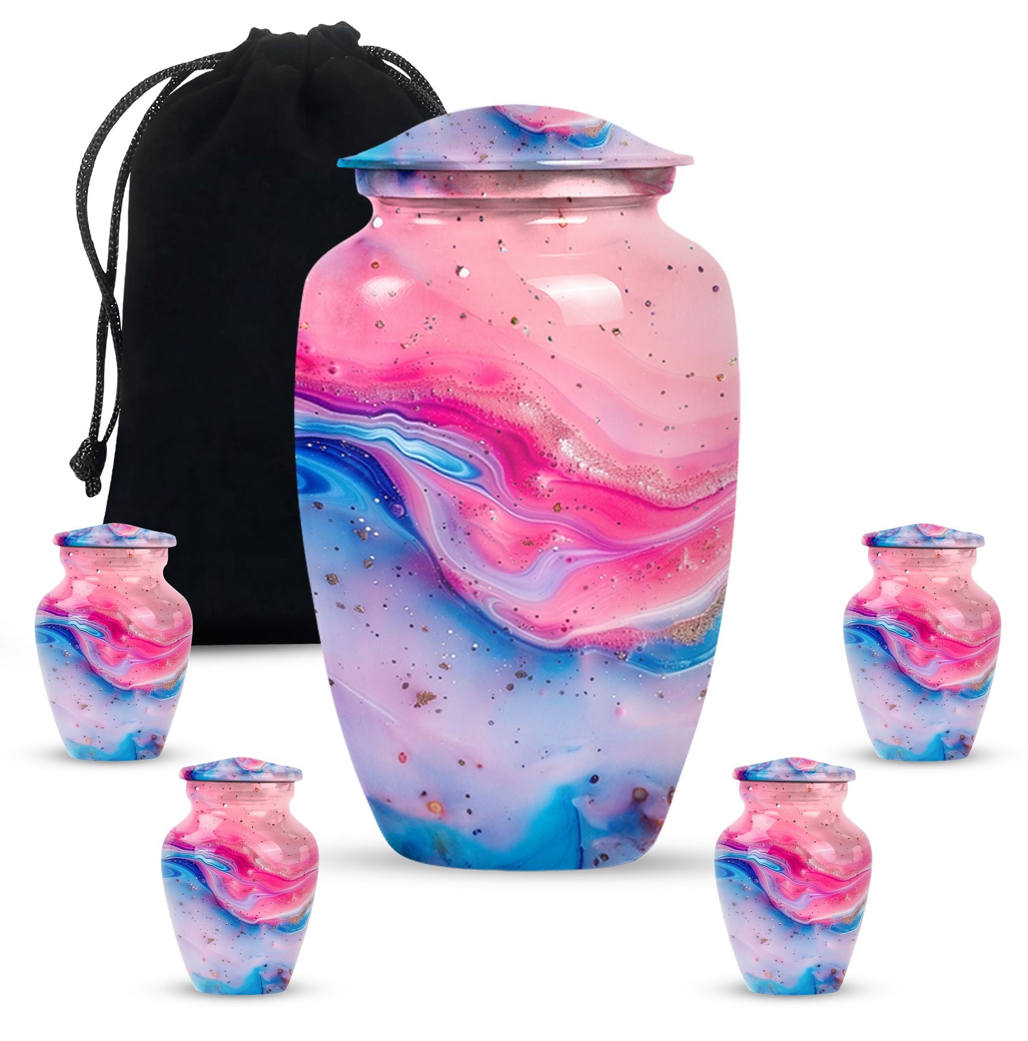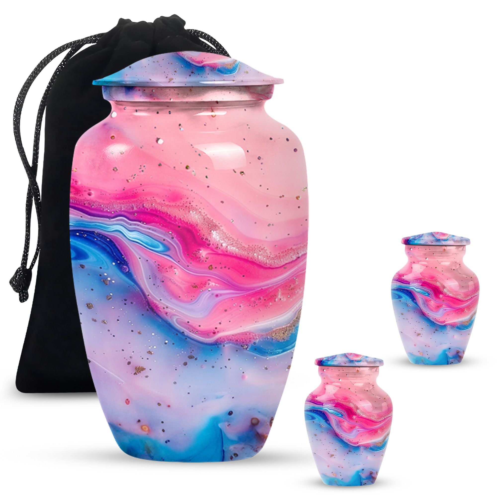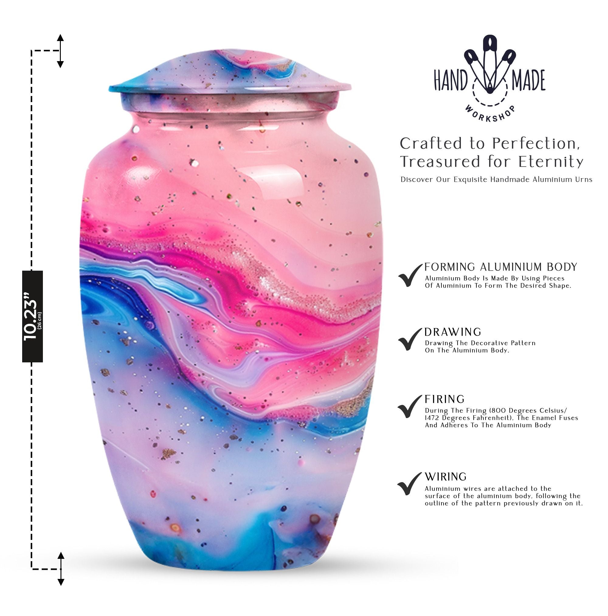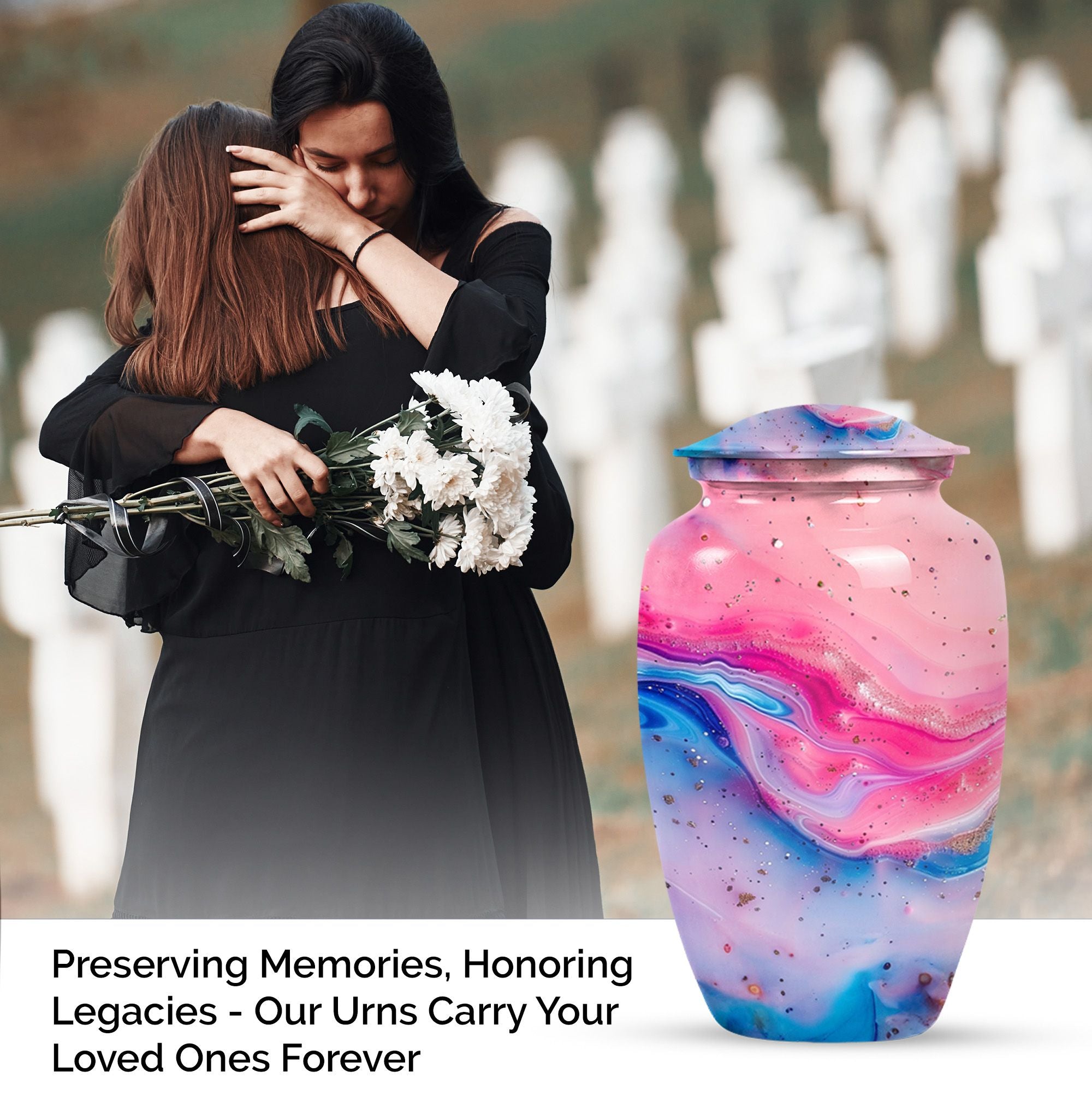 Enhance your memorial ceremony with a touch of elegance and respect with this Vibrant Swirl Urn. Made from robust and resilient Aluminium, this 10 inch, 3.3 pounds urn provides a perceptible tribute to your loved ones. With a capacity of 200 cubic inches, it comfortably retains the ashes, serving as a reverent memorial funeral urn for anyone. Its glamorous abstract theme mixed with the classic urn type complements any decor while providing a distinctive resting place for your loved one's ashes. The attention to detail extends to the velvet pouch included in the package, providing an extra layer of containment and protection. Personalize your cremation urn with engraved names to create a truly unique keepsake. Uncomplicated in its approach, yet profound in its meaning, this urn bridges the gap between style and sentiment. Keywords to remember: funeral urns for burial, human ash urns, urns for human ashes, mom cremation urn.