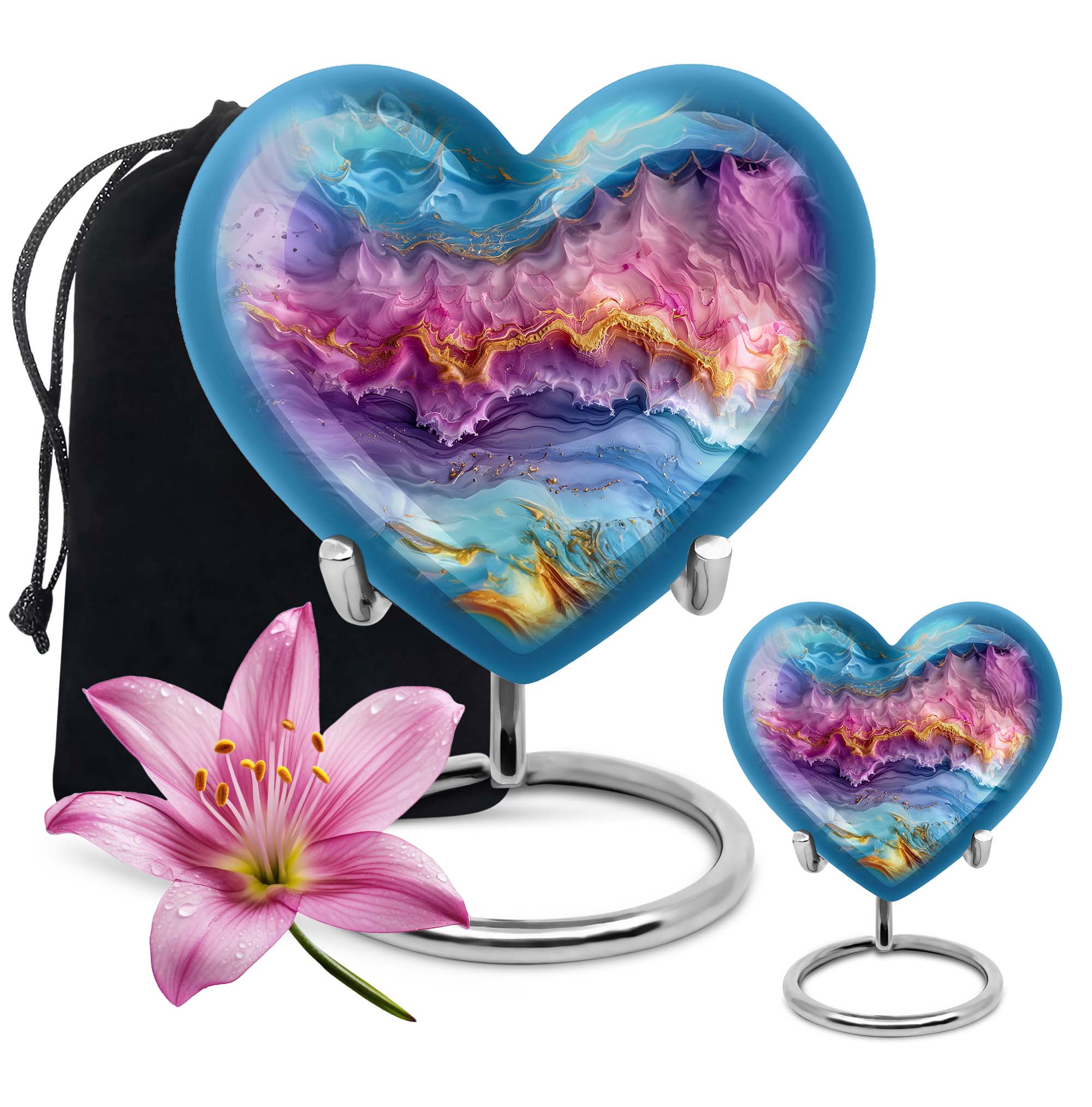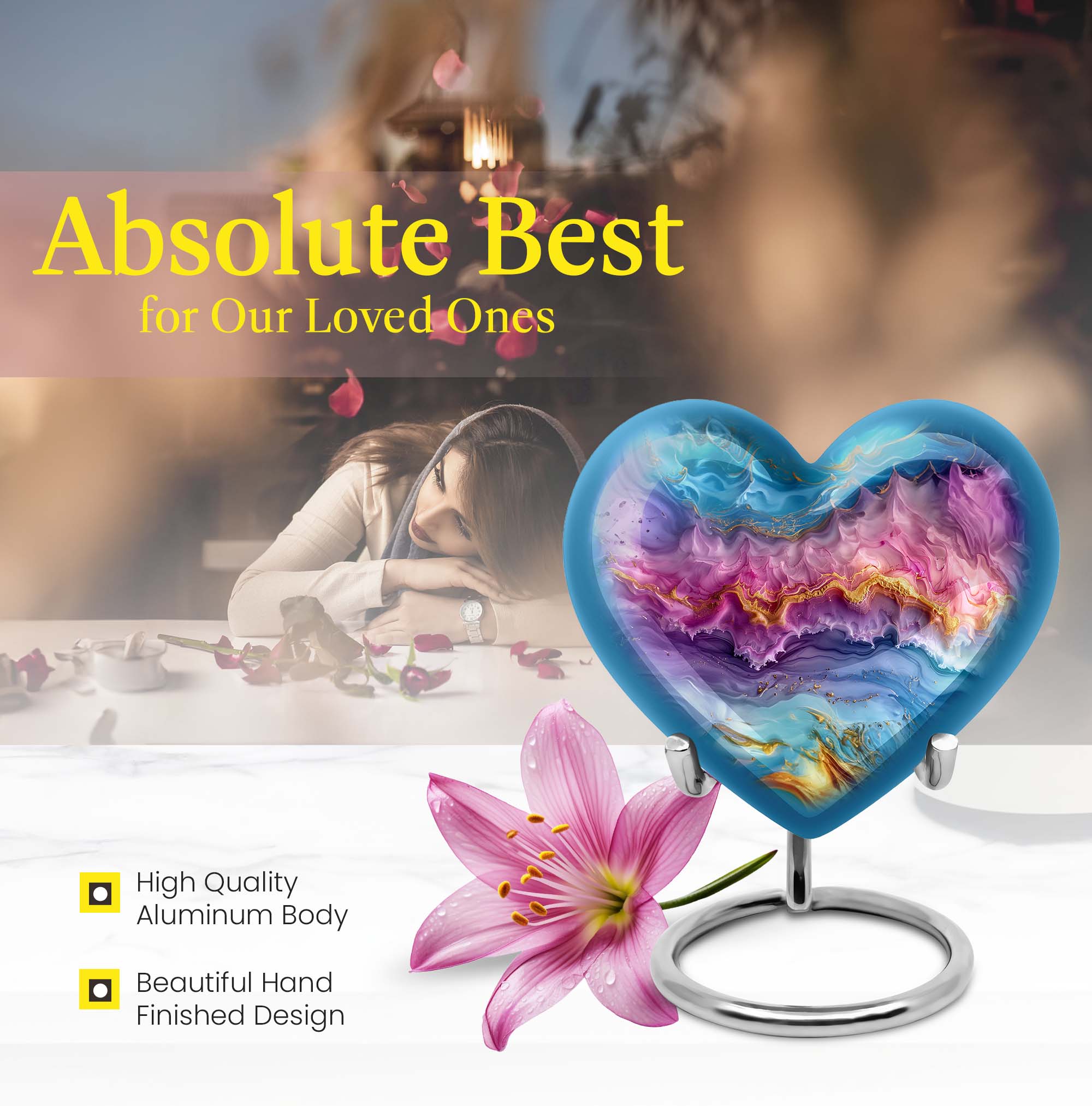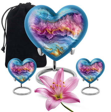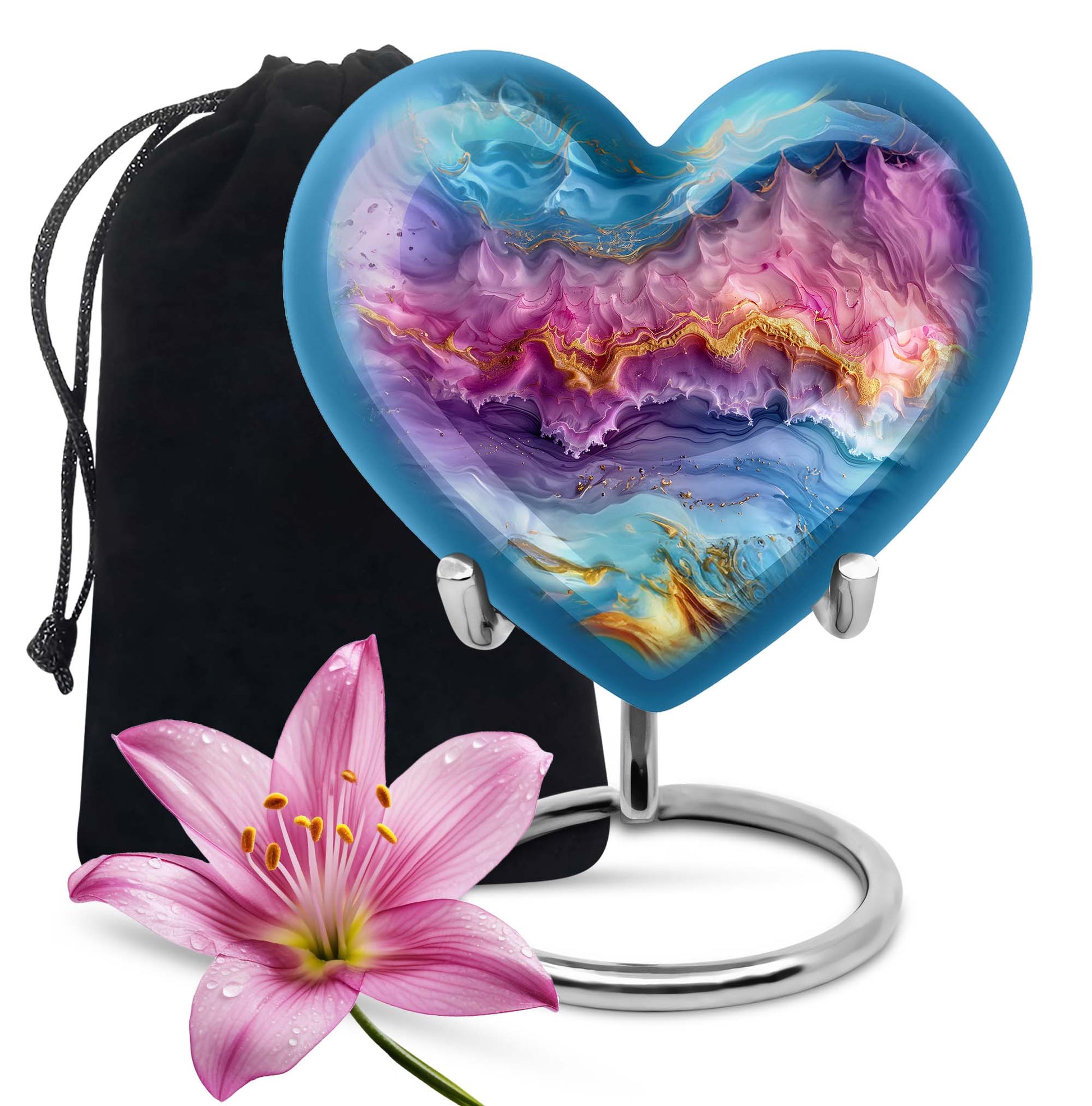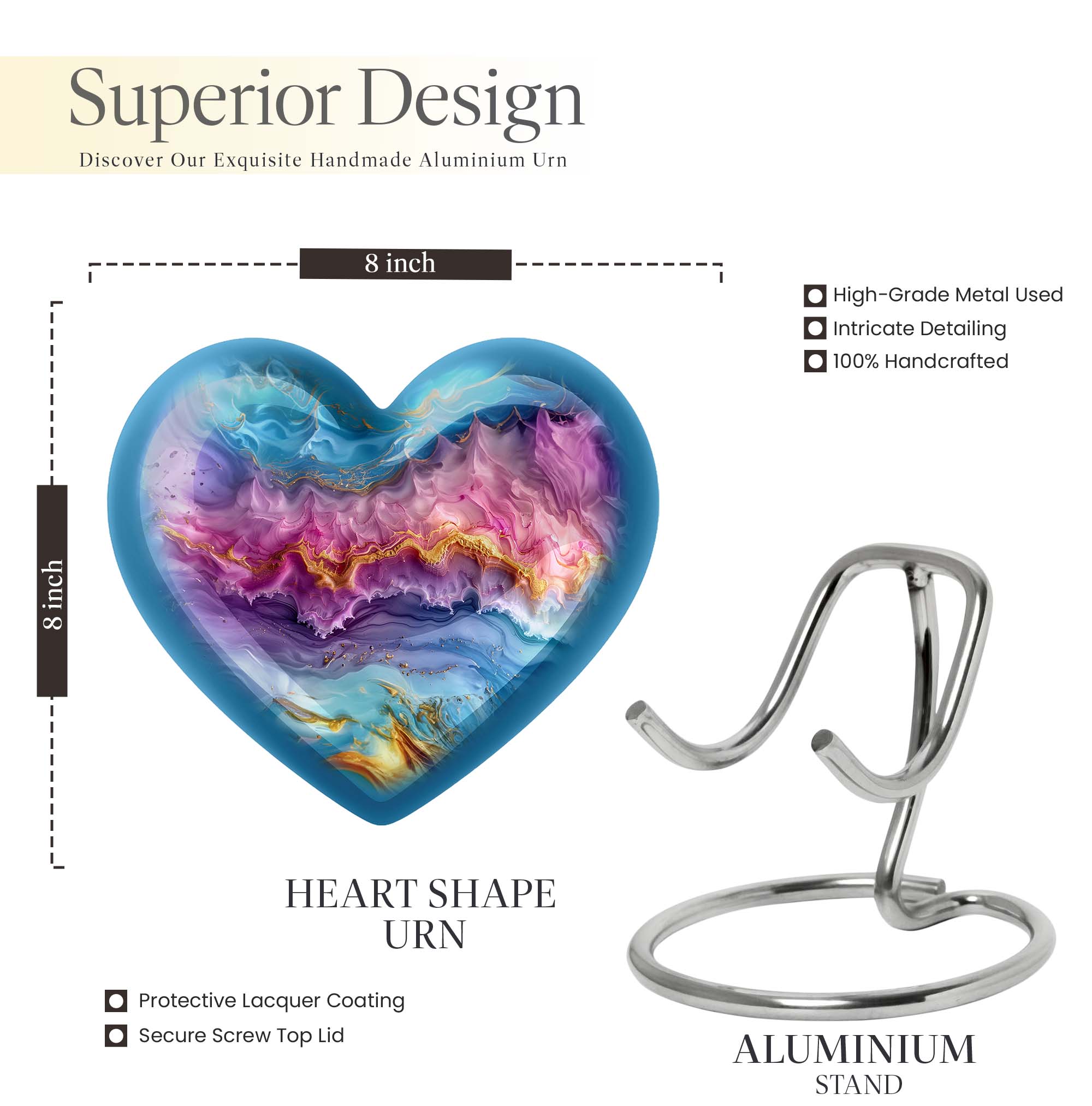 Celebrate and honor the memory of a loved one with the Vibrant Swirl Urn. Crafted from durable Aluminium, this 10 Inch high Large Urn is decorated with an abstract theme depicting the cyclical nature of life. This cremation urn offers a capacity of 200 cubic inches, making it a suitable choice for most adults. Weighing at 3.3 pounds, this Memorial Urn provides a sturdy yet lightweight solution for your memorial needs. Personalize it with engraved names to make it a truly unique tribute. Besides the urn, your purchase includes a velvet pouch for containment of ashes, making the containment process hassle-free and dignified. This cremation urn is not only an object for ash containment, it's a heartfelt piece of art that brings beauty, peace, and memory to your home. Perfect for those searching for 'burial cremation urn', 'cremation urns medium size', or 'cremation personalized urns for human ashes adult'. Commemorate the beautiful journey of life with our Vibrant Swirl Urn.