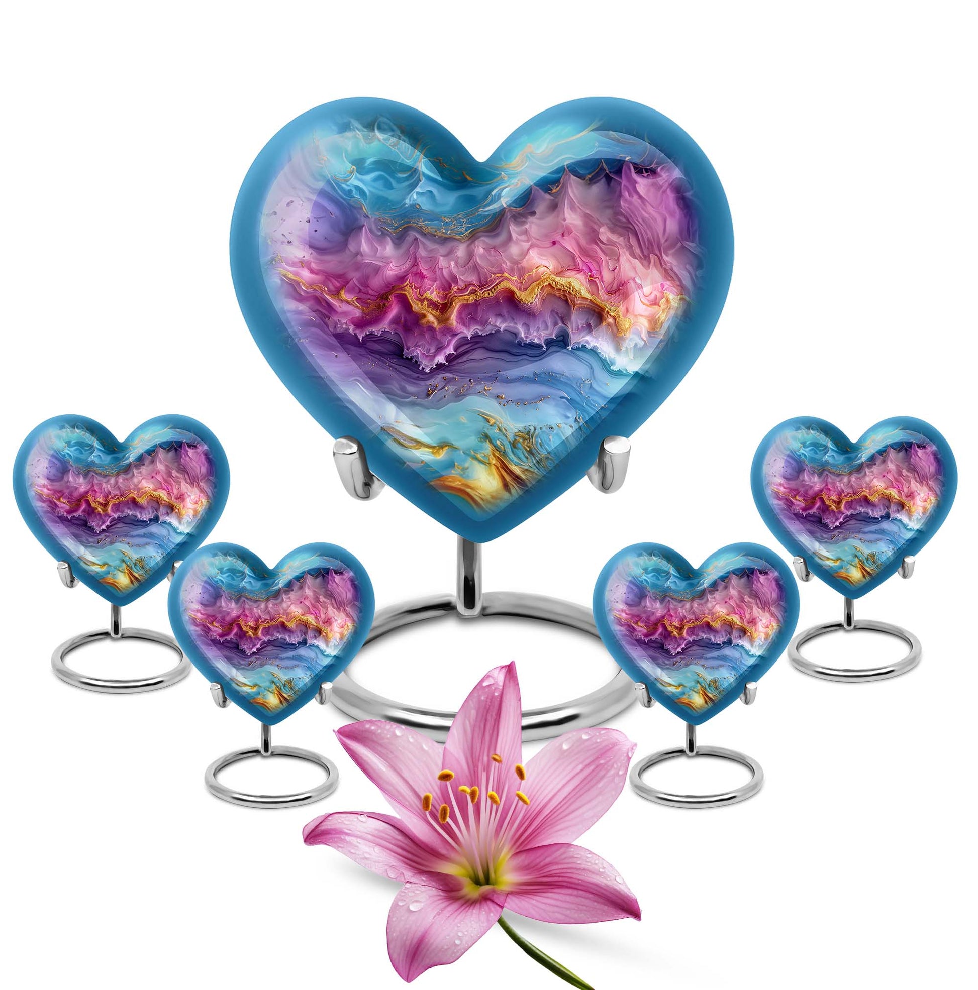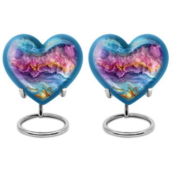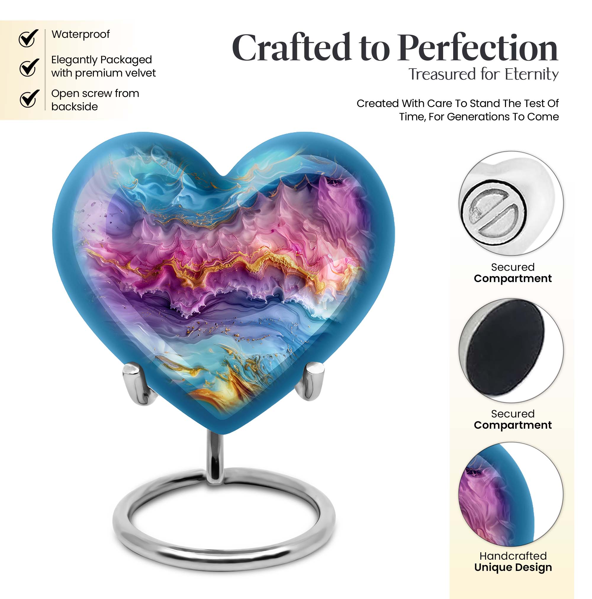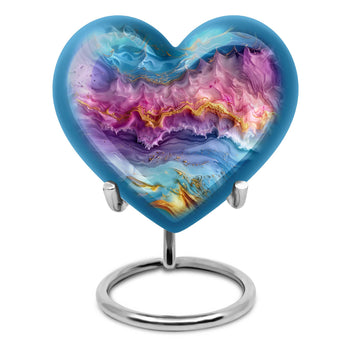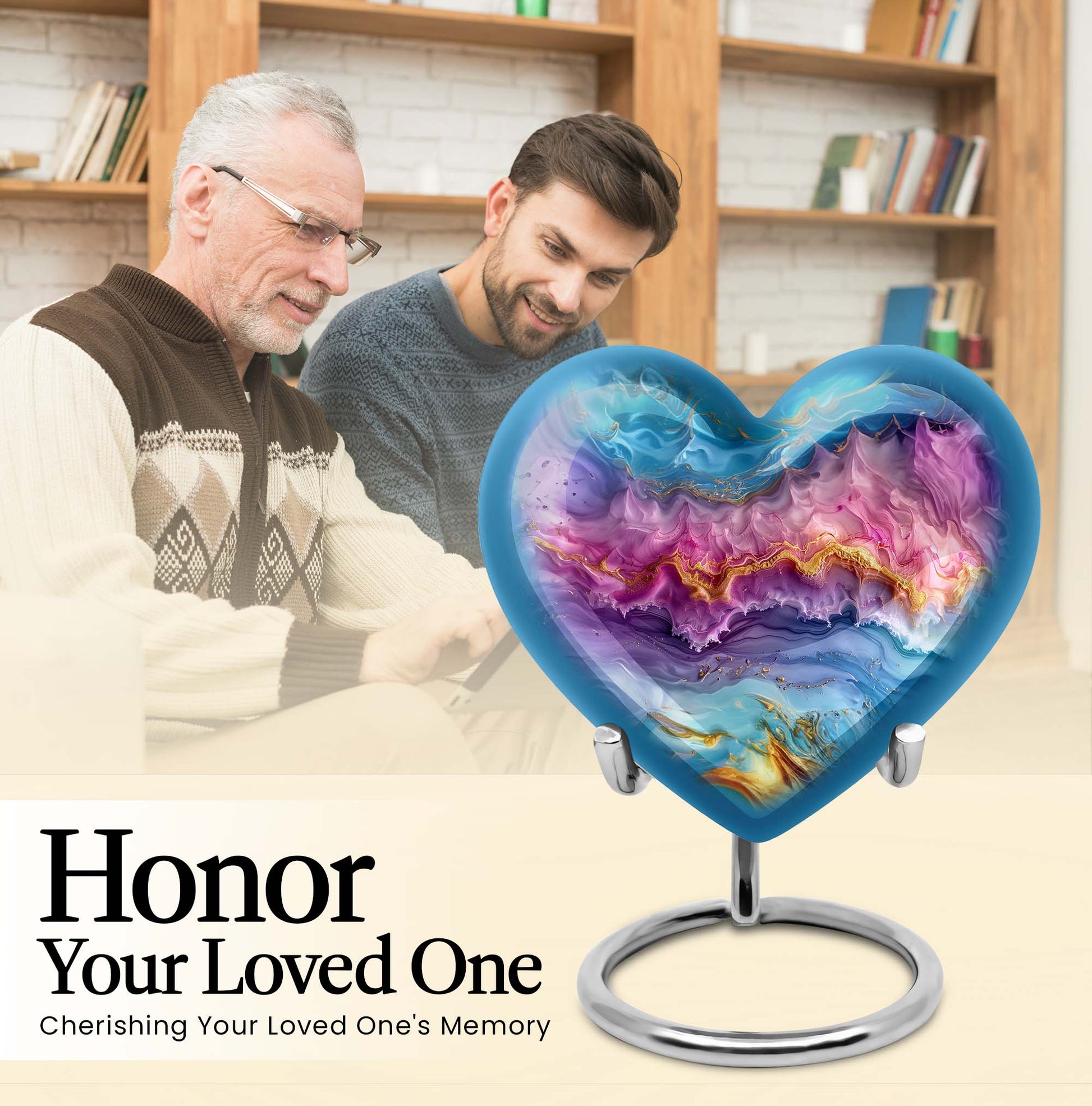 Celebrate and honor the memory of a loved one with the Vibrant Swirl Urn. Crafted from durable Aluminium, this 10 Inch high Large Urn is decorated with an abstract theme depicting the cyclical nature of life. This cremation urn offers a capacity of 200 cubic inches, making it a suitable choice for most adults. Weighing at 3.3 pounds, this Memorial Urn provides a sturdy yet lightweight solution for your memorial needs. Personalize it with engraved names to make it a truly unique tribute. Besides the urn, your purchase includes a velvet pouch for containment of ashes, making the containment process hassle-free and dignified. This cremation urn is not only an object for ash containment, it's a heartfelt piece of art that brings beauty, peace, and memory to your home. Perfect for those searching for 'burial cremation urn', 'cremation urns medium size', or 'cremation personalized urns for human ashes adult'. Commemorate the beautiful journey of life with our Vibrant Swirl Urn.