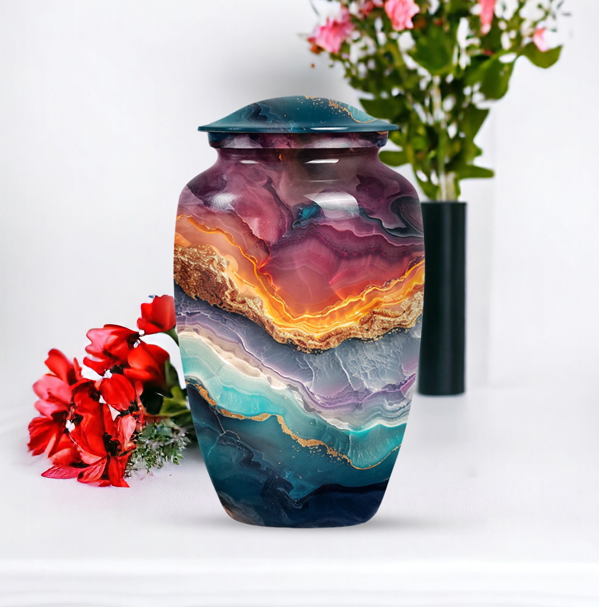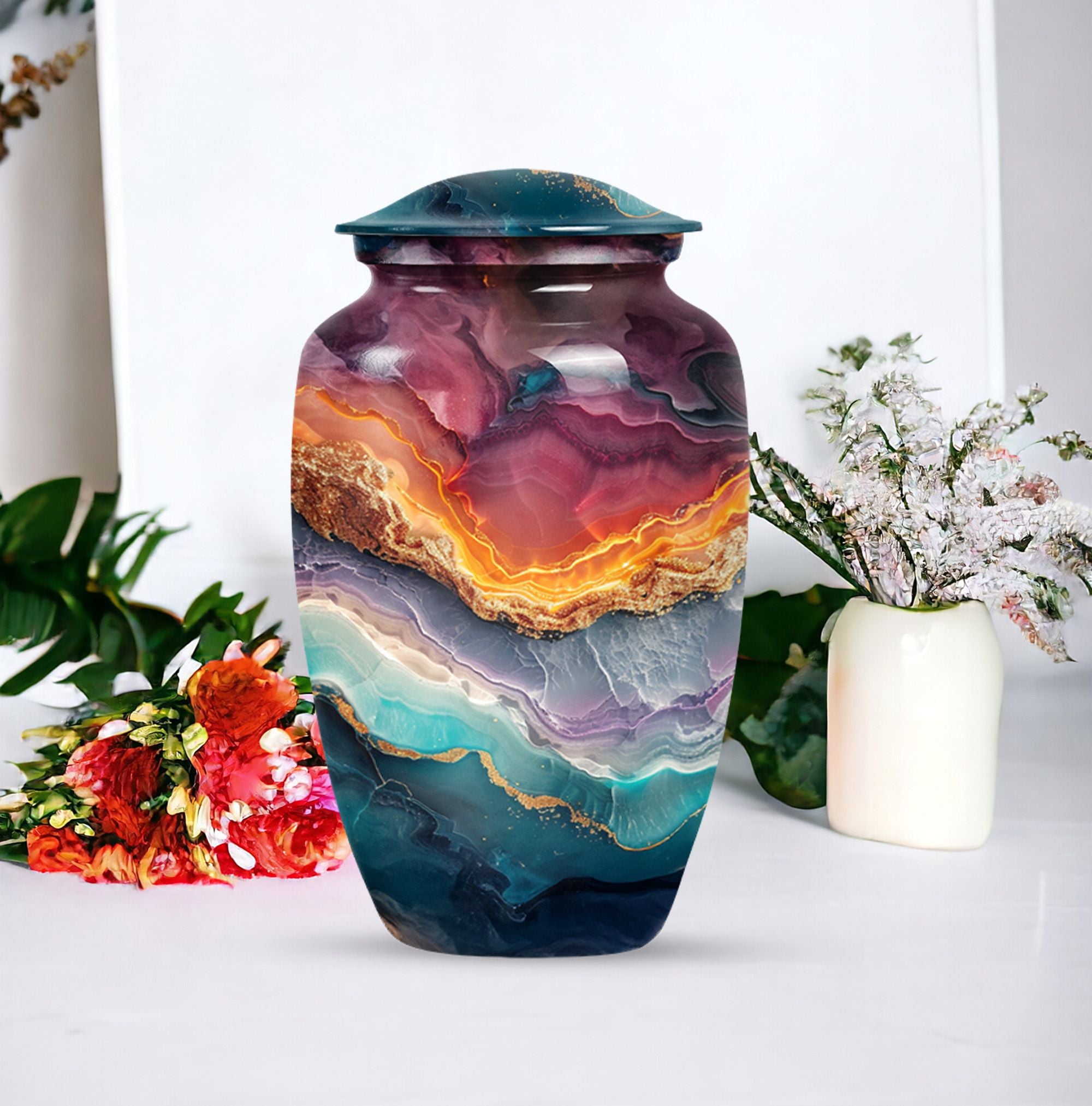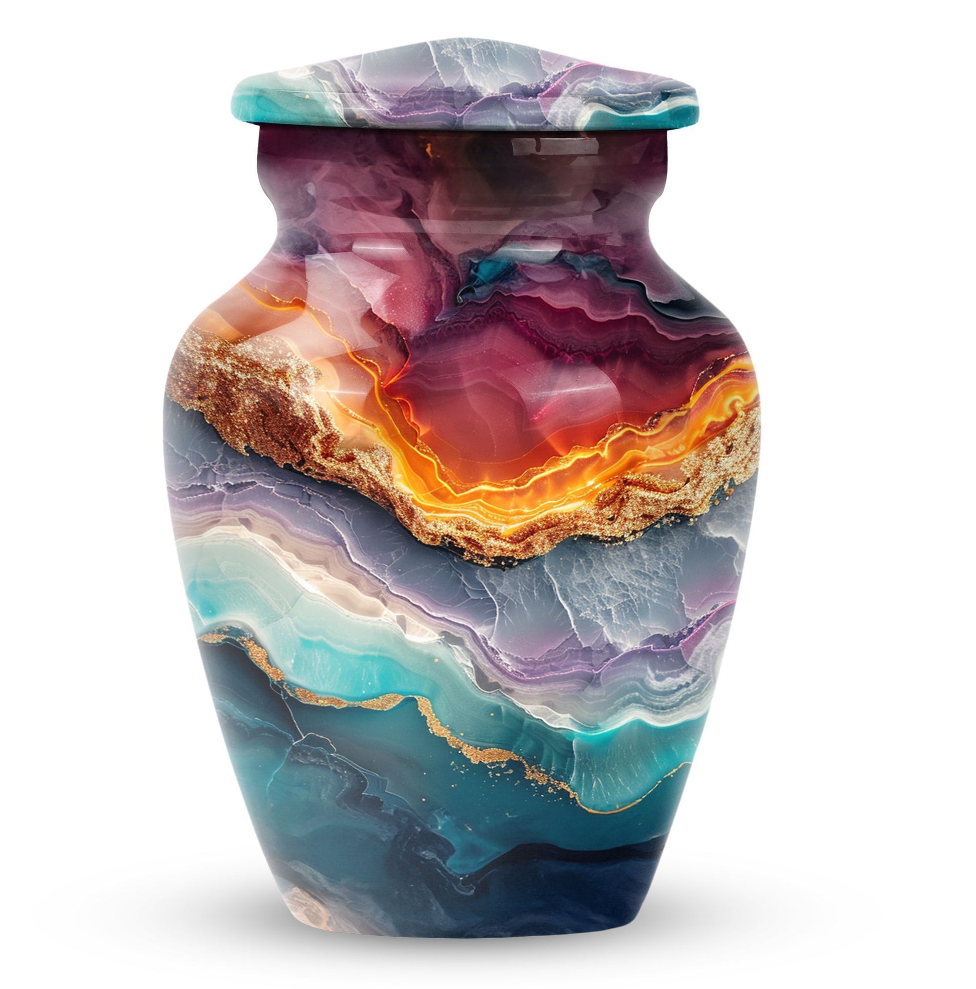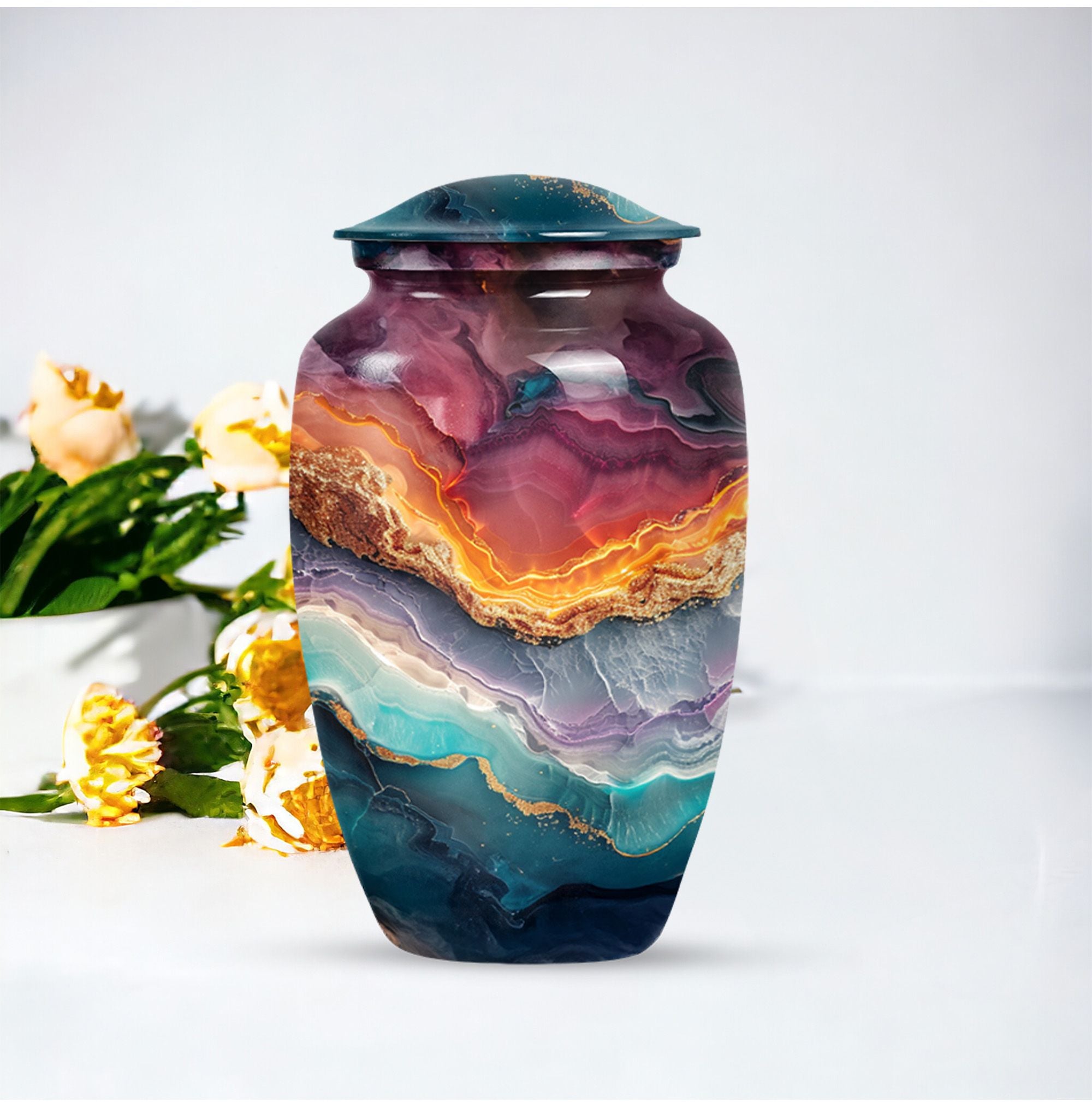A tribute to honor your loved one, our Vibrant Swirl Urn is more than a simple urn; it's a piece of exquisite artistry. With its 10-inch stature, this aluminium urn is intricately designed with an abstract theme, encapsulating the memory of your beloved dad or mom uniquely. Weighing just 3.33 pounds, it is large enough to abundantly hold up to 200 cubic inches of cremated remains, befitting an adult male or female. With the personalization option, you can engrave the names for a touch of special significance. The package includes a velvet pouch, providing an extra layer of respect and protection to the departed soul's ashes. If you are seeking high-quality and appropriately-sized funeral urns or urns for cremation ashes, consider this abstract-themed Vibrant Swirl Urn. With its eloquent dimensions, it translates beautiful memories into a delicate monument that stays with you forever, truly standing out among memorial urns.