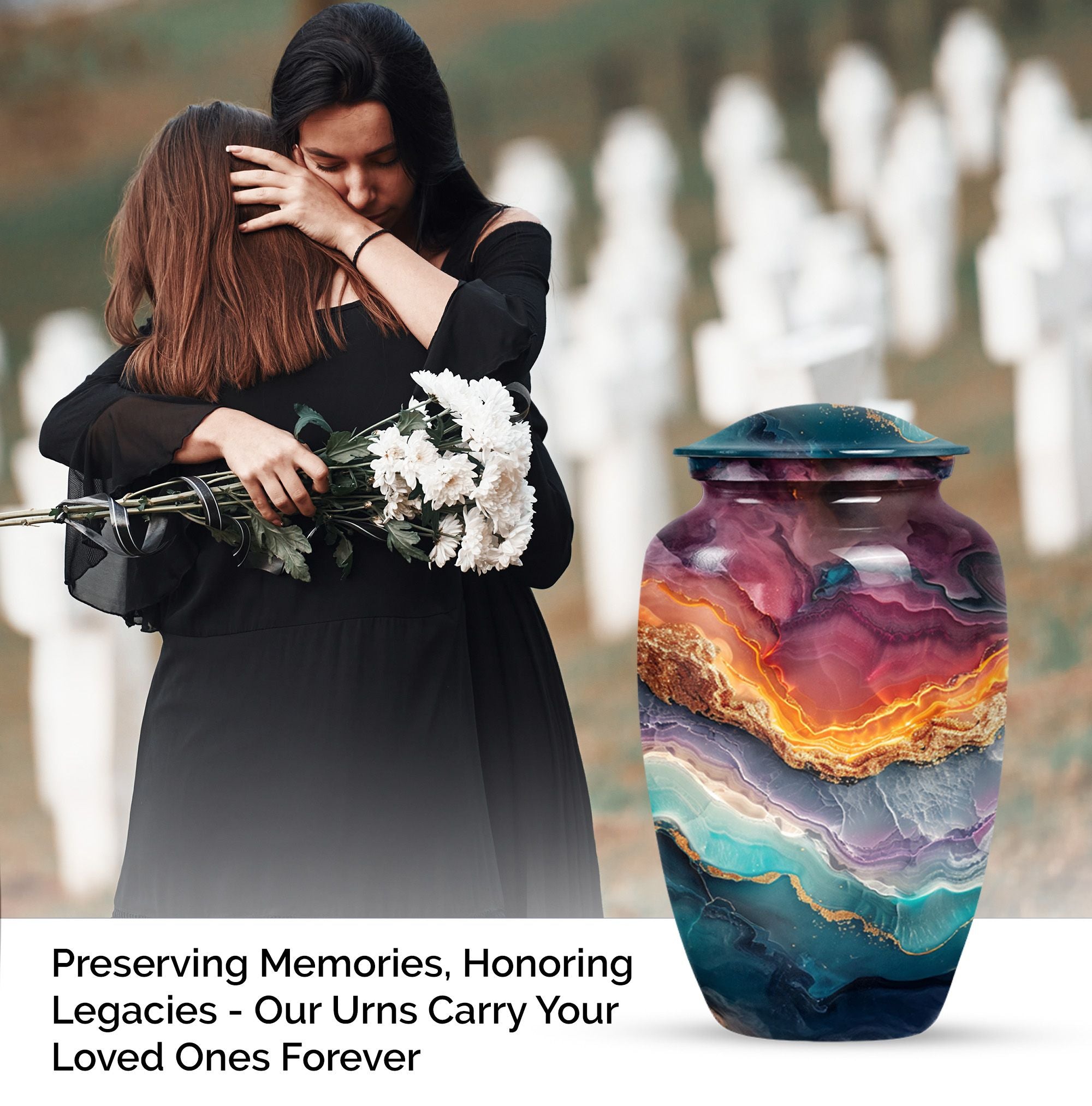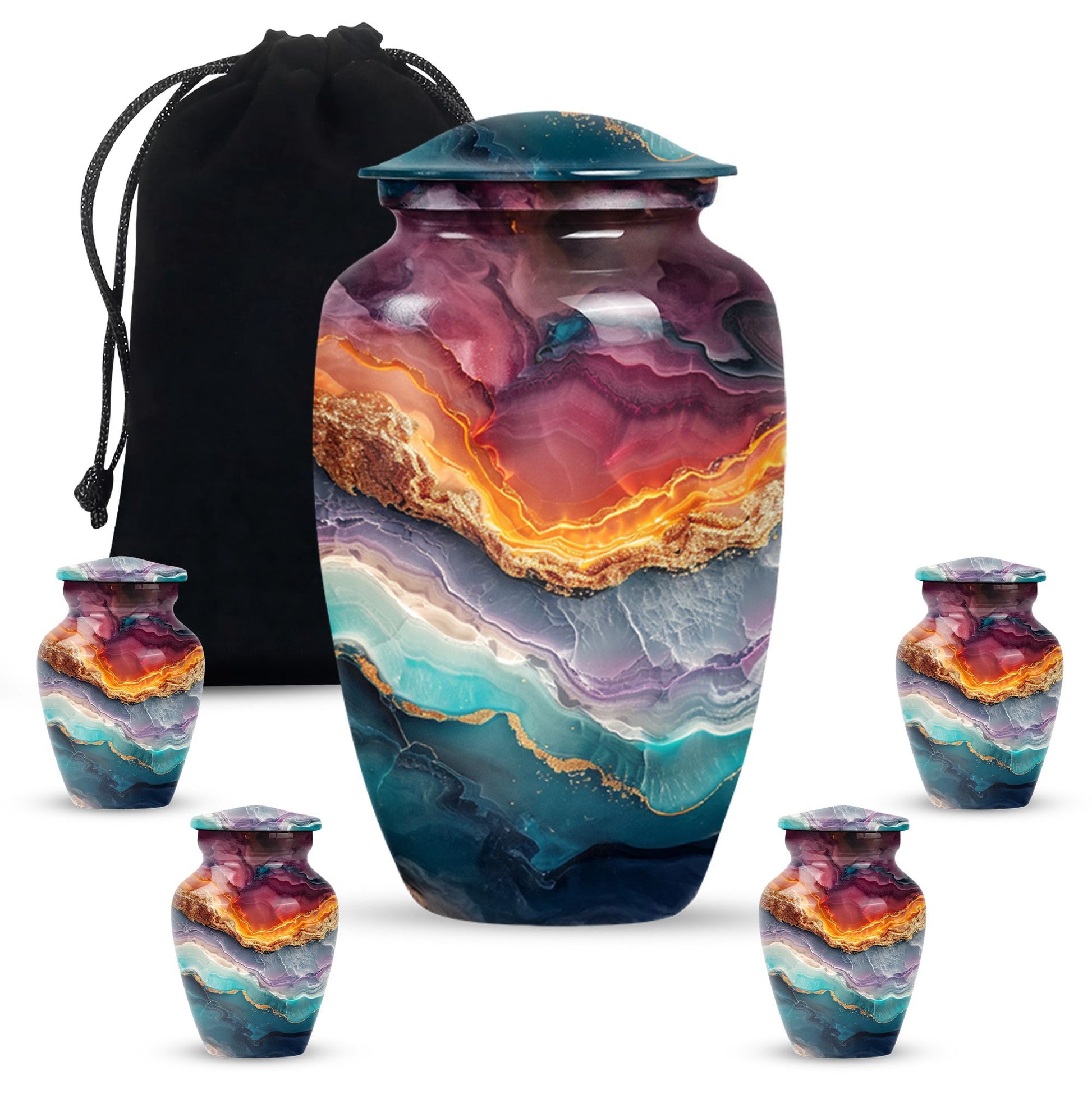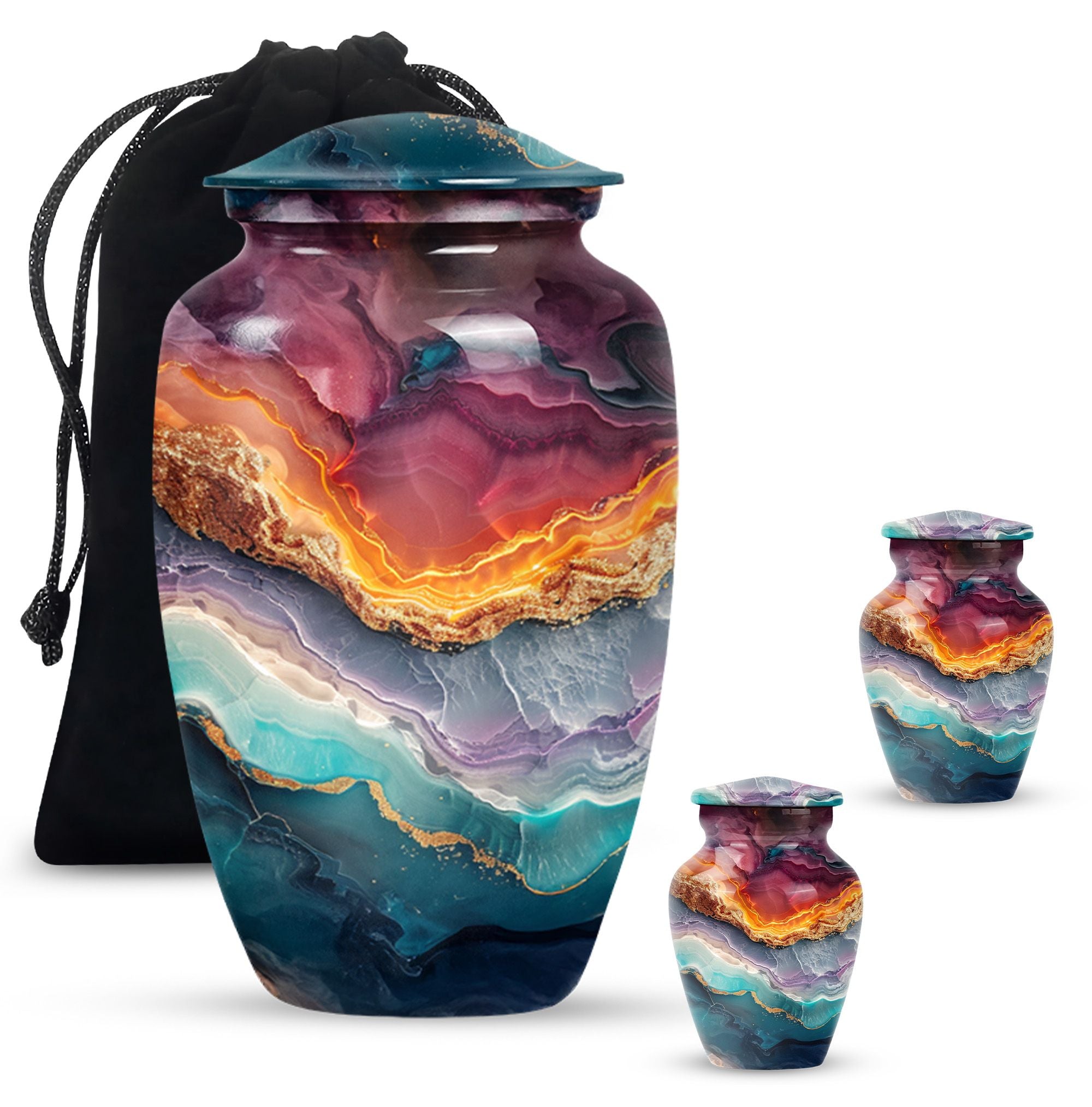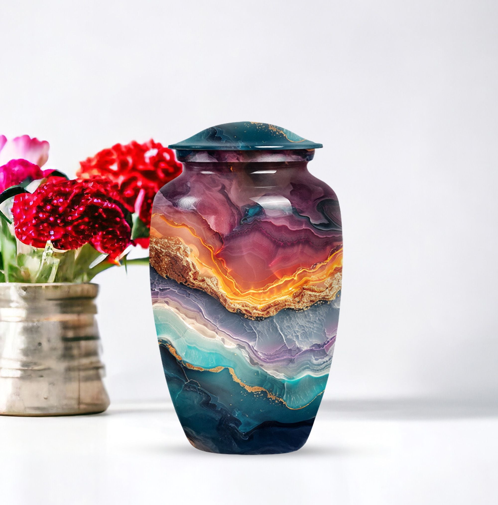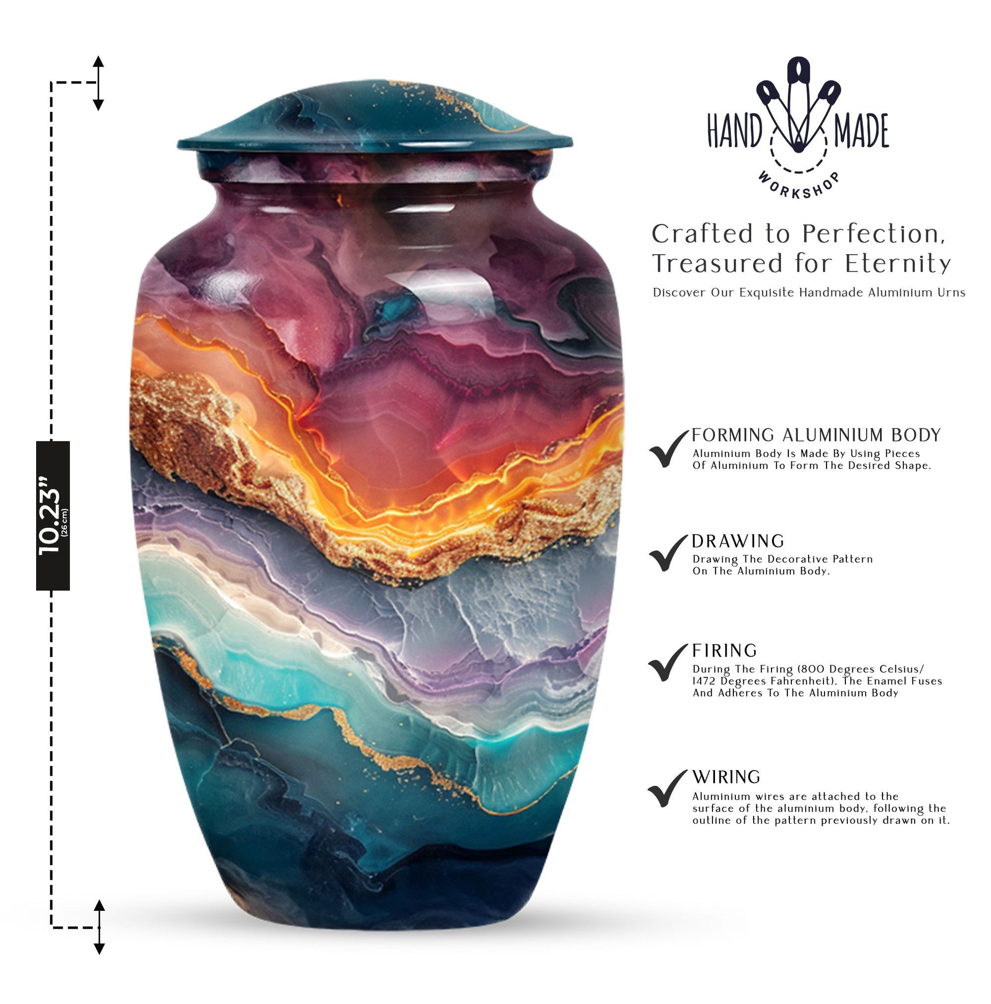 A tribute to honor your loved one, our Vibrant Swirl Urn is more than a simple urn; it's a piece of exquisite artistry. With its 10-inch stature, this aluminium urn is intricately designed with an abstract theme, encapsulating the memory of your beloved dad or mom uniquely. Weighing just 3.33 pounds, it is large enough to abundantly hold up to 200 cubic inches of cremated remains, befitting an adult male or female. With the personalization option, you can engrave the names for a touch of special significance. The package includes a velvet pouch, providing an extra layer of respect and protection to the departed soul's ashes. If you are seeking high-quality and appropriately-sized funeral urns or urns for cremation ashes, consider this abstract-themed Vibrant Swirl Urn. With its eloquent dimensions, it translates beautiful memories into a delicate monument that stays with you forever, truly standing out among memorial urns.