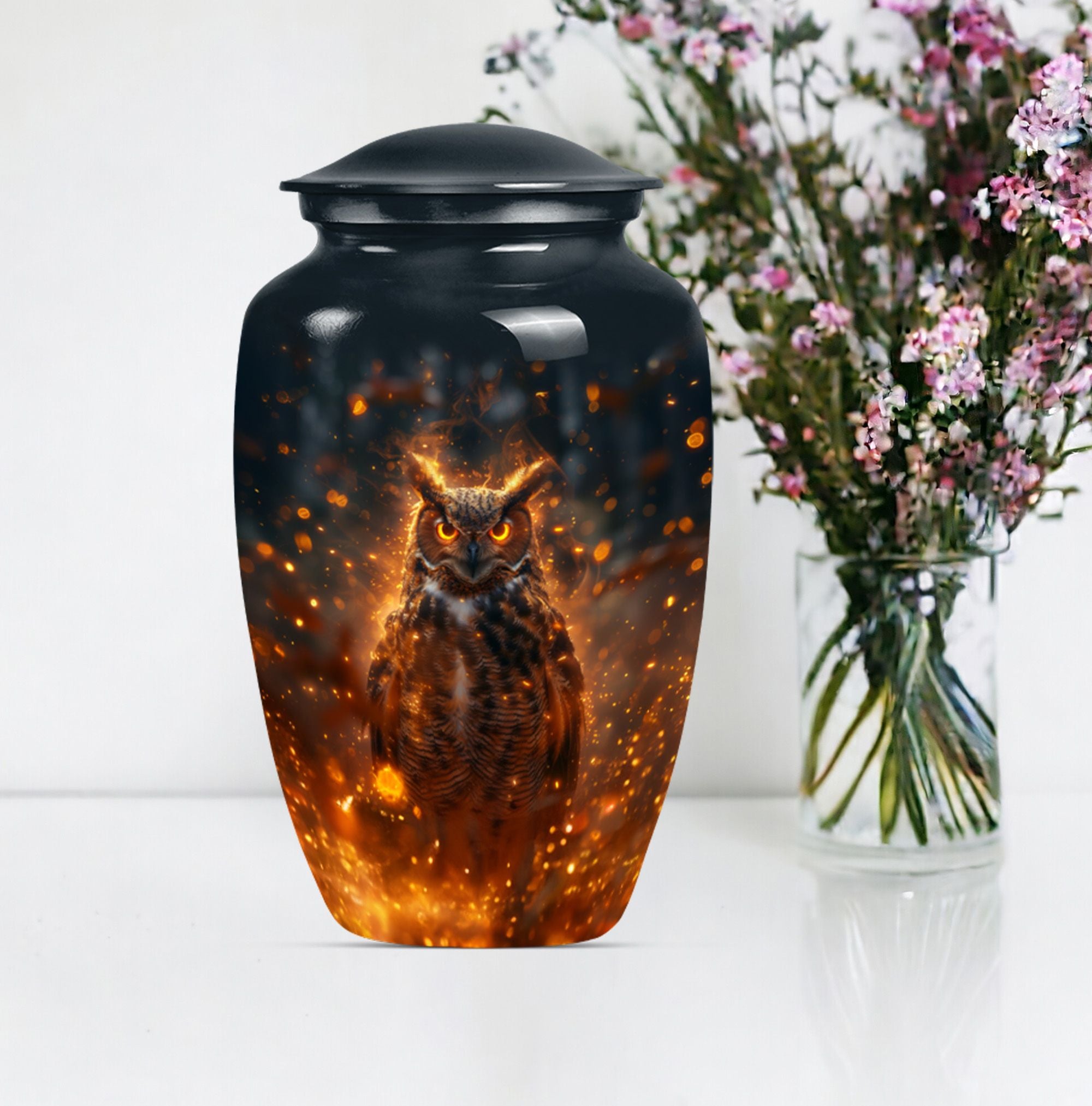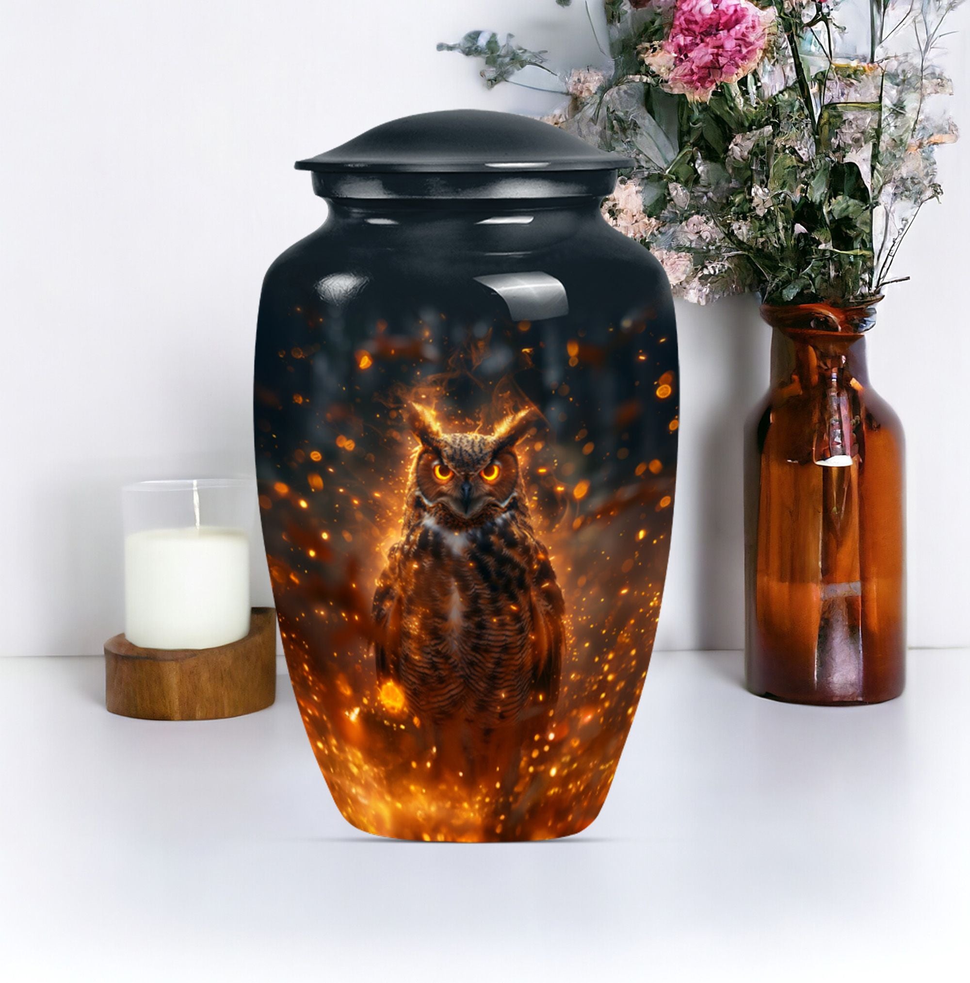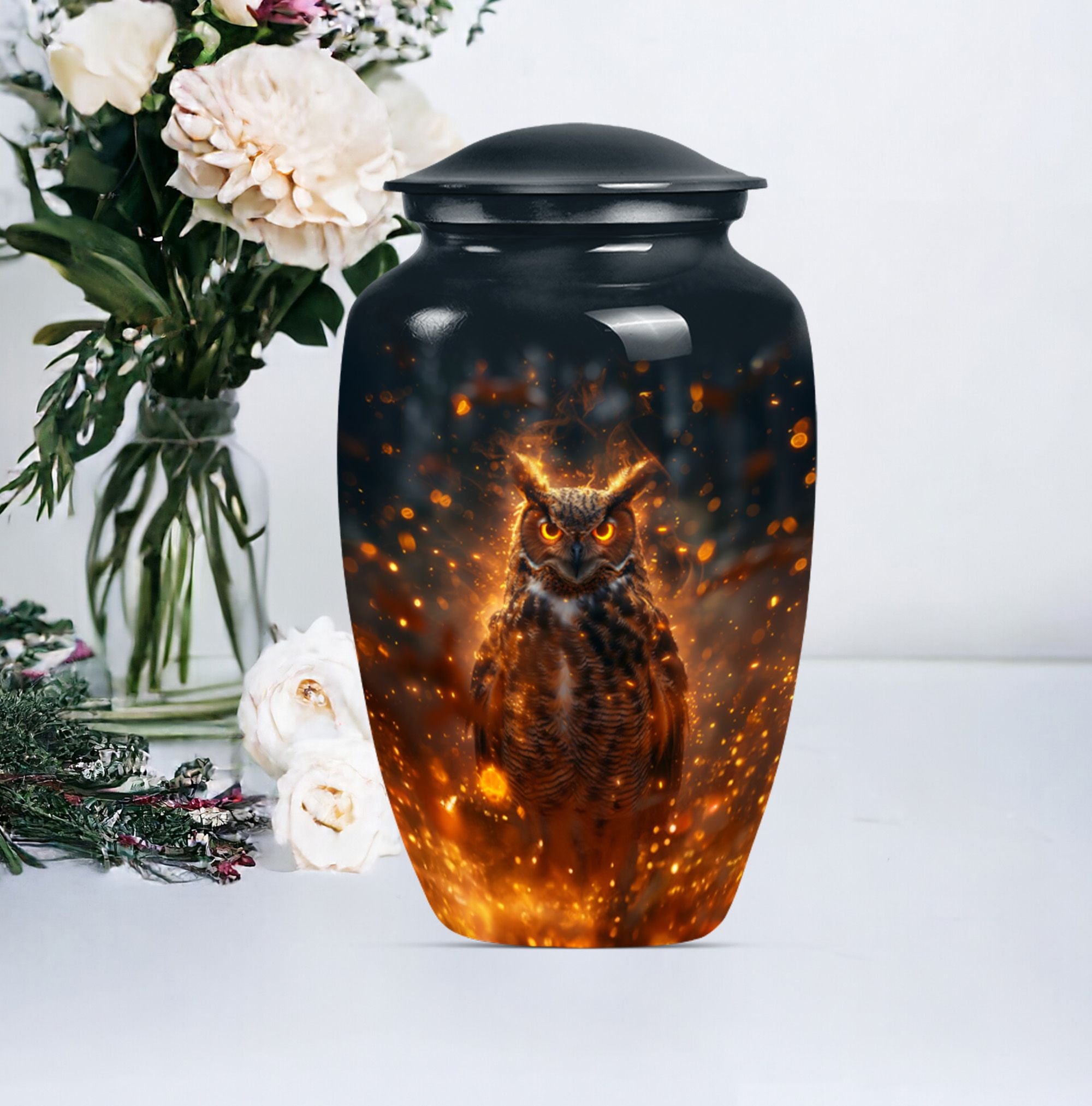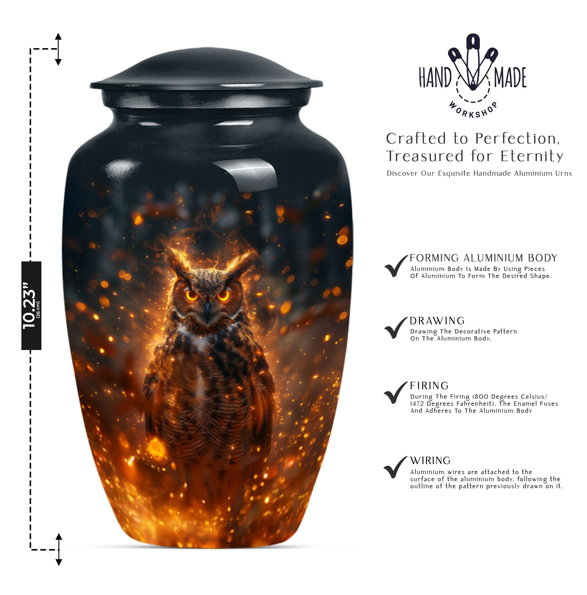 Searching for a meaningful resting place for a loved one? Our majestic 10 inch owl urn may be the perfect choice. This remarkable cremation urn, designed for an adult male, offers a blend of simplicity and magnificence that honors the memory of your cherished one. Being sensitive to the emotional heft of such a product, a soft velvet pouch is included in the package for careful containment of the ashes. Despite its featherweight of just 3.3 pounds, this full-size urn has a comforting solidity. Its capacity of 200 cubic inches ensures ample space for preservation. Adding to the urn's appeal is a striking theme of a wolf howling, lending a noble feel to this heartfelt memorial item. Crafted from durable Aluminium, this evocative owl urn is robust and long-lasting, making it a fitting keepsake. To embellish it further, feel free to personalize the urn with engraved names; a poignant touch to a resonant tribute. Whether you're looking for large urns, portable urns for travels, or even a metal mandir for home, our line of memorial urns cater to diverse needs. Fulfilling your search for 'owls urn' or 'cremation urn for ashes adult male', this unique piece holds both tangible and emotional value.