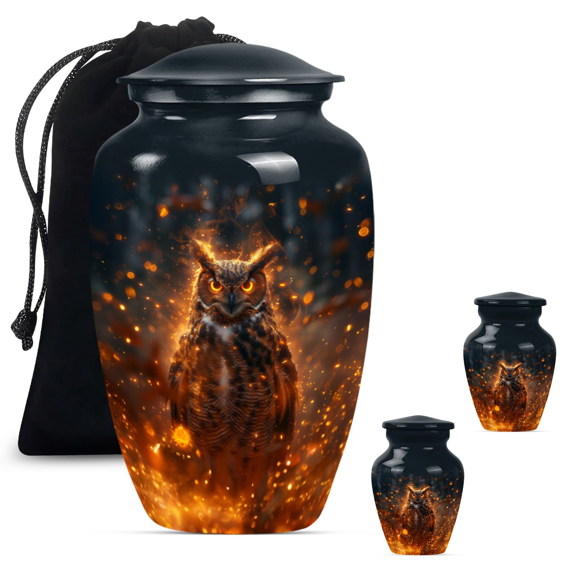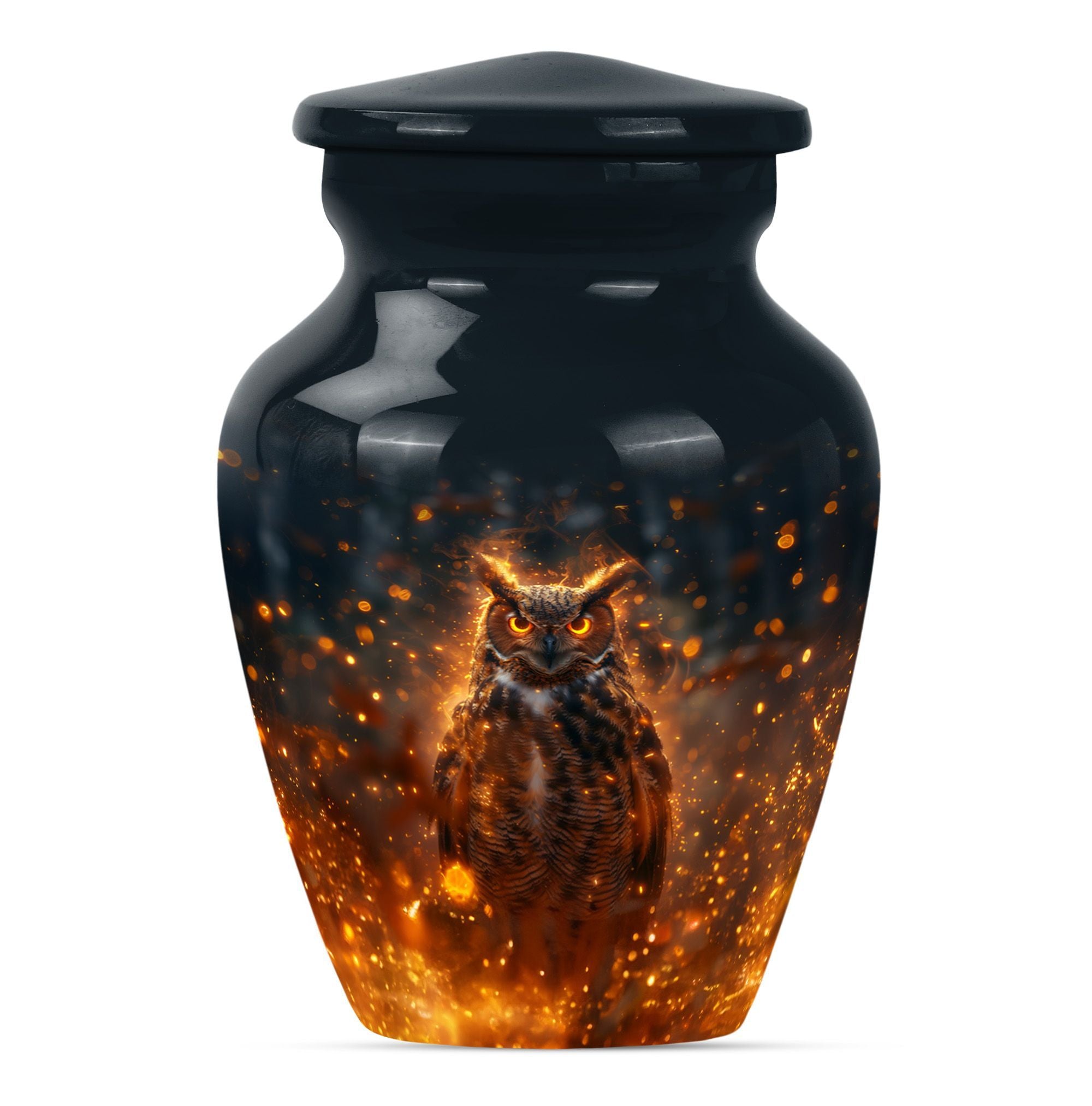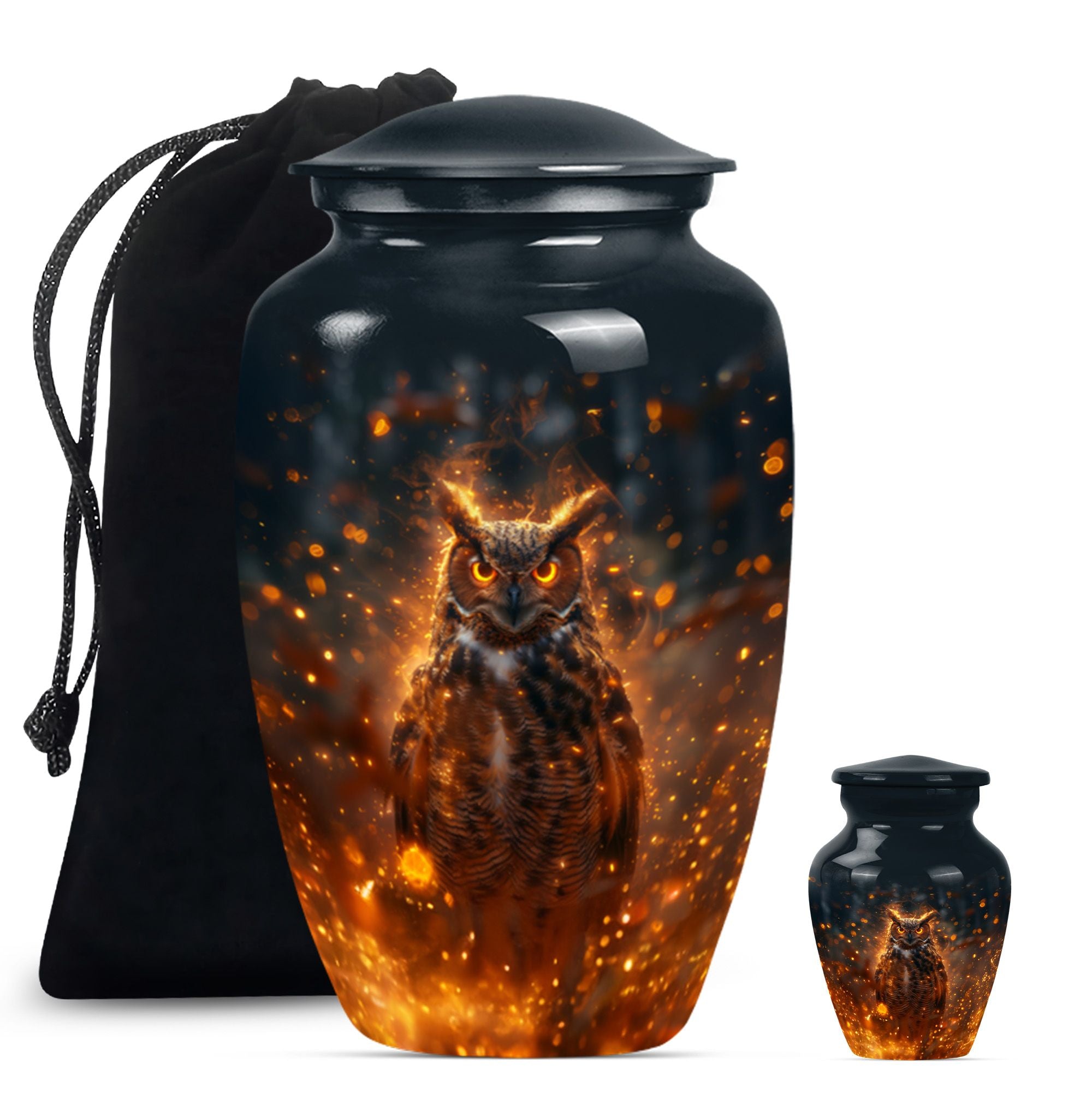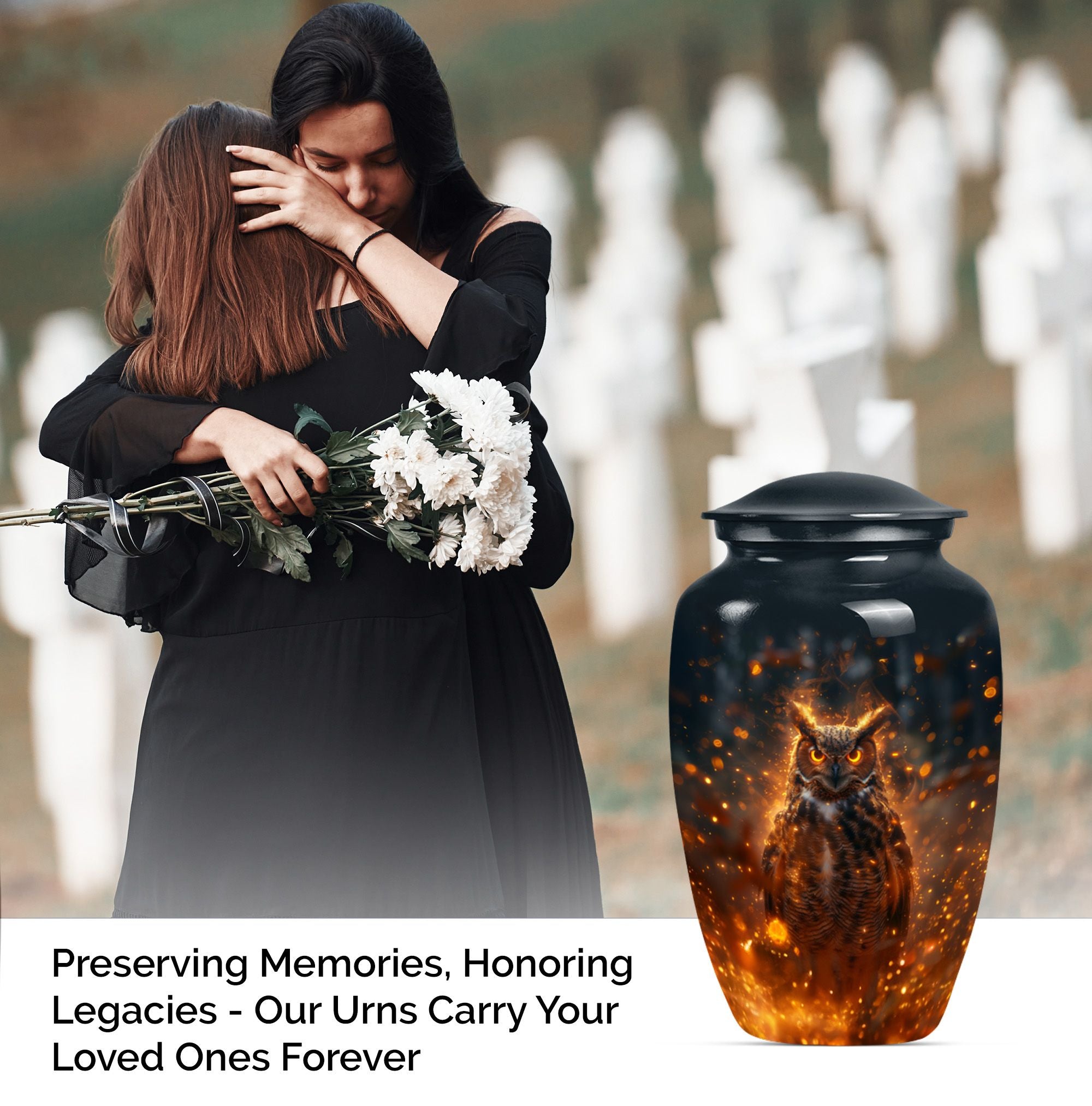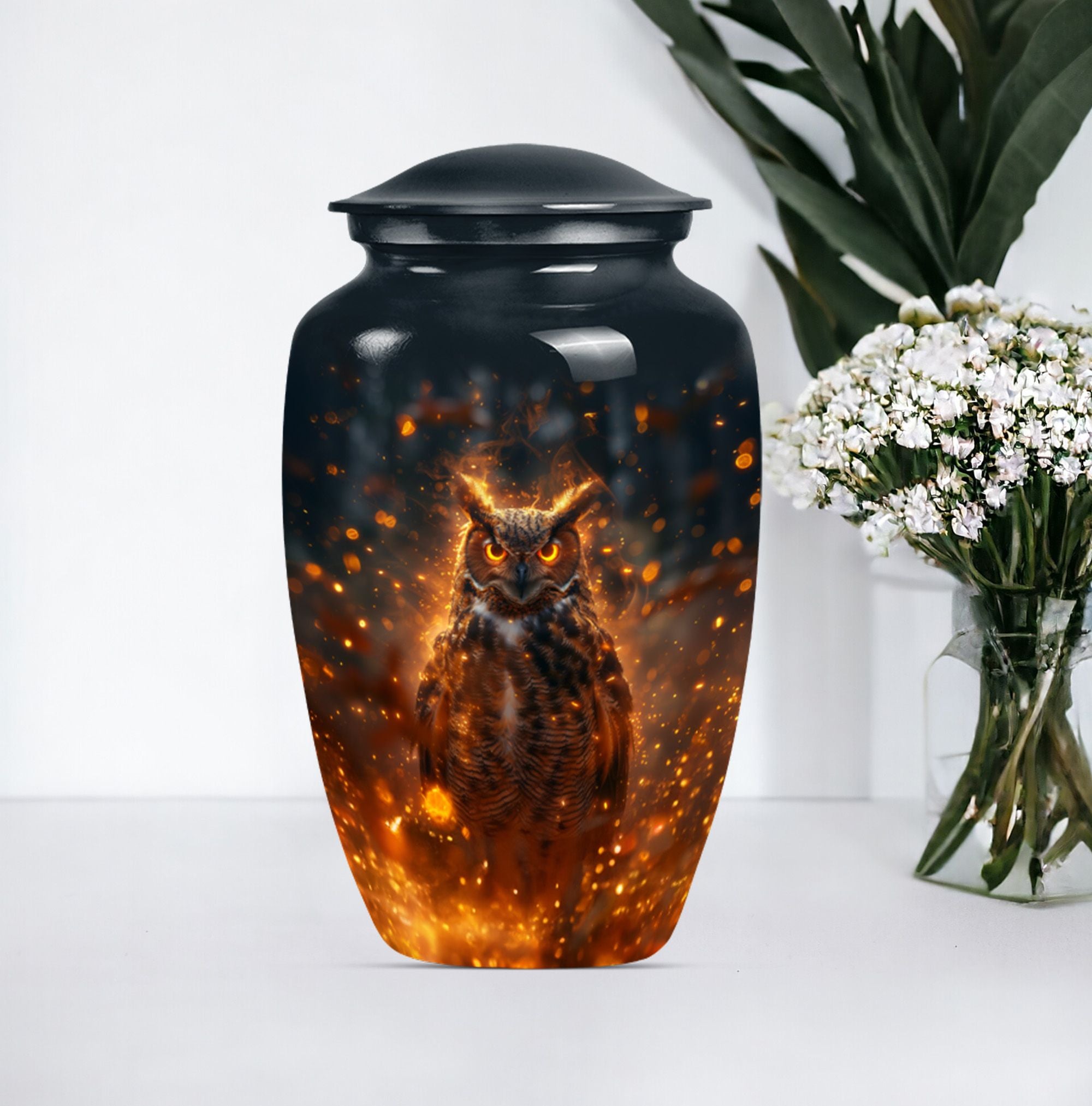 Searching for a meaningful resting place for a loved one? Our majestic 10 inch owl urn may be the perfect choice. This remarkable cremation urn, designed for an adult male, offers a blend of simplicity and magnificence that honors the memory of your cherished one. Being sensitive to the emotional heft of such a product, a soft velvet pouch is included in the package for careful containment of the ashes. Despite its featherweight of just 3.3 pounds, this full-size urn has a comforting solidity. Its capacity of 200 cubic inches ensures ample space for preservation. Adding to the urn's appeal is a striking theme of a wolf howling, lending a noble feel to this heartfelt memorial item. Crafted from durable Aluminium, this evocative owl urn is robust and long-lasting, making it a fitting keepsake. To embellish it further, feel free to personalize the urn with engraved names; a poignant touch to a resonant tribute. Whether you're looking for large urns, portable urns for travels, or even a metal mandir for home, our line of memorial urns cater to diverse needs. Fulfilling your search for 'owls urn' or 'cremation urn for ashes adult male', this unique piece holds both tangible and emotional value.