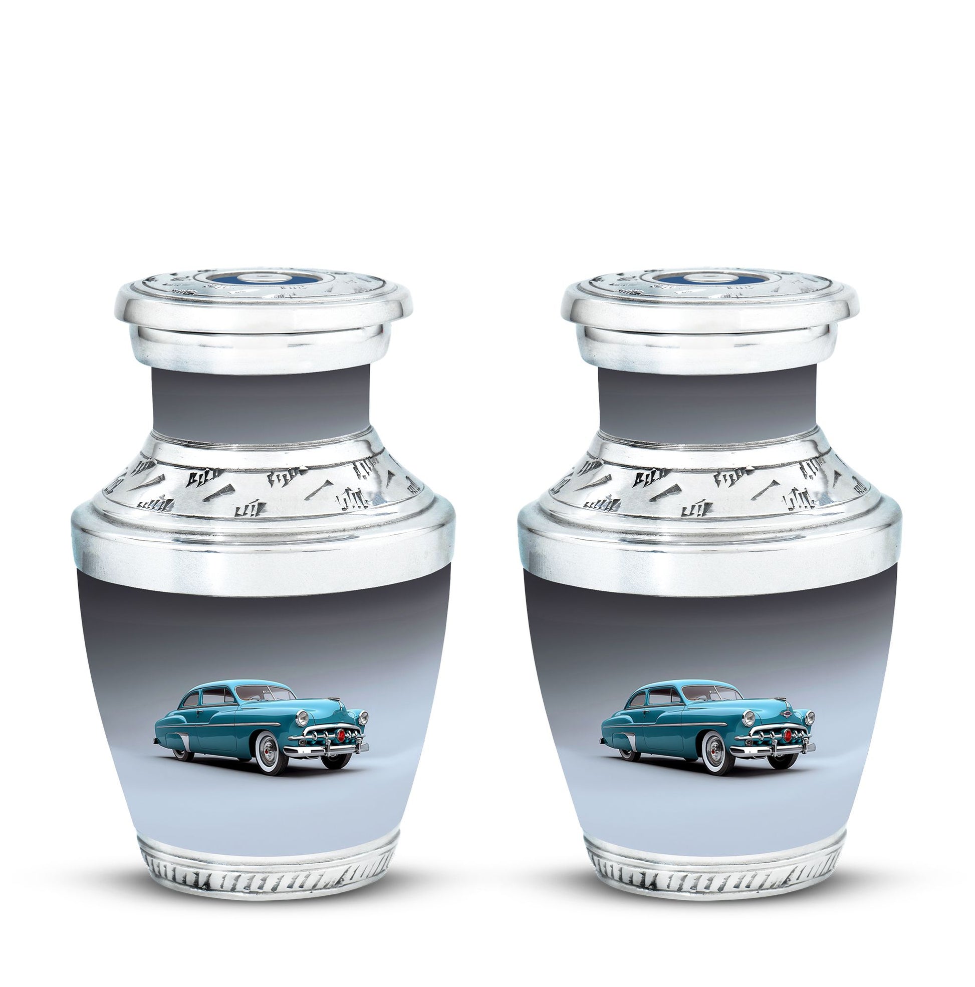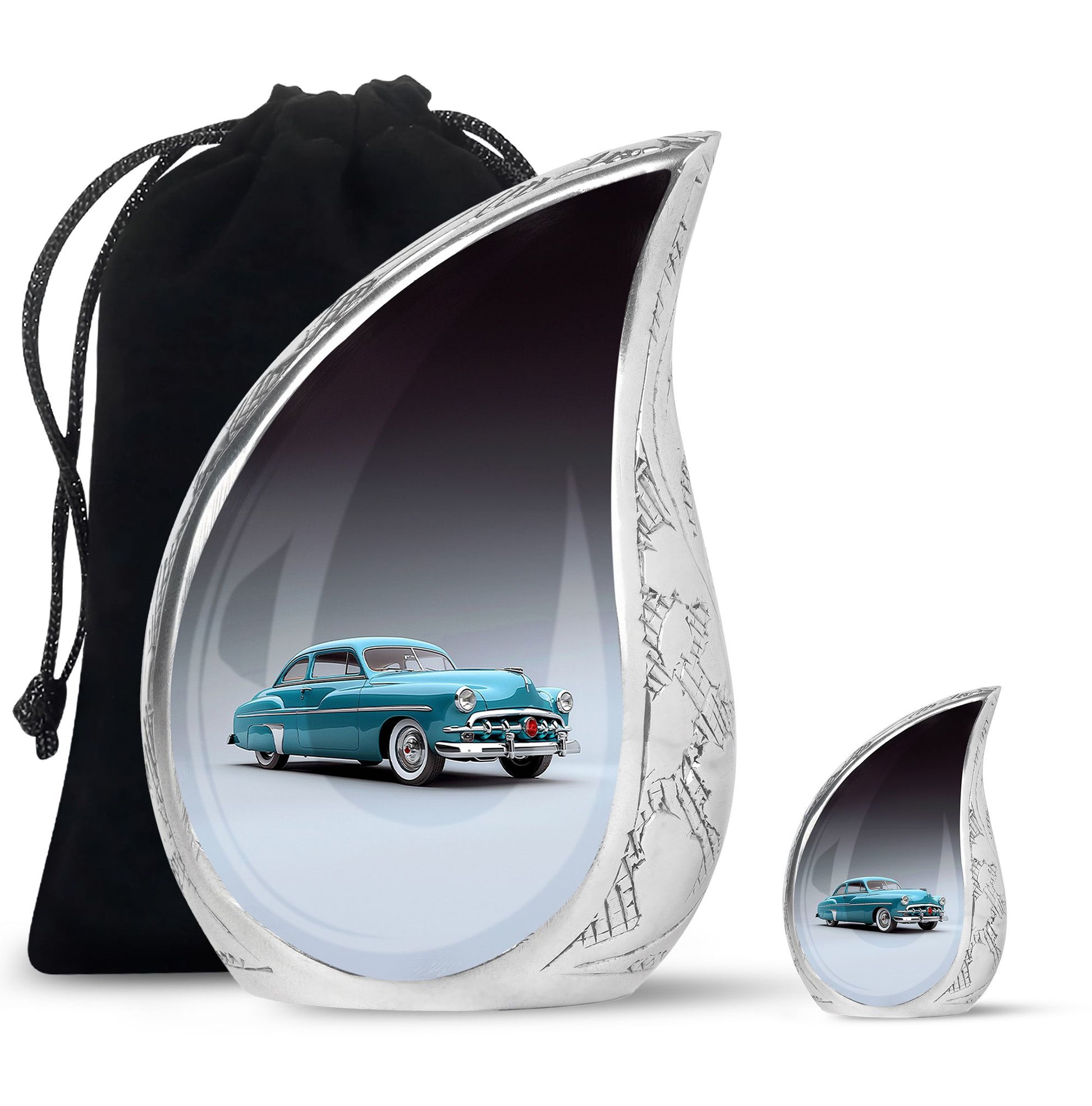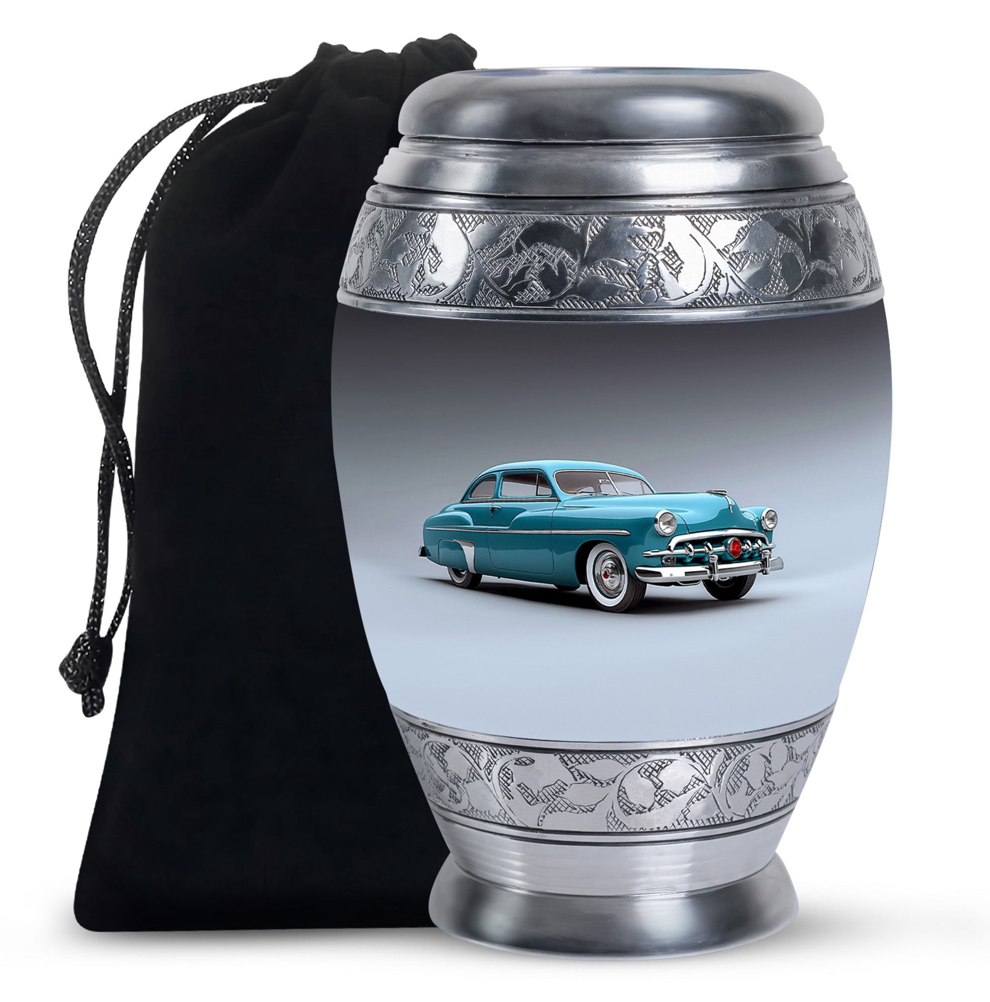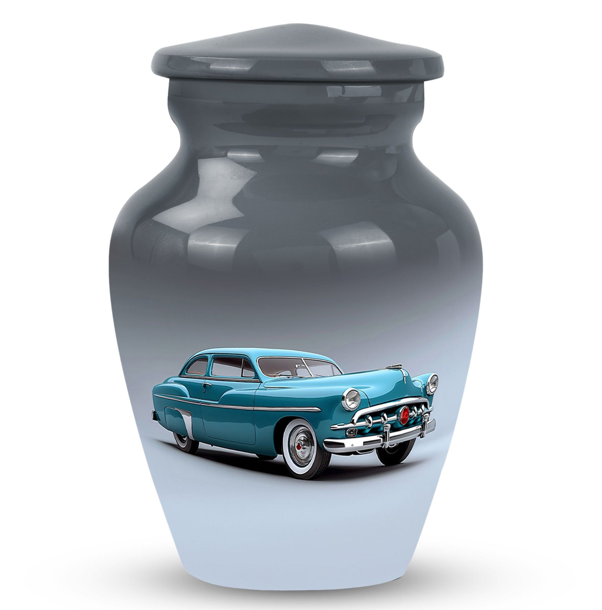 Beautifully handcrafted, this urn for human ashes adult male features a deep vintage red car motif with silver detailing, evoking classic elegance and enduring craftsmanship. Constructed from durable aluminum, it ensures lasting protection and peace of mind. The secure screw-top lid keeps ashes safely enclosed, while its polished surface adds a touch of sophistication — making it a timeless urn for ashes adult male small keepsake or a stunning display piece for memorial settings. Whether chosen as urns for human ashes adult female mom or urns for human ashes adult male dad, each design honors life’s treasured memories.