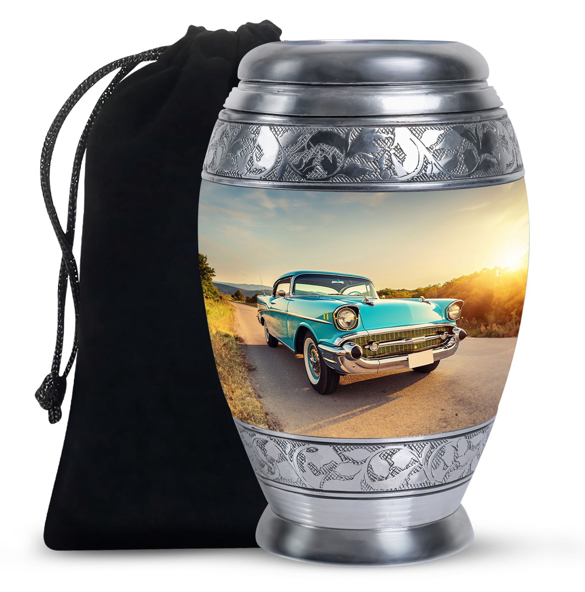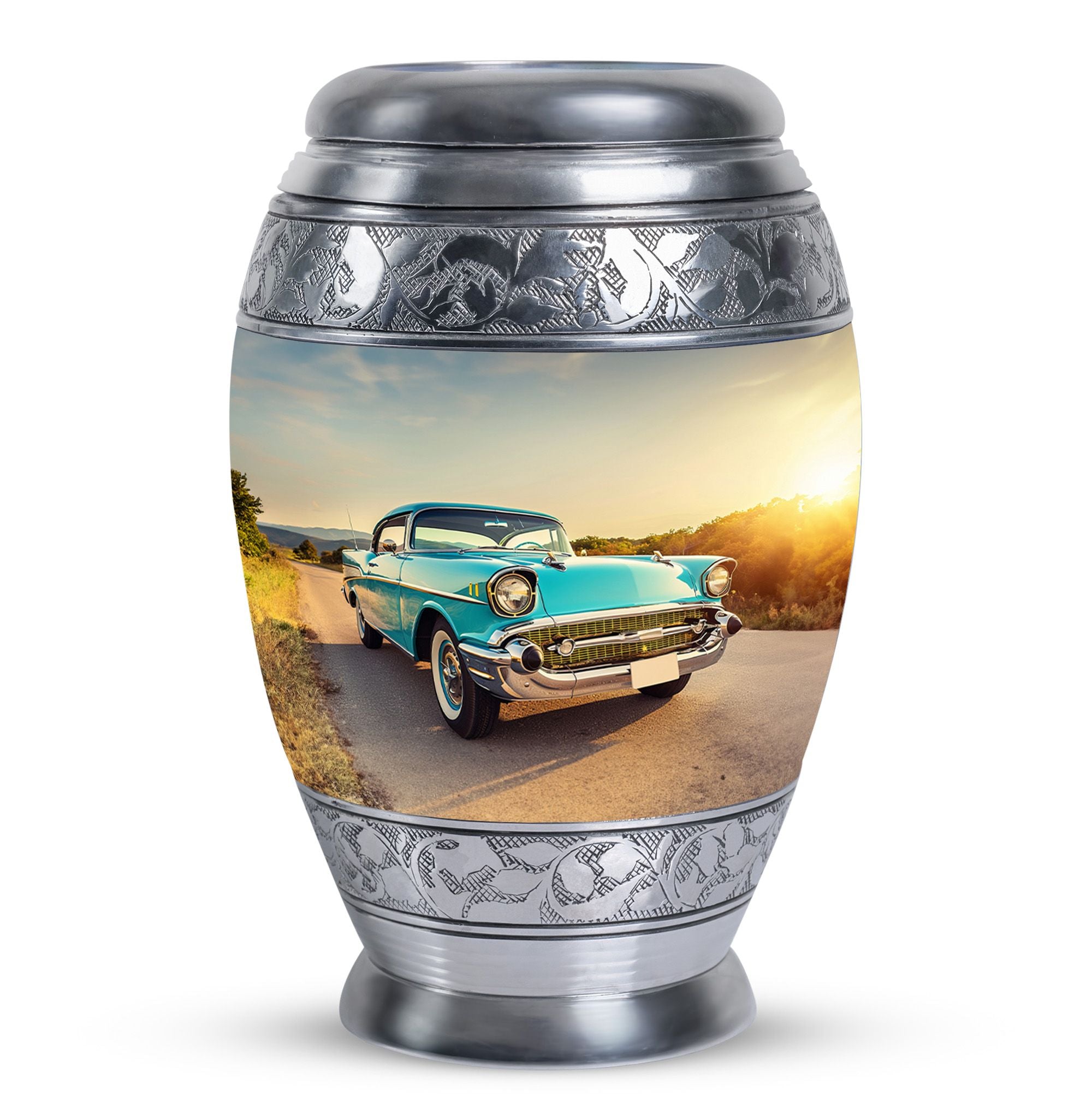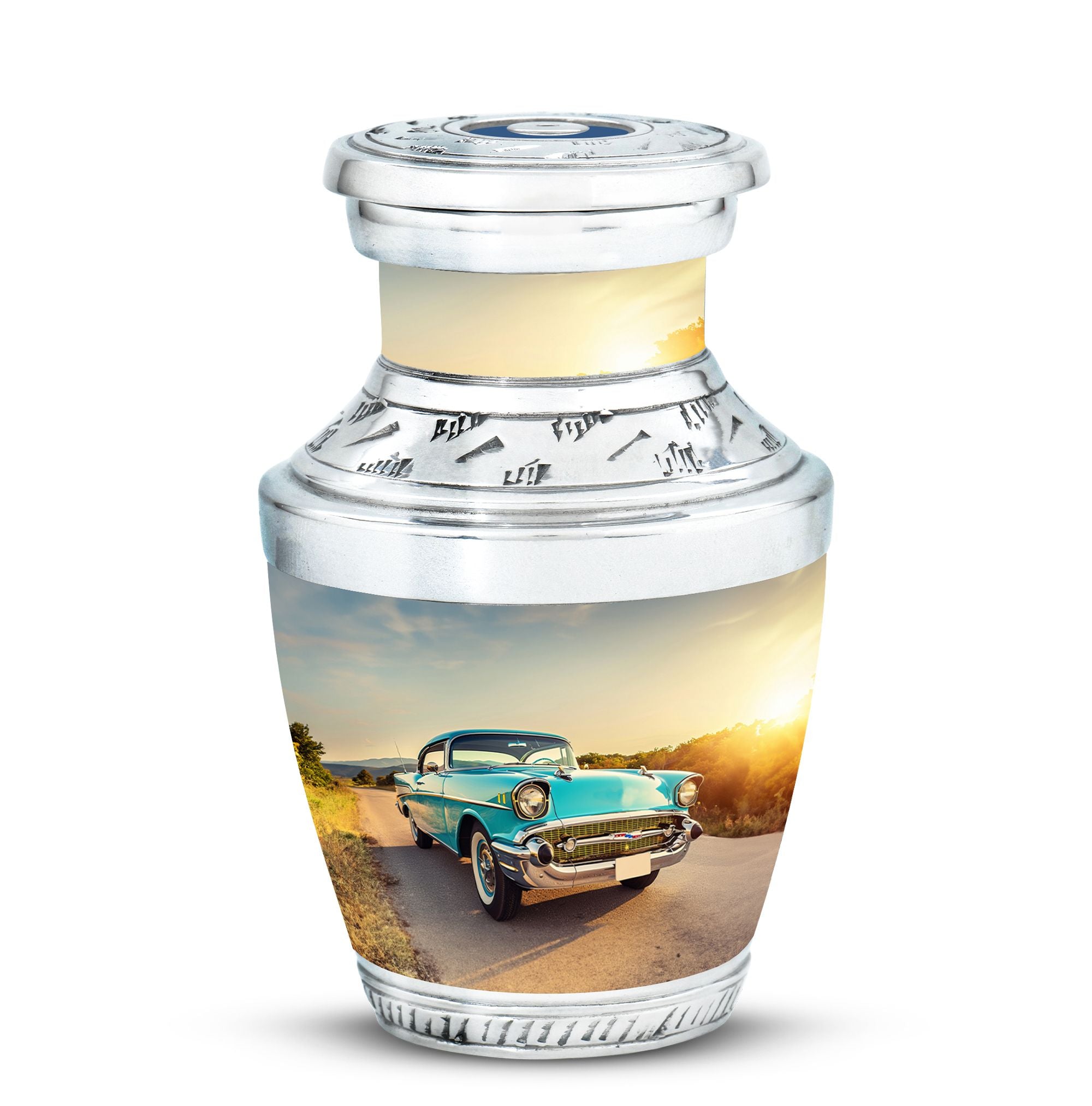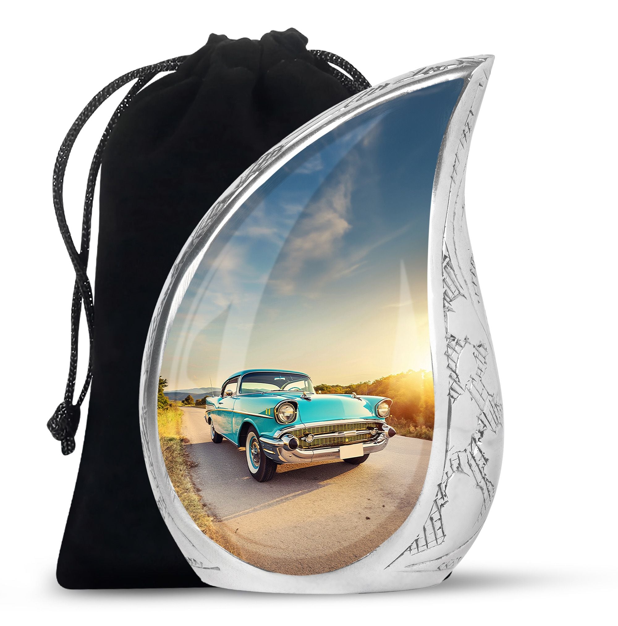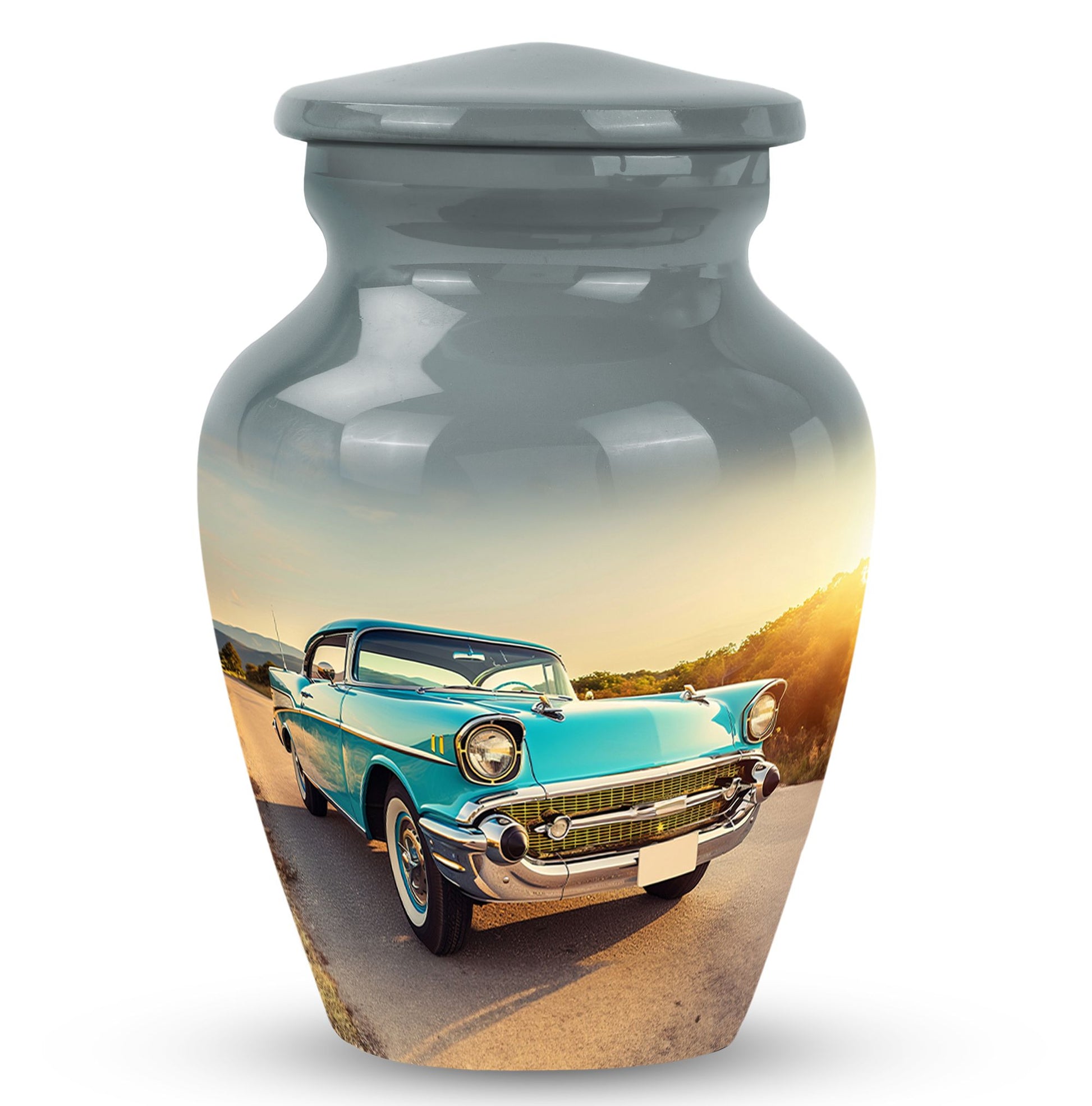 Expertly crafted from high-quality aluminium, this urn for human ashes adult male showcases intricate detailing inspired by the timeless 1957 Chevrolet Bel Air. The design radiates vintage charm, making it an exceptional piece among urns for ashes adult male collections. The smooth finish and durable build ensure long-lasting preservation, while its secure screw-top lid provides peace of mind. Whether displayed at home or chosen for a dignified resting place, this small urn for ashes adult male reflects elegance and strength in every detail.