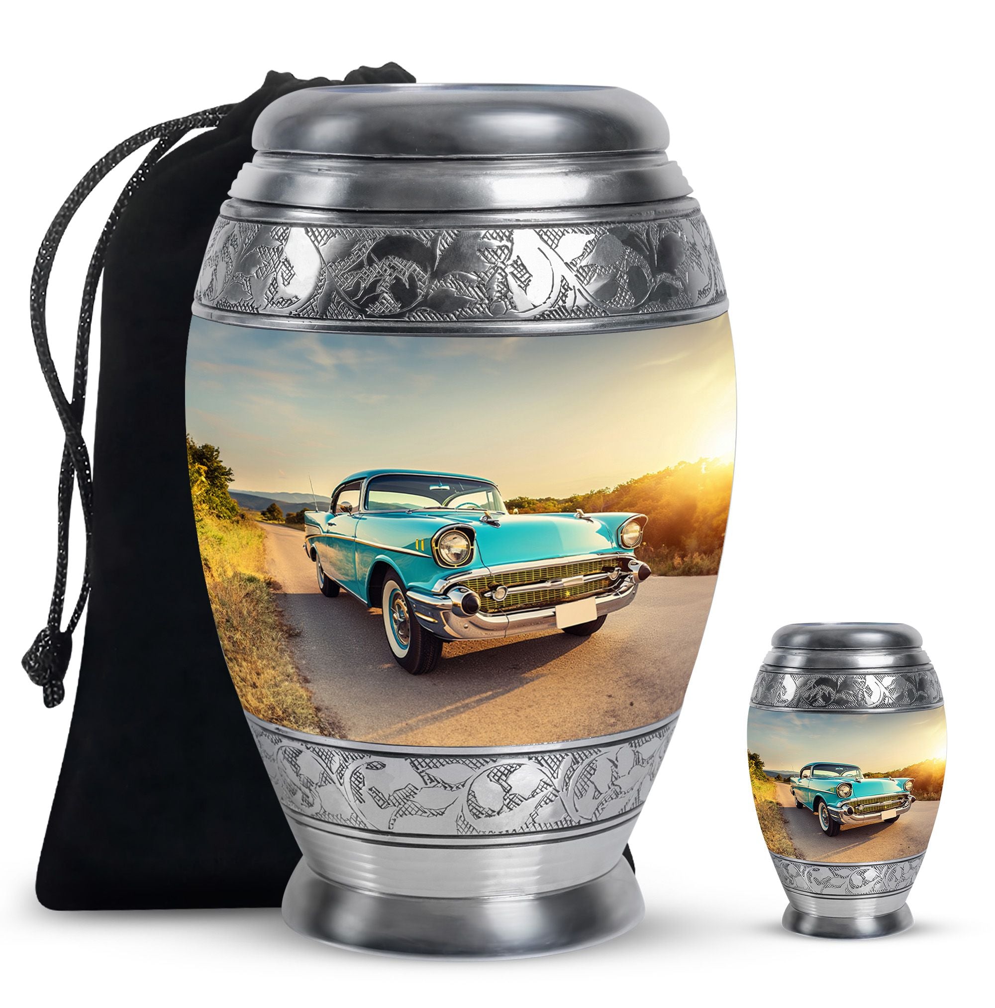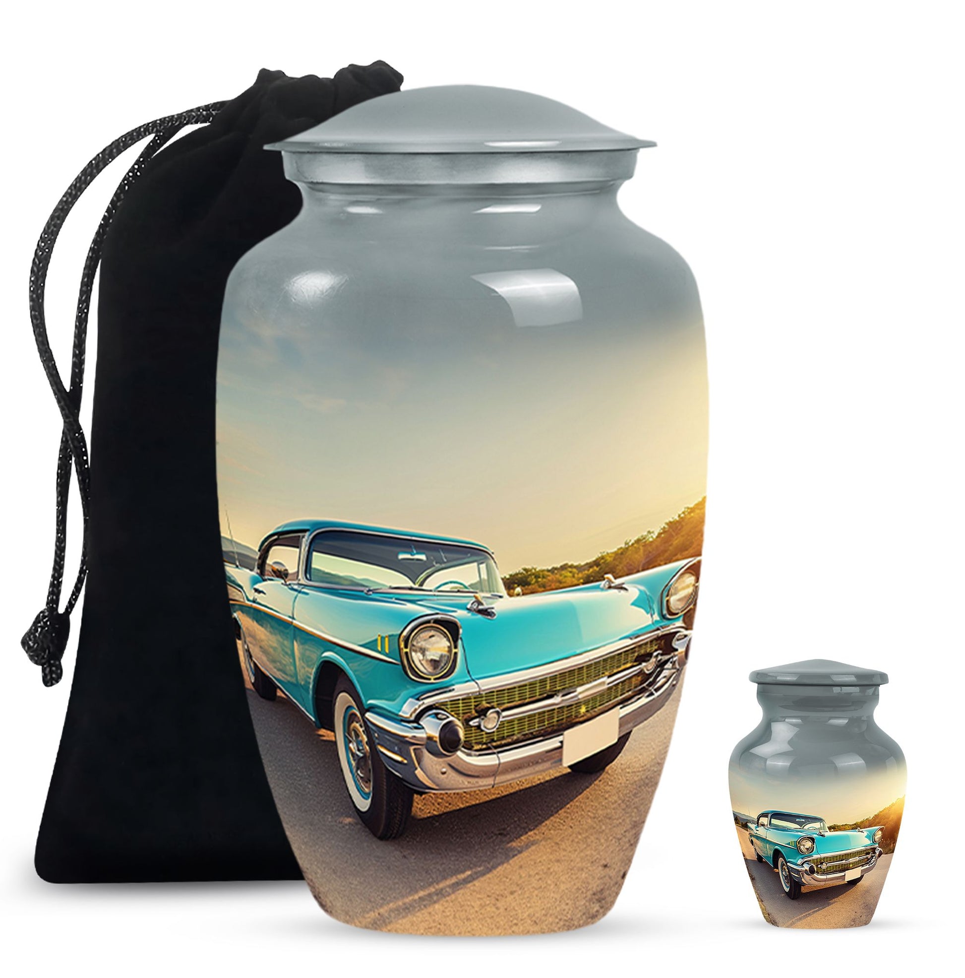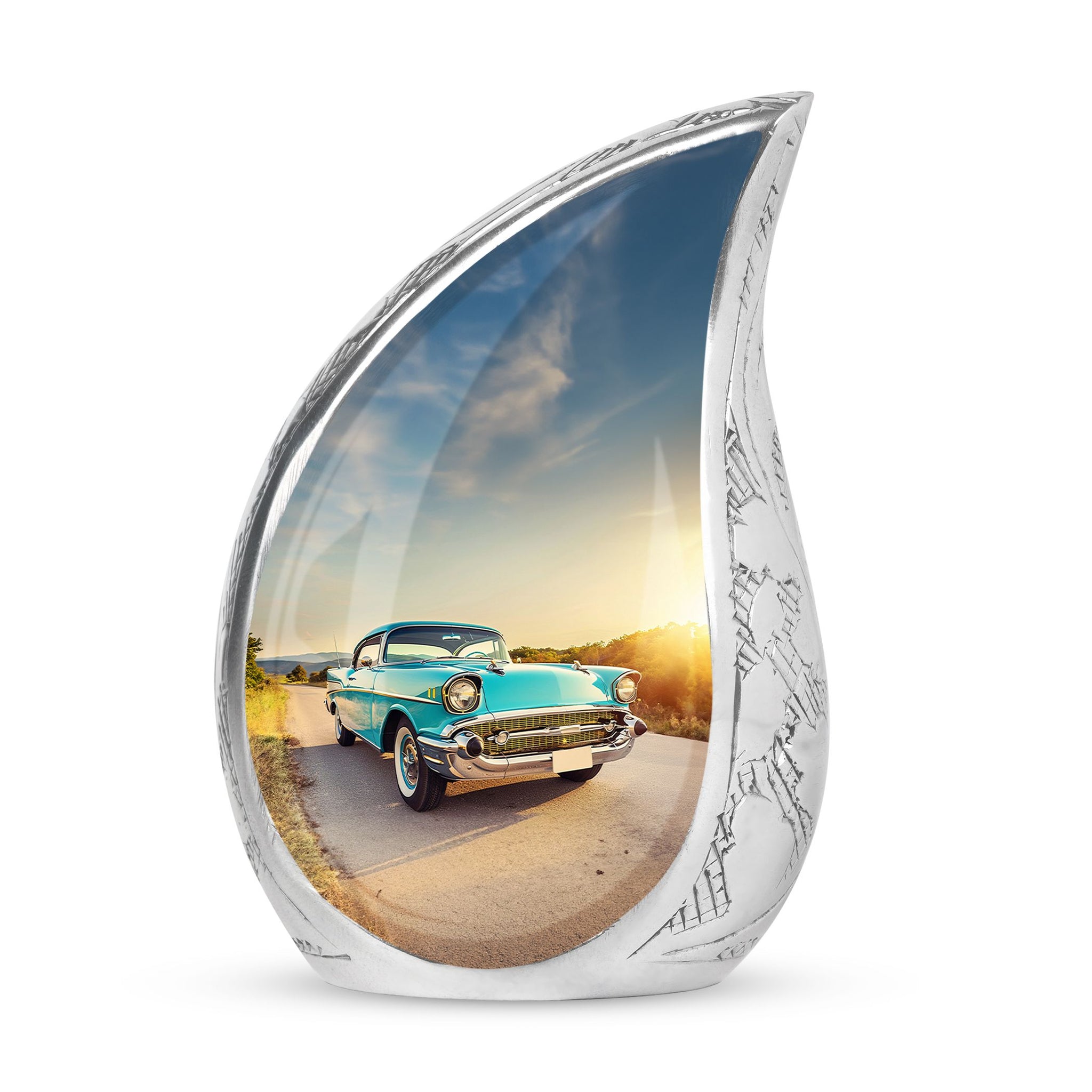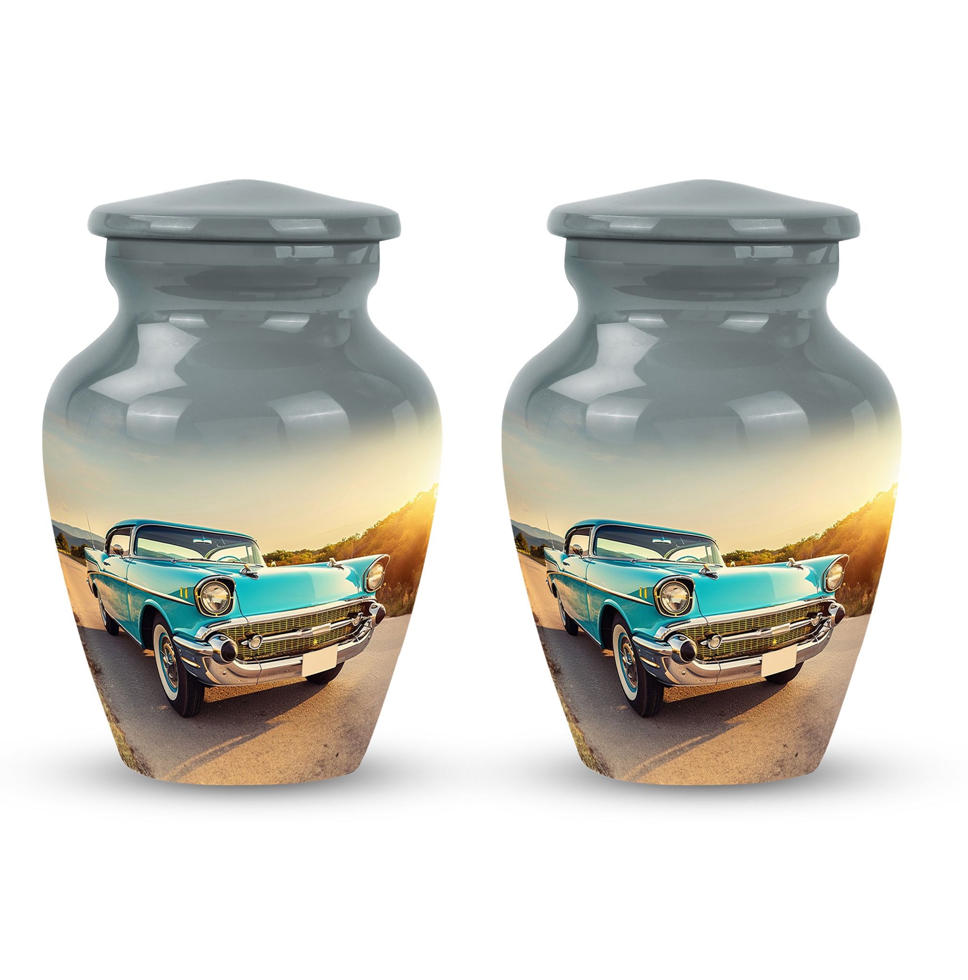 Expertly crafted from high-quality aluminium, this urn for human ashes adult male showcases intricate detailing inspired by the timeless 1957 Chevrolet Bel Air. The design radiates vintage charm, making it an exceptional piece among urns for ashes adult male collections. The smooth finish and durable build ensure long-lasting preservation, while its secure screw-top lid provides peace of mind. Whether displayed at home or chosen for a dignified resting place, this small urn for ashes adult male reflects elegance and strength in every detail.
