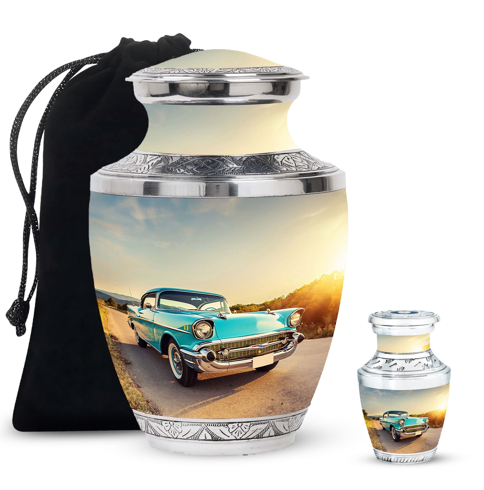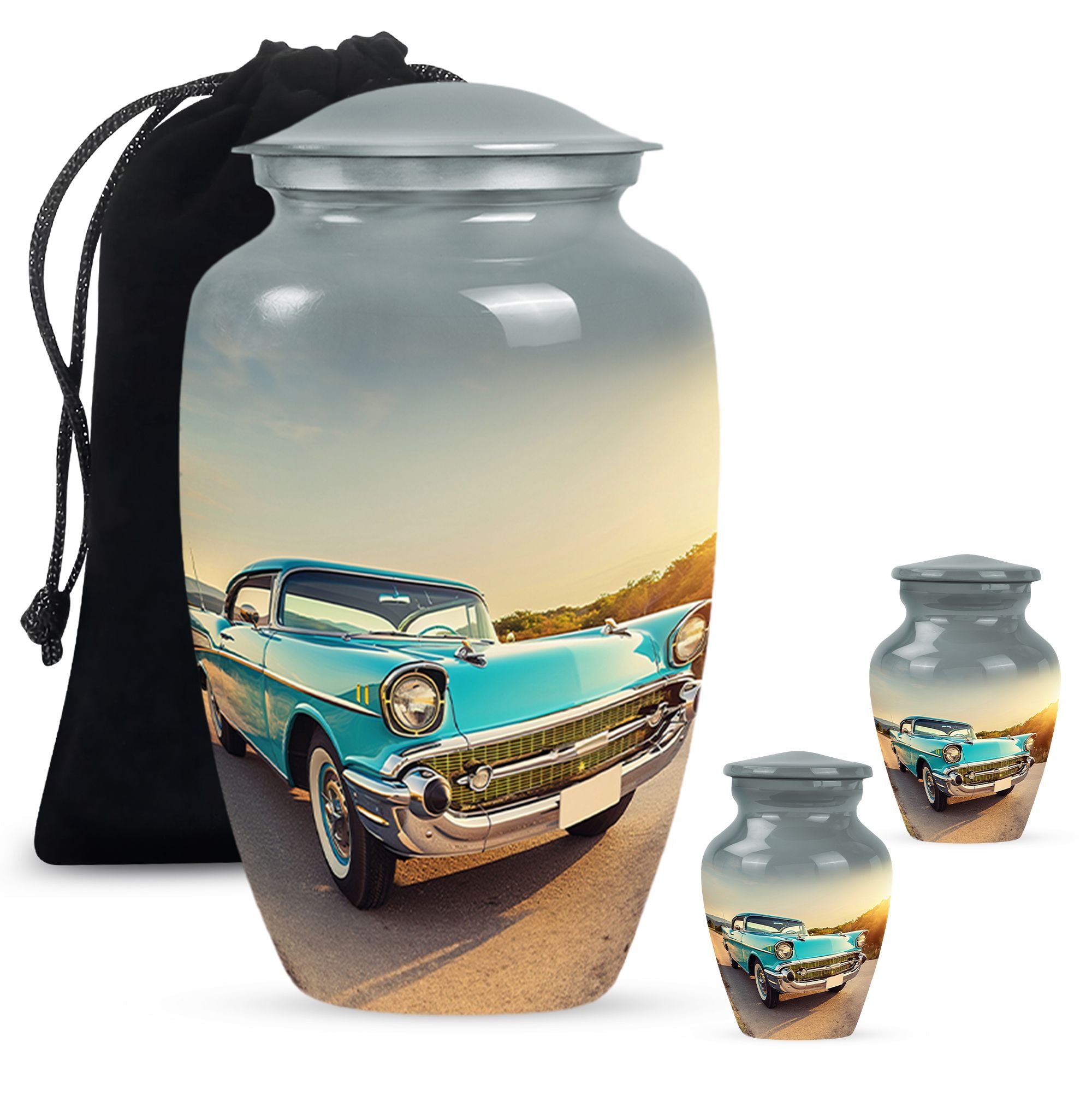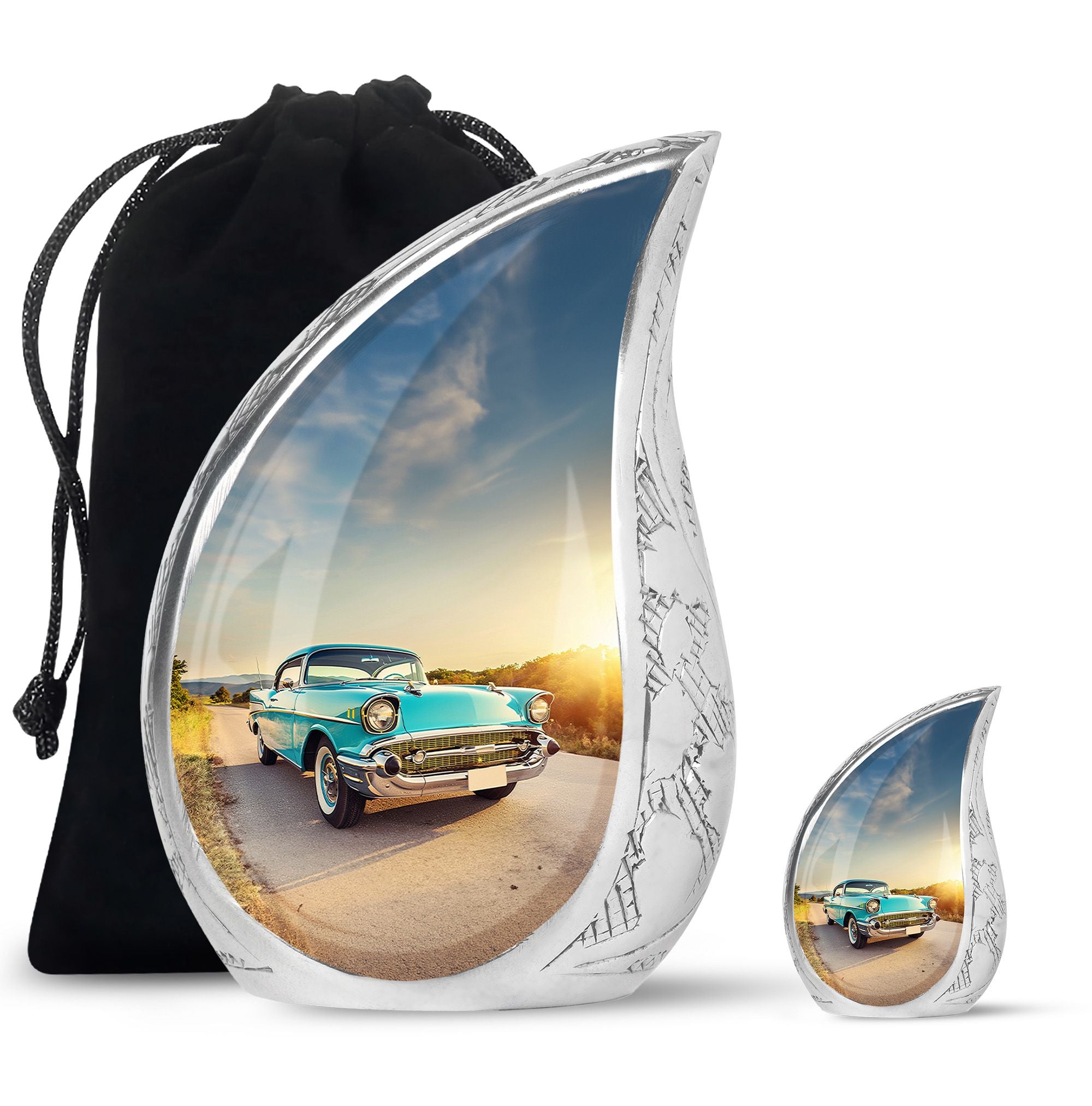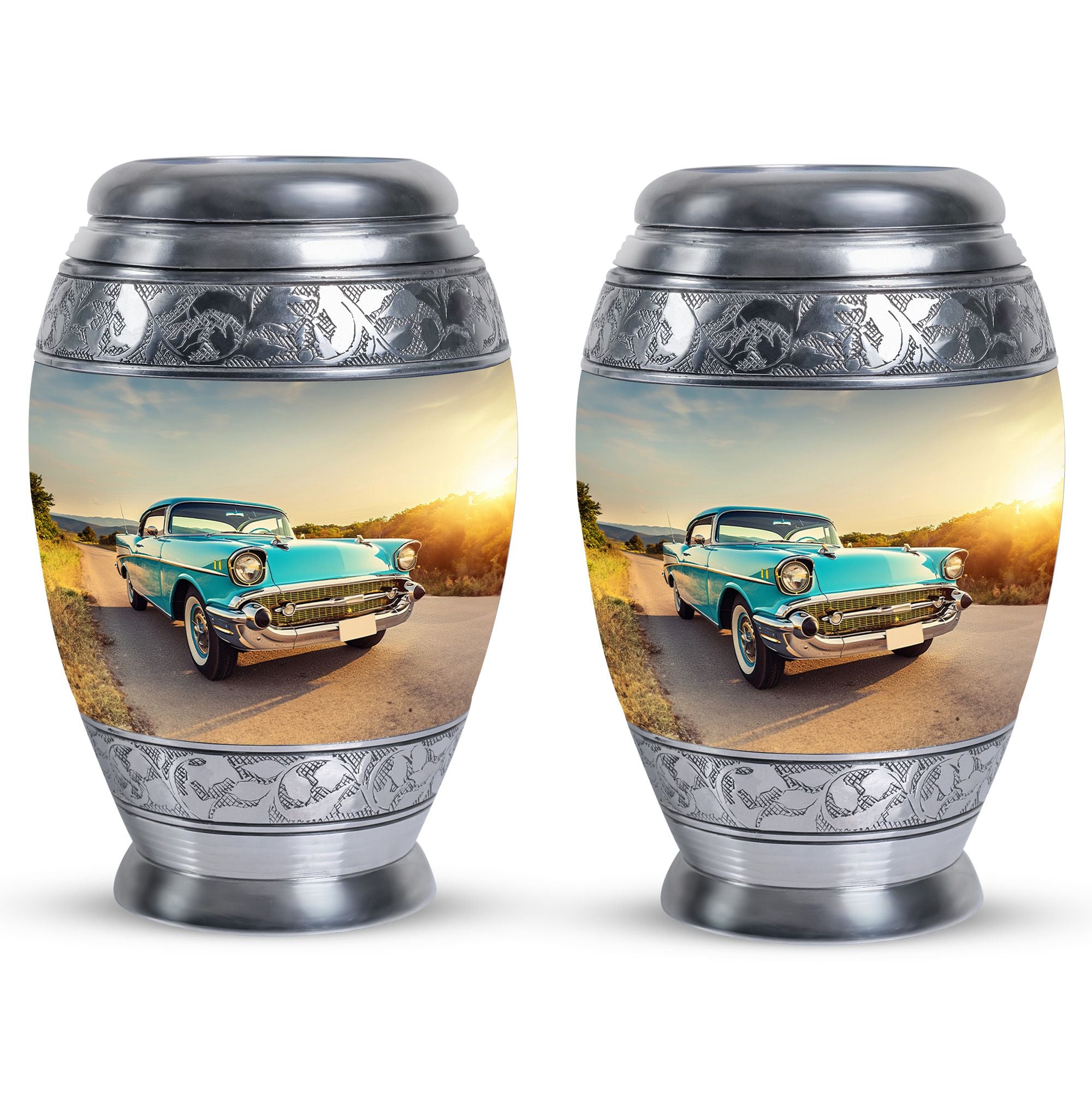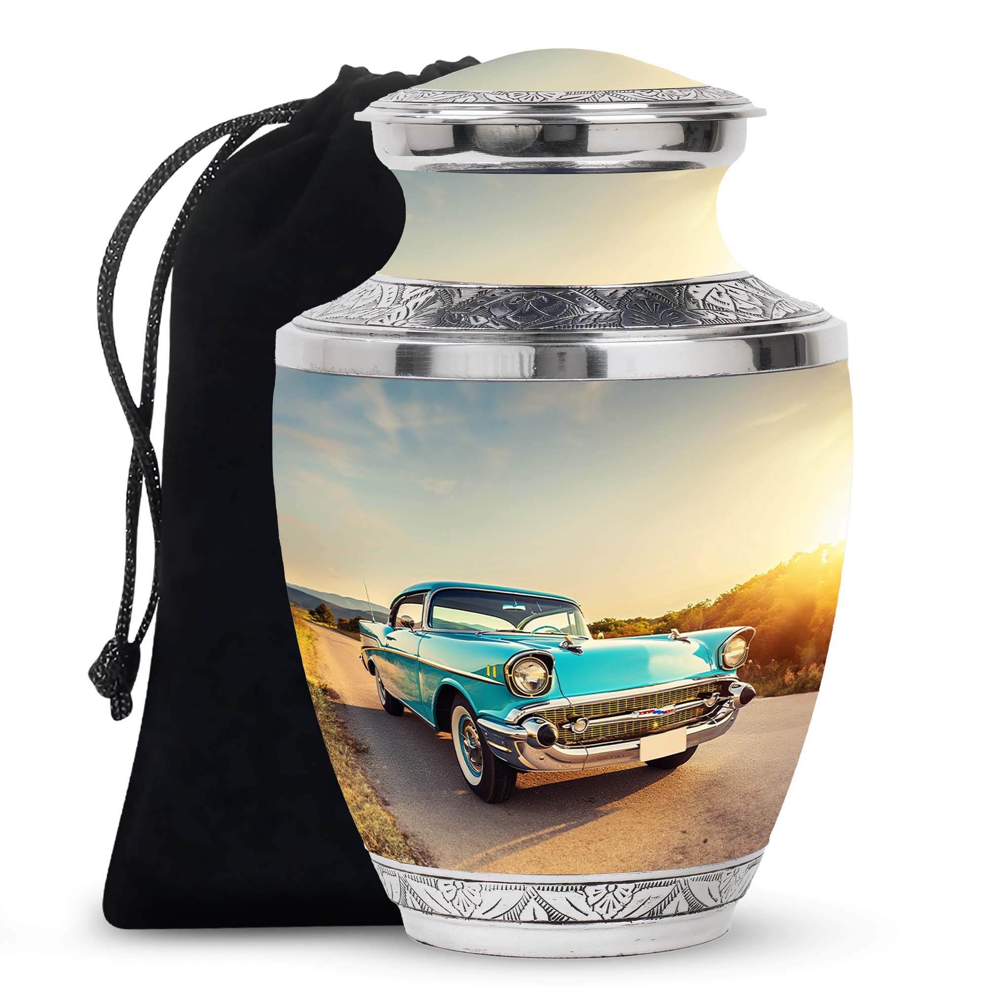 Expertly crafted from high-quality aluminium, this urn for human ashes adult male showcases intricate detailing inspired by the timeless 1957 Chevrolet Bel Air. The design radiates vintage charm, making it an exceptional piece among urns for ashes adult male collections. The smooth finish and durable build ensure long-lasting preservation, while its secure screw-top lid provides peace of mind. Whether displayed at home or chosen for a dignified resting place, this small urn for ashes adult male reflects elegance and strength in every detail.