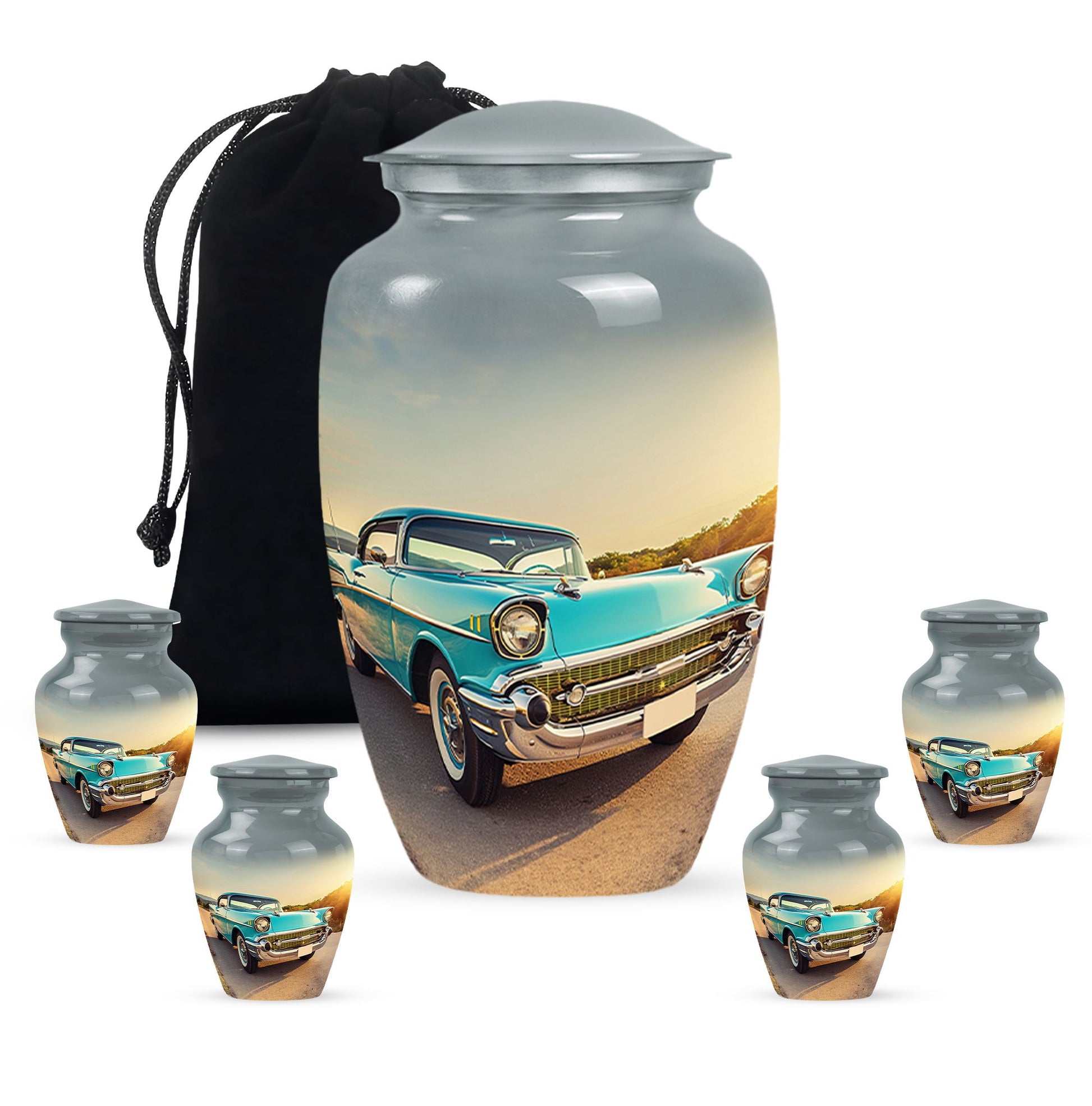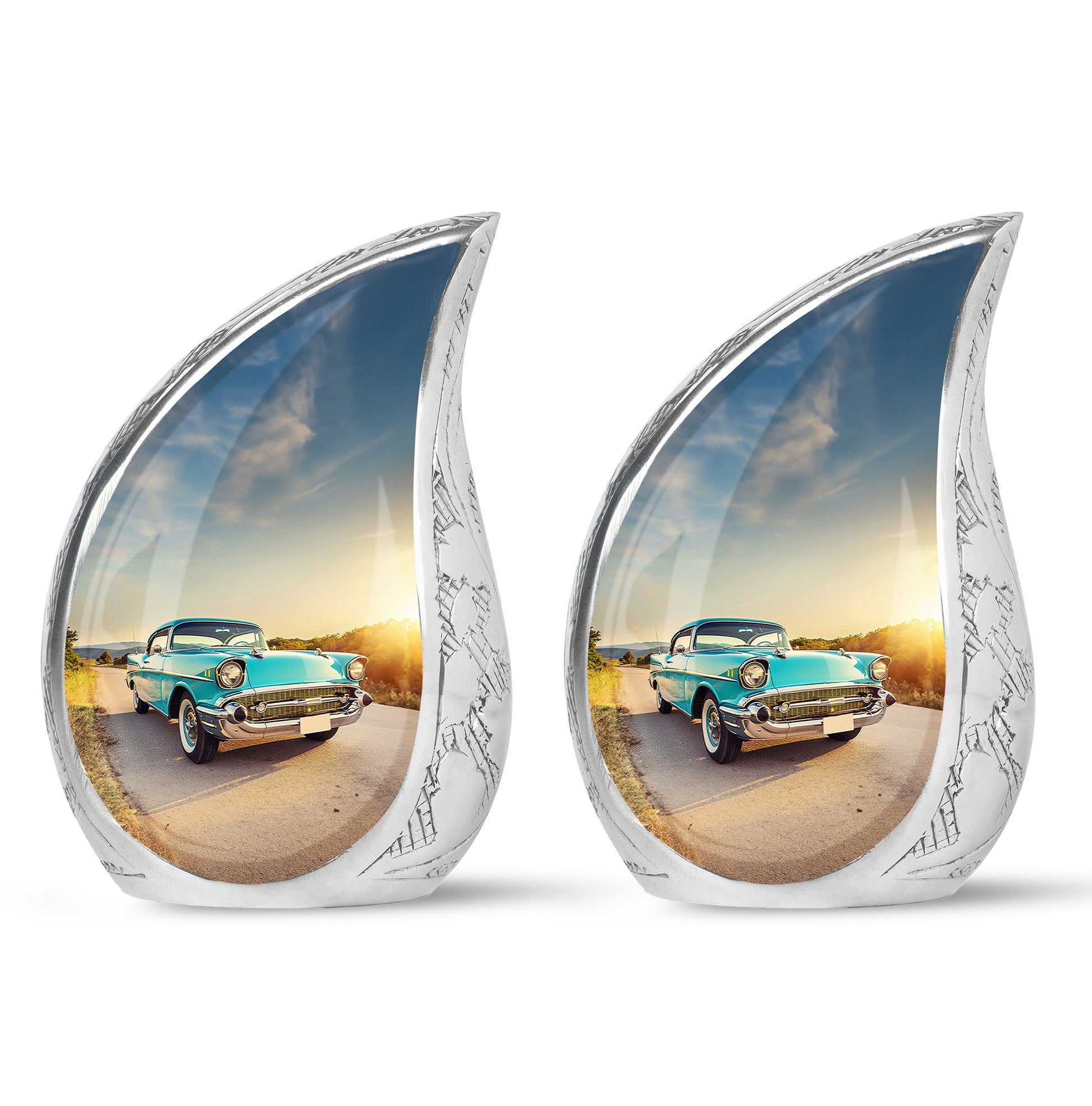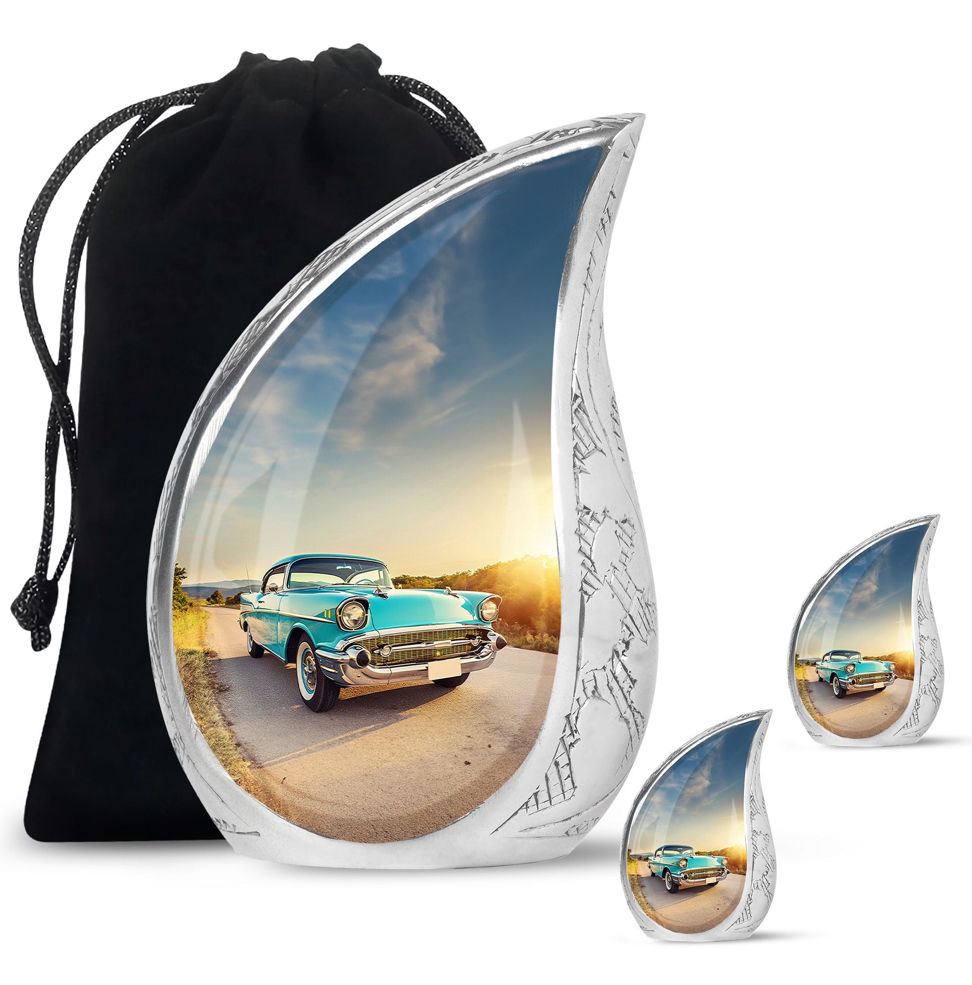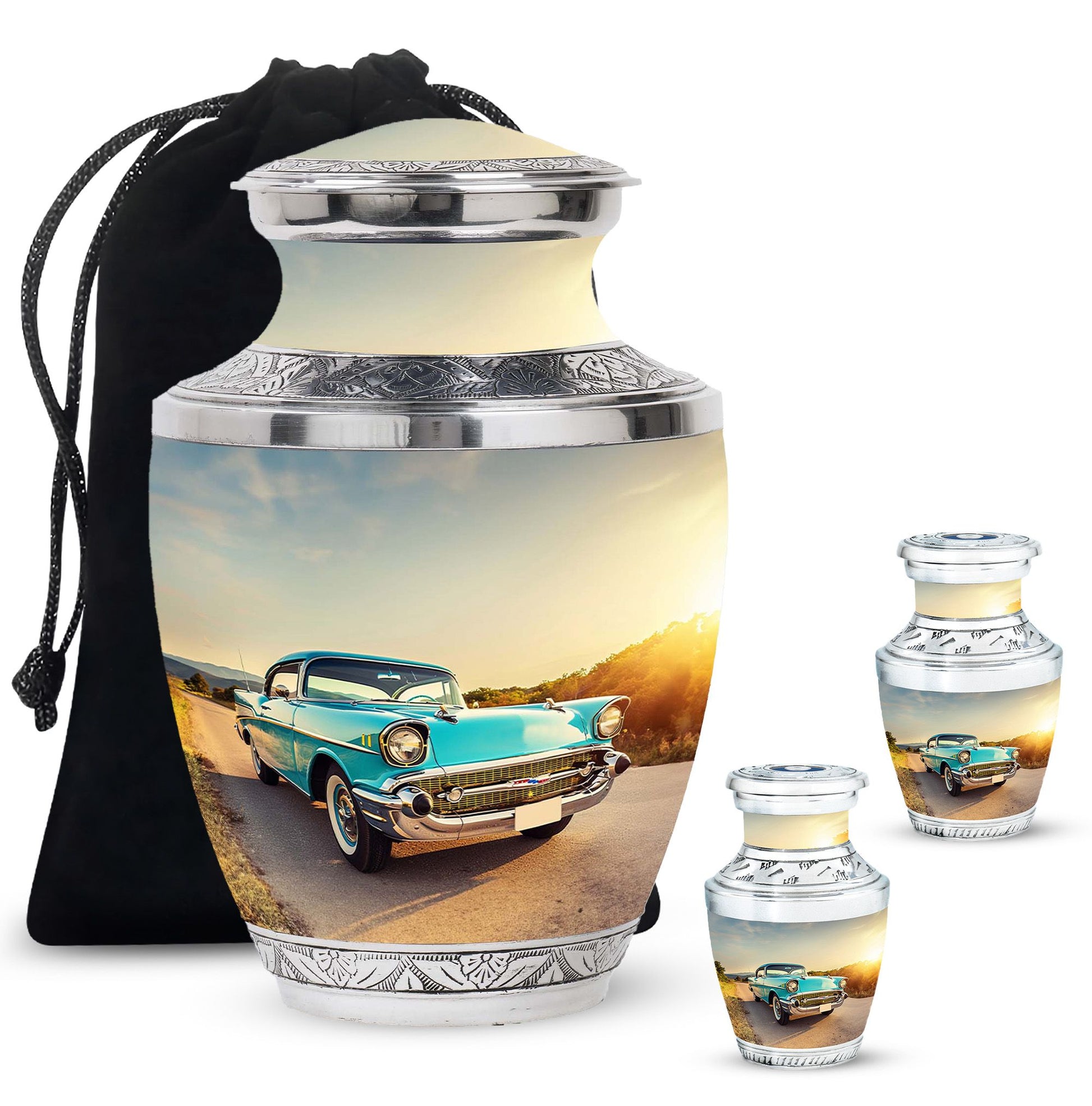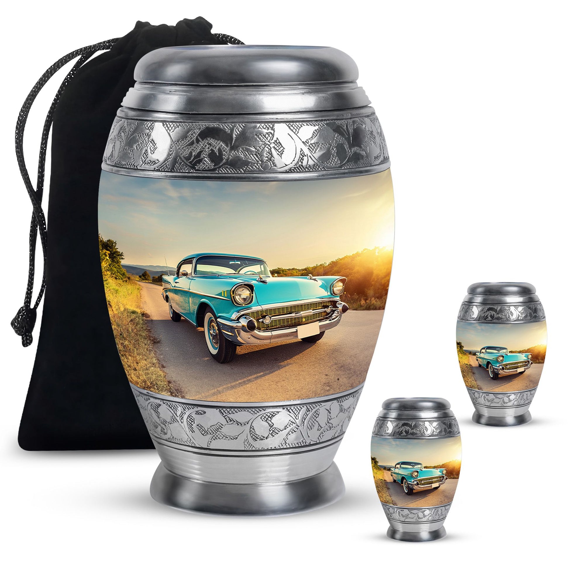 Expertly crafted from high-quality aluminium, this urn for human ashes adult male showcases intricate detailing inspired by the timeless 1957 Chevrolet Bel Air. The design radiates vintage charm, making it an exceptional piece among urns for ashes adult male collections. The smooth finish and durable build ensure long-lasting preservation, while its secure screw-top lid provides peace of mind. Whether displayed at home or chosen for a dignified resting place, this small urn for ashes adult male reflects elegance and strength in every detail.