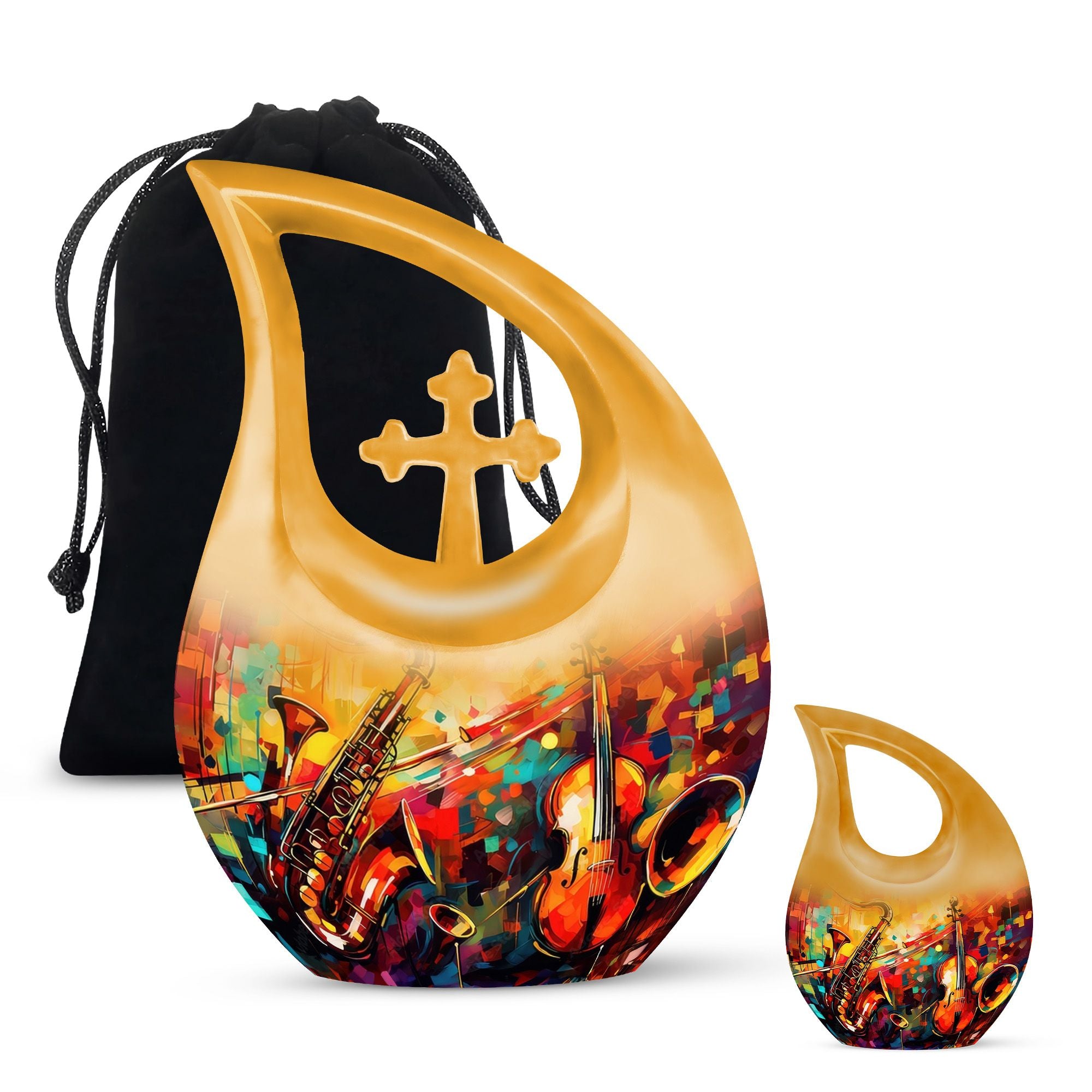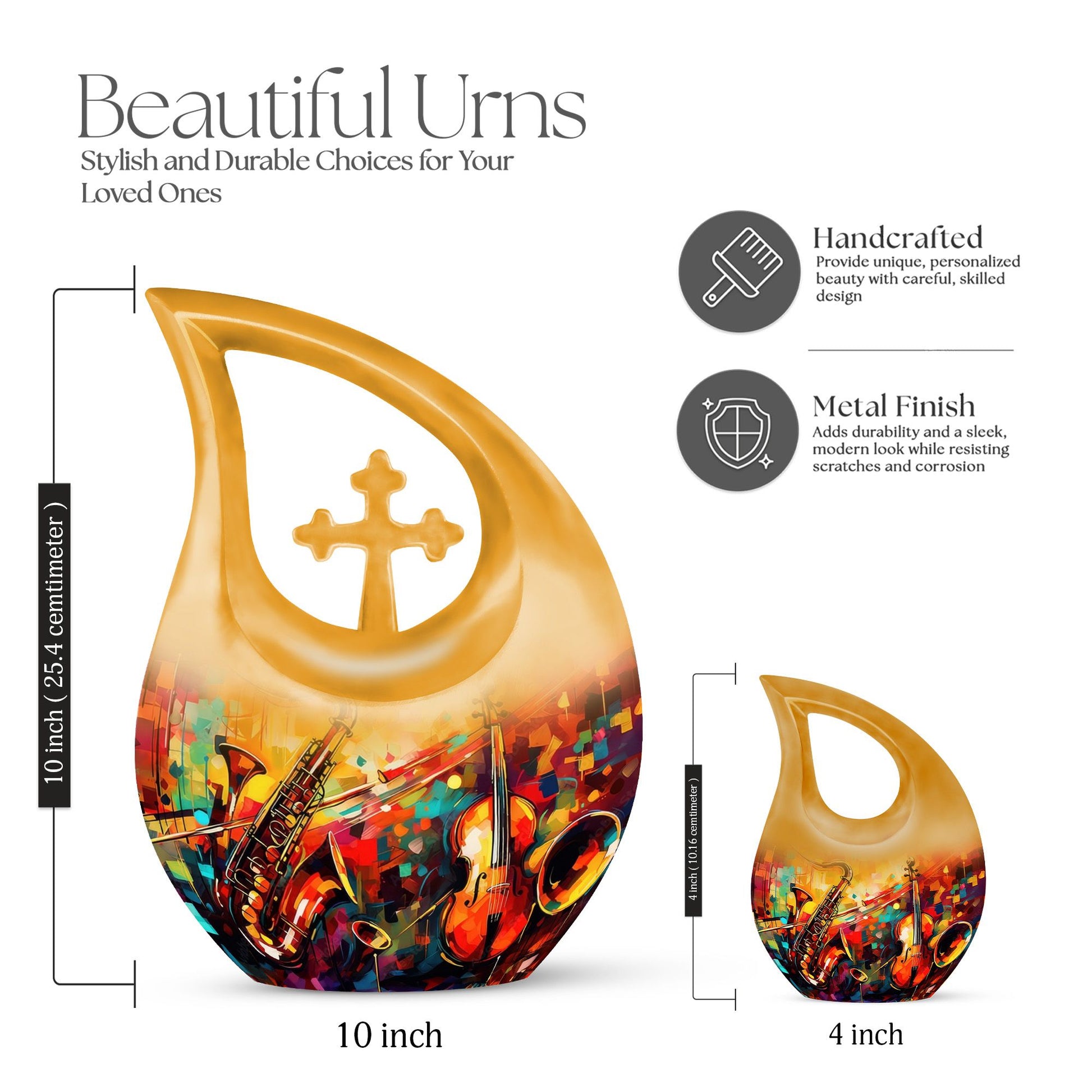 Crafted from durable aluminum, this urn features a stunning musical motif symbolizing rhythm, creativity, and the timeless power of art. Its secure screw-top lid ensures dependable protection, while its full-size 10-inch capacity makes it perfect for cremation ashes urns combo sets, cremation urn for human ashes needs, or cremation memorial displays. Families wishing to share ashes can pair this full-size urn with cremation ashes keepsake options, small cremation keepsakes, cremation mini urn pieces, or keepsake cremation urns for human ashes adult. The coordinated cremation urns set and cremation urn keepsake possibilities allow multiple loved ones to participate in honoring a cherished life.