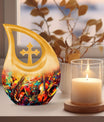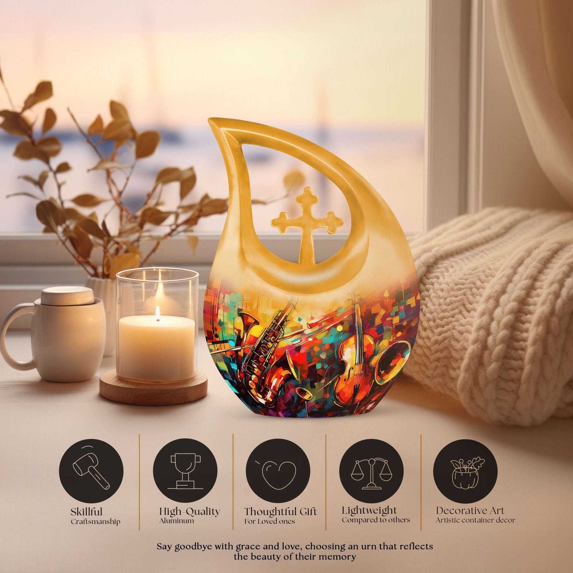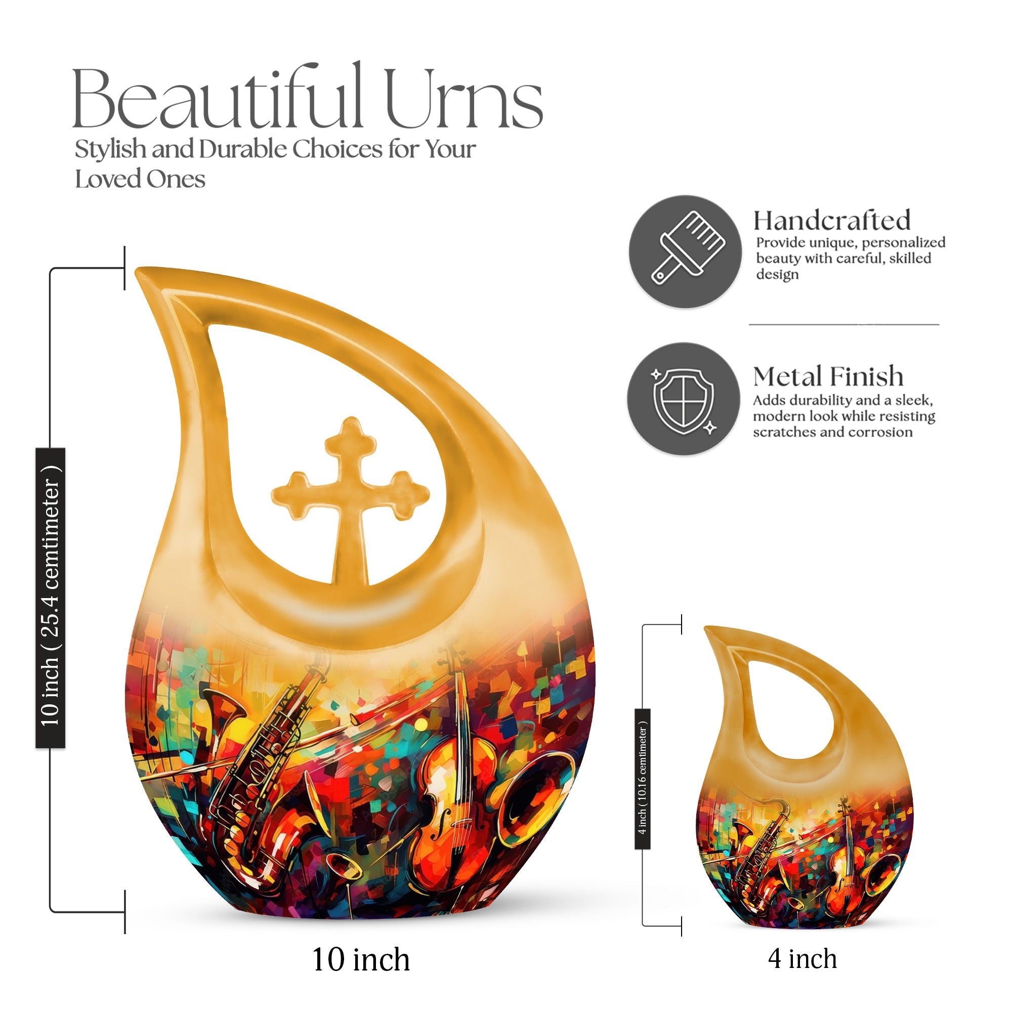 Features:• Material: Aluminium• Dimensions: Height 10 inches• Capacity: 200 cubic inches• Lid: Secure screw-top lid• Design: Artistic musical-themed memorial artwork• Use: Adult Male/Female Cremation or Burial