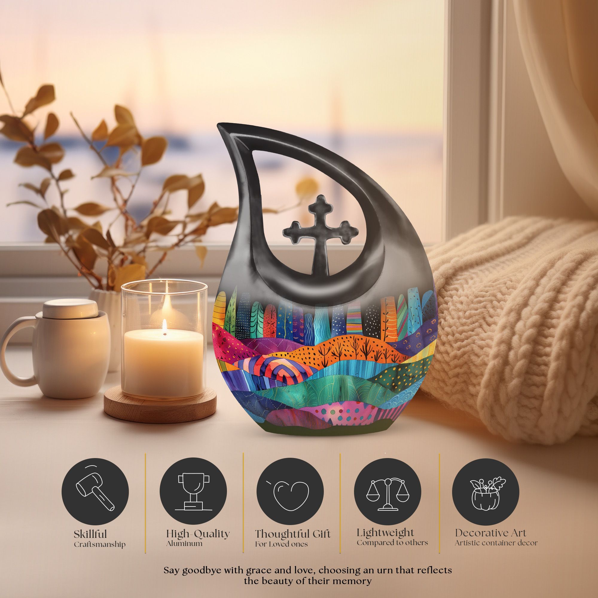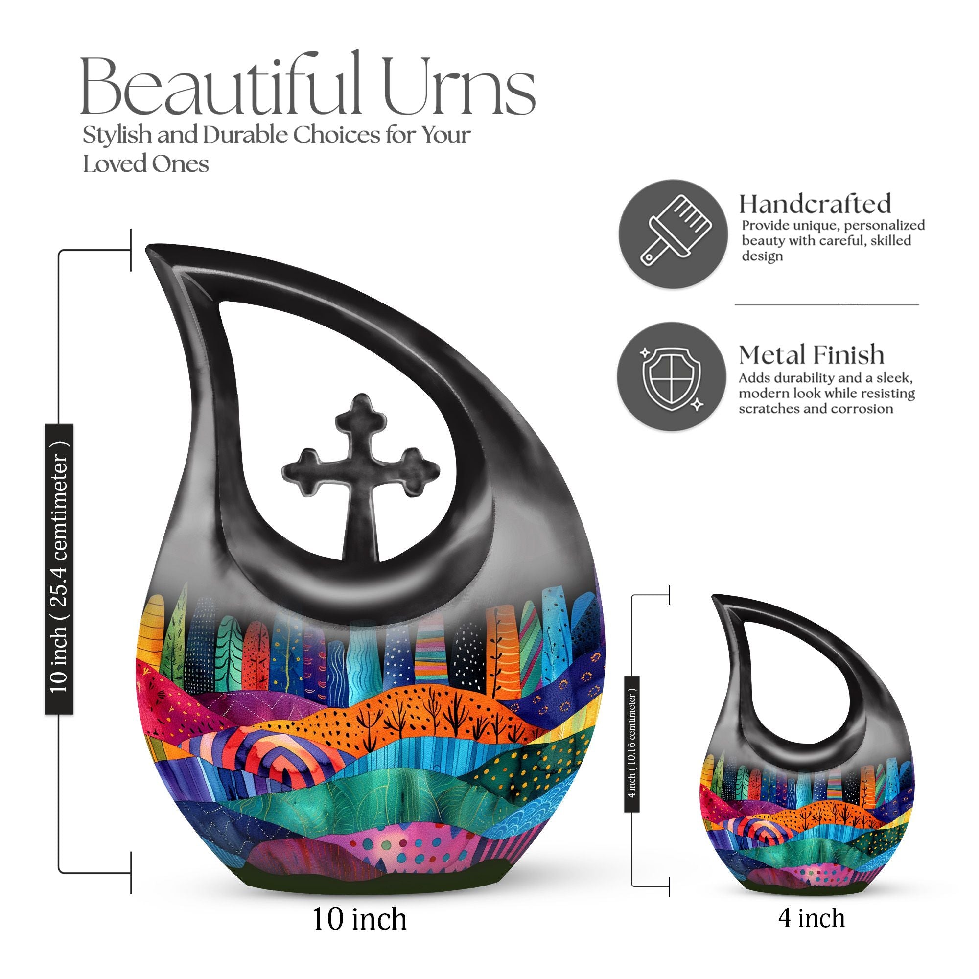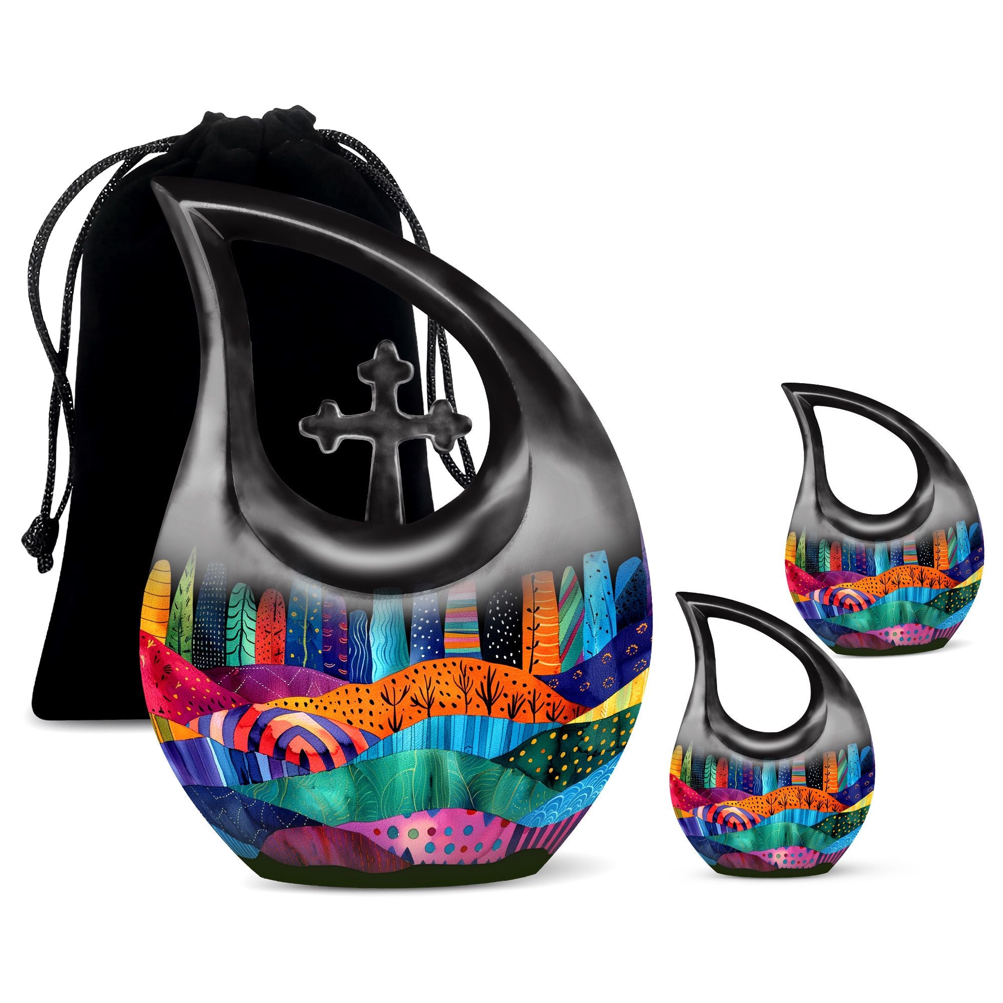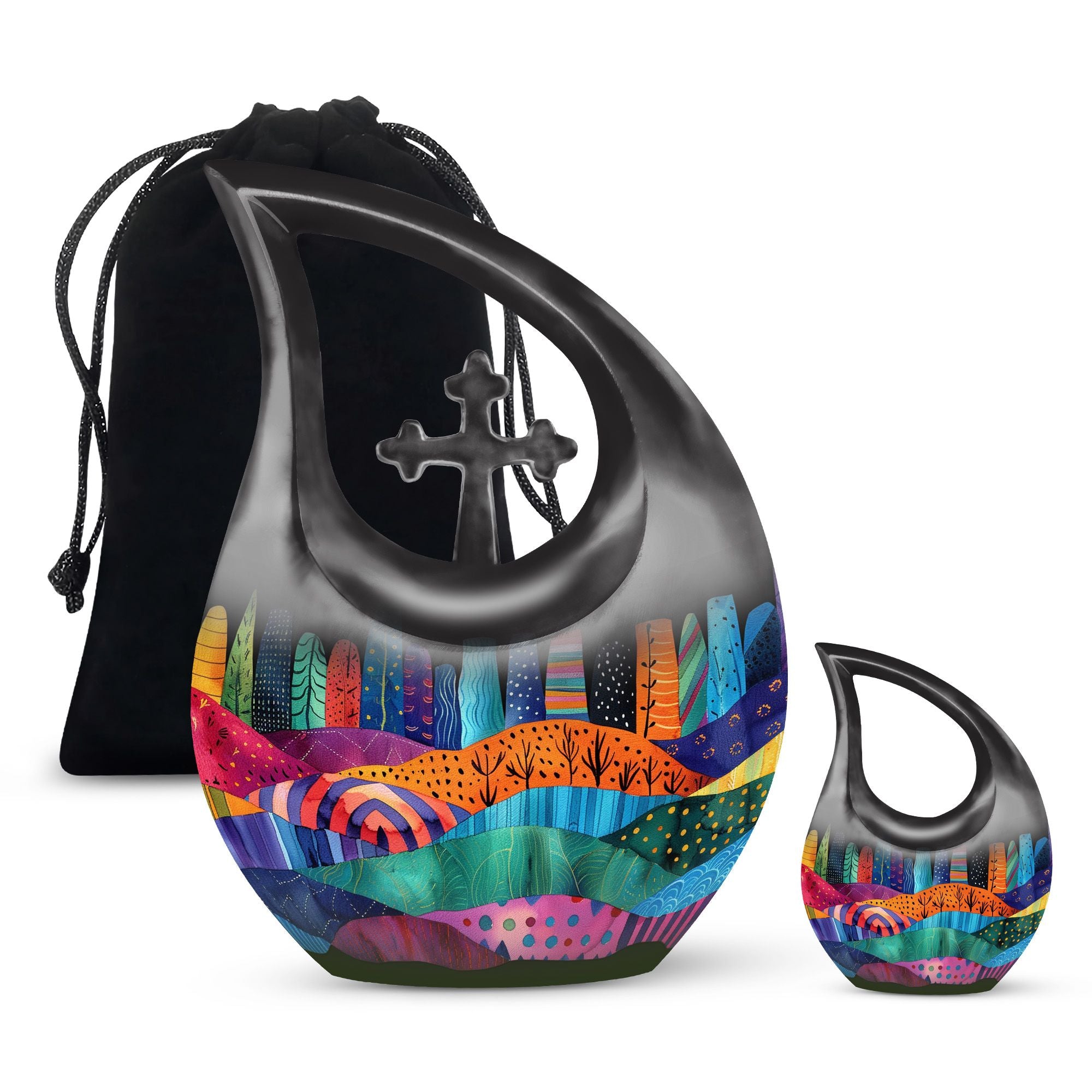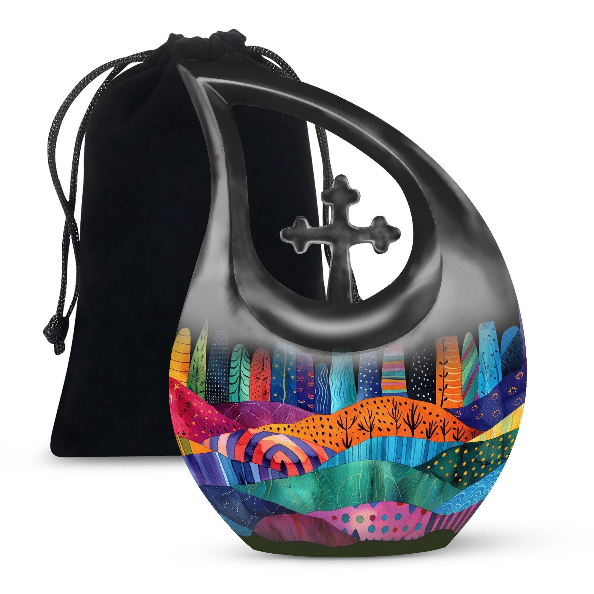Indulge in the rich symbolism of the Vibrant Textile Landscape Urn, more than just a resting place for the ashes of loved ones, it is a poignant reminder of a life well-lived. This Large Urn, uniquely designed with a 'Cross Drop' theme, is formed from robust aluminium ensuring visual appeal and durability. Standing at a noticeable 10 inches in height and weighing 3.3 pounds, it has the capacity to hold up to 200 cubic inches. The urn is one of our most sought-after cremation containers for ashes, providing both aesthetic pleasure and functionality. The package includes a soft velvet pouch for secure containment of ashes. Unveil a comforting symbol of remembrance by personalizing the urn with engraved names. A fitting tribute for that cherished someone, this urn merges the emotional and practical elements seamlessly. Ideal for seniors and adults alike, explore memorial urns that embody respect, love and remembrance.