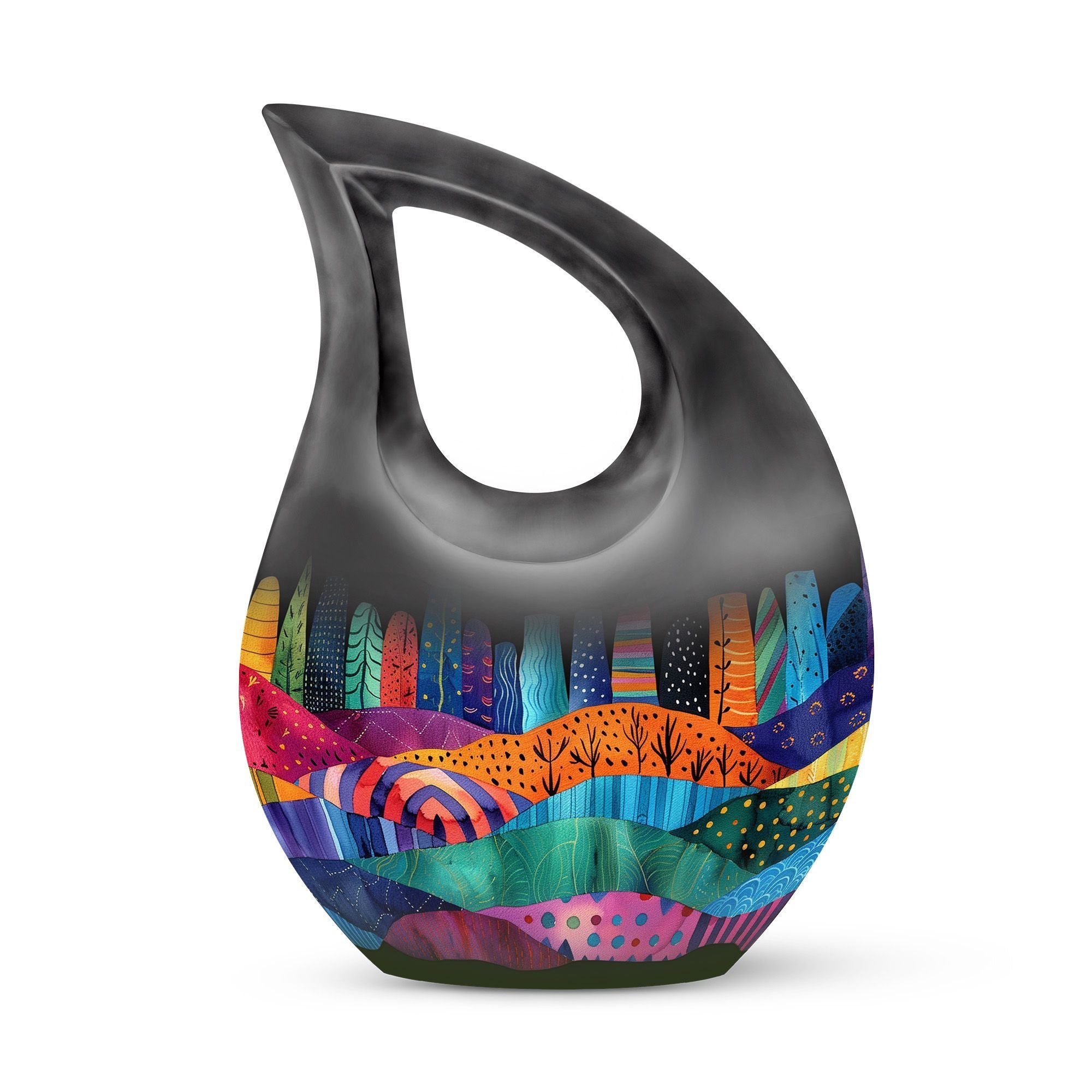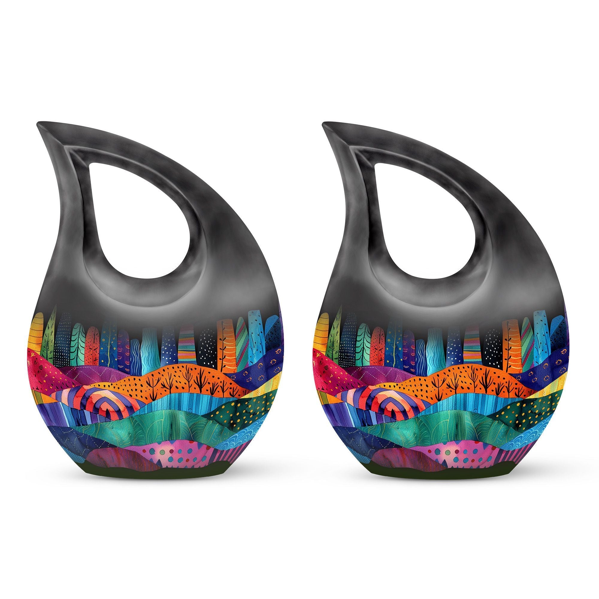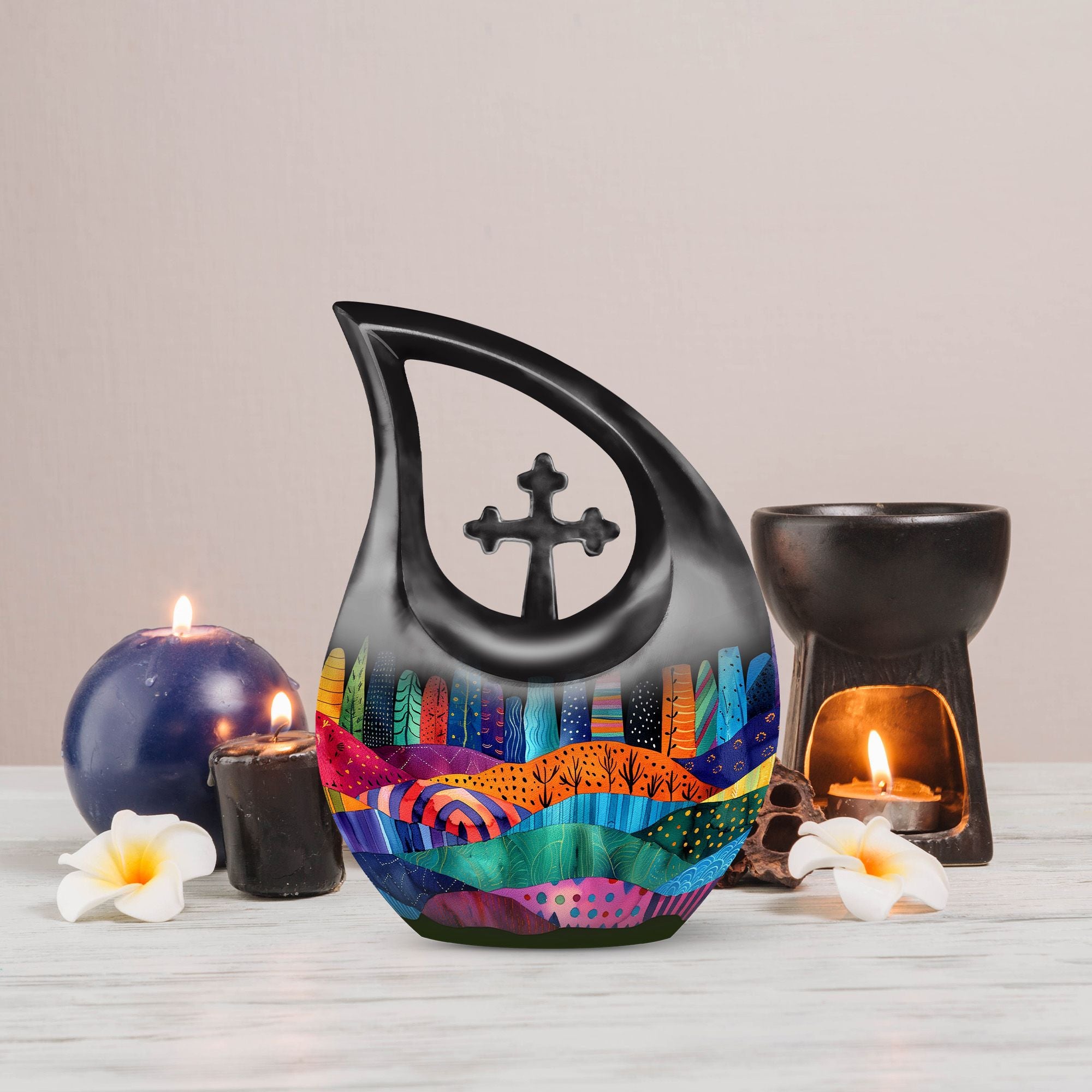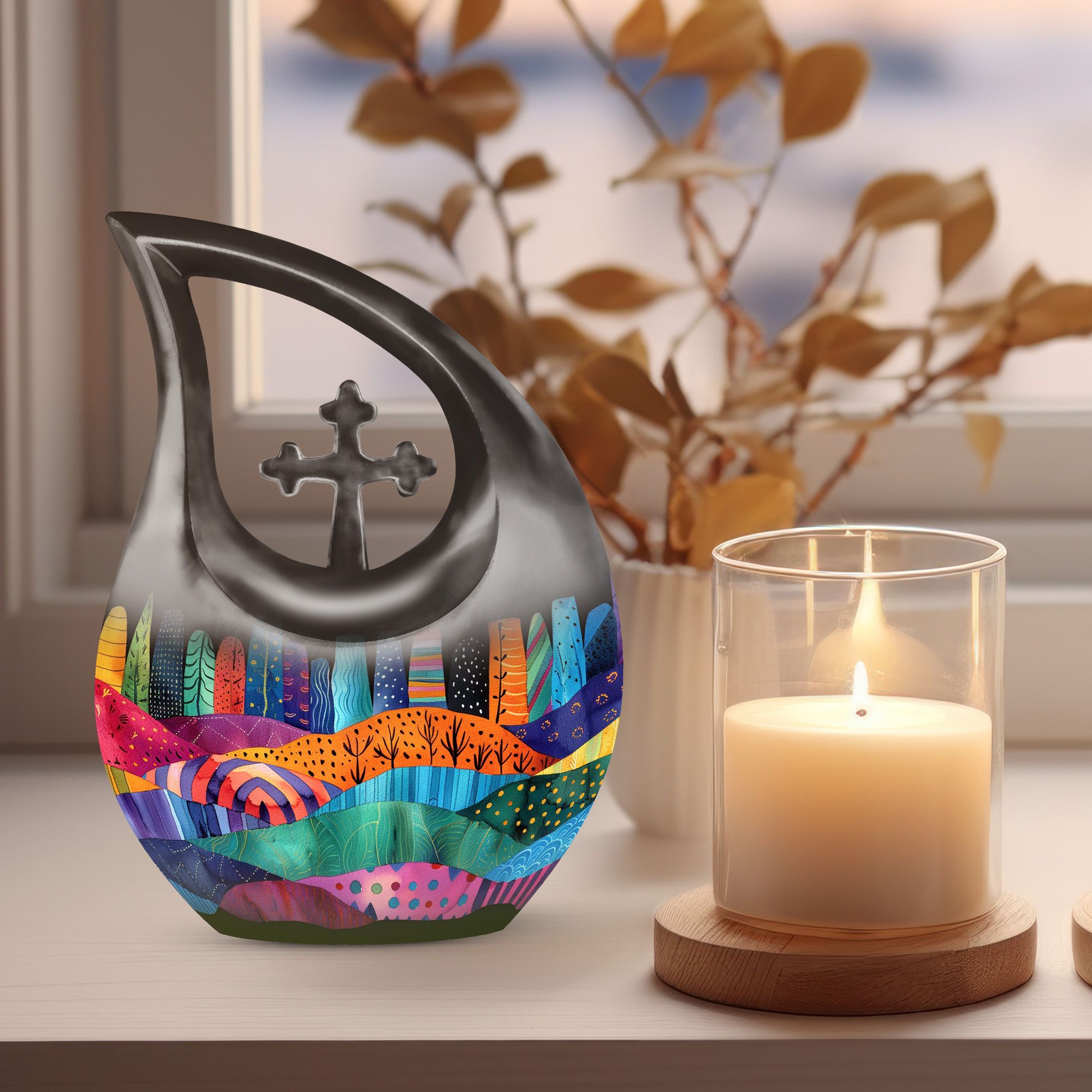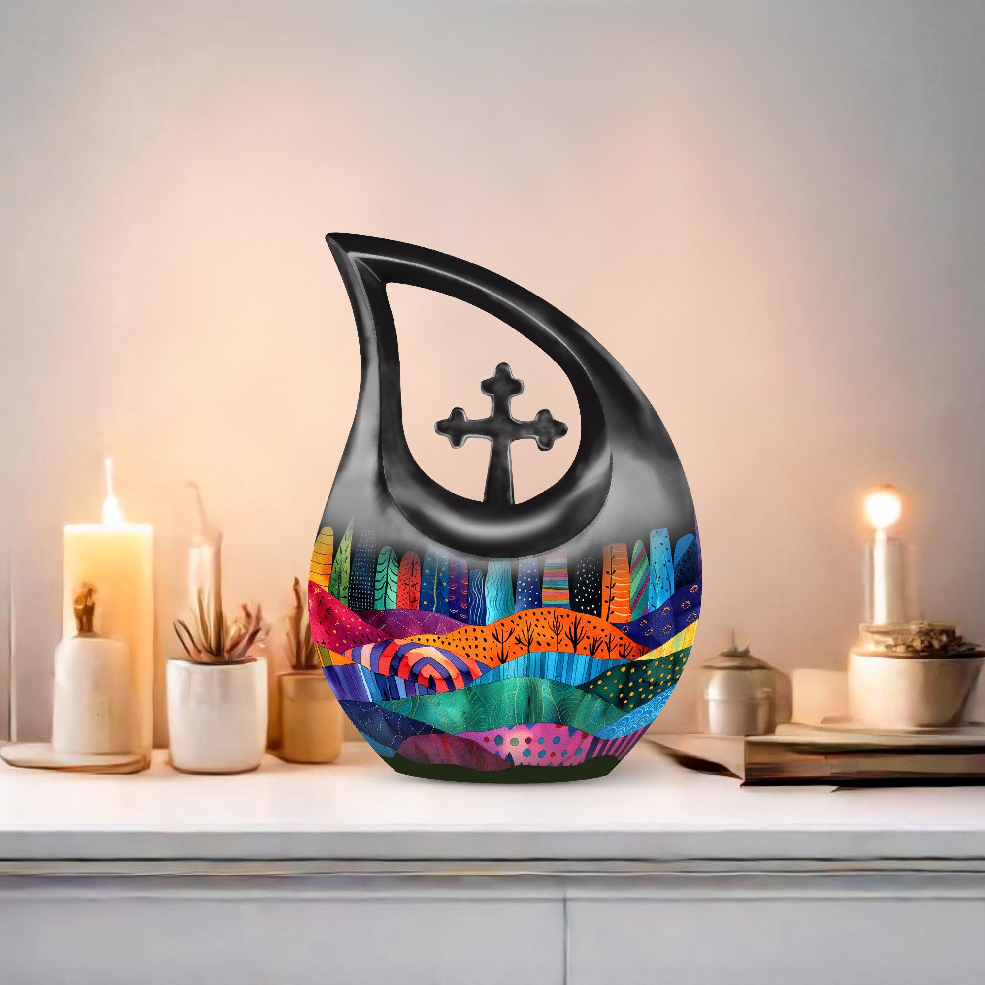 Indulge in the rich symbolism of the Vibrant Textile Landscape Urn, more than just a resting place for the ashes of loved ones, it is a poignant reminder of a life well-lived. This Large Urn, uniquely designed with a 'Cross Drop' theme, is formed from robust aluminium ensuring visual appeal and durability. Standing at a noticeable 10 inches in height and weighing 3.3 pounds, it has the capacity to hold up to 200 cubic inches. The urn is one of our most sought-after cremation containers for ashes, providing both aesthetic pleasure and functionality. The package includes a soft velvet pouch for secure containment of ashes. Unveil a comforting symbol of remembrance by personalizing the urn with engraved names. A fitting tribute for that cherished someone, this urn merges the emotional and practical elements seamlessly. Ideal for seniors and adults alike, explore memorial urns that embody respect, love and remembrance.