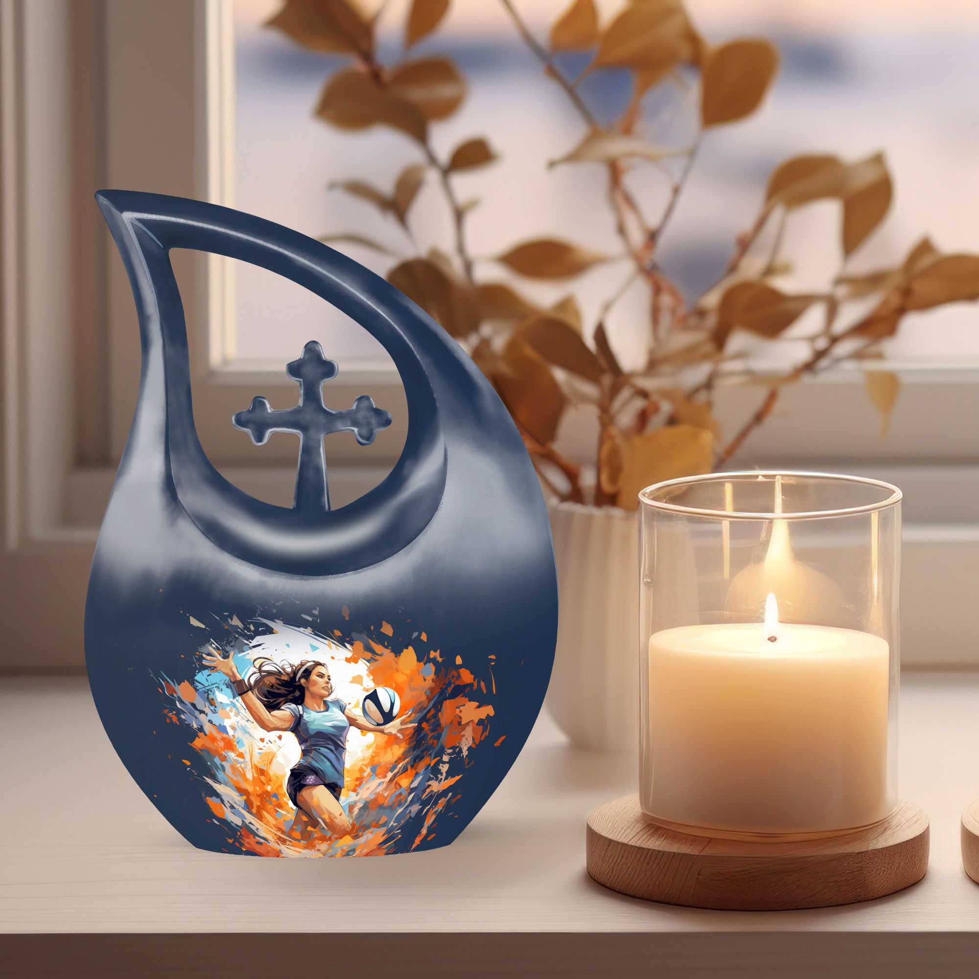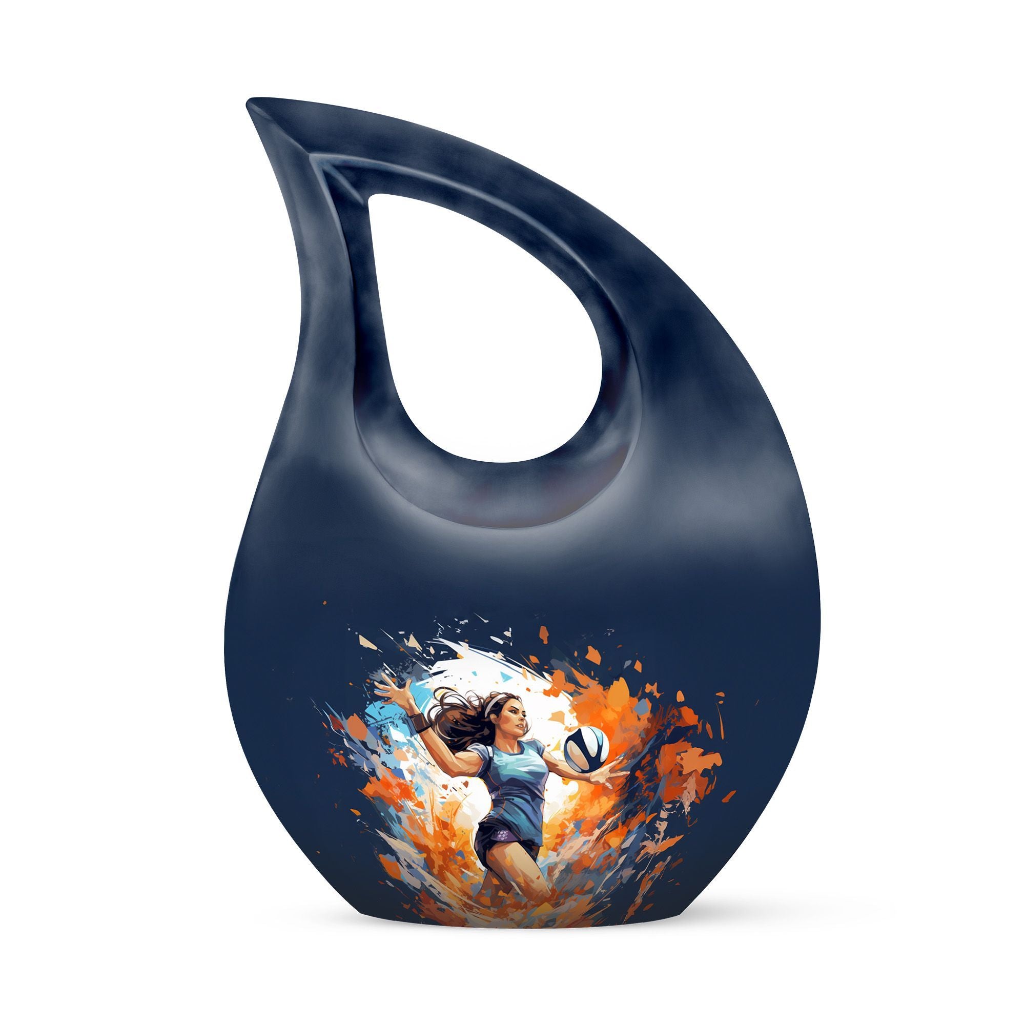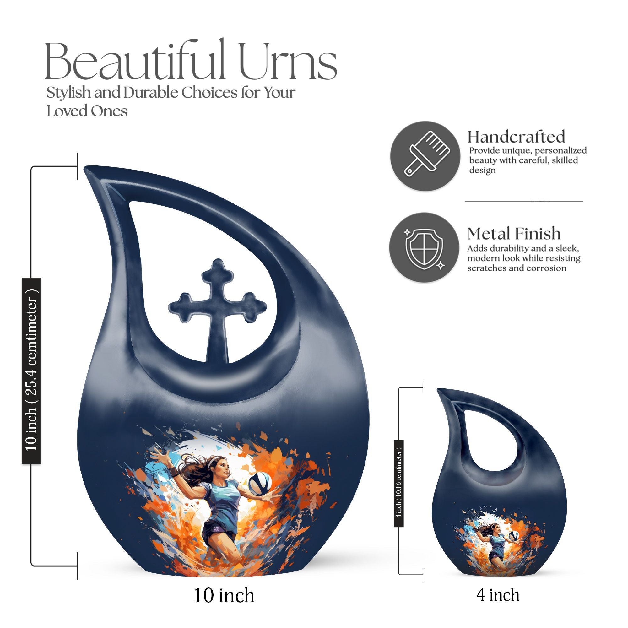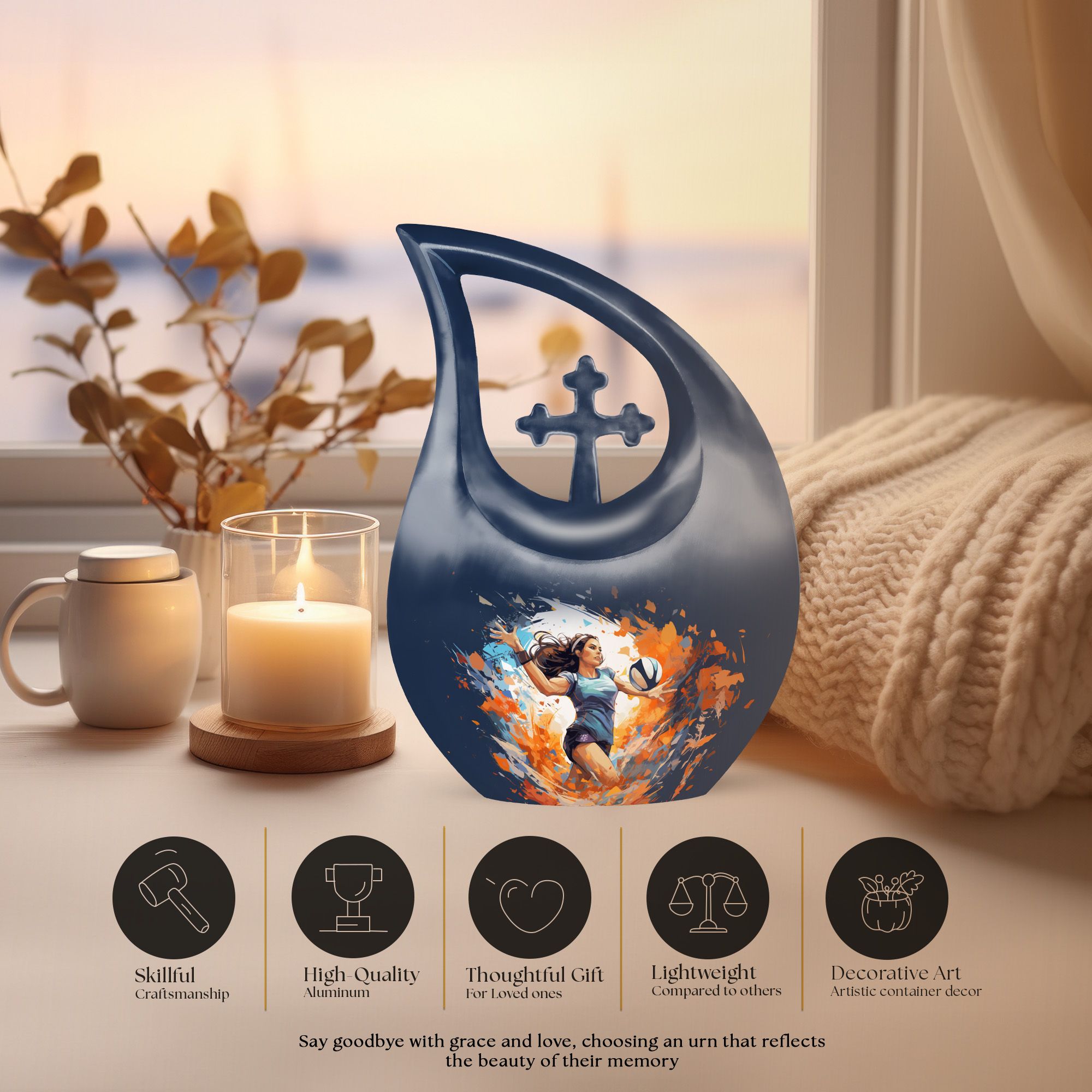Features:• Material: Aluminium• Dimensions: Height 10 inches• Capacity: 200 cubic inches• Lid: Secure screw-top lid• Design: Volleyball-themed memorial artwork• Use: Adult Female Cremation