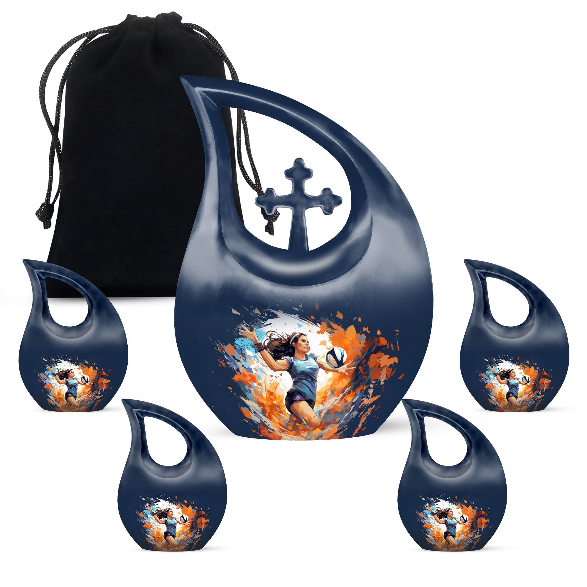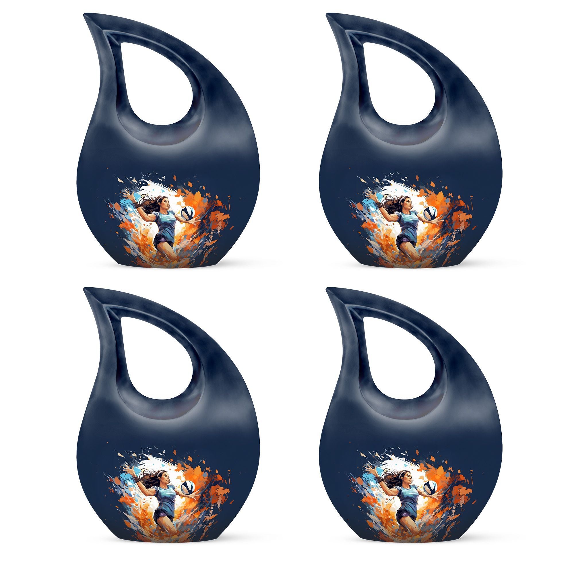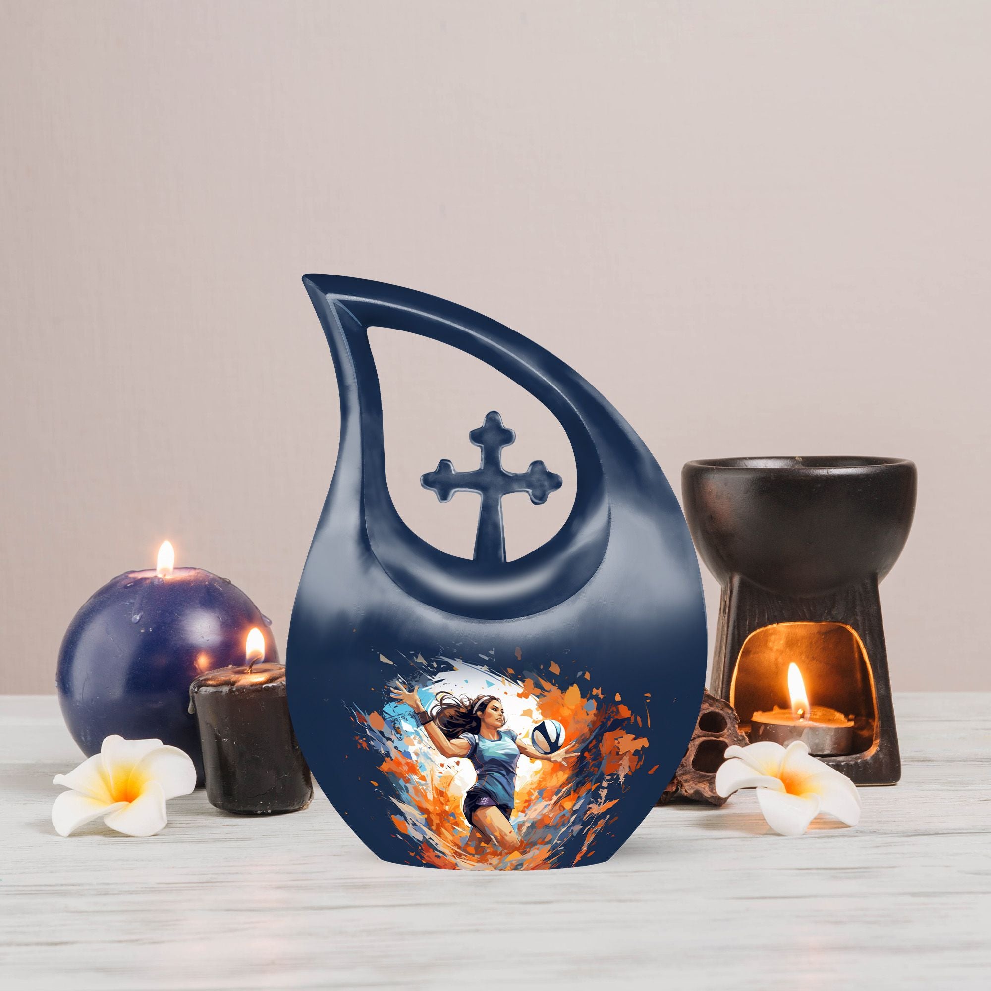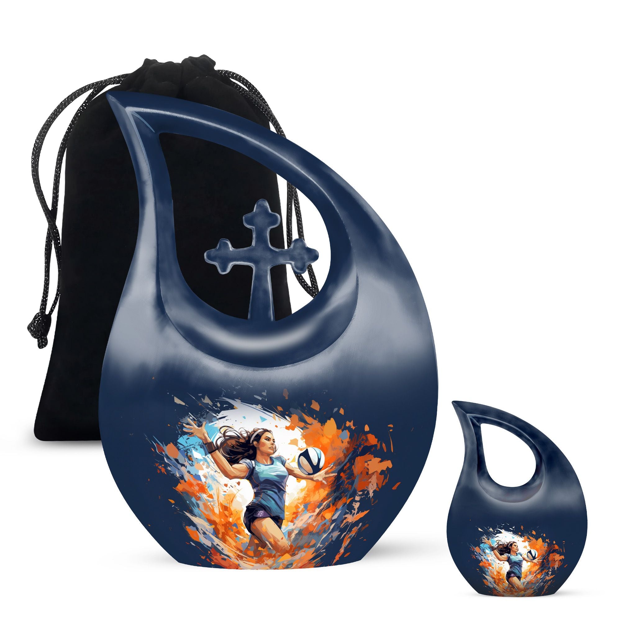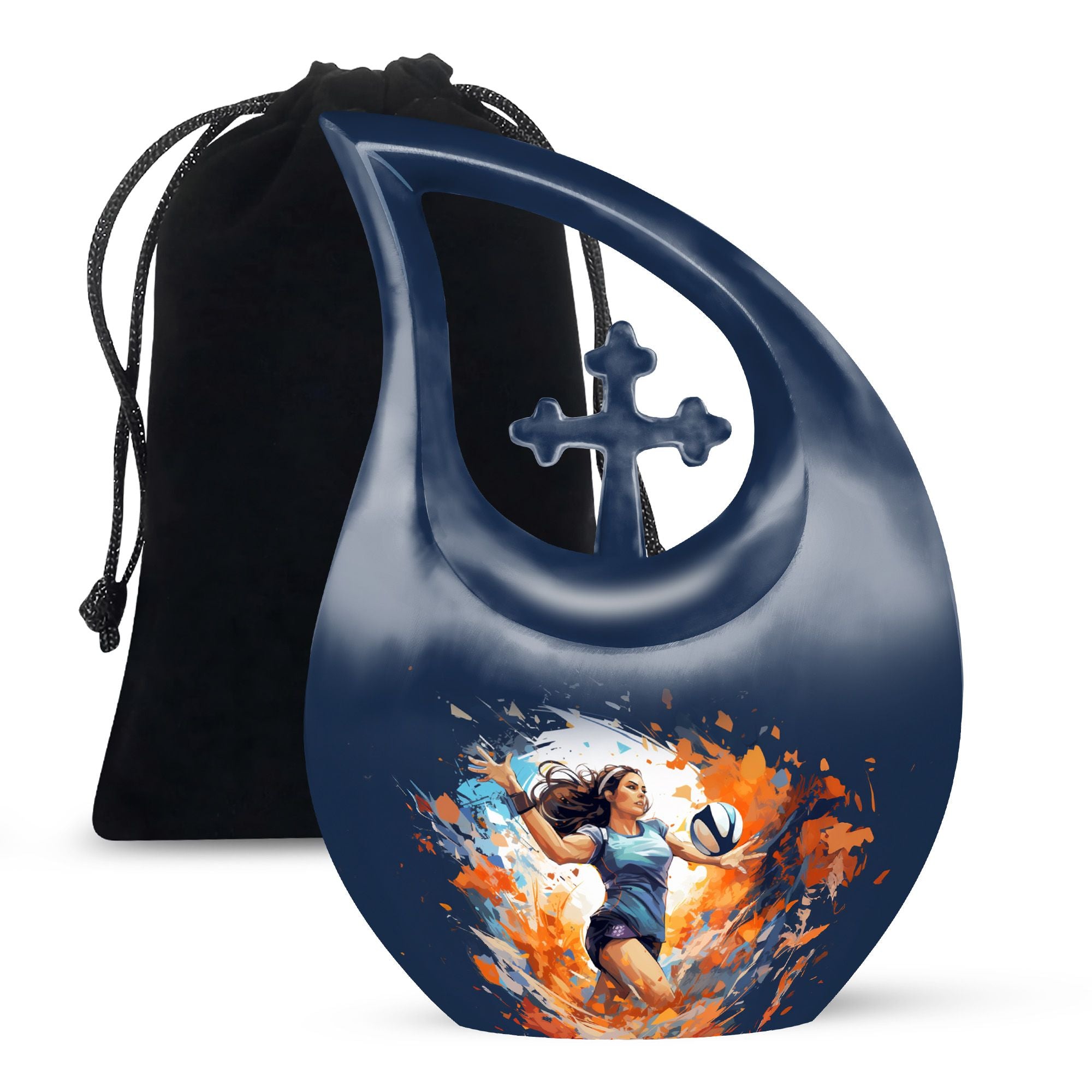 Features:• Material: Aluminium• Dimensions: Height 10 inches• Capacity: 200 cubic inches• Lid: Secure screw-top lid• Design: Volleyball-themed memorial artwork• Use: Adult Female Cremation