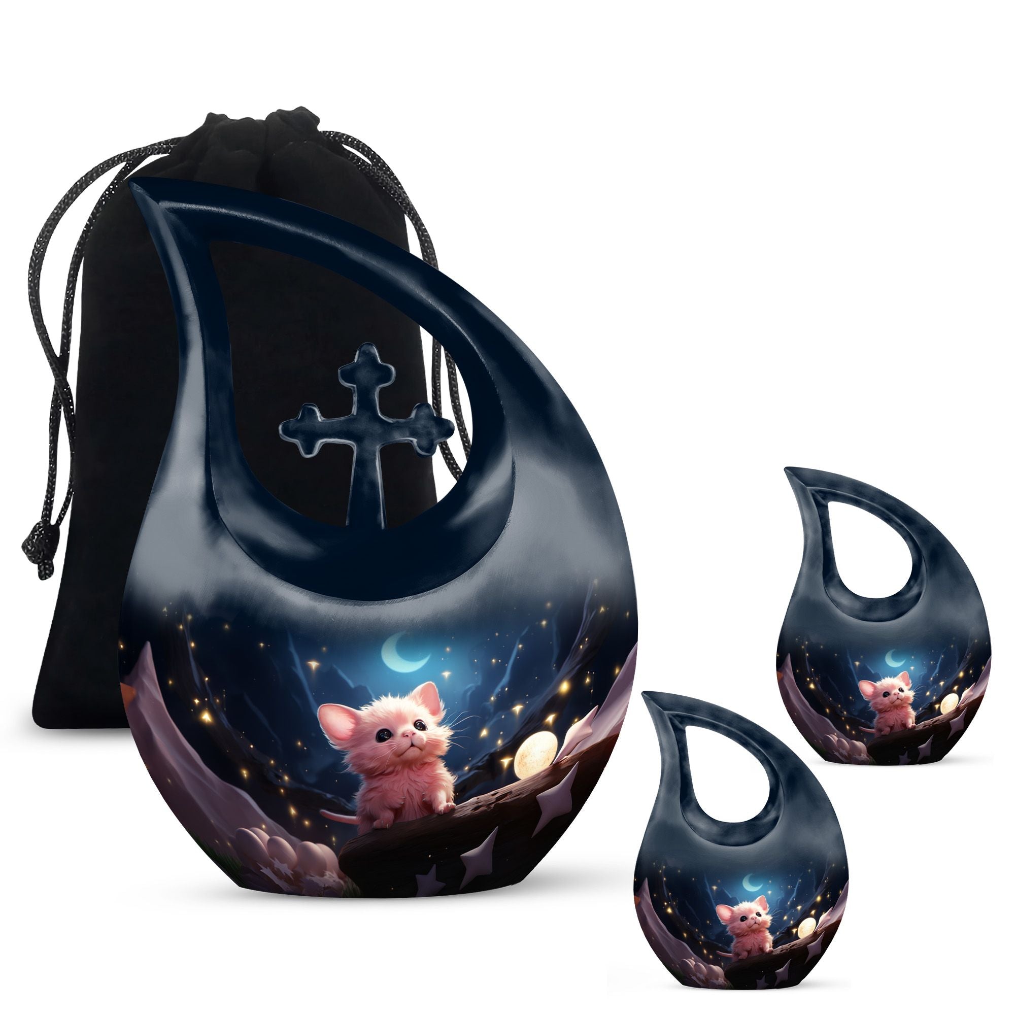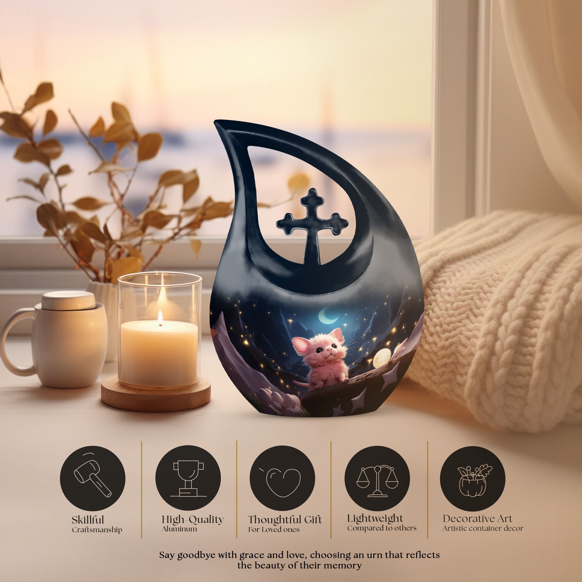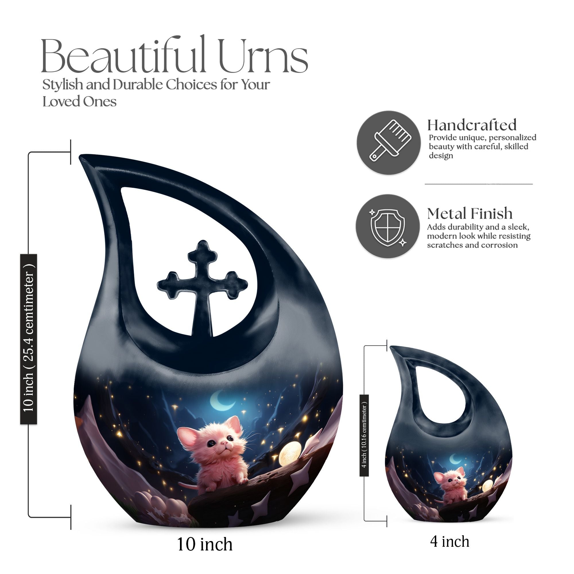 Introducing the 'Stargazer's Whiskers Urn', an exceptional symbol of remembrance for adults. These ashes boxes are carefully crafted from high-quality aluminium which ensures longevity. Standing tall at 10 inches, it has a weight of 3.3 pounds and an impressive capacity of 200 cubic inches, securing your loved one's last remains with honor. The urn presents an artful 'Cross Drop' motif, embodying the Stargazer's Whiskers theme – a celestial-touch tribute to the departed. Every detail of these large urns indicates graceful memorialization. A velvet pouch is also included in the package for additional containment of the ashes. What makes these urns truly personalized is the unique customization option; engrave desired names to bestow an extra layer of intimacy. Come across our 'Stargazer's Whiskers Urn' while hunting for 'memorial urns', 'unique urns for Mom', 'personalized urns for Dad', or 'cremation boxes for adults'; it's a standout choice for personal urns for cremation solutions. Celebrate the celestial bond with the departed in an earthy manner.