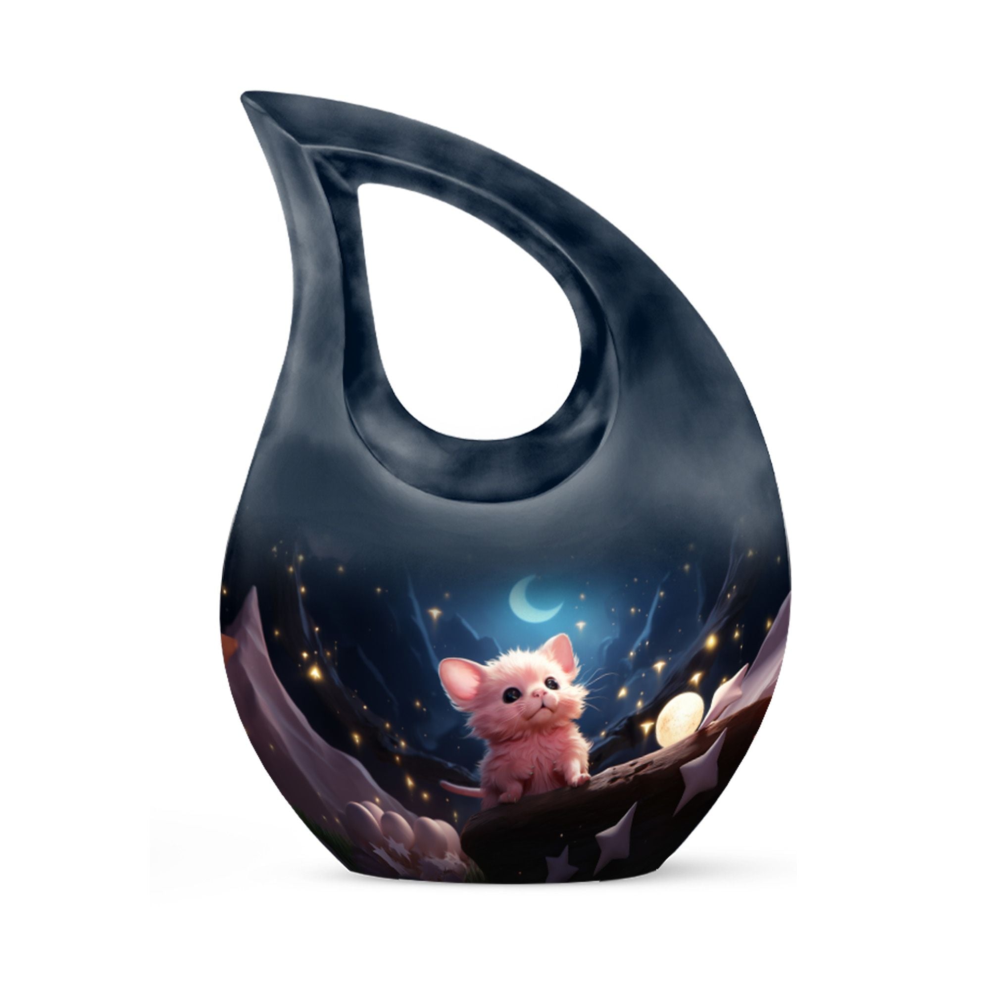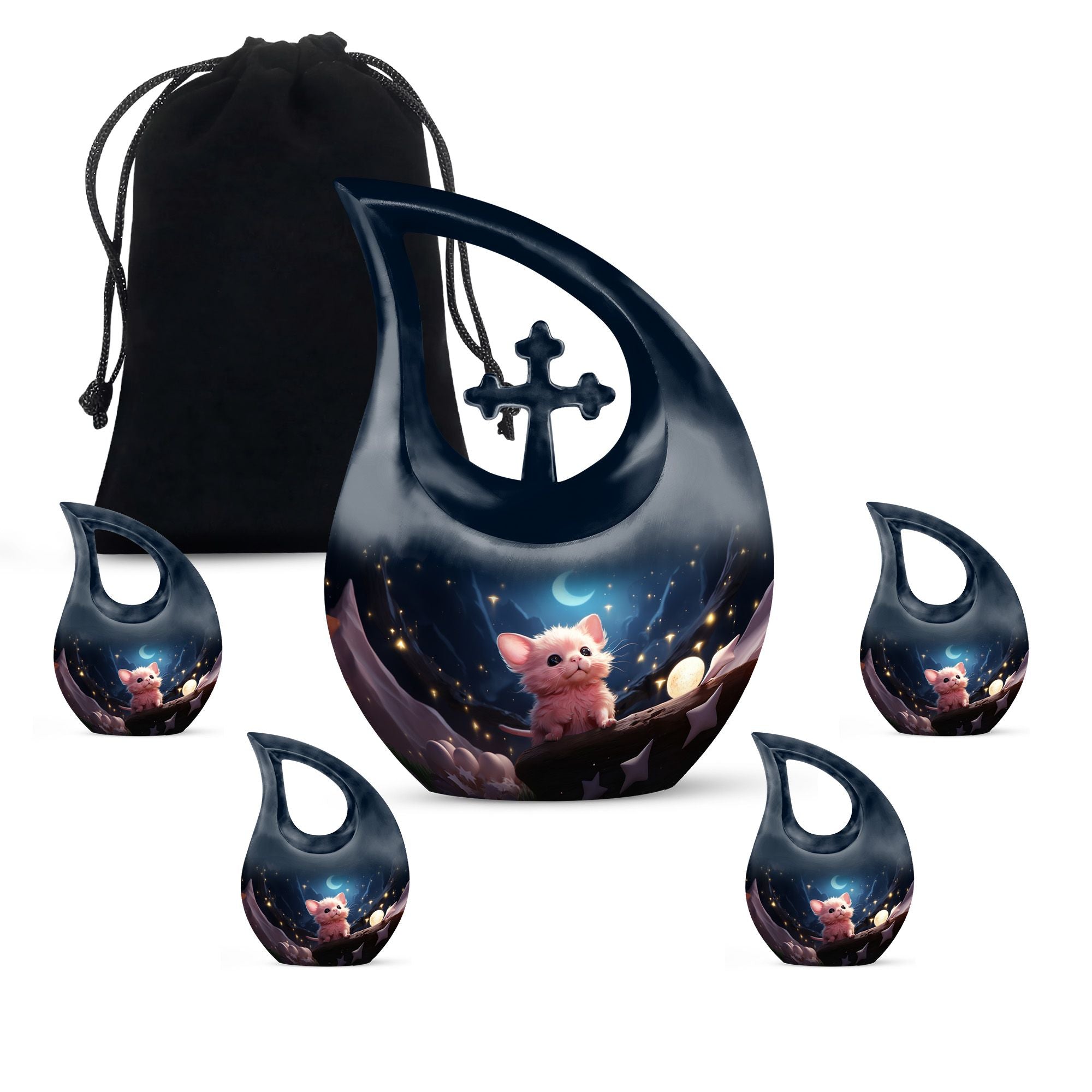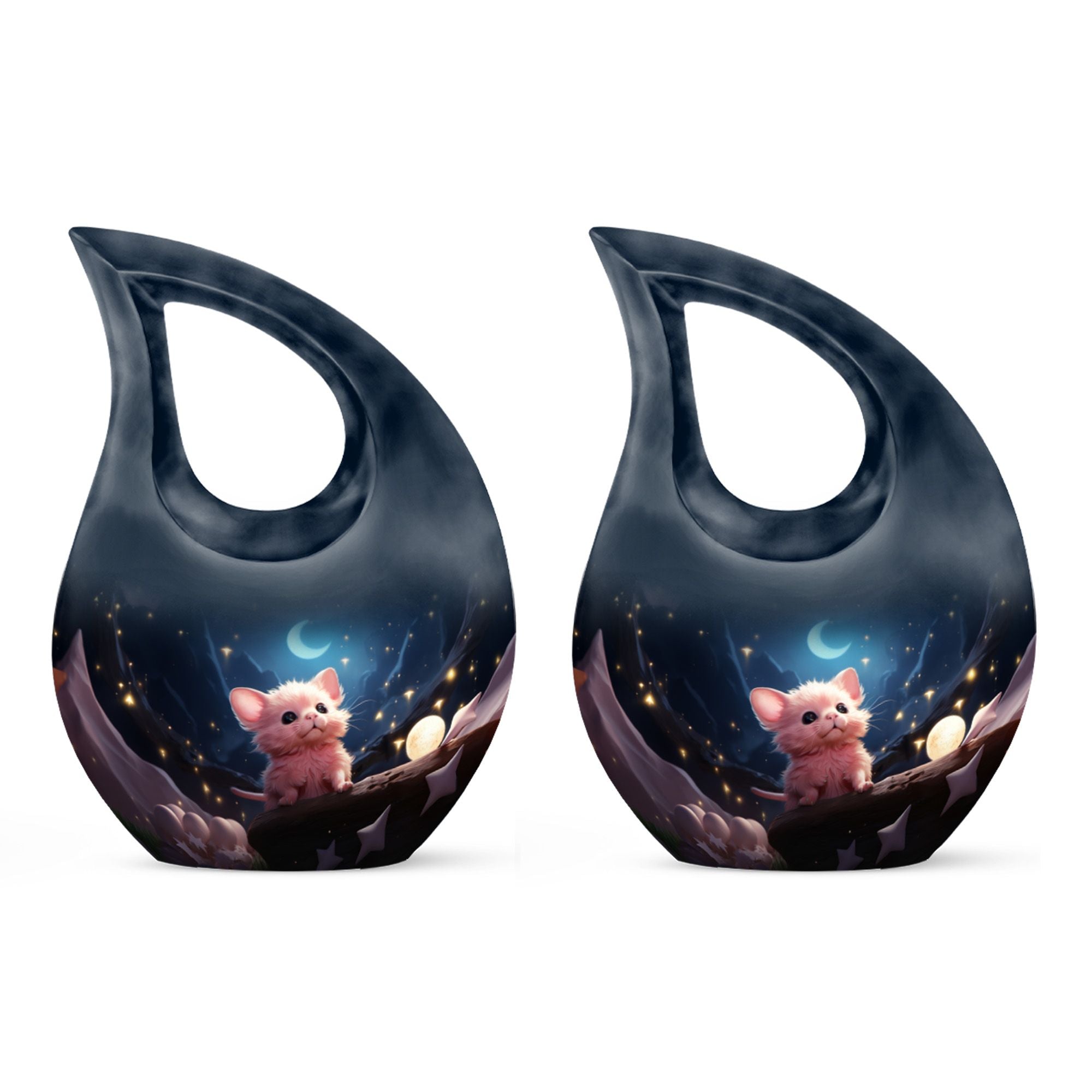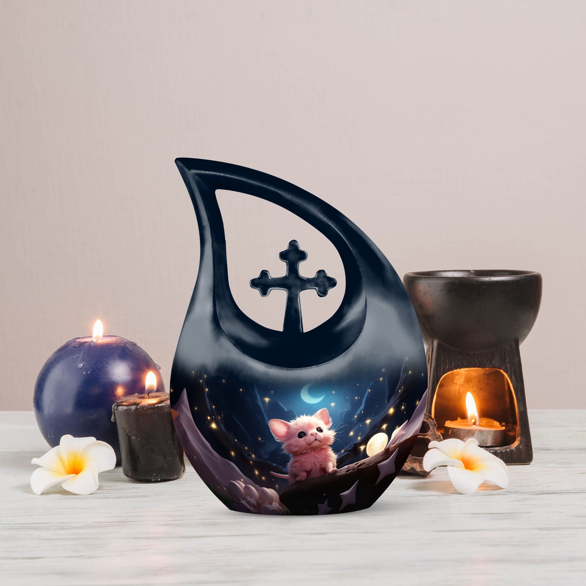 Introducing the 'Stargazer's Whiskers Urn', an exceptional symbol of remembrance for adults. These ashes boxes are carefully crafted from high-quality aluminium which ensures longevity. Standing tall at 10 inches, it has a weight of 3.3 pounds and an impressive capacity of 200 cubic inches, securing your loved one's last remains with honor. The urn presents an artful 'Cross Drop' motif, embodying the Stargazer's Whiskers theme – a celestial-touch tribute to the departed. Every detail of these large urns indicates graceful memorialization. A velvet pouch is also included in the package for additional containment of the ashes. What makes these urns truly personalized is the unique customization option; engrave desired names to bestow an extra layer of intimacy. Come across our 'Stargazer's Whiskers Urn' while hunting for 'memorial urns', 'unique urns for Mom', 'personalized urns for Dad', or 'cremation boxes for adults'; it's a standout choice for personal urns for cremation solutions. Celebrate the celestial bond with the departed in an earthy manner.