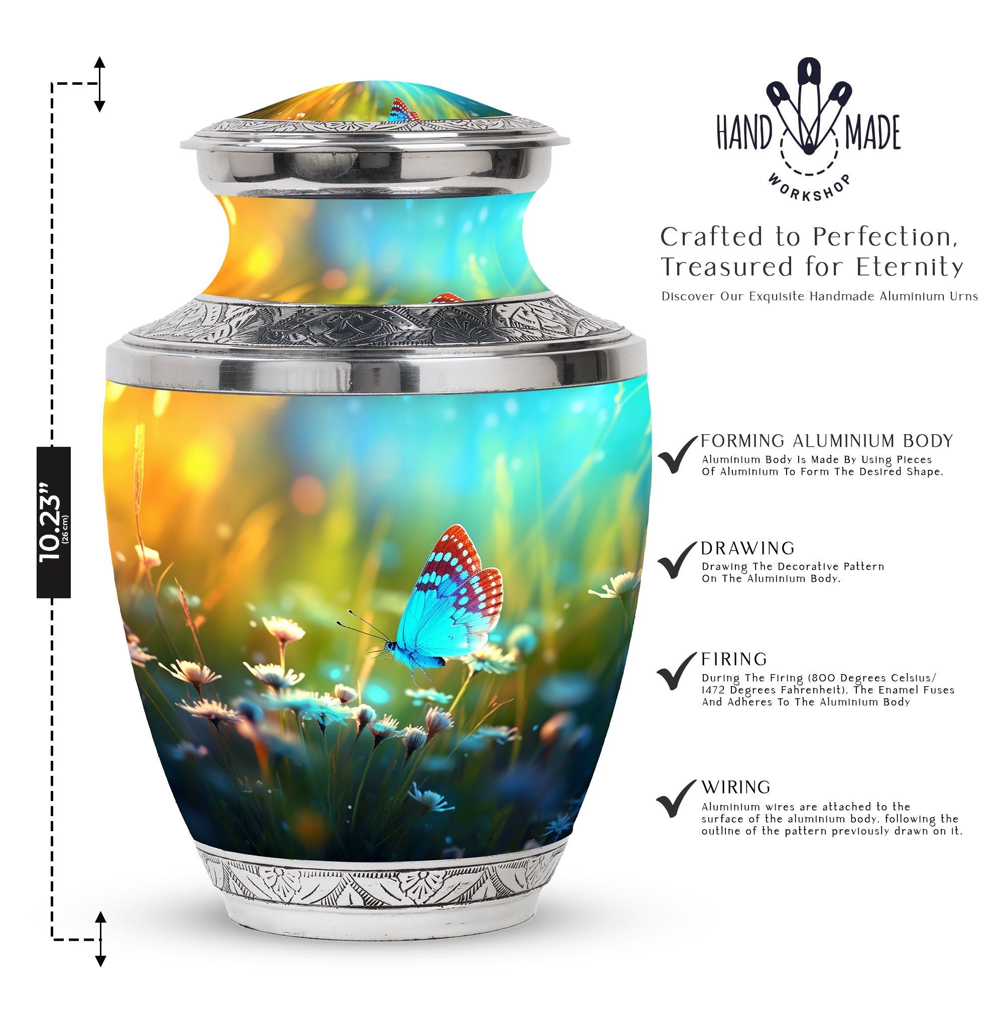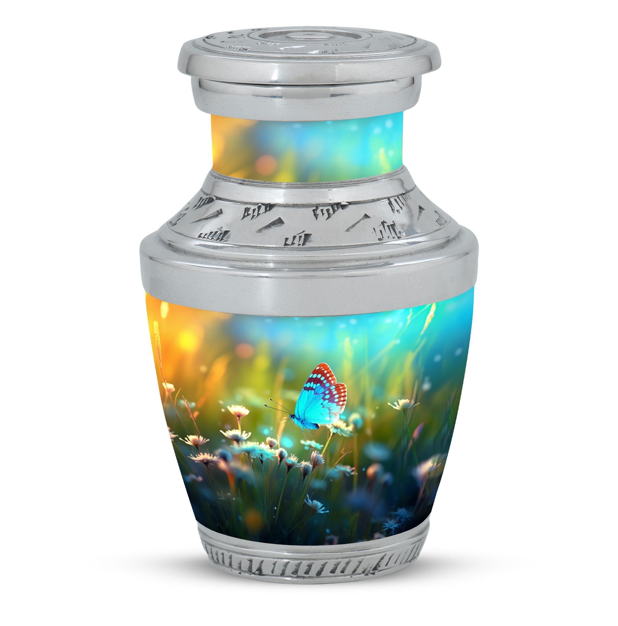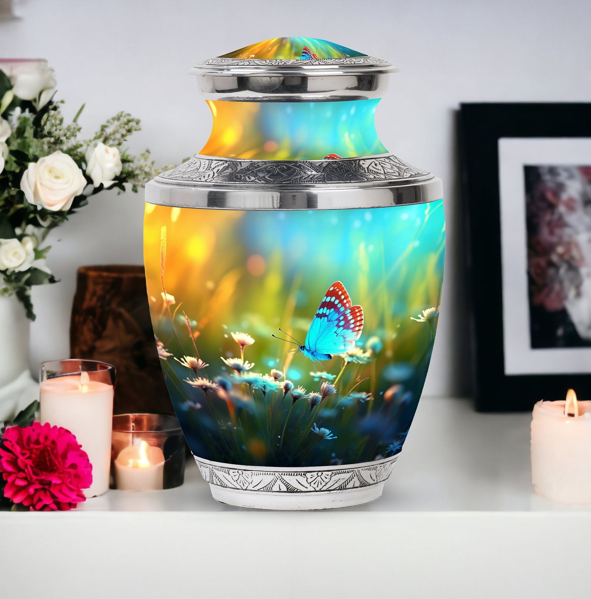 Carrying forward the memories of a loved one calls for an item that is as unique and timeless like our Butterflies fly Sunset Meadow Cremation Urn. Designed to respectfully pay tribute, this 'sorry for your loss' memento is a large urn measuring 10 inches in height, with the ability to hold up to 200 cubic inches of human cremation ashes. The elegantly classic urn, made from high-quality aluminium, weighs a substantial 3.3 pounds, ensuring its lasting presence. The urn lands in the 'memorial urns' category and comes with a velvet pouch for containment of ashes, adding touch of sophistication. Possibility for customization? Absolutely. Personalize this modern urn for ashes with engraved names. Sizing at 3-inch, this personalized urn proves to be a perfect addition to your memorial ceremony supplies. As a reminder that revival is possible even from ashes, let our metal urn help you commemorate your loved one's journey.
