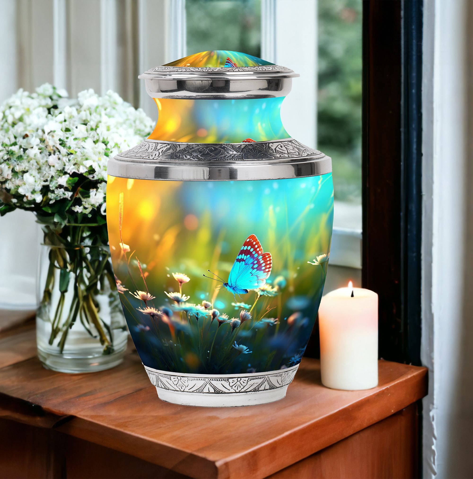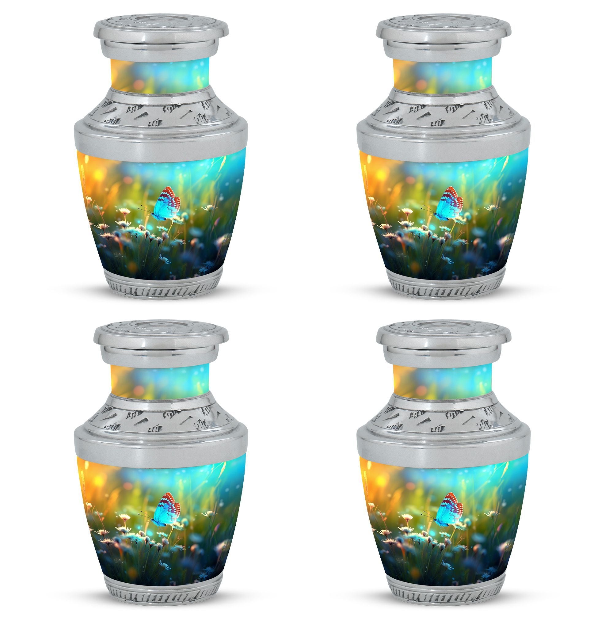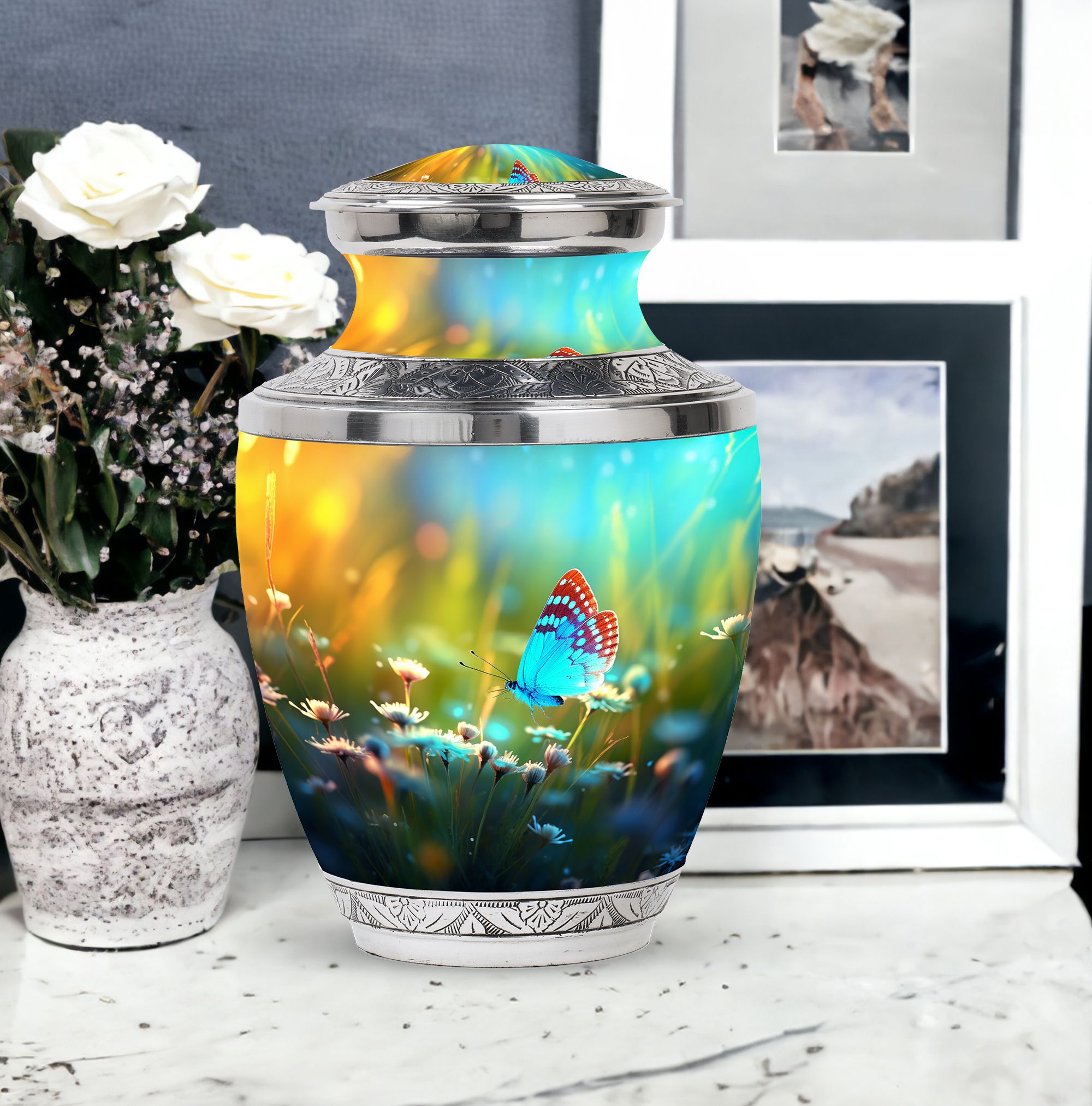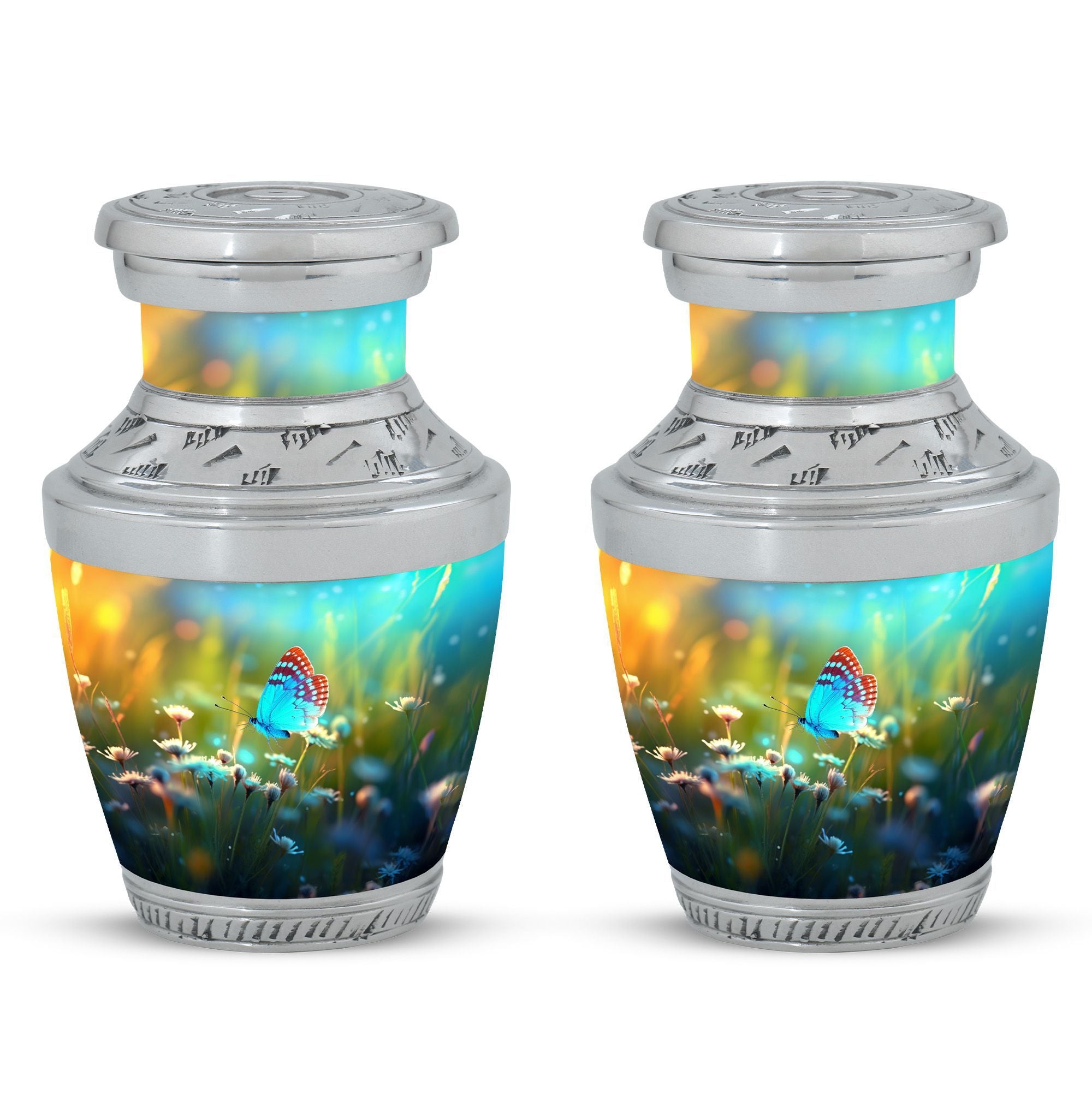 Carrying forward the memories of a loved one calls for an item that is as unique and timeless like our Butterflies fly Sunset Meadow Cremation Urn. Designed to respectfully pay tribute, this 'sorry for your loss' memento is a large urn measuring 10 inches in height, with the ability to hold up to 200 cubic inches of human cremation ashes. The elegantly classic urn, made from high-quality aluminium, weighs a substantial 3.3 pounds, ensuring its lasting presence. The urn lands in the 'memorial urns' category and comes with a velvet pouch for containment of ashes, adding touch of sophistication. Possibility for customization? Absolutely. Personalize this modern urn for ashes with engraved names. Sizing at 3-inch, this personalized urn proves to be a perfect addition to your memorial ceremony supplies. As a reminder that revival is possible even from ashes, let our metal urn help you commemorate your loved one's journey.