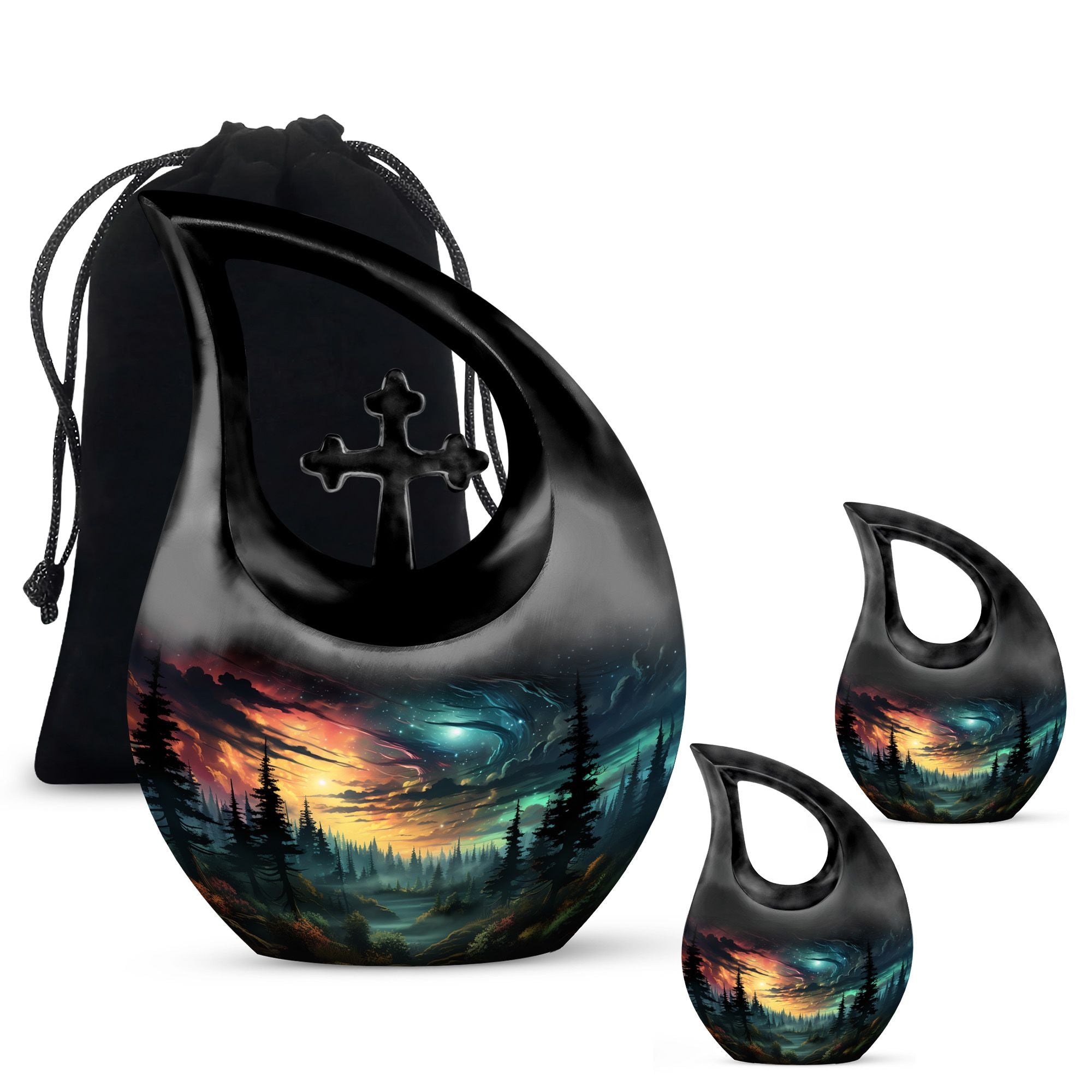 Exquisitely crafted from durable aluminum, this funeral urn features a sleek matte black finish inspired by the stillness of a forest at dusk. Its intricate artistic design symbolizes eternal life and peace, making it one of the most unique urns for human ashes available. With high-quality craftsmanship, this funeral ashes urn ensures durability and grace, ideal for both display and storage. Whether you seek funeral urns for ashes adult or funeral urns for human ashes small, this piece provides versatility and sophistication.