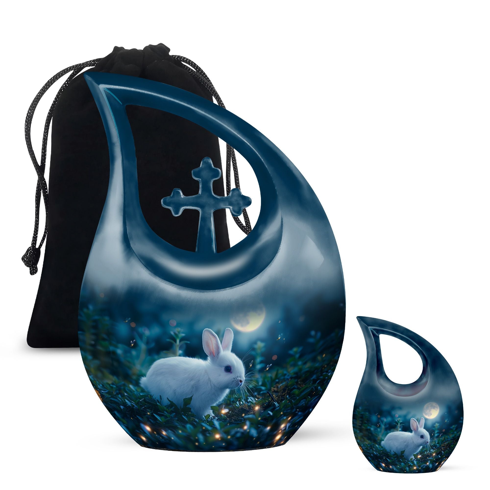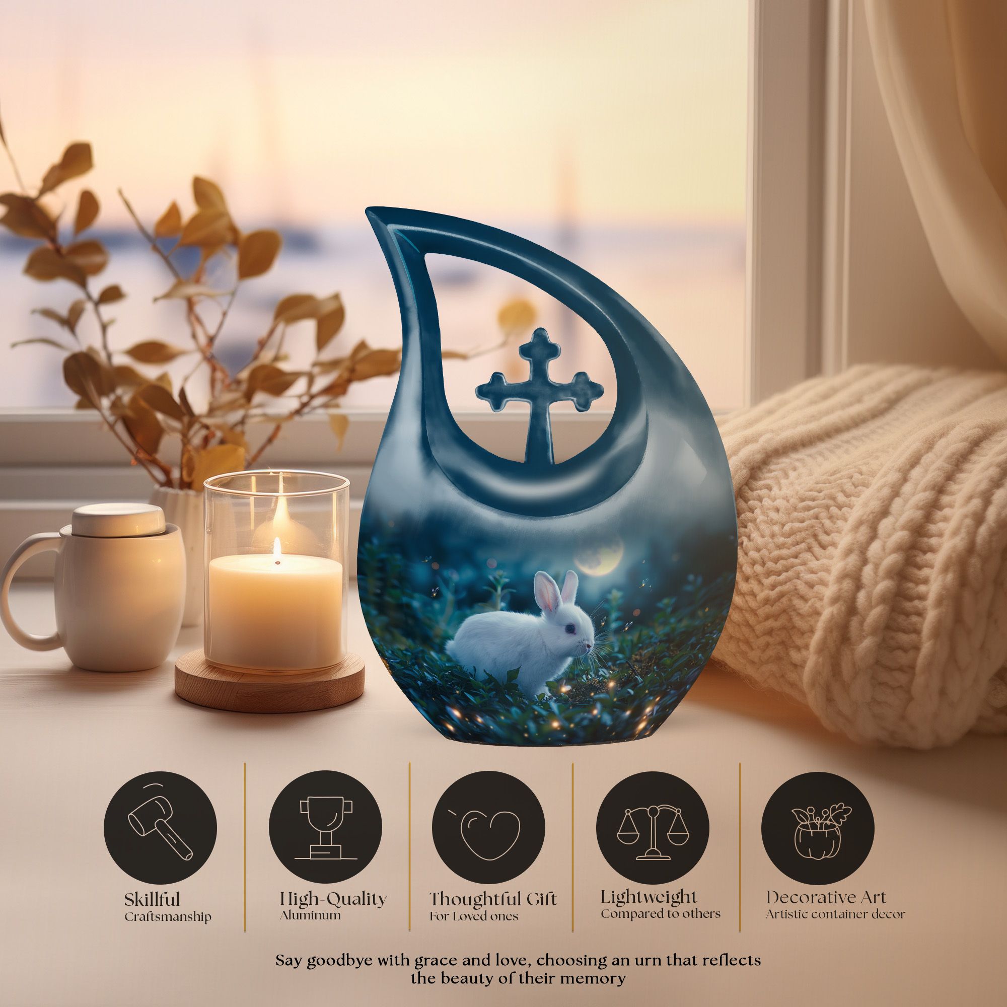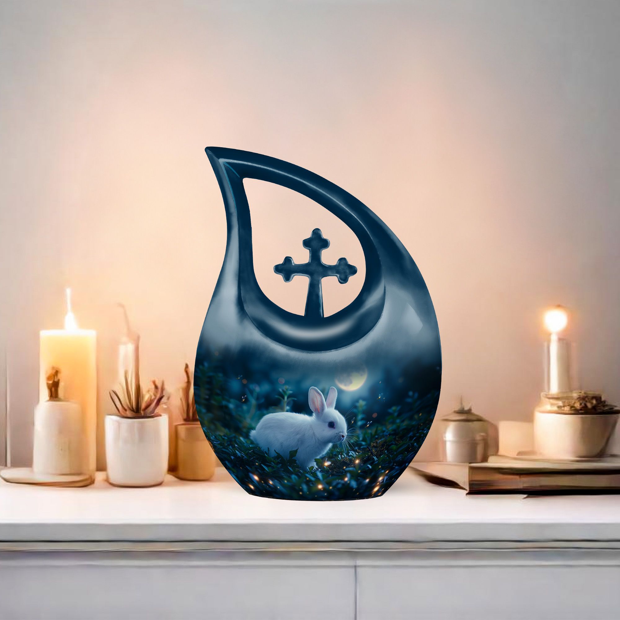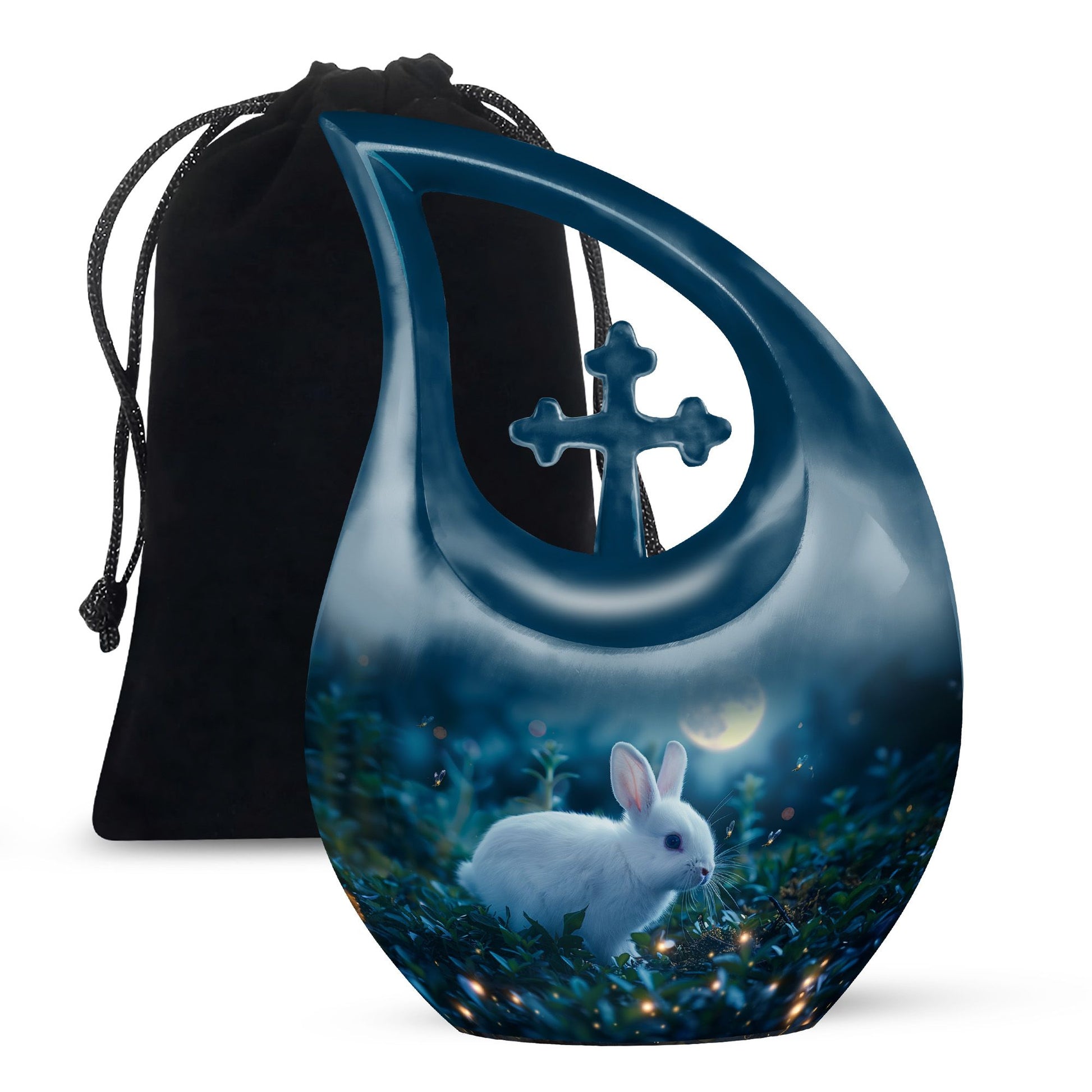 Experience the tranquility and comfort offered by our 'White Bunny Moon Urn'. Crafted with an elegant 'Cross Drop' theme, this cremation container is designed to respect and honor your departed ones. Measuring 10 inches in height and weighing 3.3 pounds, this large urn, formed from robust aluminium, embodies durability as well as aesthetic value. The urn's capacity stands at around 200 cubic inches, fitting for both large and small amounts of ashes. Additionally, the urn comes with a velvet pouch, ensuring the ashes stay secure. The ability to personalize this urn through engraving adds an intimate touch to this token of remembrance. Our 'White Bunny Moon Urn' is not merely a container; it's a beacon of love and memories. Don’t forget to search with keywords like Custom Cremation Urns, Urn for Dad or Large Urns for Ashes to find more of our offerings in memorial urns.
