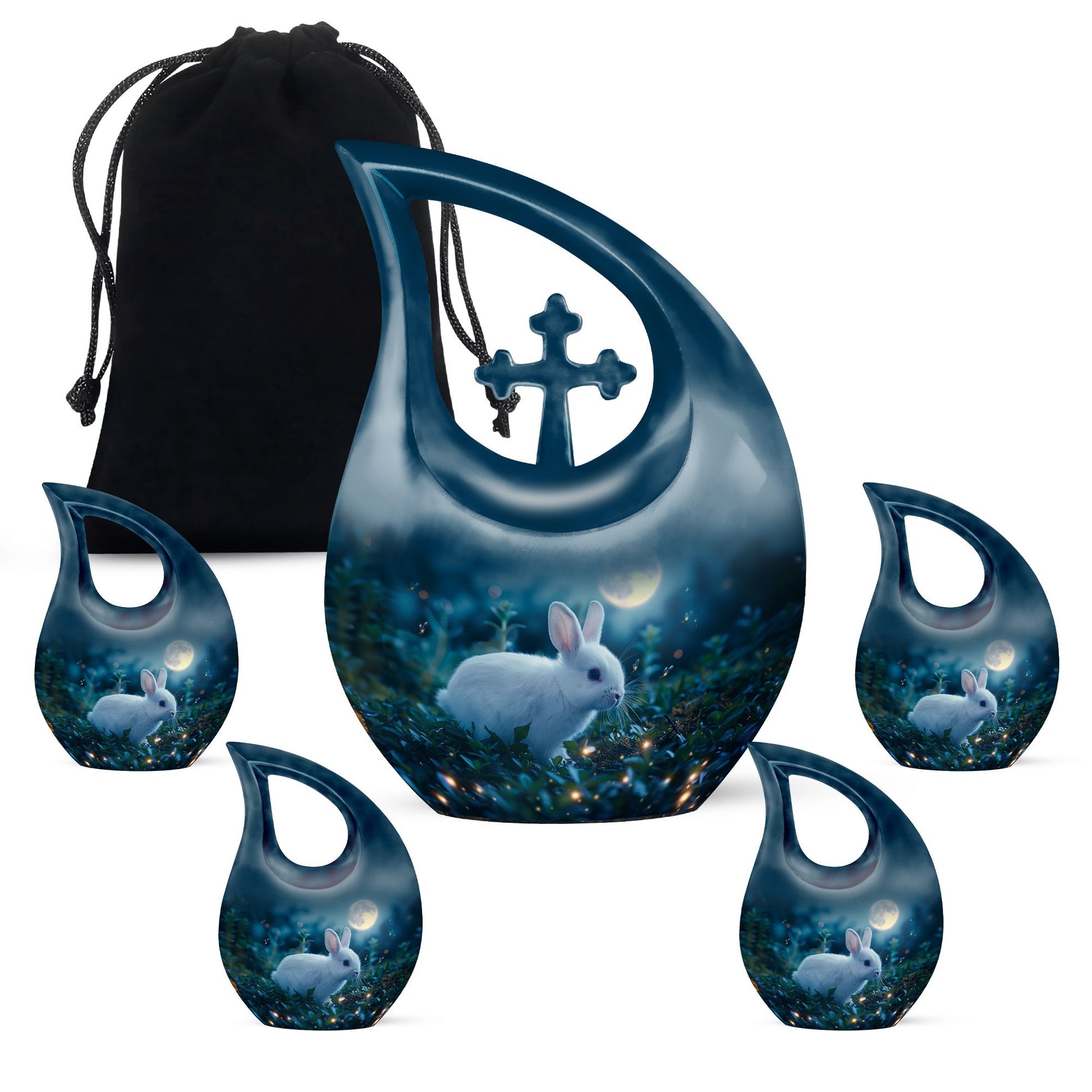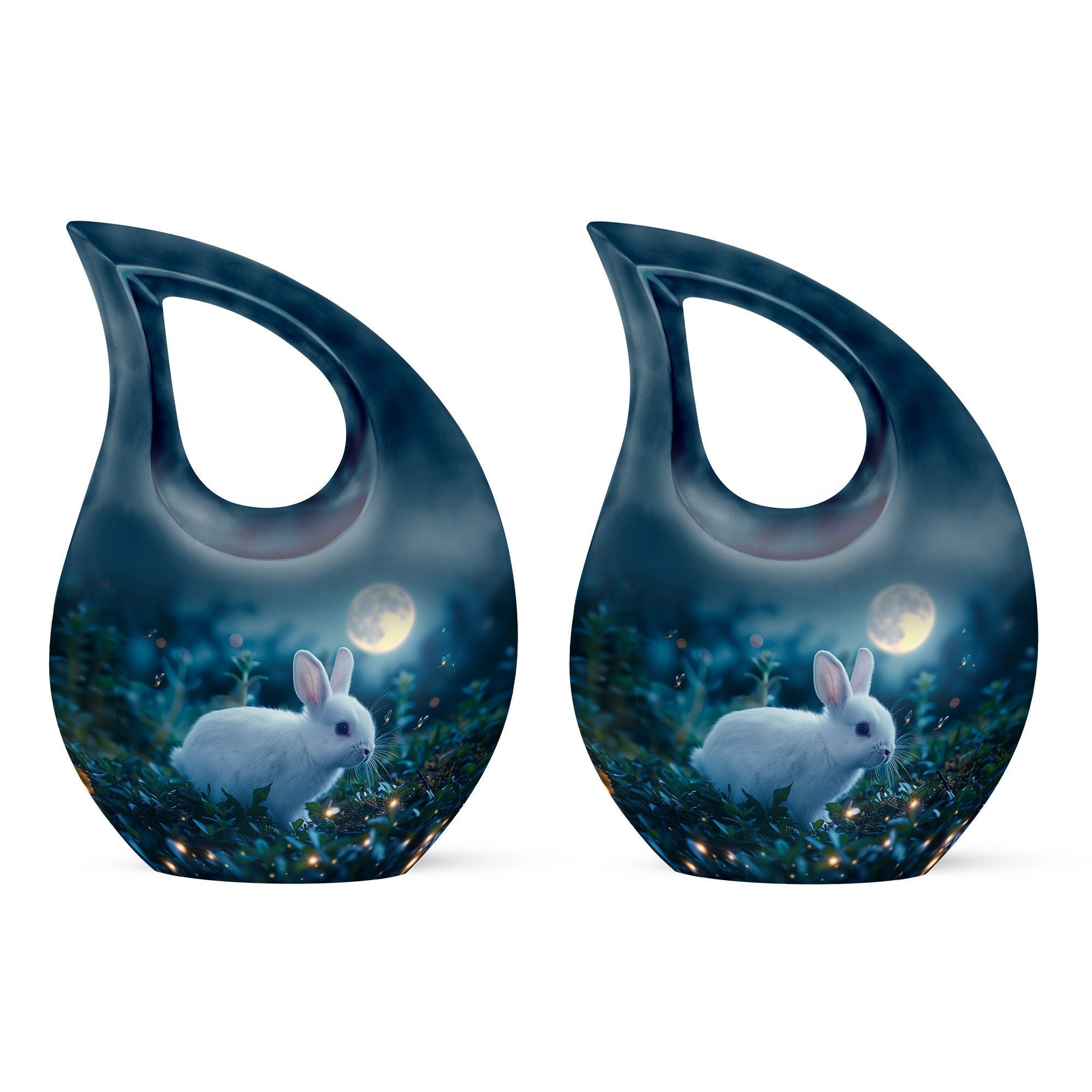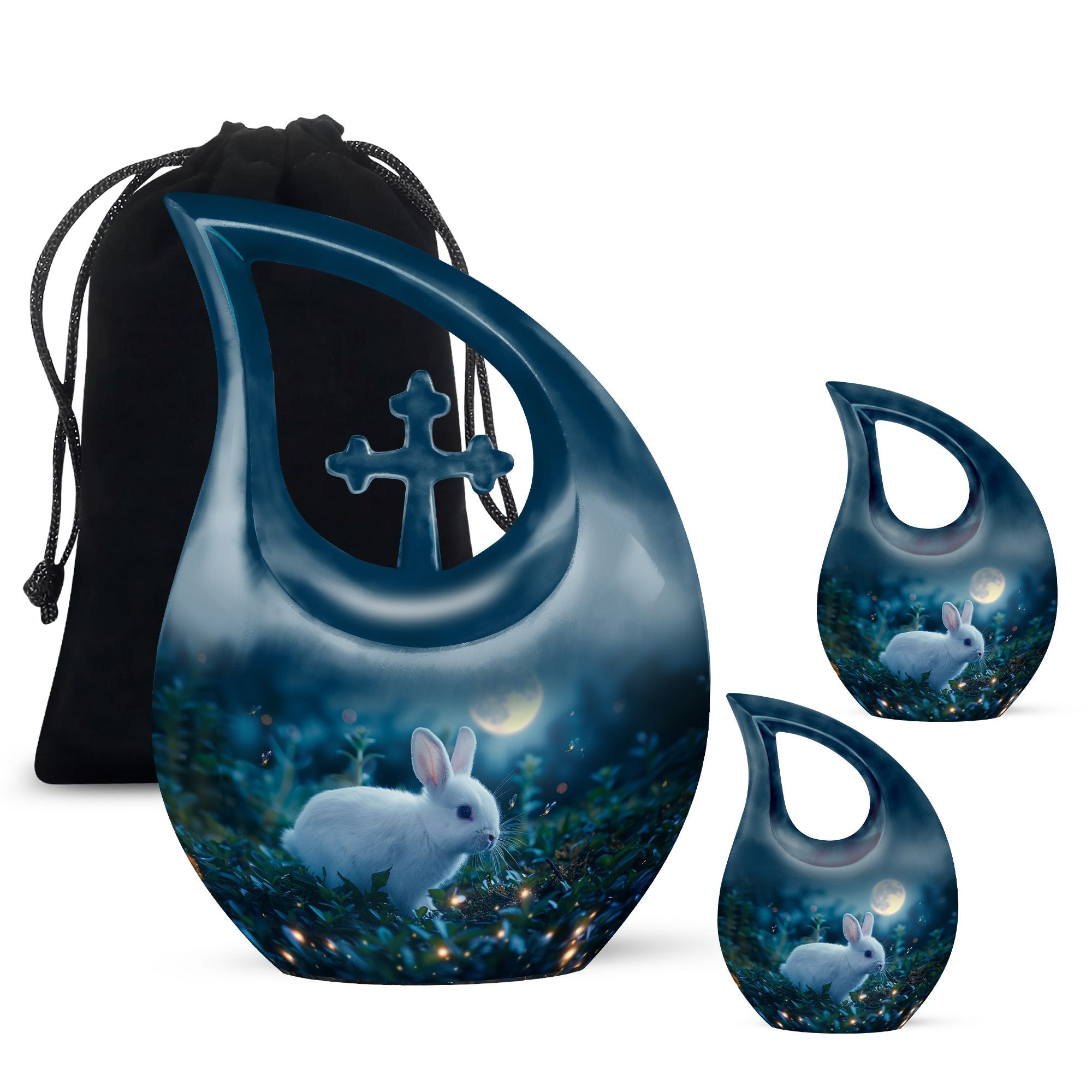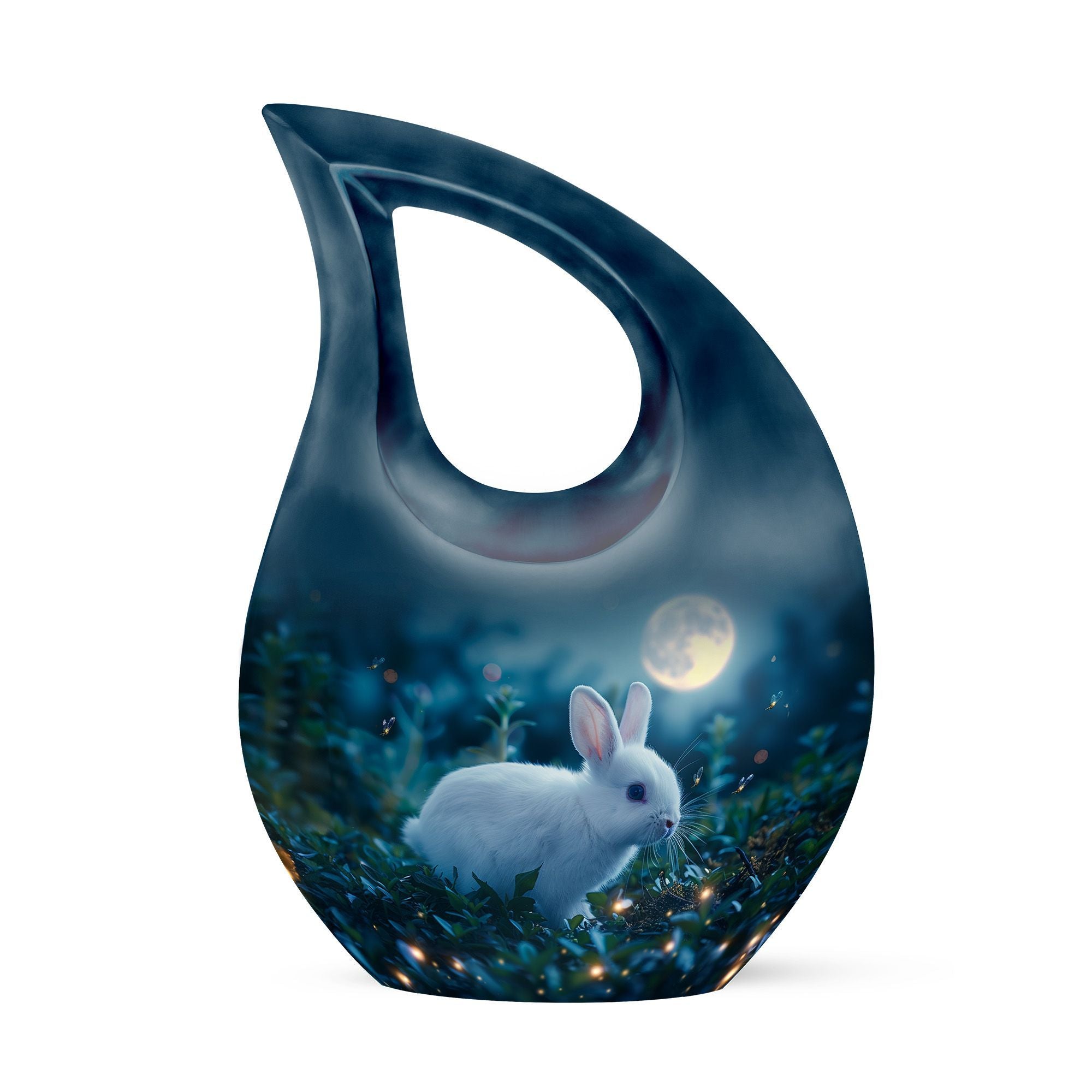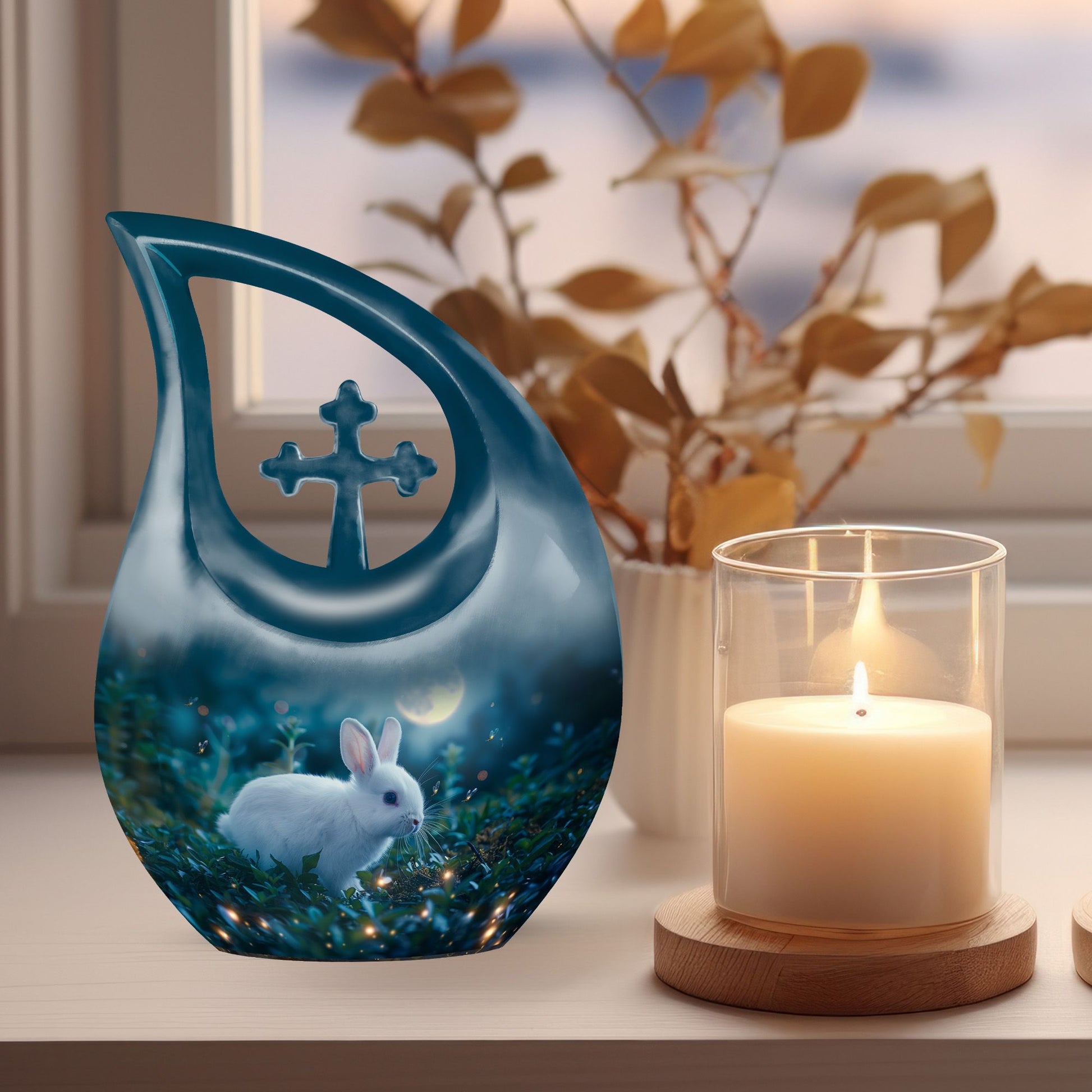 Experience the tranquility and comfort offered by our 'White Bunny Moon Urn'. Crafted with an elegant 'Cross Drop' theme, this cremation container is designed to respect and honor your departed ones. Measuring 10 inches in height and weighing 3.3 pounds, this large urn, formed from robust aluminium, embodies durability as well as aesthetic value. The urn's capacity stands at around 200 cubic inches, fitting for both large and small amounts of ashes. Additionally, the urn comes with a velvet pouch, ensuring the ashes stay secure. The ability to personalize this urn through engraving adds an intimate touch to this token of remembrance. Our 'White Bunny Moon Urn' is not merely a container; it's a beacon of love and memories. Don’t forget to search with keywords like Custom Cremation Urns, Urn for Dad or Large Urns for Ashes to find more of our offerings in memorial urns.