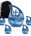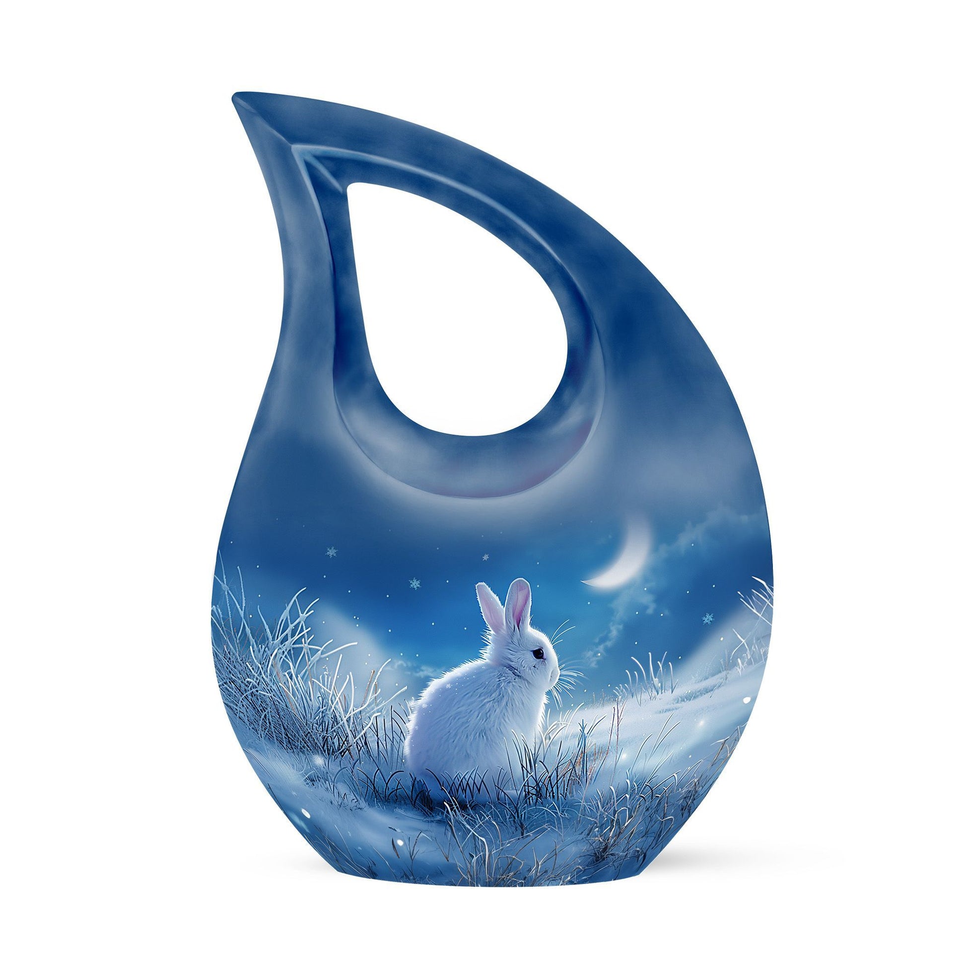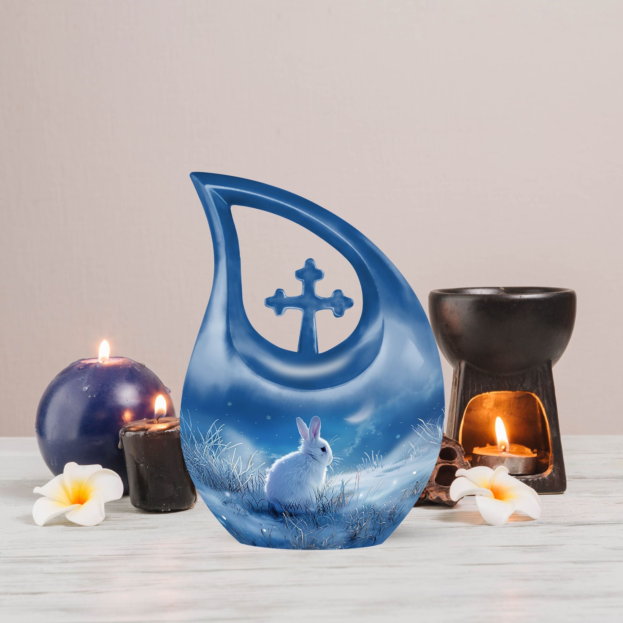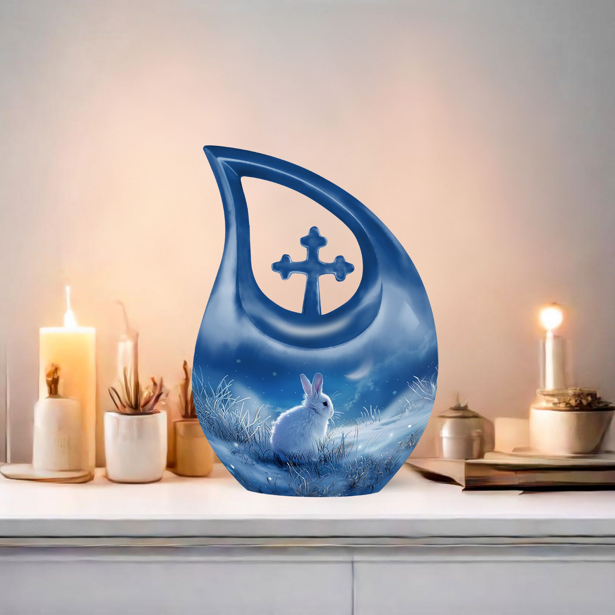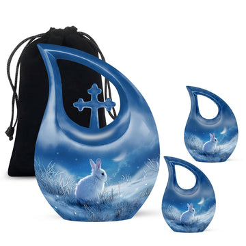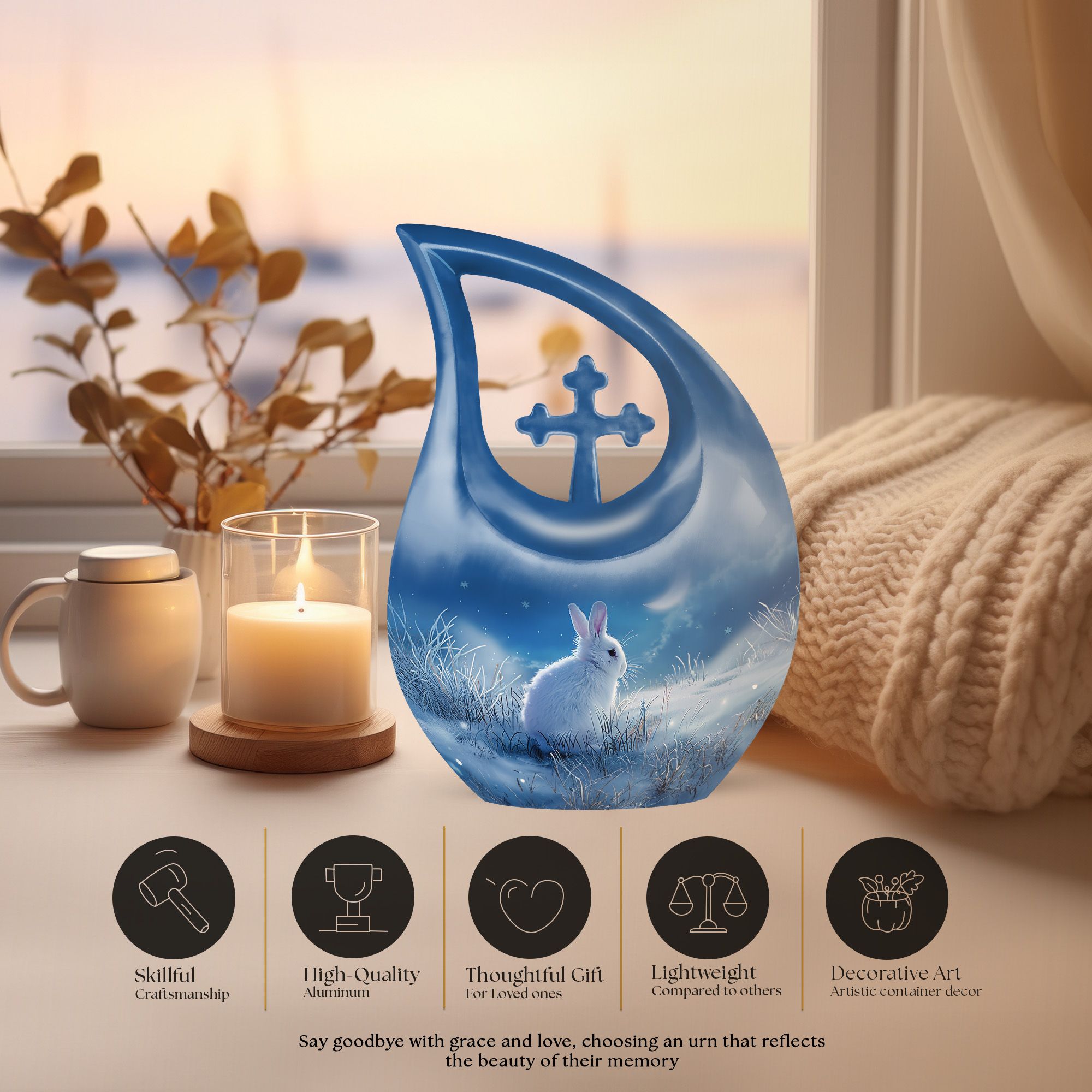 The White Bunny Moon Urn, a noteworthy piece from our collection of memorial urns, beautifully captivates the essence of remembrance. Sized at a generous 10 inches, each urn is fashioned from durable aluminium, promising long-lasting guardianship over cherished relics. A weight of 3.3 pounds ensures steadiness and resilience, and it possesses a substantial capacity of 200 cubic inches. The Cross Drop design imbues the urn with a grace that enhances its spiritual significance, yet it also leaves room for personalization, allowing engraved names to be etched upon request. Accompanying each urn is a velvet pouch, ensuring secure containment of ashes, and further reinforcing the importance of reverence and preservation. From the unique urns for dad to companion urns for adults, our offerings serve to symbolize a multitude of relationships, cherishing memories, and honoring lives lived. Large urns for ashes provide the physical space while the White Bunny Moon theme extends the spiritual expanse of your memory. Skip the crowds, shop urns online in the comfort of your home.