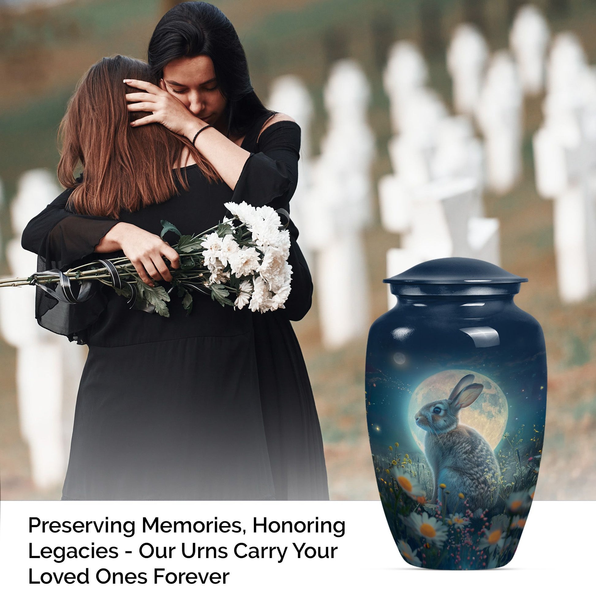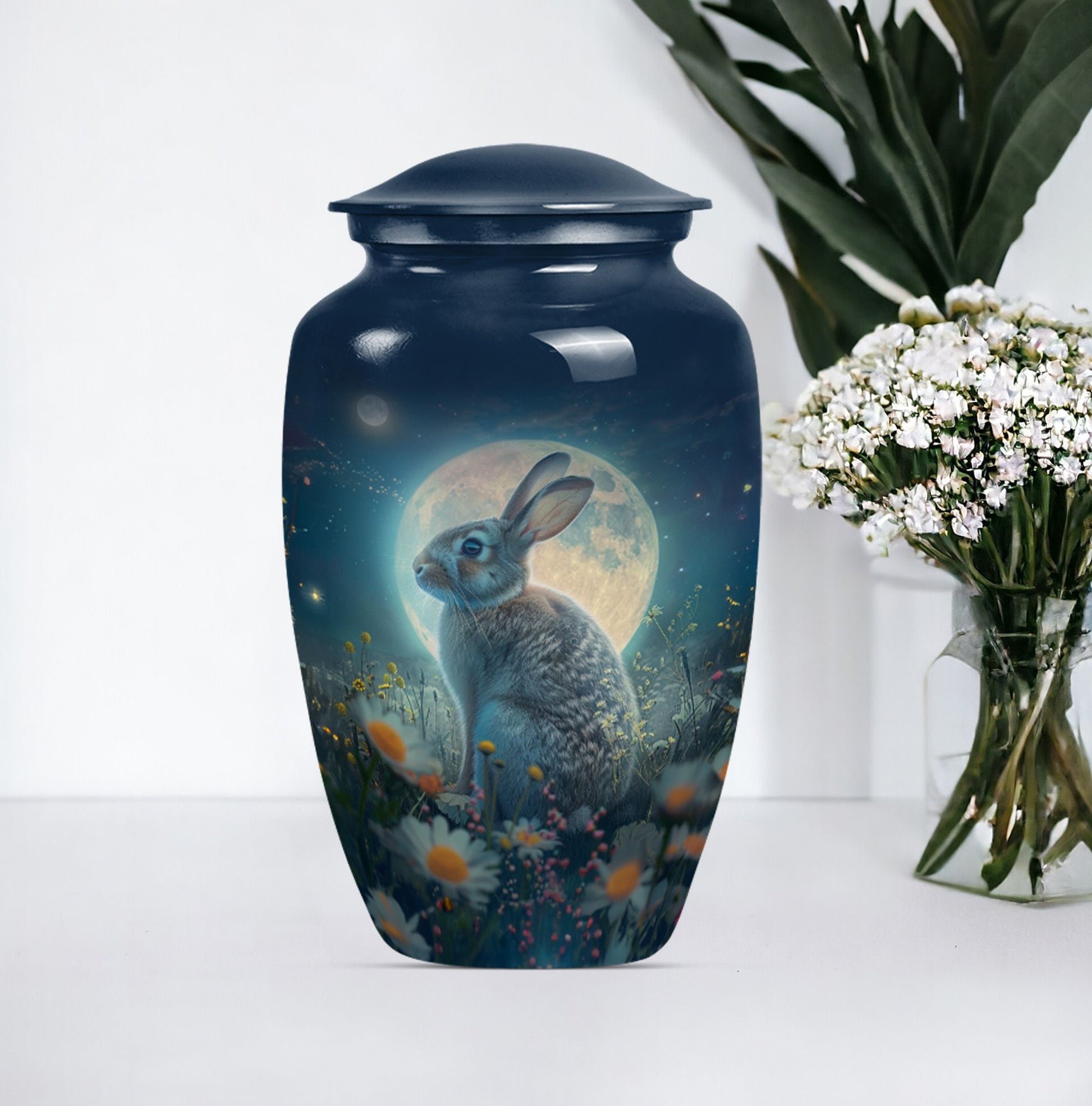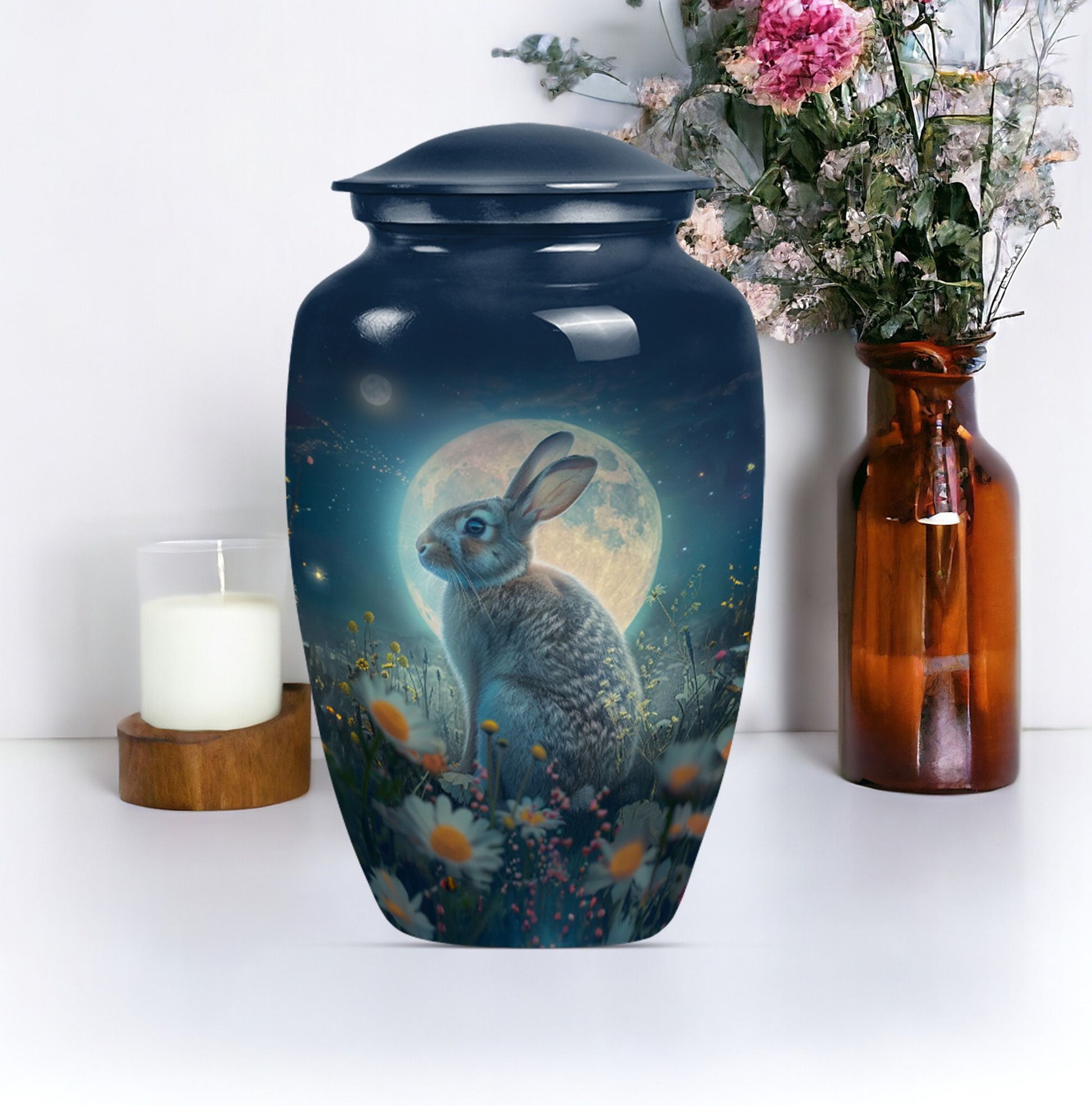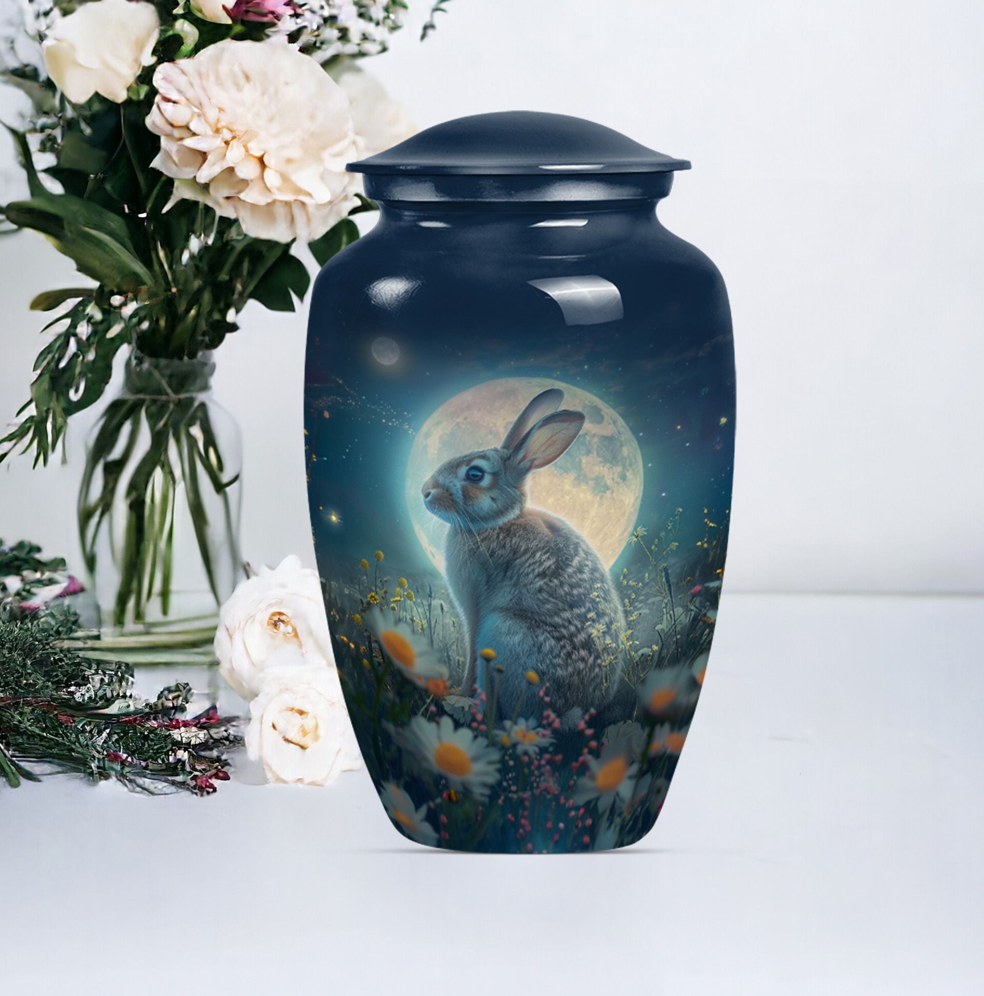 Behold the elegant 'White Bunny Moon Urn', a meticulously crafted funeral urn for men, boasting an abstract theme that goes beyond the ordinary. This large urn stands as a dignified testament in aluminium, measuring 10 inches in height, and accommodates up to 200 cubic inches of ashes. This cremation urn is not just a receptacle, but a monument - a physical embodiment of the love and memories shared. Heavier than most similar urns at 3.3 pounds, it ensures sturdiness. Brought to you in a protective velvet pouch, it lends an extra layer of preservation for the ashes contained within. Emphasize its significance by personalizing it with engraved names for an added touch of sentimental value. Adding this classic urn to your memorial ceremony supplies is a poignant way to honour your departed loved ones. Uniquely identifiable as traditional urns, burial urns, or more specifically, memorial human urns, it holds deep sentimentality with a hint of enduring style.