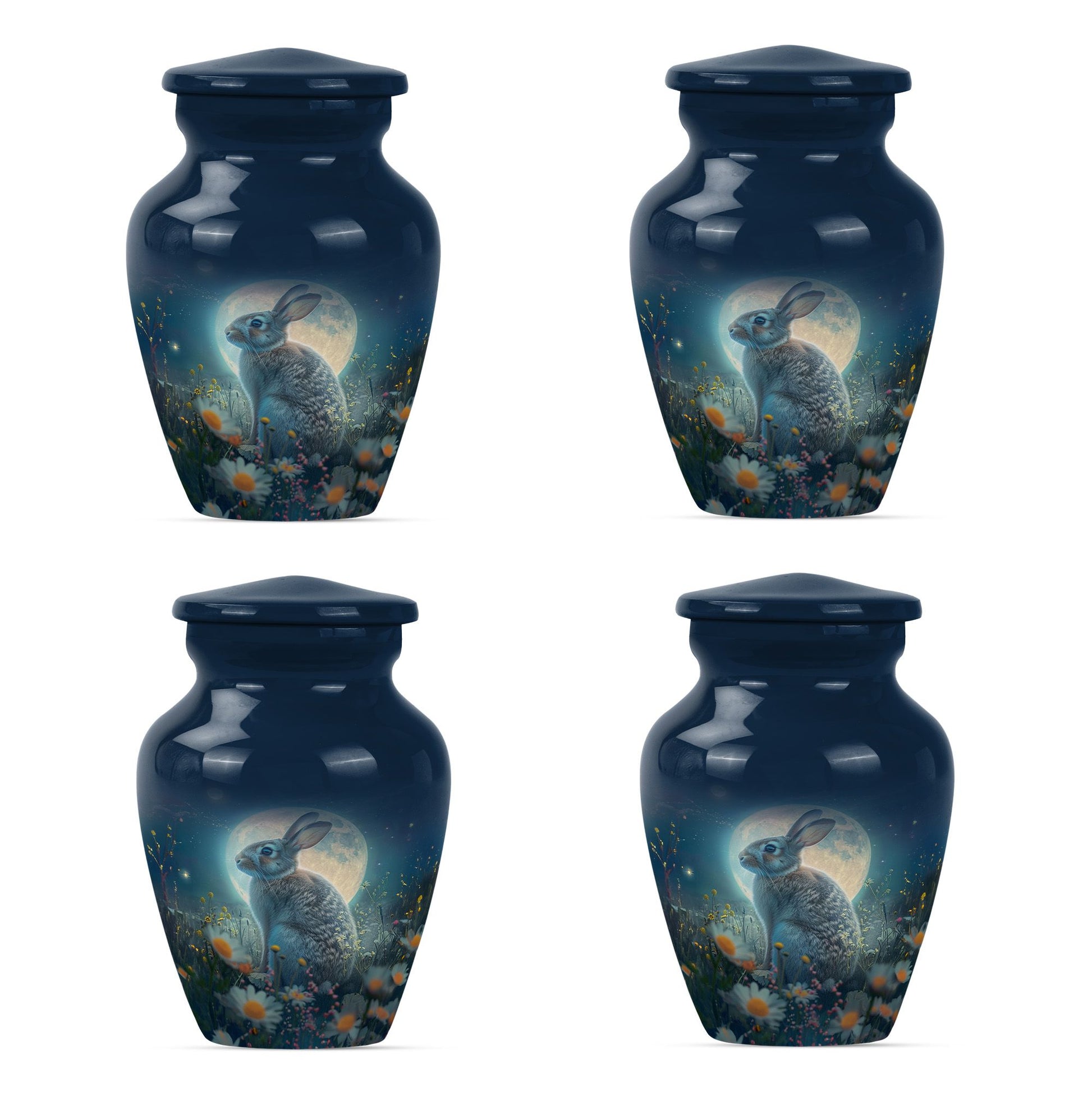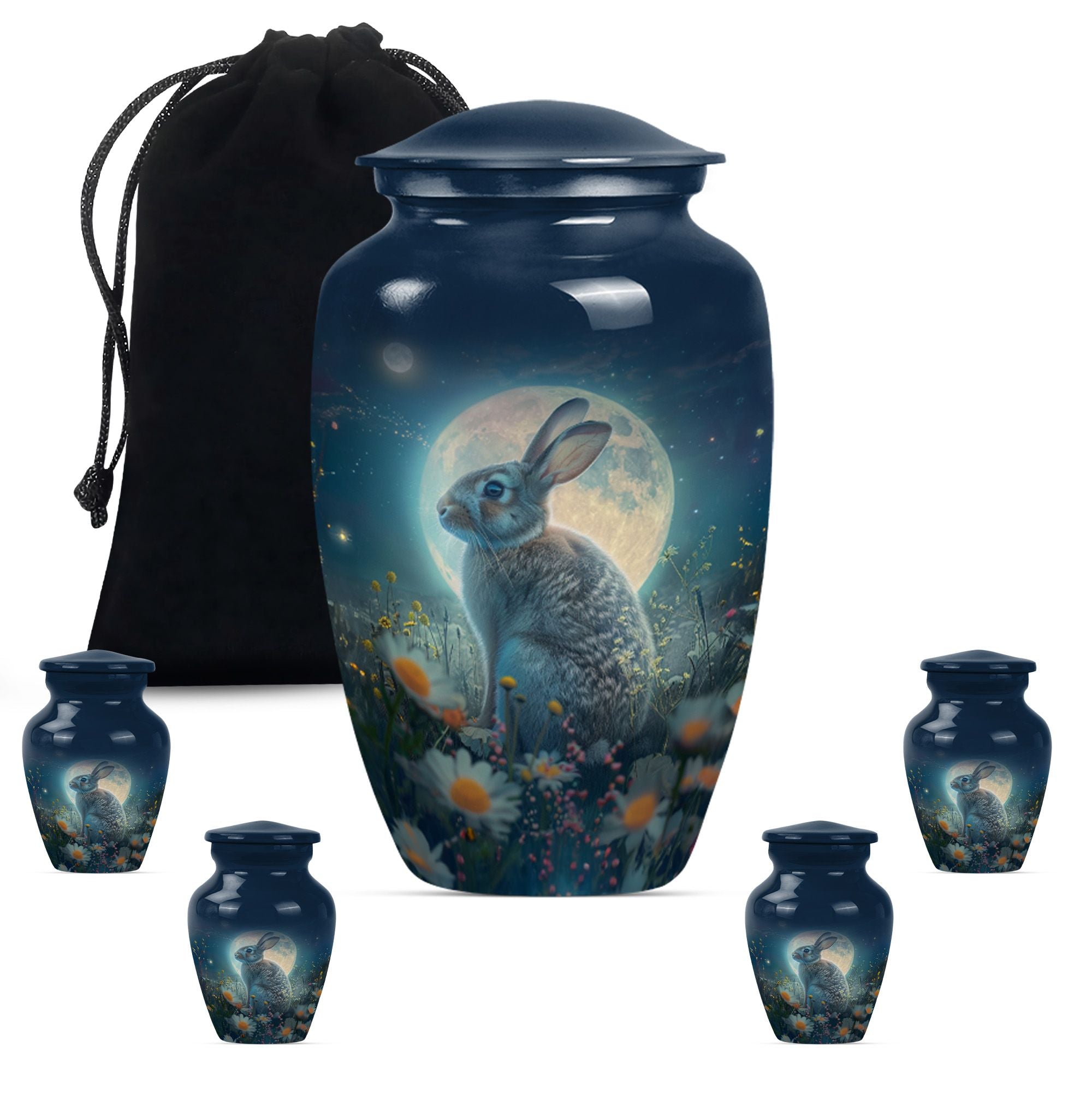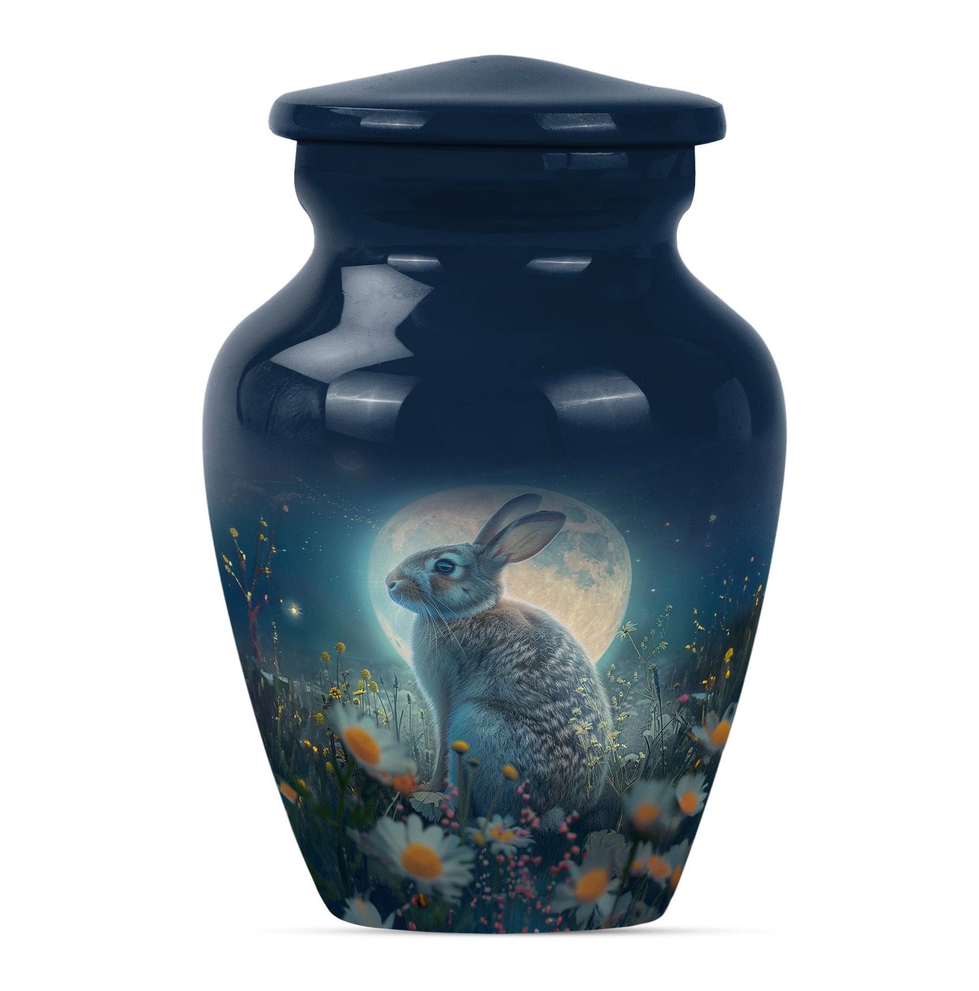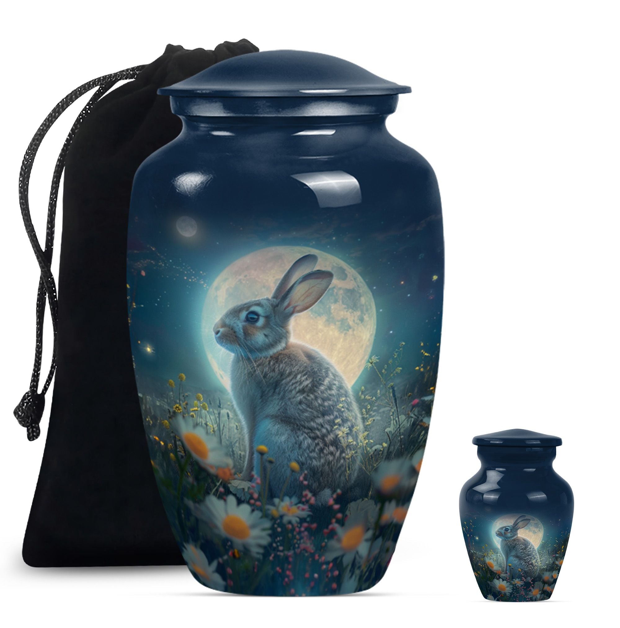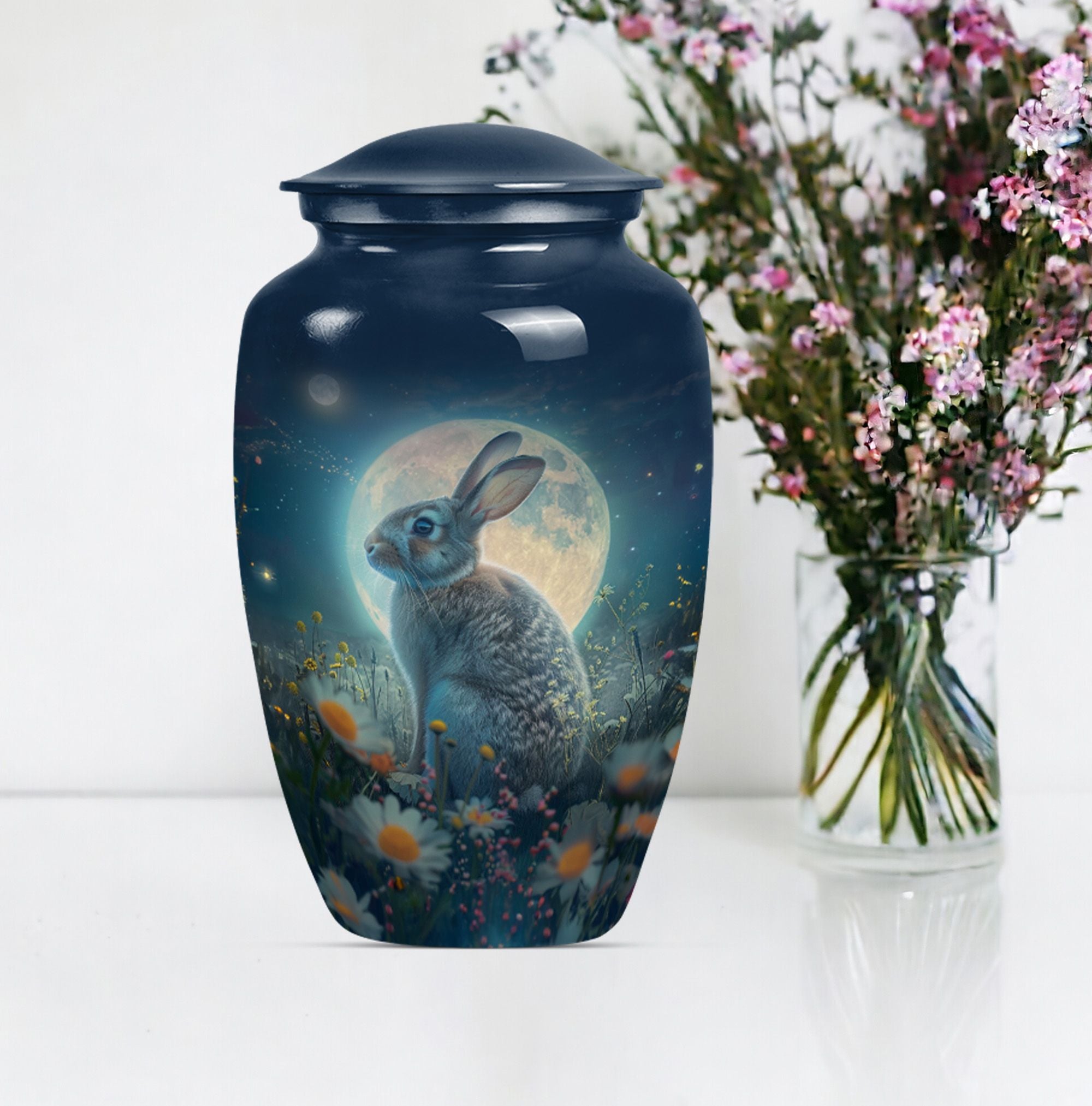 Behold the elegant 'White Bunny Moon Urn', a meticulously crafted funeral urn for men, boasting an abstract theme that goes beyond the ordinary. This large urn stands as a dignified testament in aluminium, measuring 10 inches in height, and accommodates up to 200 cubic inches of ashes. This cremation urn is not just a receptacle, but a monument - a physical embodiment of the love and memories shared. Heavier than most similar urns at 3.3 pounds, it ensures sturdiness. Brought to you in a protective velvet pouch, it lends an extra layer of preservation for the ashes contained within. Emphasize its significance by personalizing it with engraved names for an added touch of sentimental value. Adding this classic urn to your memorial ceremony supplies is a poignant way to honour your departed loved ones. Uniquely identifiable as traditional urns, burial urns, or more specifically, memorial human urns, it holds deep sentimentality with a hint of enduring style.