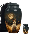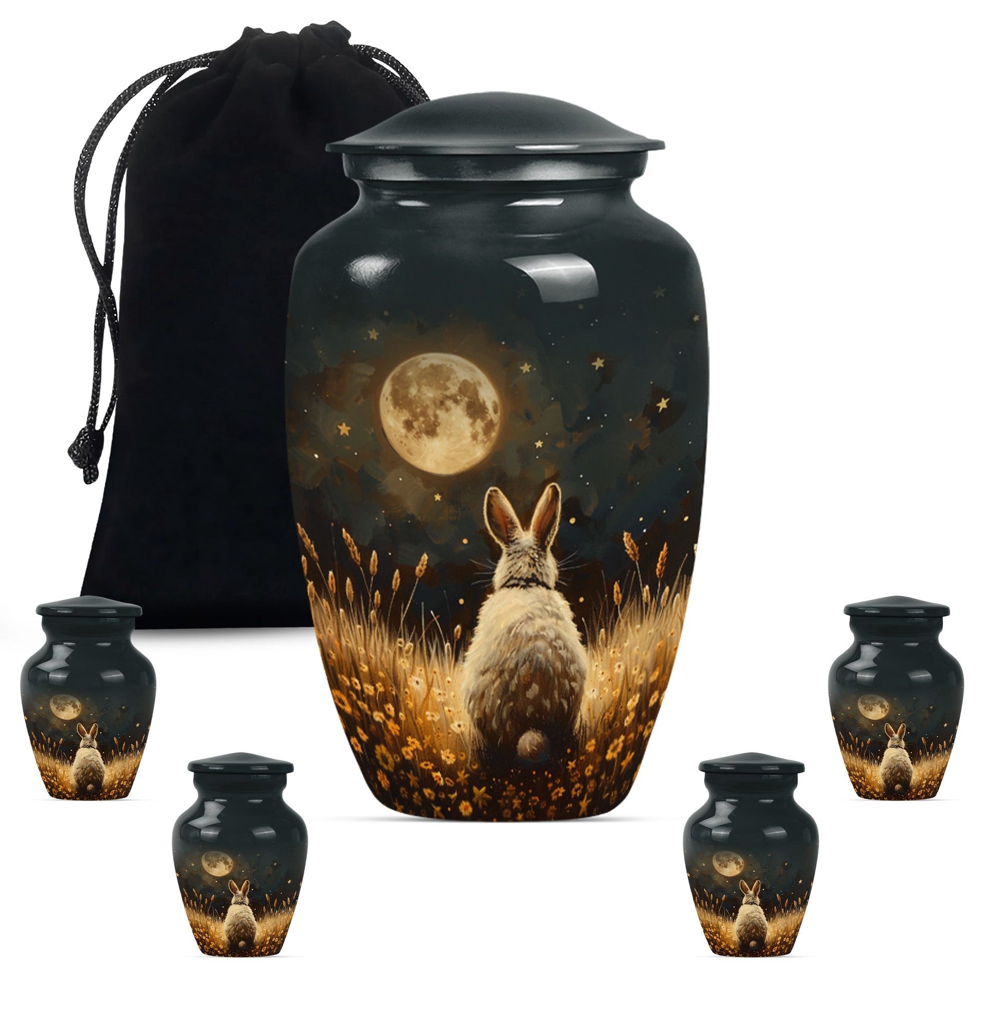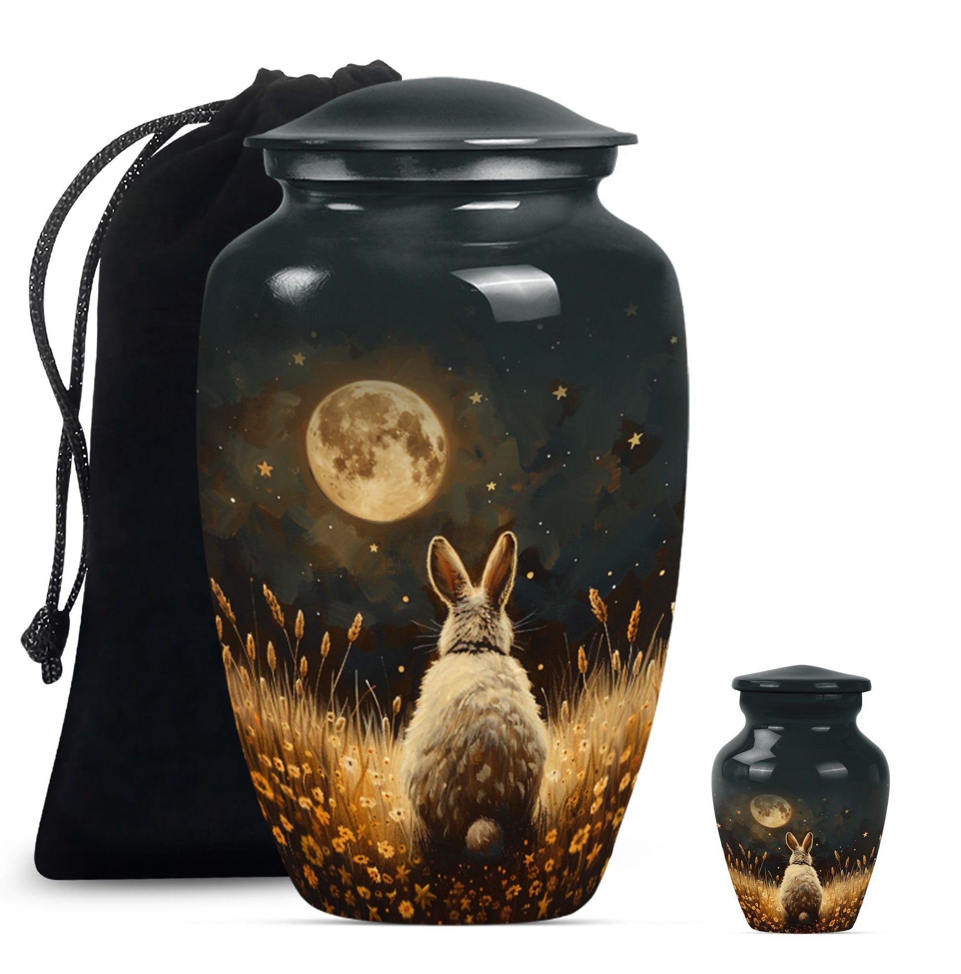 Immerse in the divine essence of your loved one's memories with our exquisite 'white bunny moon urn.' Crafted from premium-quality aluminium, this Classic Urn offers an abstract theme that distinguishes it from common memorial ash urns. With a height of 10 inches and weighing 3.3 pounds, this large urn offers a capacity of 200 cubic inches - ample room to keep the sacred ashes safely. This memorial urns' usability is enhanced by a thoughtfully included velvet pouch for containment of ashes, further ensuring serene intimacy. When it comes to personalization, engrave names or memorable quotes of your choice onto the surface, making these funeral urns a heartfelt remembrance for men and adults. Whether you are searching for 'funeral urns for men's ashes' or 'elegant urns,' our urn stands out as an emotion-imbued keepsake for your precious ones.