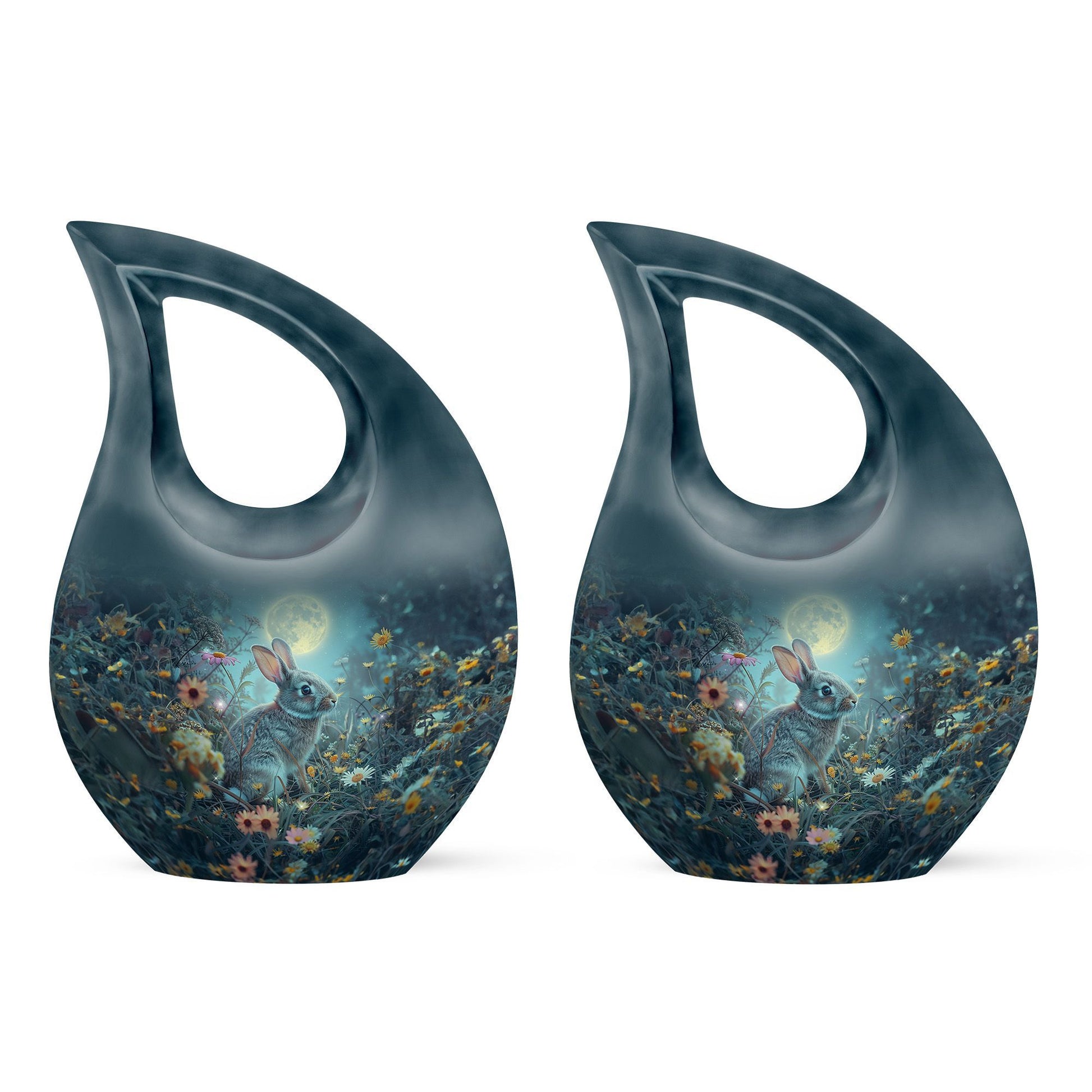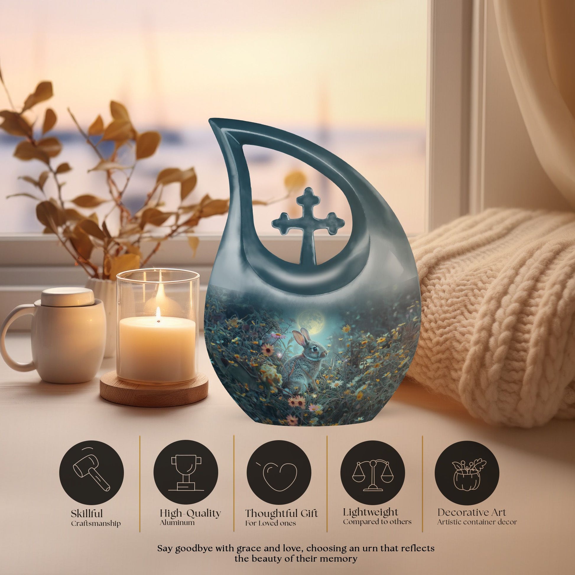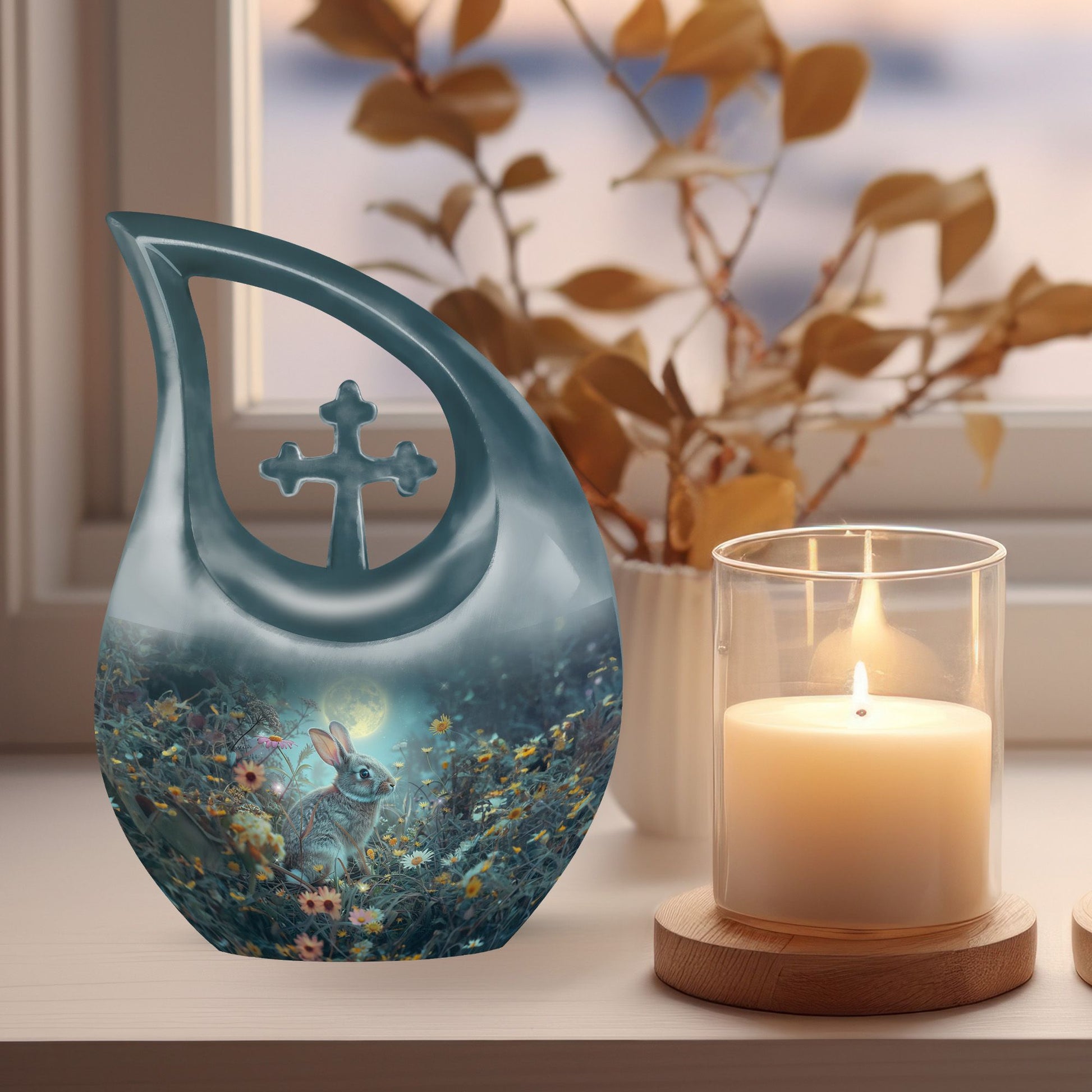 Honor your loved ones with our unique White Bunny Moon Urn, perfect for adults looking towards the heavens during their remembrance. Its 200 cubic inch capacity, measuring 10 inches in height, accommodates the ashes of adults, making it an ideal selection for companion urns. This aluminum-made urn weighs 3.3 pounds, assuring durability and longevity in preserving the memory of the departed. Further personalize your keepsake with engraved names, adding a more intimate touch to your memorial. Packaged with a velvet pouch, this urn ensures a dignified containment for your cherished one's ashes. More than just a simple cremation container, the White Bunny Moon Urn includes an elegantly designed Cross Drop theme, bringing an air of serenity, grace, and fondly remembered nights under the moon. Ideal as a unique urn for Dad or any close relation, as it beautifully marries function and form in memorializing your loved one. Note that this product falls under the category of large urns, proving its ample space for preserving precious memories.