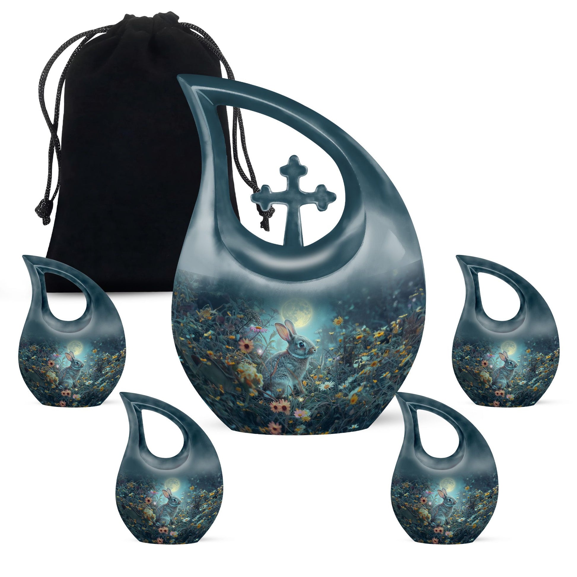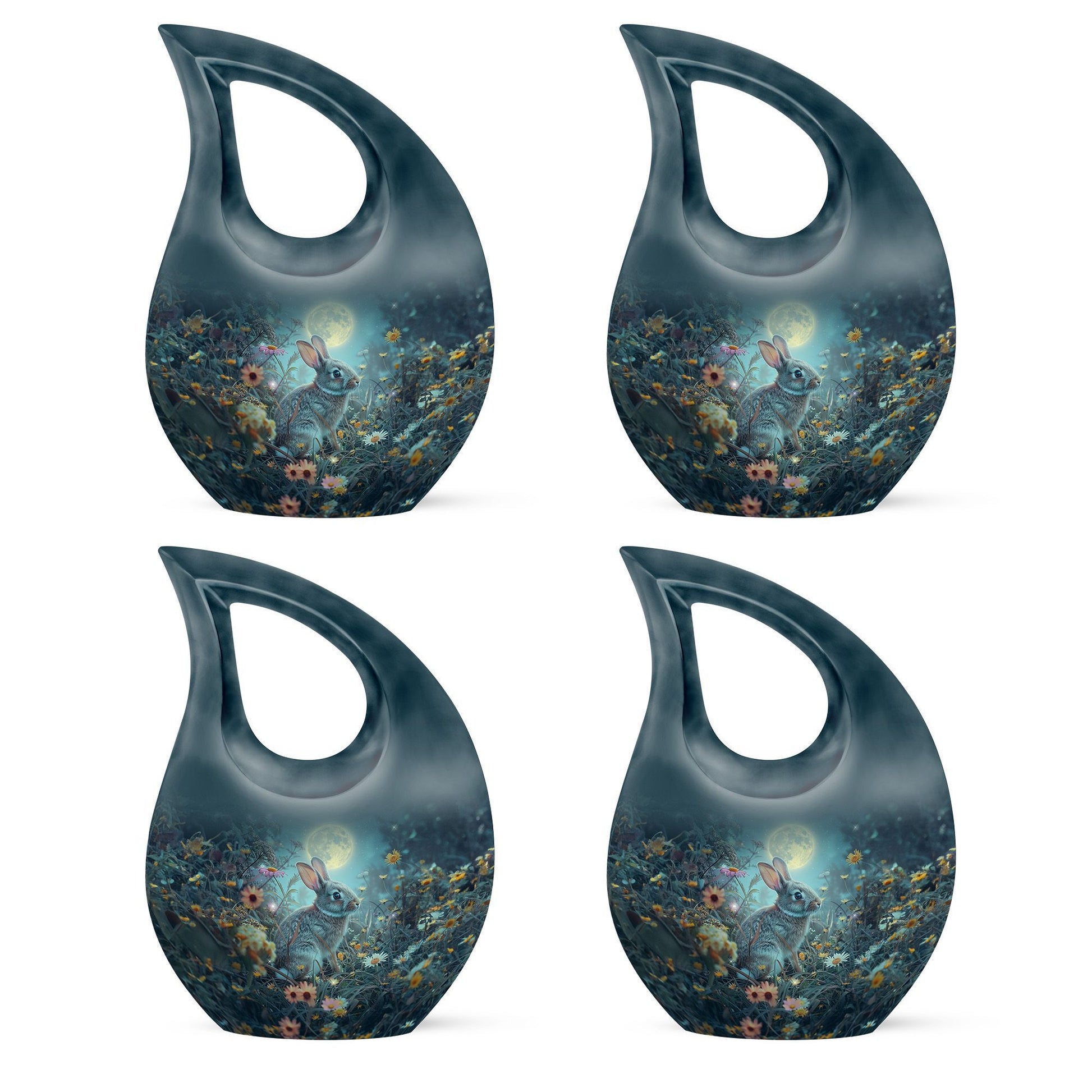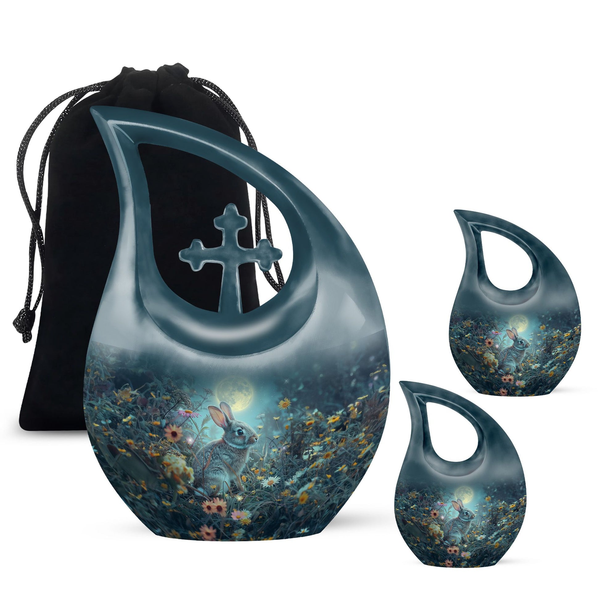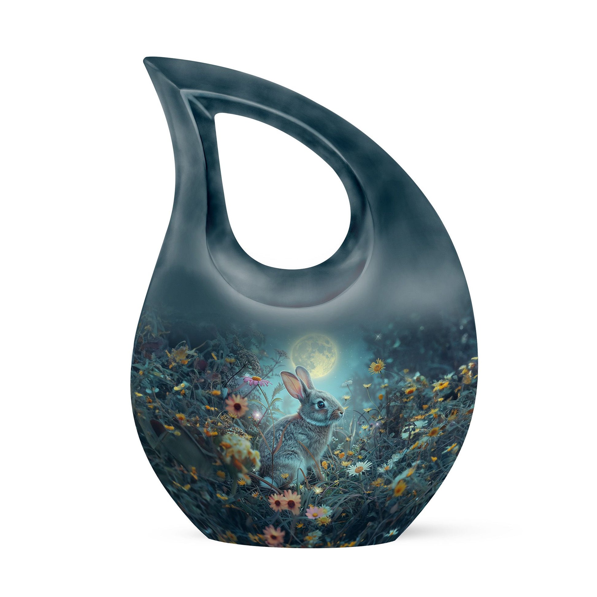 Honor your loved ones with our unique White Bunny Moon Urn, perfect for adults looking towards the heavens during their remembrance. Its 200 cubic inch capacity, measuring 10 inches in height, accommodates the ashes of adults, making it an ideal selection for companion urns. This aluminum-made urn weighs 3.3 pounds, assuring durability and longevity in preserving the memory of the departed. Further personalize your keepsake with engraved names, adding a more intimate touch to your memorial. Packaged with a velvet pouch, this urn ensures a dignified containment for your cherished one's ashes. More than just a simple cremation container, the White Bunny Moon Urn includes an elegantly designed Cross Drop theme, bringing an air of serenity, grace, and fondly remembered nights under the moon. Ideal as a unique urn for Dad or any close relation, as it beautifully marries function and form in memorializing your loved one. Note that this product falls under the category of large urns, proving its ample space for preserving precious memories.