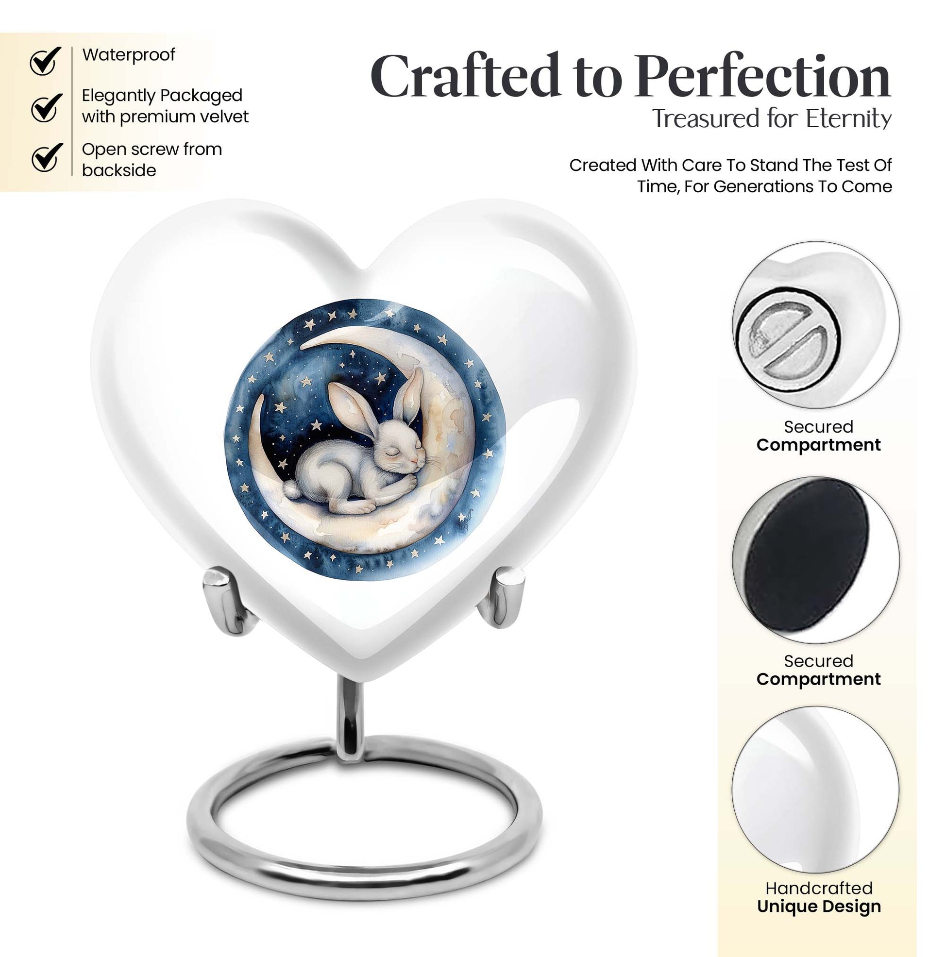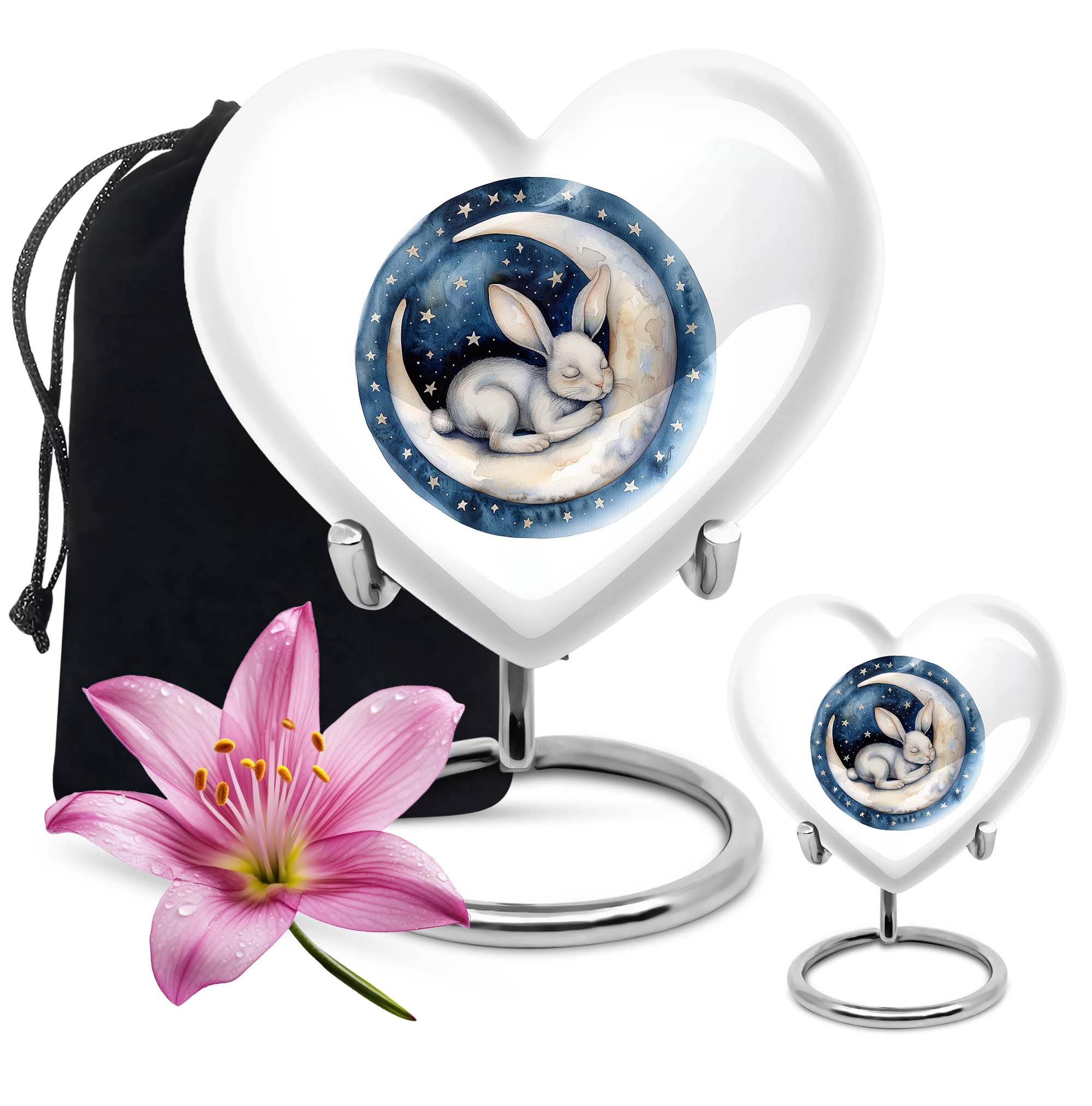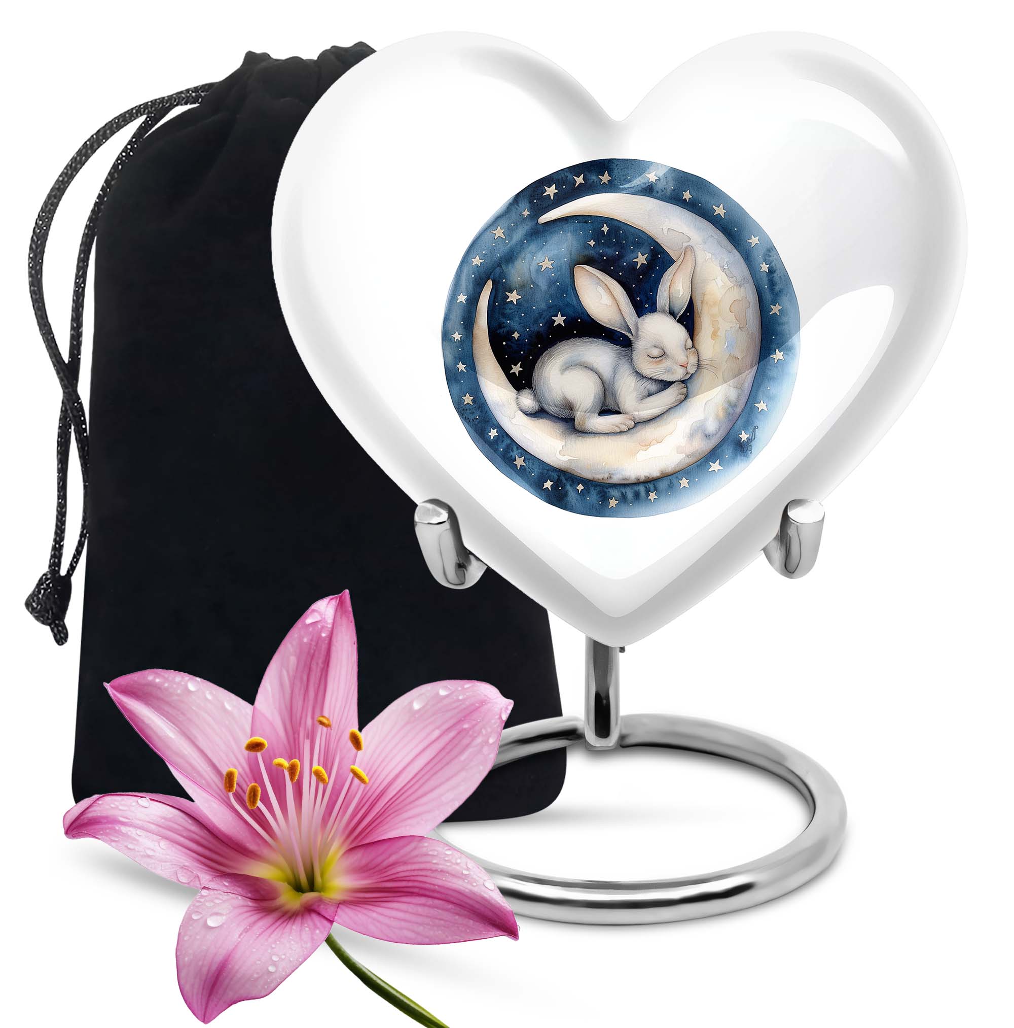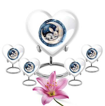 Gracefully crafted to honor your beloved departed, this 10-inch white bunny moon urn offers a beautifully unique and artfully abstract design, a perfect blend of solemnity and elegance. Weighing 3.3 pounds, it can comfortably hold up to 200 cubic inches of ashes. The heart-shaped urn, composed of top-quality aluminium, is not only supremely durable but also appeals with its mesmerizing aesthetics. Personalize this large urn with engraved names, letting it lovingly tell your dear one's story. The urn is perfect for those searching for 'white bunny moon Urn', 'funeral ash urn', 'memorial urns' or related keywords. Furthermore, each urn comes further contained in a velvet pouch for careful conservation of the ashes. This product appeals to those looking for 'memorial urn for mom ashes', 'human ashes urn', 'unique urns' or 'metal urns for adult human ashes'. Pay your respects to your loved ones with this stunning tribute that retains their memory in the heart.