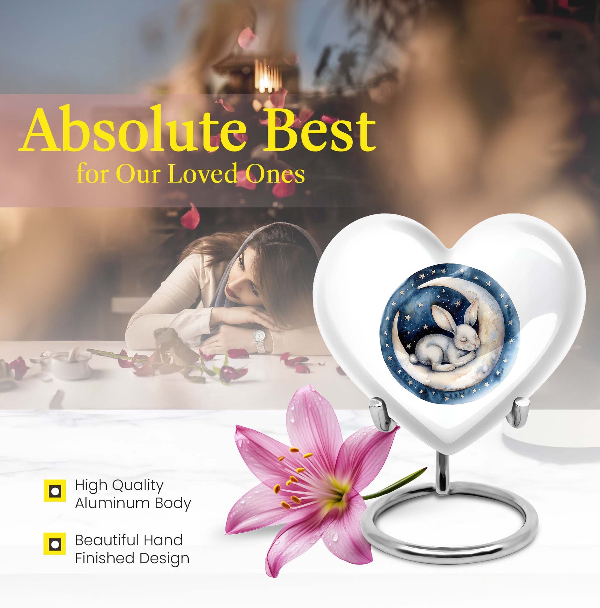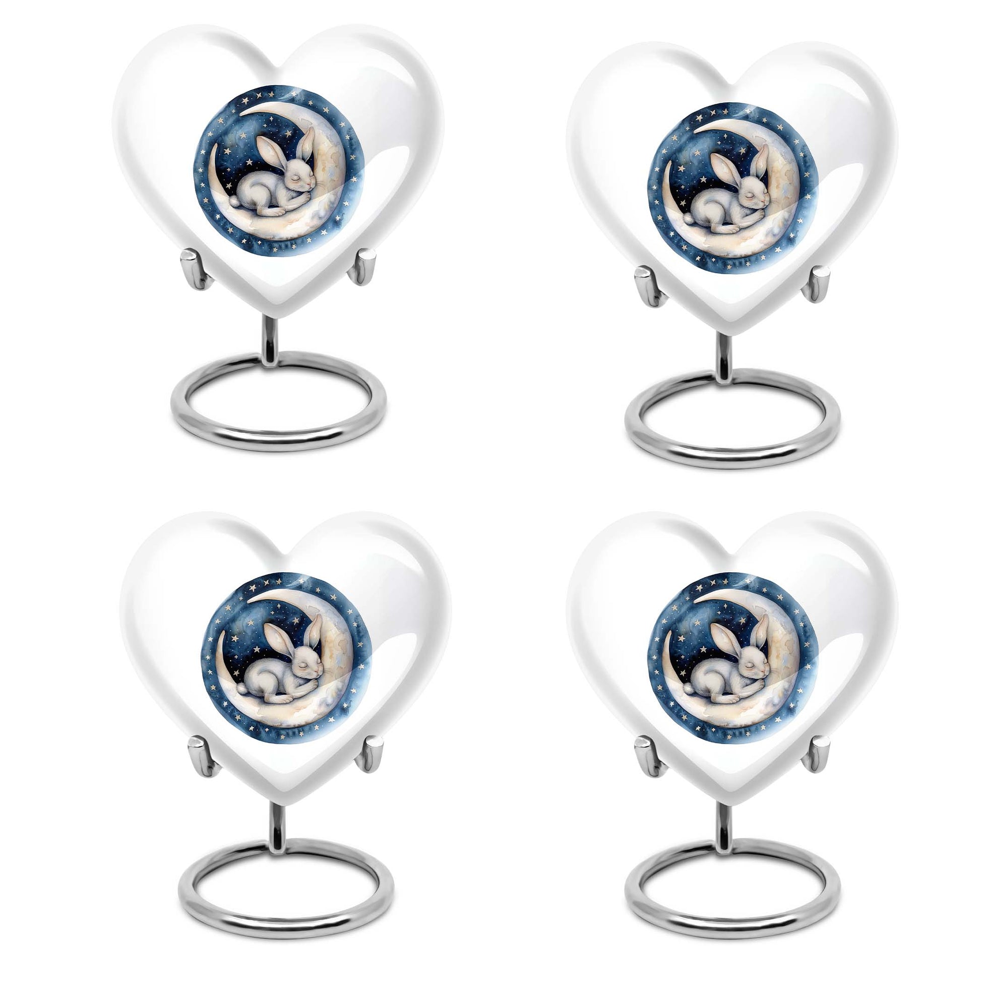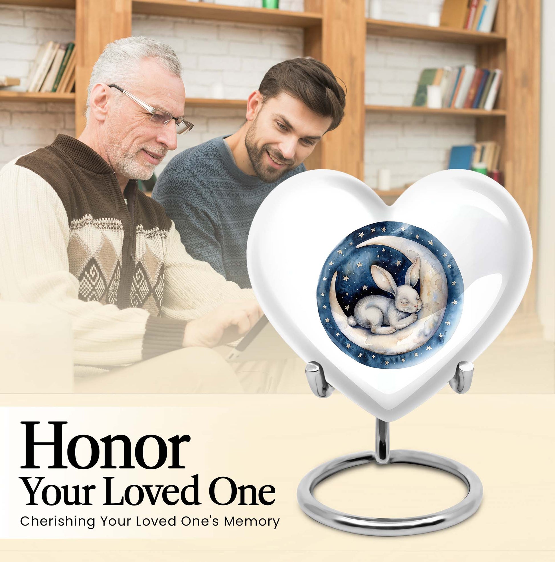 Gracefully crafted to honor your beloved departed, this 10-inch white bunny moon urn offers a beautifully unique and artfully abstract design, a perfect blend of solemnity and elegance. Weighing 3.3 pounds, it can comfortably hold up to 200 cubic inches of ashes. The heart-shaped urn, composed of top-quality aluminium, is not only supremely durable but also appeals with its mesmerizing aesthetics. Personalize this large urn with engraved names, letting it lovingly tell your dear one's story. The urn is perfect for those searching for 'white bunny moon Urn', 'funeral ash urn', 'memorial urns' or related keywords. Furthermore, each urn comes further contained in a velvet pouch for careful conservation of the ashes. This product appeals to those looking for 'memorial urn for mom ashes', 'human ashes urn', 'unique urns' or 'metal urns for adult human ashes'. Pay your respects to your loved ones with this stunning tribute that retains their memory in the heart.