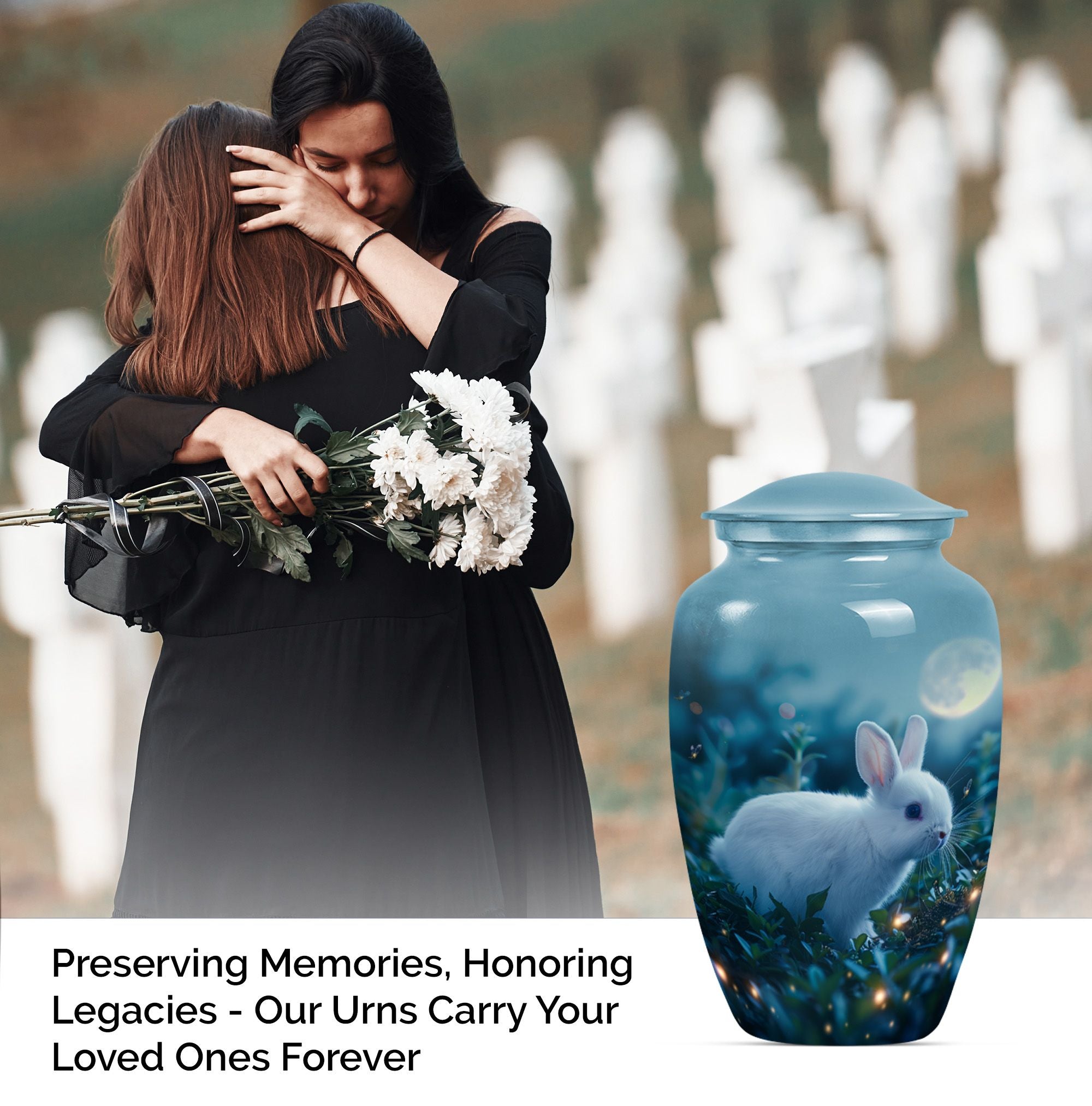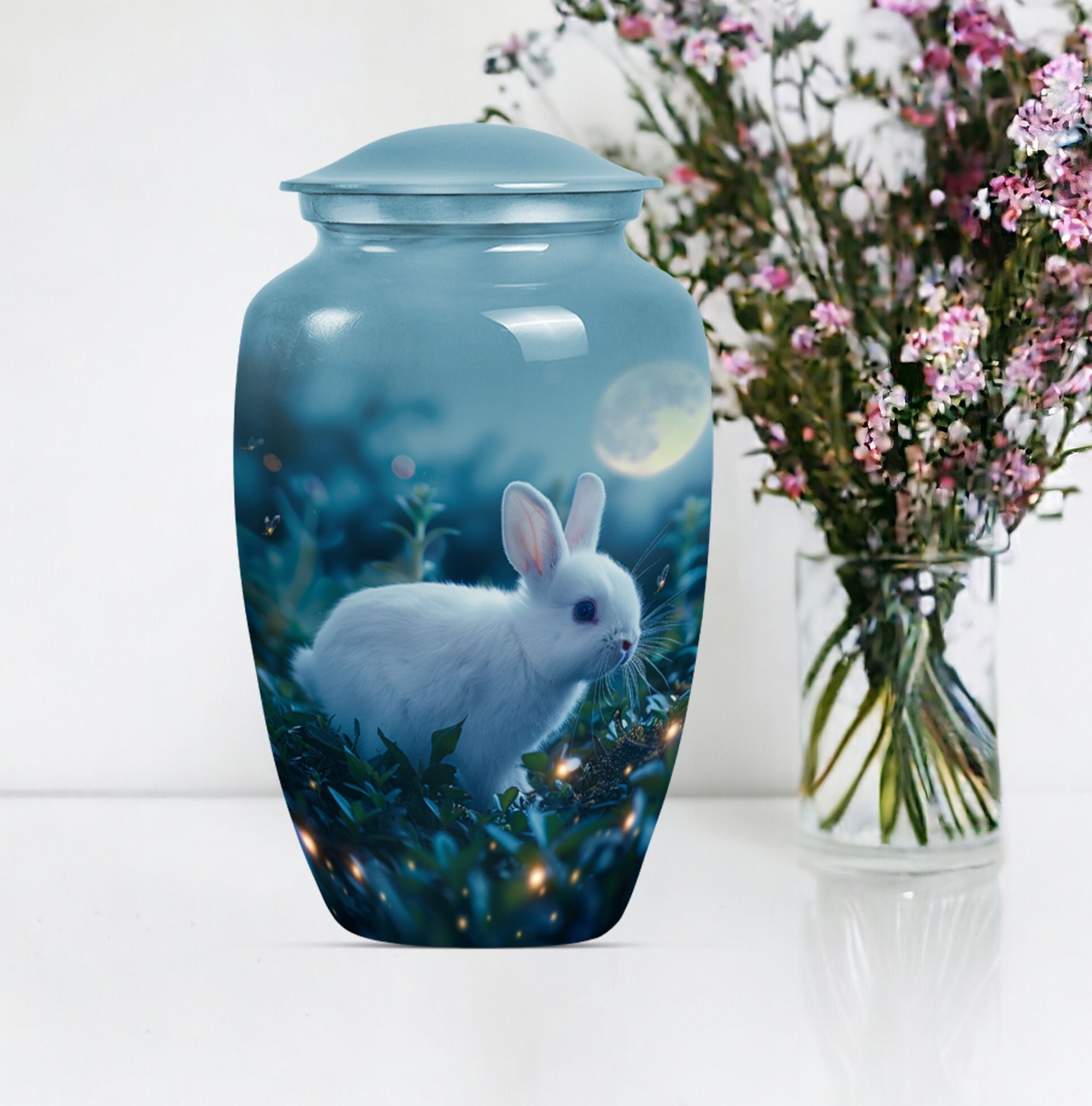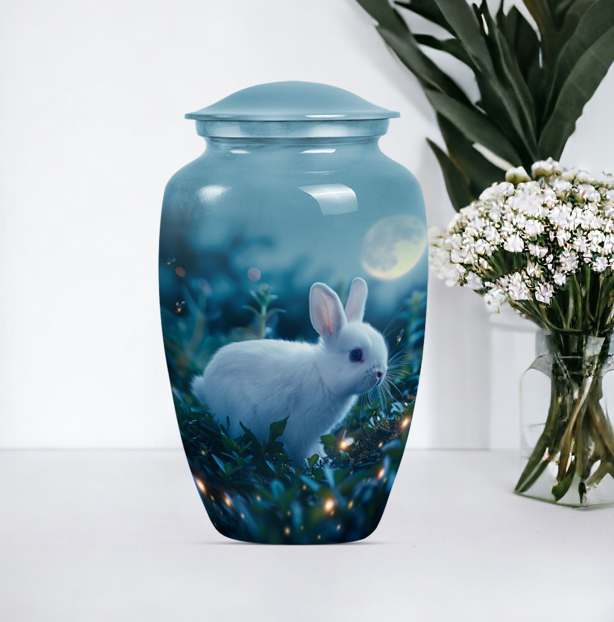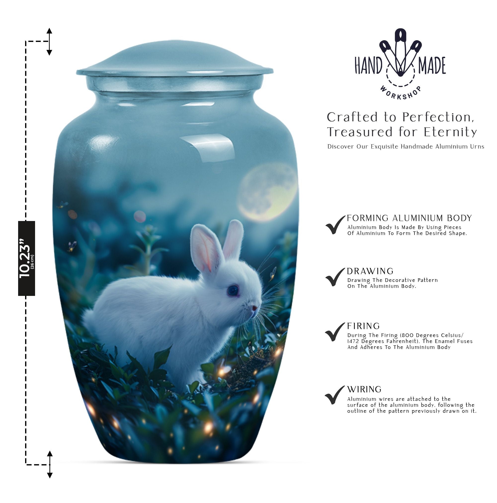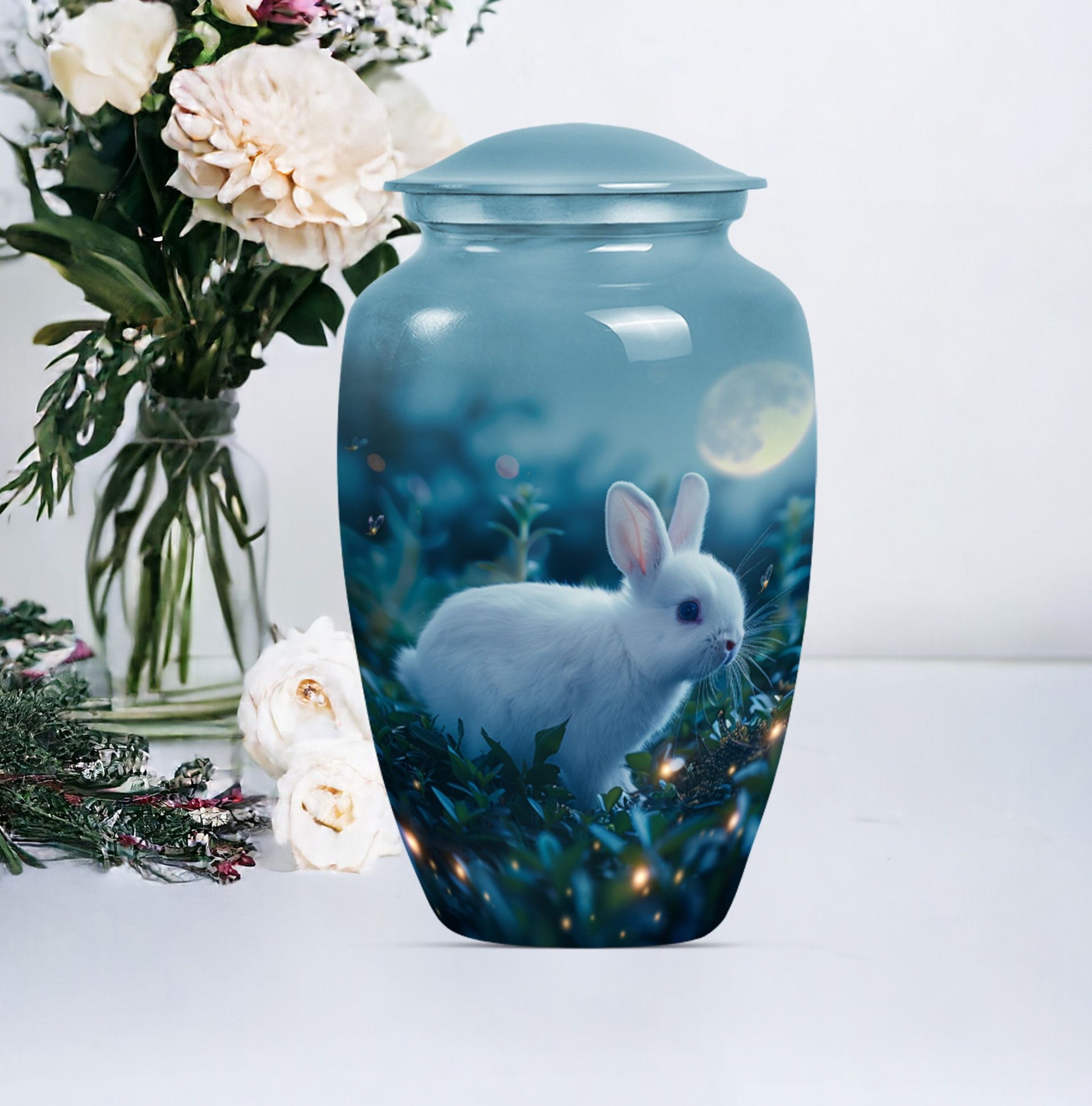 Preserve the memory of your beloved ones with our White Bunny Moon Urn, a comforting symbol of life's cyclical nature. Carefully crafted from premium aluminium, this 10-inch large urn has a weight of 3.3 pounds and can hold up to 200 cubic inches. Its classic and abstract theme pays homage to your memorable moments and timeless bonds. This cremation urn comes with a velvet pouch, offering a dignified containment for the ashes. Enrich its sentimental value by personalizing it with name engraving, giving another layer of remembrance to your missed ones. Perfect as outdoor urns or burial urns, make your memorial ceremony special with our unique funeral urn for adult ashes. Capture the essence of love and memories, and keep them alive in your hearts through our White Bunny Moon Urn, your own precious memorial urn for ashes for mom.