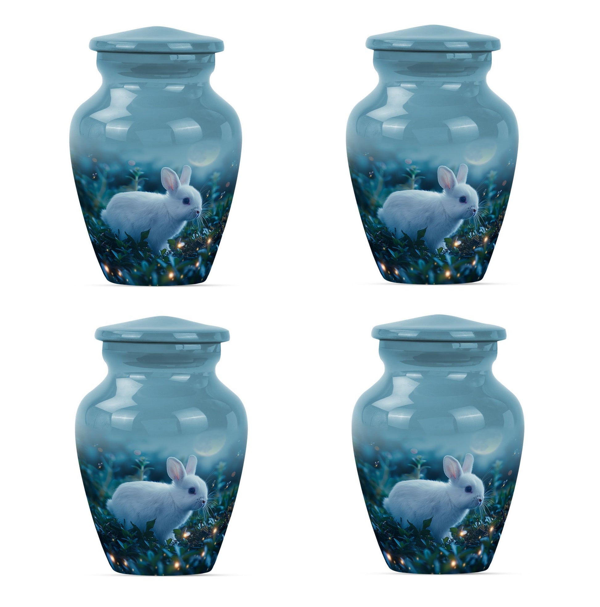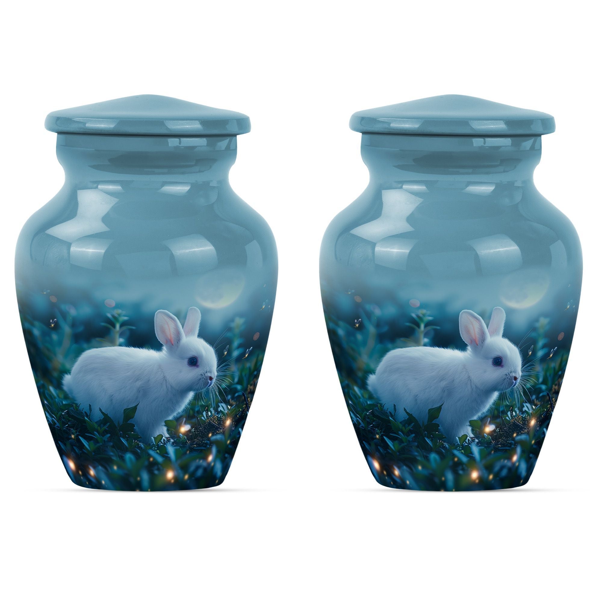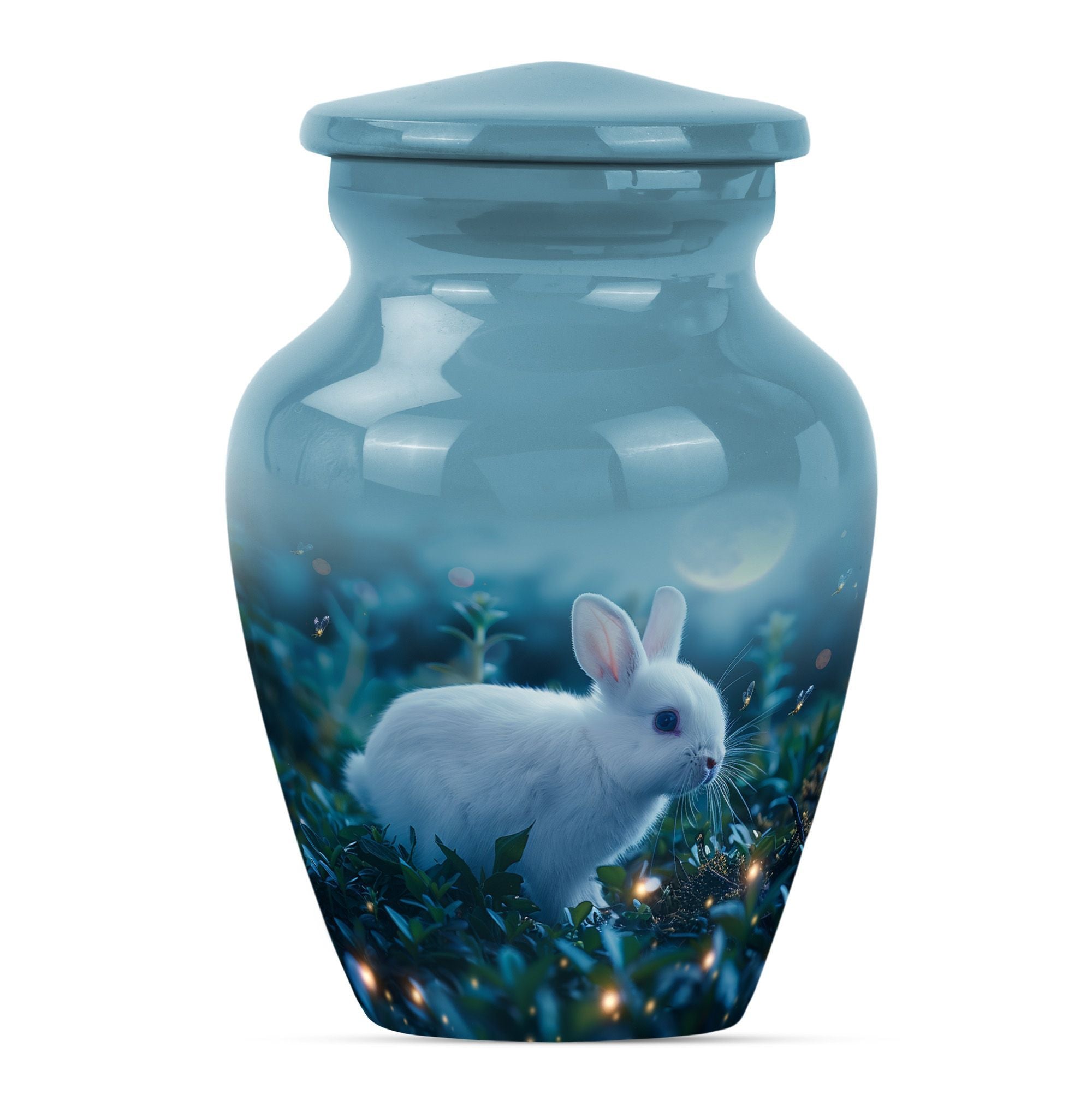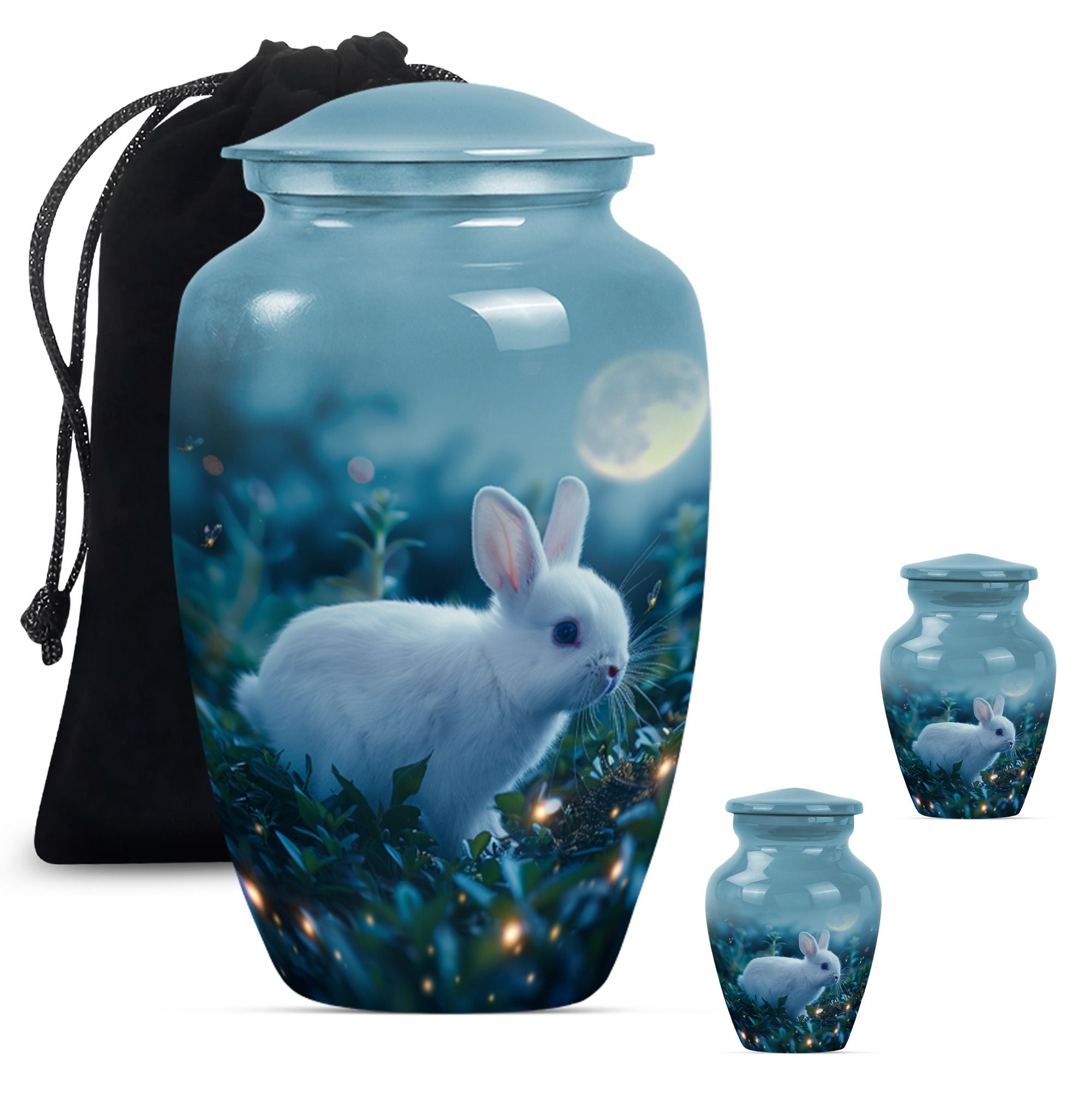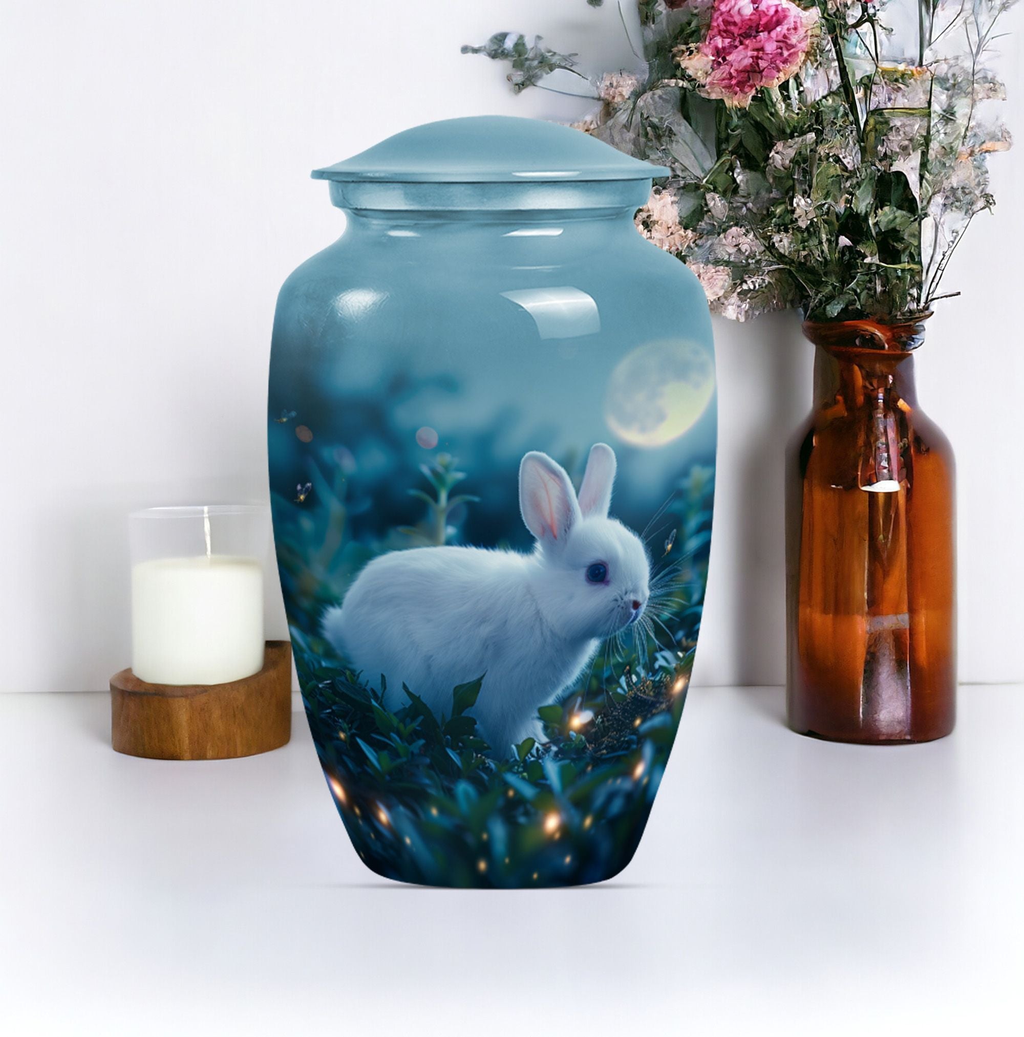 Preserve the memory of your beloved ones with our White Bunny Moon Urn, a comforting symbol of life's cyclical nature. Carefully crafted from premium aluminium, this 10-inch large urn has a weight of 3.3 pounds and can hold up to 200 cubic inches. Its classic and abstract theme pays homage to your memorable moments and timeless bonds. This cremation urn comes with a velvet pouch, offering a dignified containment for the ashes. Enrich its sentimental value by personalizing it with name engraving, giving another layer of remembrance to your missed ones. Perfect as outdoor urns or burial urns, make your memorial ceremony special with our unique funeral urn for adult ashes. Capture the essence of love and memories, and keep them alive in your hearts through our White Bunny Moon Urn, your own precious memorial urn for ashes for mom.