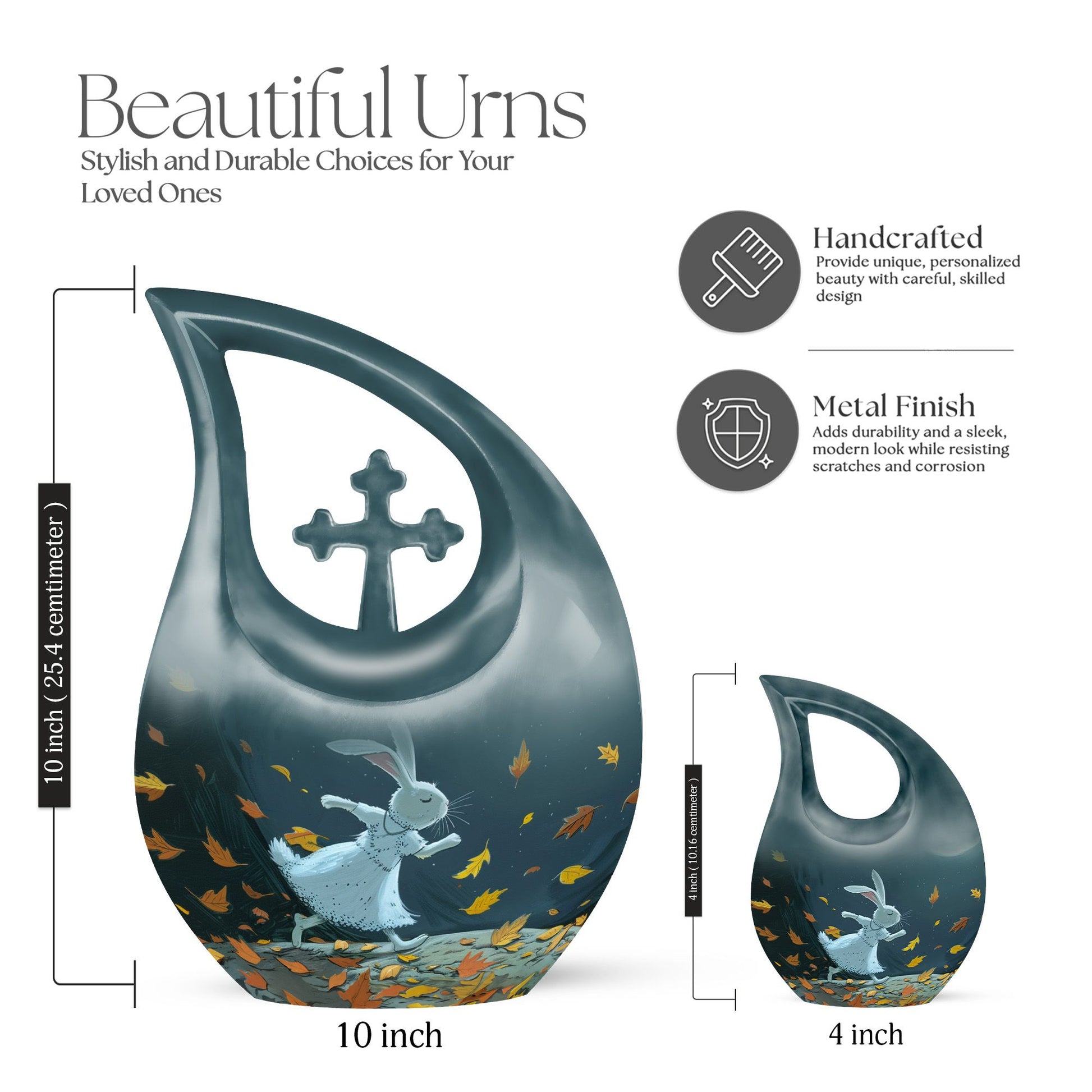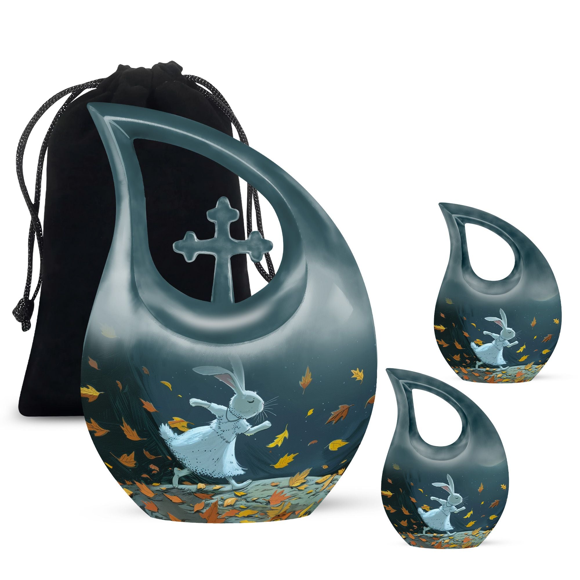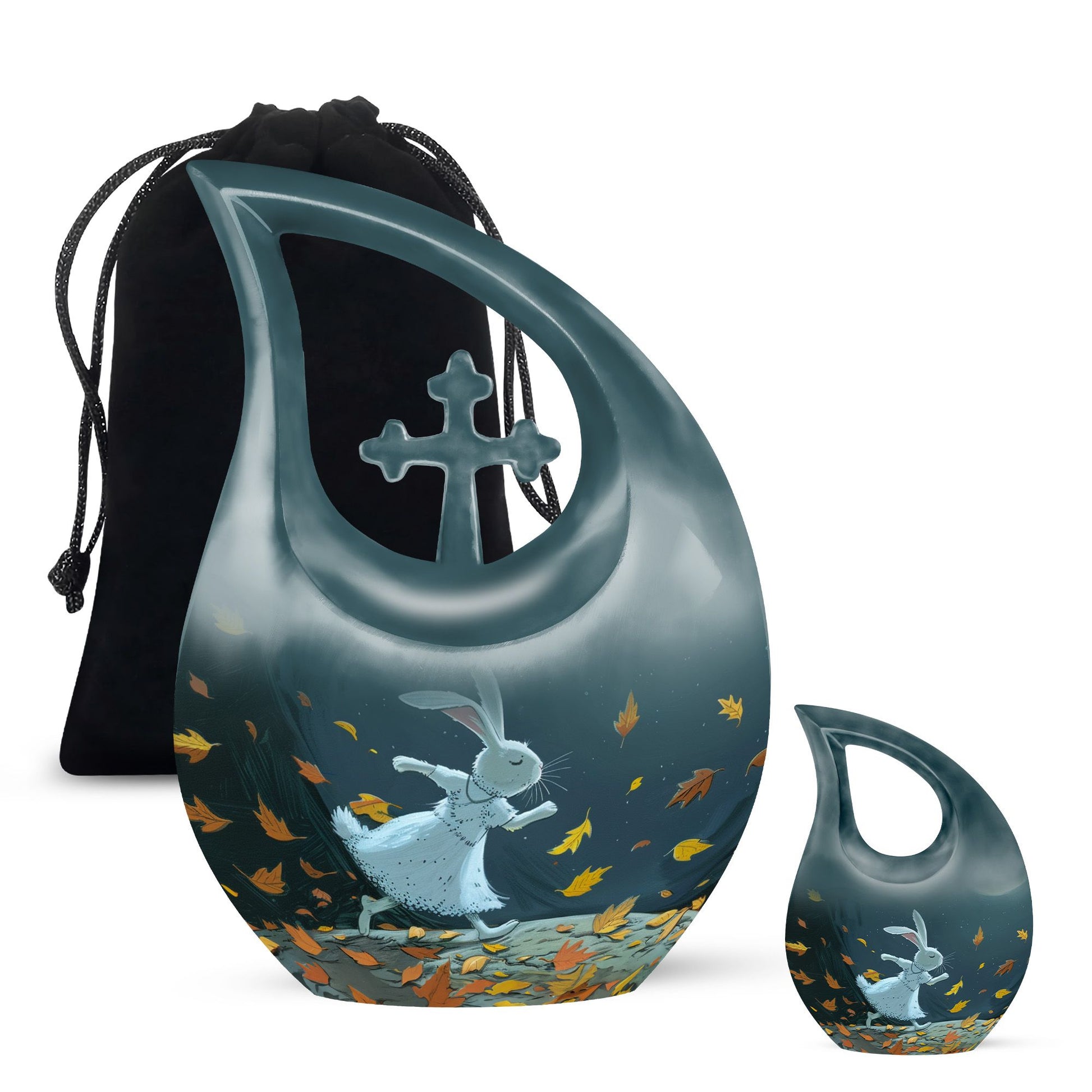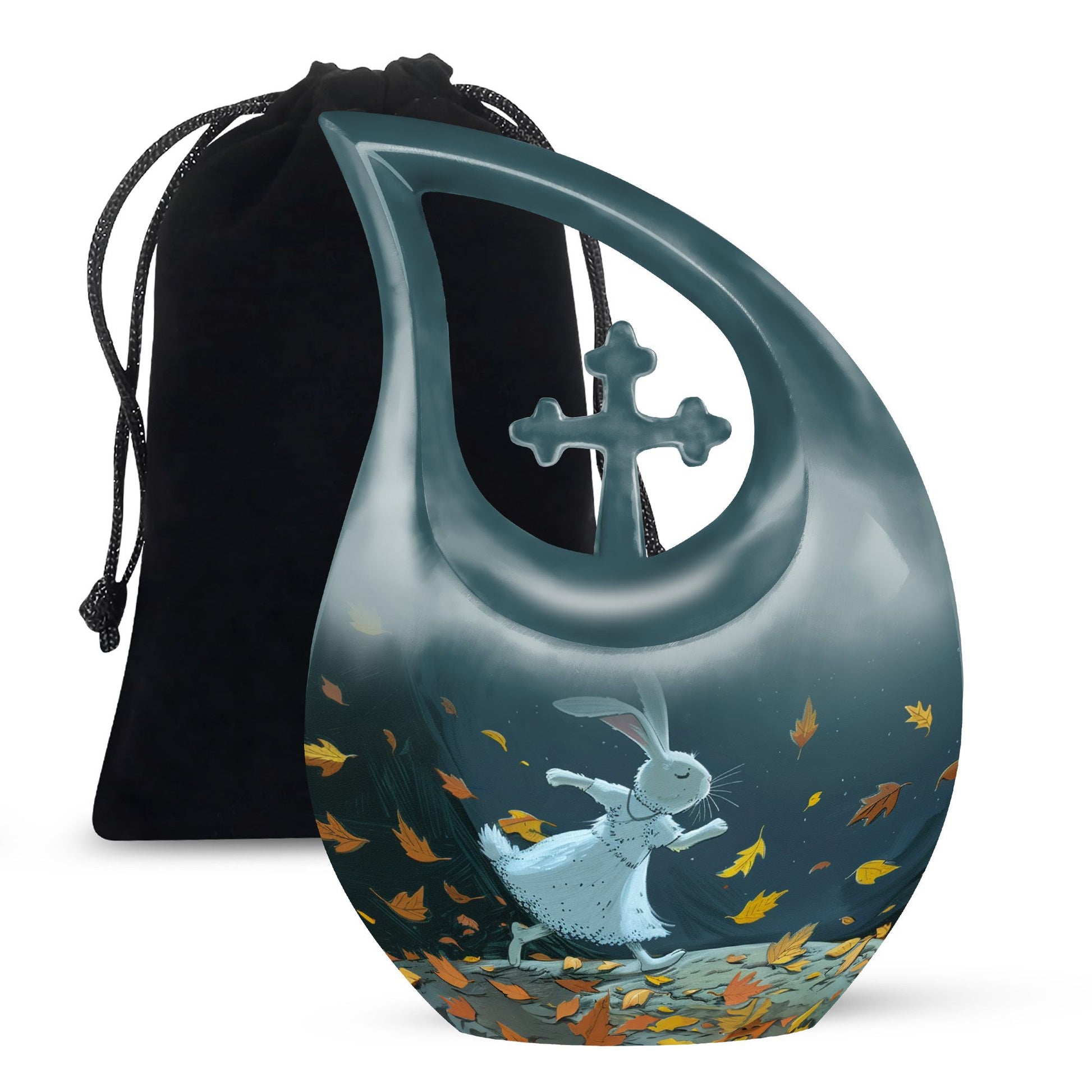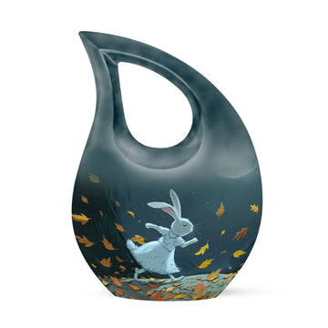 Honor the memory of your beloved one with our large White Bunny Moon Urn, which is perfect for adult and senior memorial ceremonies. This tastefully crafted urn has a unique Cross Drop design that embodies the sublime serenity of the White Bunny Moon theme. Handsomely made from durable aluminium, the urn has a substantial weight of 3.3 pounds and measures 10 inches in height. Despite its compact dimensions, this urn has a substantial capacity of 200 cubic inches, accommodating ashes with respect. To add a personal touch, you can also customize it with engraved names. A chic velvet pouch accompanies the urn, providing a dignified containment for ashes. Whether your search term is 'miniature urns', 'box urns for human ashes', or 'cremation containers', this 10-inch urn fits the bill perfectly and pays a fitting tribute to your dear departed.