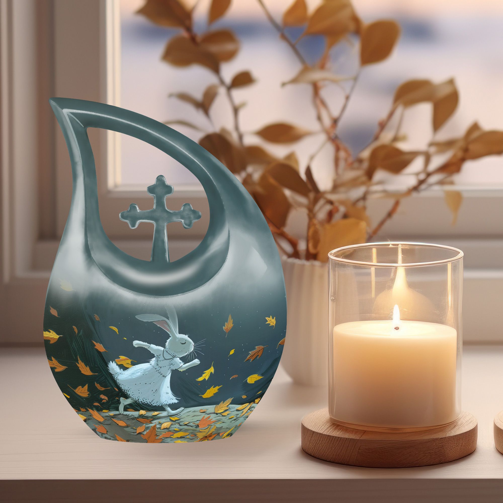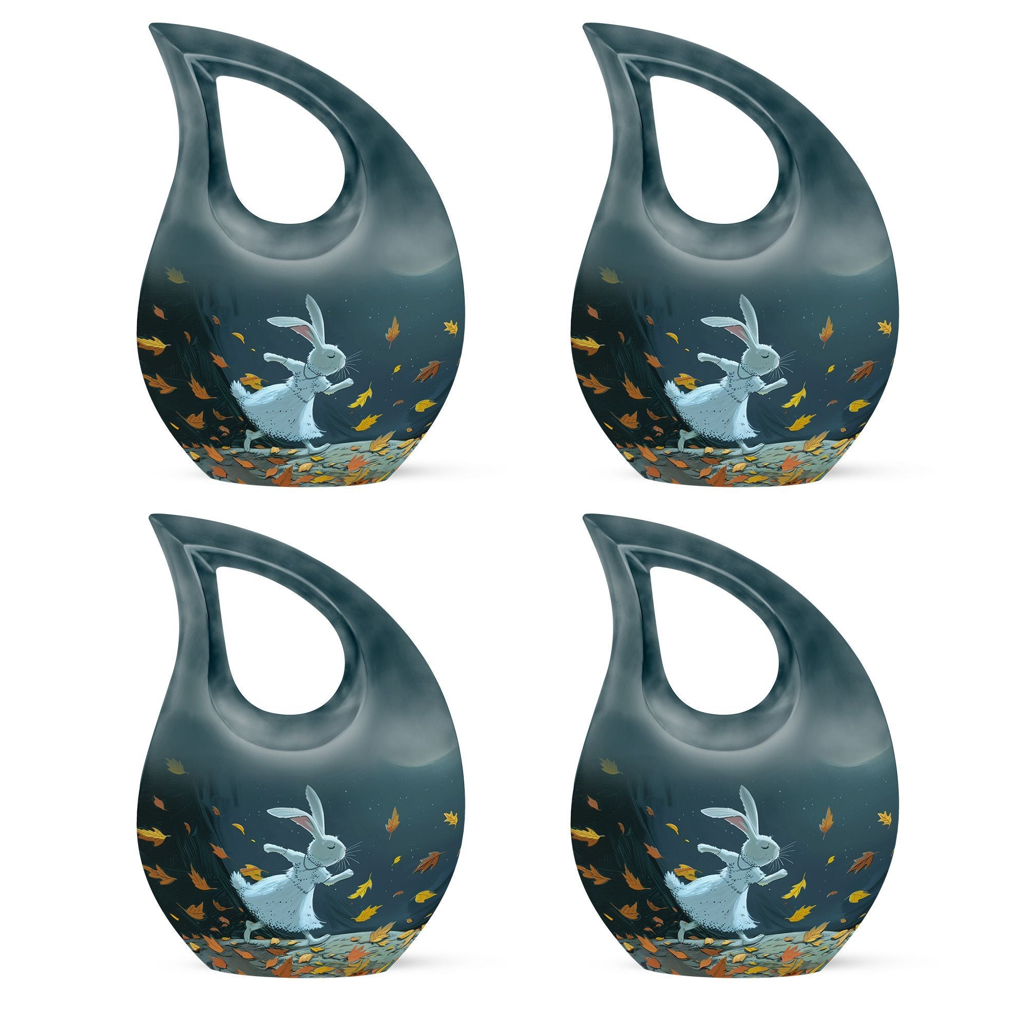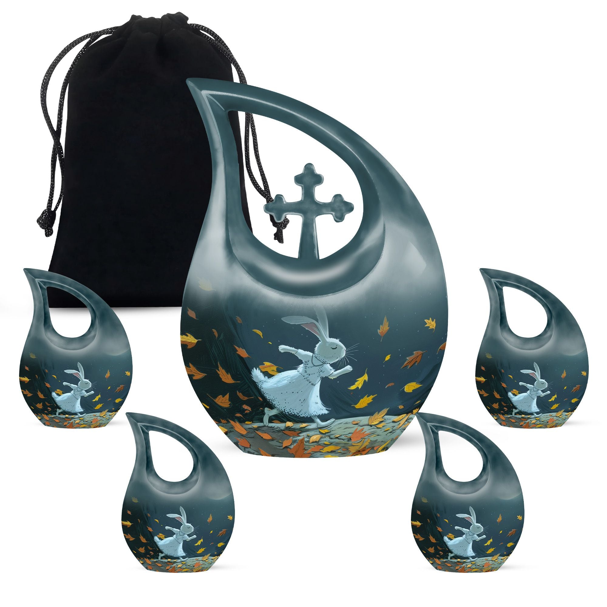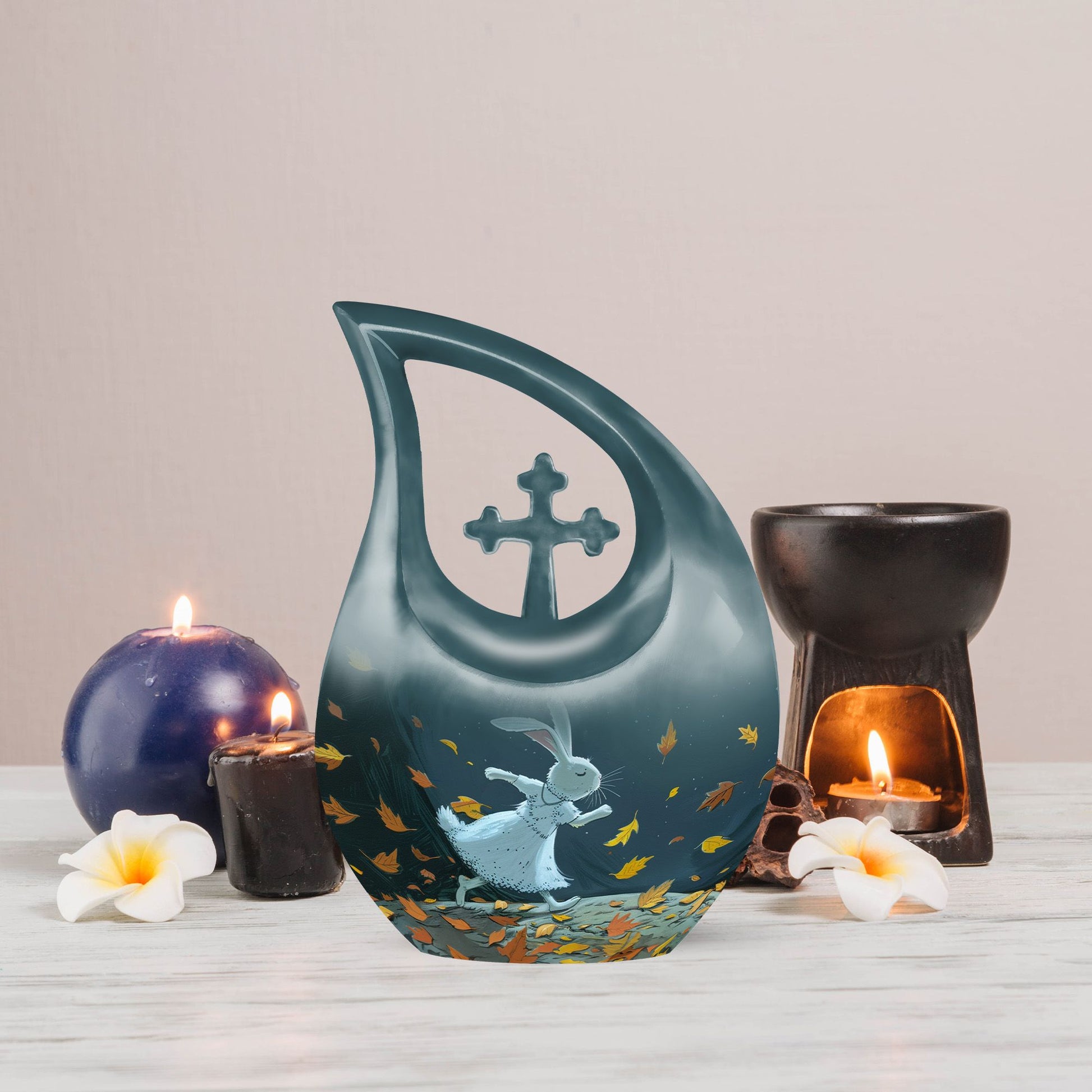 Honor the memory of your beloved one with our large White Bunny Moon Urn, which is perfect for adult and senior memorial ceremonies. This tastefully crafted urn has a unique Cross Drop design that embodies the sublime serenity of the White Bunny Moon theme. Handsomely made from durable aluminium, the urn has a substantial weight of 3.3 pounds and measures 10 inches in height. Despite its compact dimensions, this urn has a substantial capacity of 200 cubic inches, accommodating ashes with respect. To add a personal touch, you can also customize it with engraved names. A chic velvet pouch accompanies the urn, providing a dignified containment for ashes. Whether your search term is 'miniature urns', 'box urns for human ashes', or 'cremation containers', this 10-inch urn fits the bill perfectly and pays a fitting tribute to your dear departed.