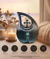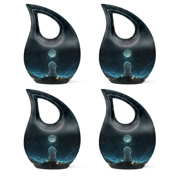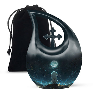 Crafted of robust aluminium, our White Bunny Moon Urn presents a thoughtful blend of durability and elegance for those shopping in the Religious & Ceremonial->Memorial Ceremony Supplies category. With its full size, the urn stands 10 inches tall and can accommodate up to 200 cubic inches of ashes, an ideal capacity for adult and senior use. Its weight of 3.3 pounds and the subtle Cross Drop motif emphasise the solid, enduring character of this product. Ensuring secure containment, the urn comes with a plush velvet pouch. Refined further by offering personalization, families can engrave their loved one's names on the urn, adding a unique touch of tribute. Avoid the common, opt for this Beautiful Urn that serves as a commendable vessel for your beloved's final rest. Remember, this Large Urn is not merely a memorial urn, it’s a piece that’s as precious and singular as the memories held within. Consider our product if you are seeking decorative and burial urns for human ashes.