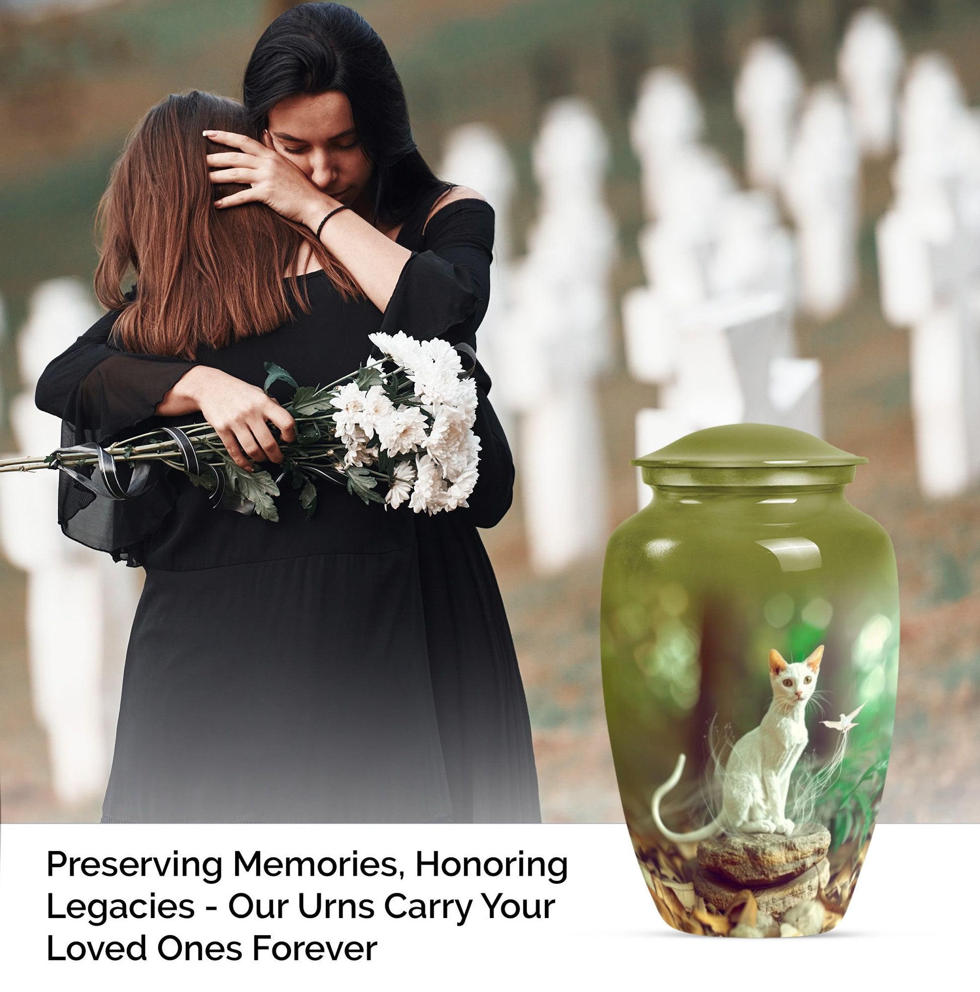 Eternal rest has never been so elegant with our Classic White Cat Urn, a stunning piece serving as a respectful resting place for your lamented loved ones. This finely crafted burial ashes urn is ideal for seniors and adults in matters religious and ceremonial. Created from high-grade Aluminium, this 10-inch urn weighs 3.3 pounds, providing substantial and reposing beauty. The superior build provides a capacity of 200 cubic inches, ample room for cherished remains. This large urn oozes abstract charm, echoing not only the love but also personalized memories, with the option to engrave names on it. Alongside the urn, a velvet pouch completes the set, an exquisite containment for ashes. Also noteworthy as a cremation funeral urn, this urn for human ash humans is versatile for various ceremonial rites or memorials. Revive those peace-filled moments with this striking urn for cremation ashes, a perfect tribute to eternal love.