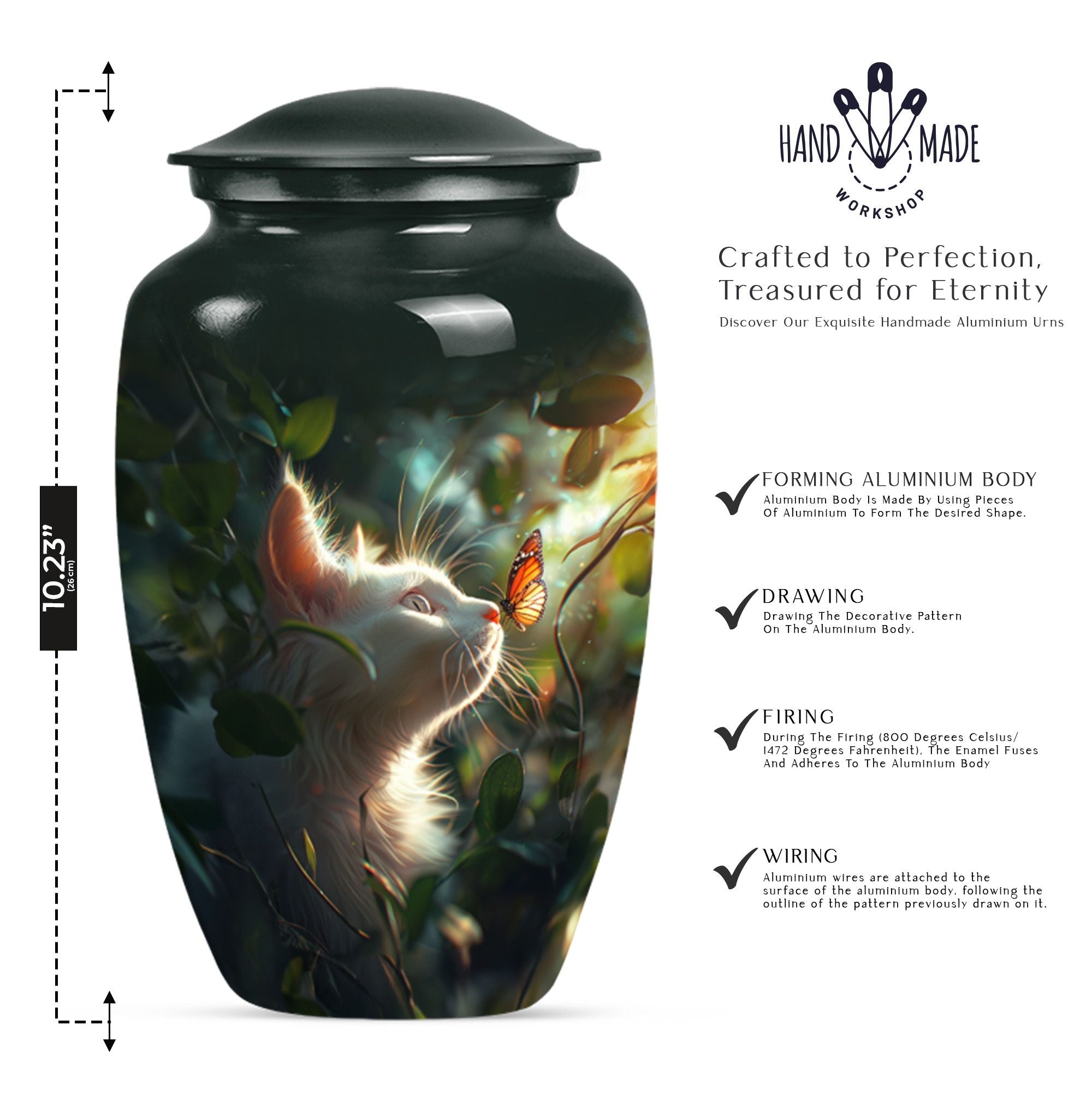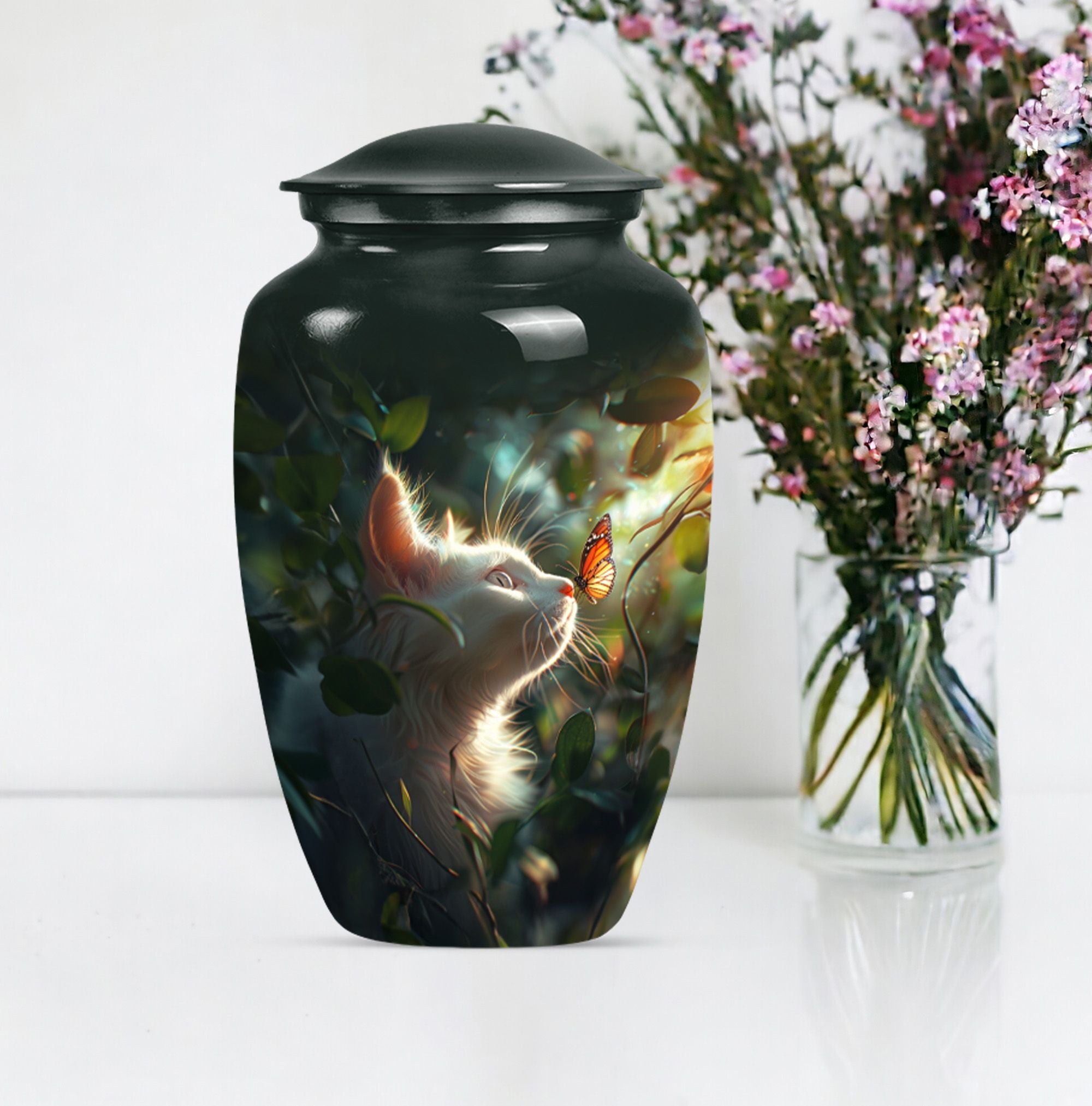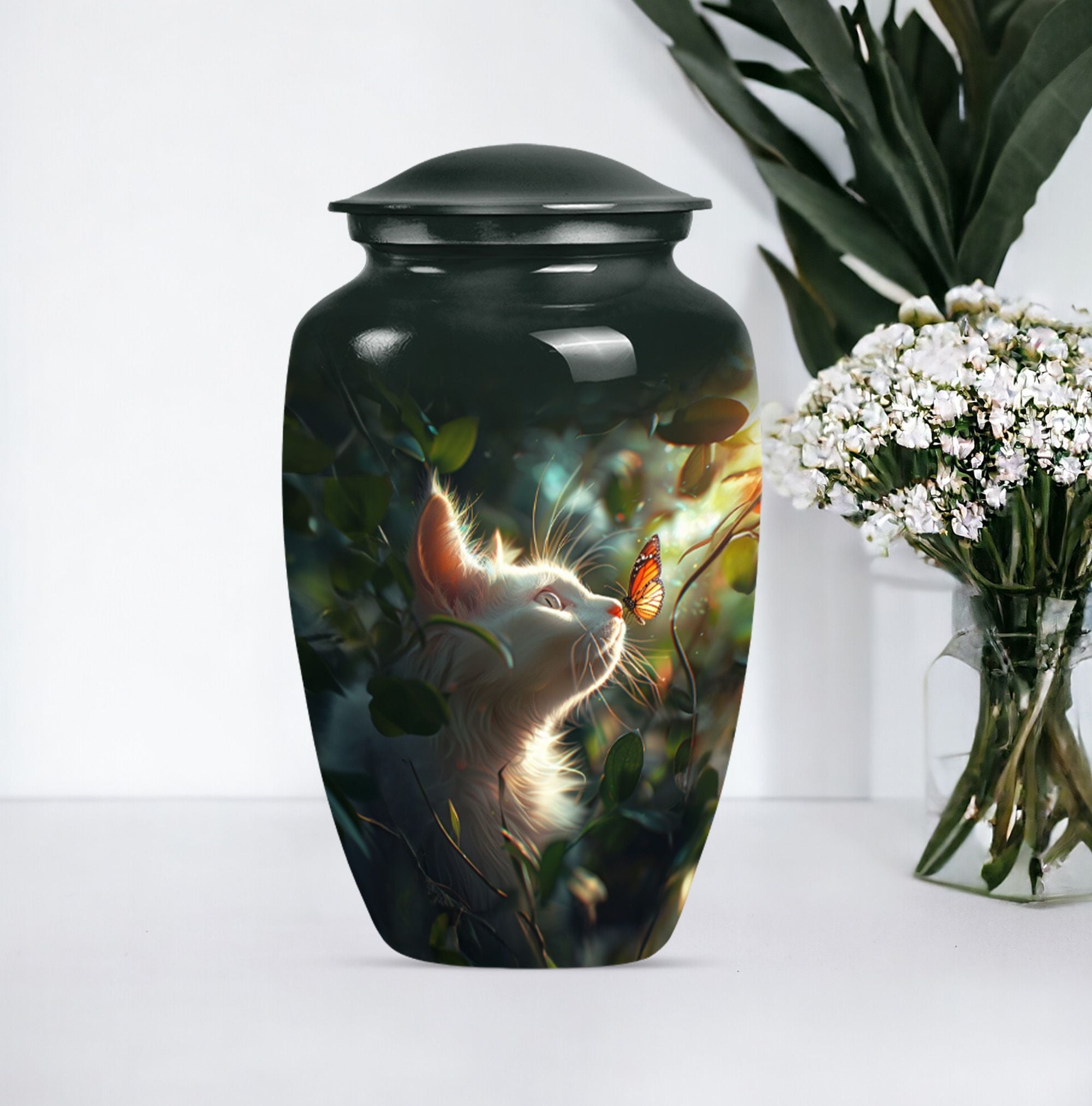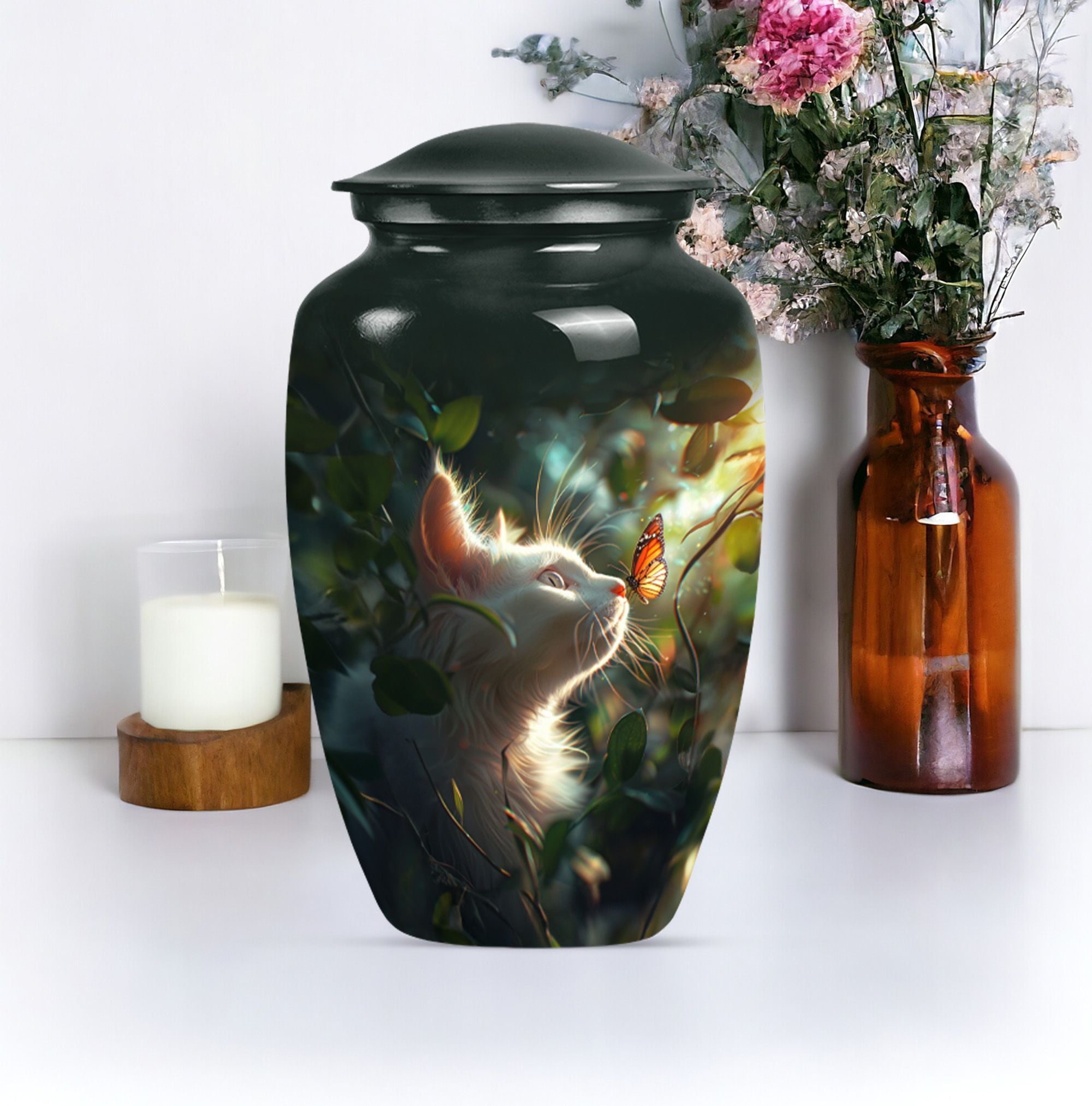 Honor your departed loved ones with our exquisite white cat urn, a precious tribute to their timeless memories. Our sizeable 10-inch urn is elegantly crafted from high-quality aluminium, epitomizing the balance between endurance and delicacy. The urn’s abstract theme adds a unique aesthetic appeal to it, considerably enhancing its value as a memorial. Our item offers an impressive 200 cubic inches capacity, ensuring sufficient space for adult human ashes. Each package includes a plush velvet pouch, adding an extra layer of protection and reverence for the precious contents. Ease your worries about any potential mishandling as the urn weighs only 3.3 pounds. Add a heartwarming touch to the memorial with our personalization option that allows you to engrave names onto the urn. Whether it’s for a funeral or burial, our cremation urn serves as an ideal medium urn for human ashes. Cherish your loved ones’ memory with the rich aesthetics and durability of our aluminium urn while ensuring a comprehensive memorial experience.