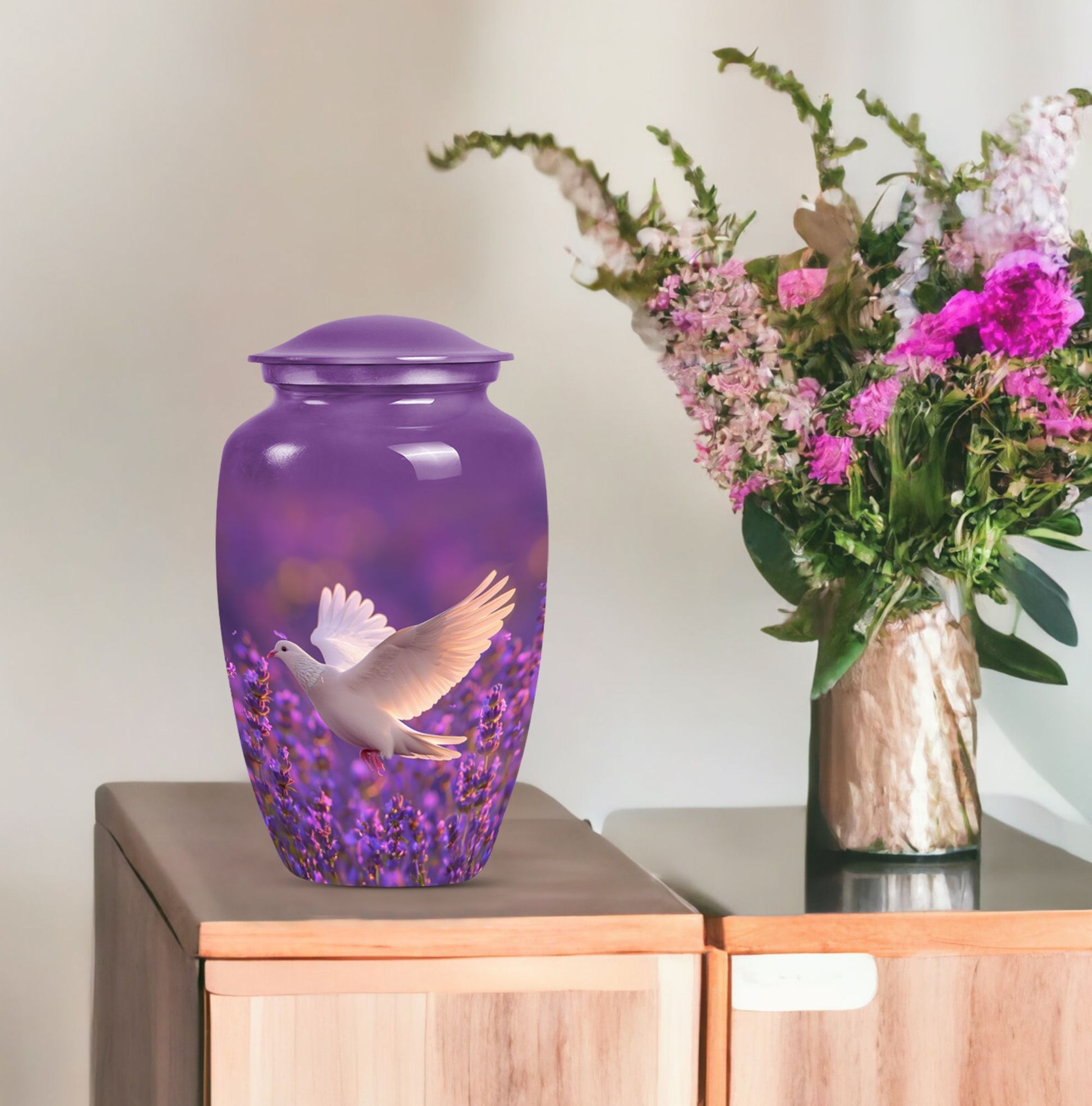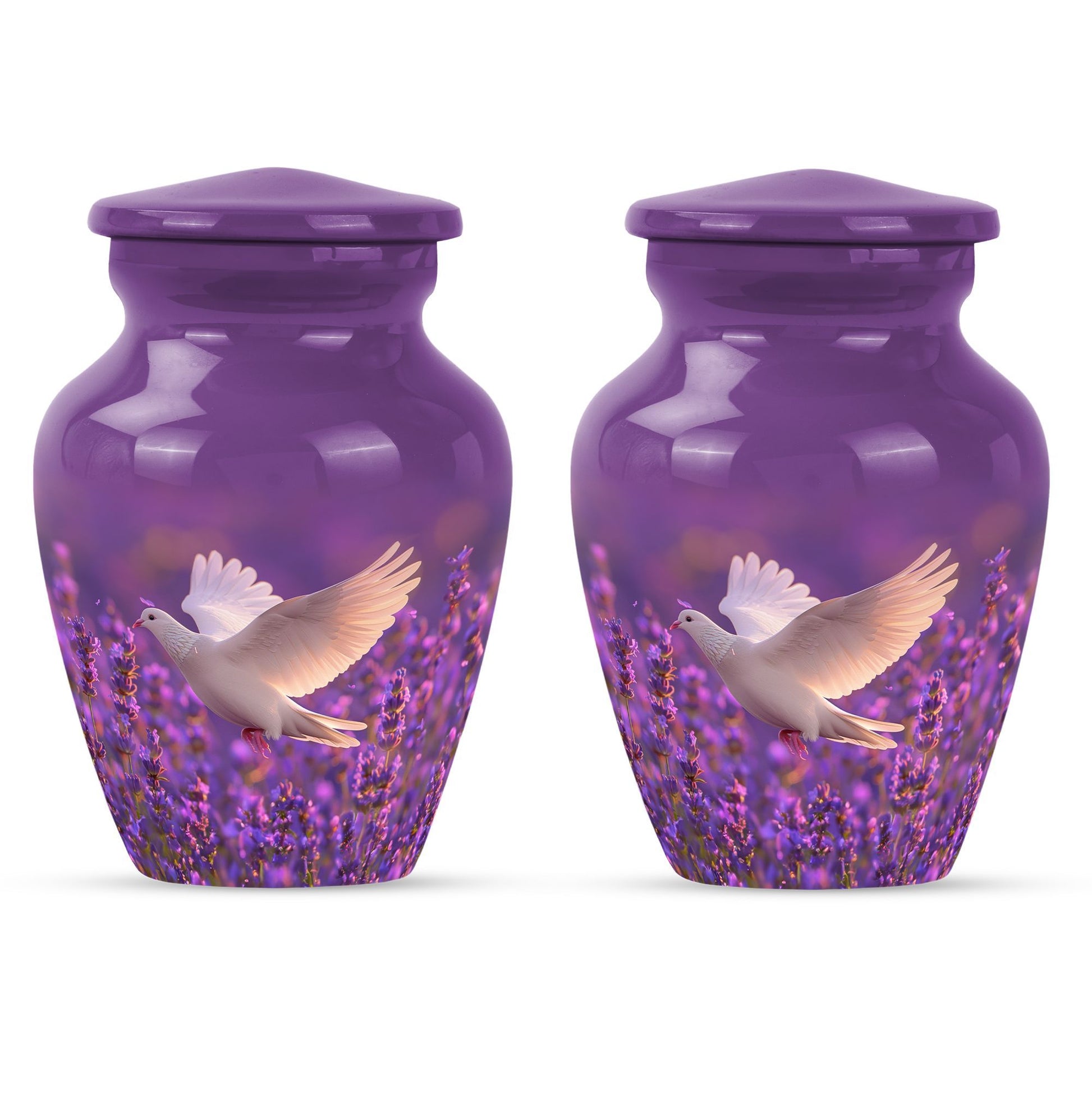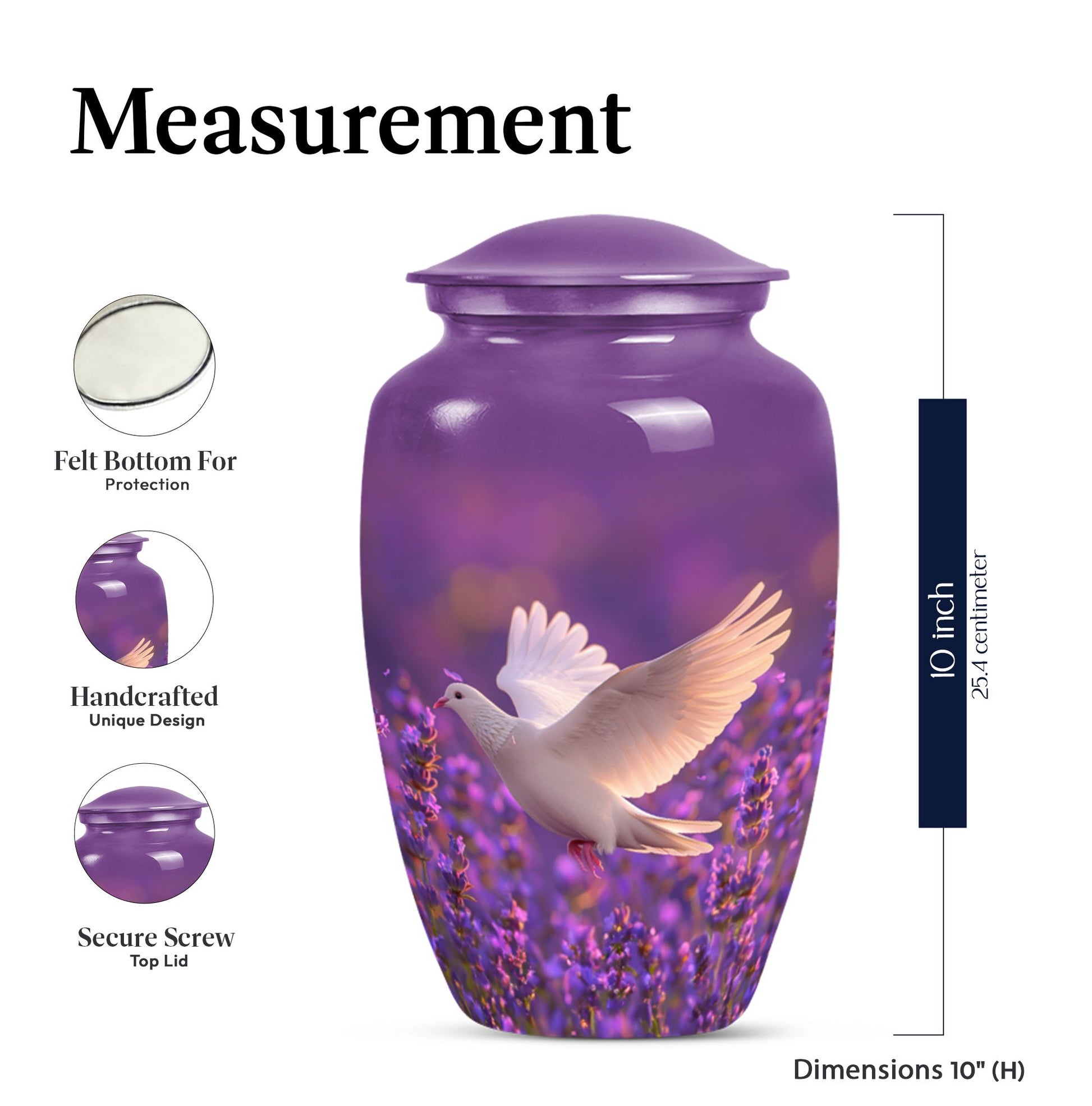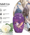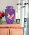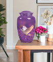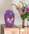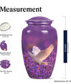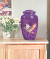 Immerse in the soothing tranquility of honoring your dearly departed with our 'White Dove on Purple Urn'. Reverently crafted from premium aluminium, this 10-inch large urn carries a classic design (barring the Design attribute), radiating a serene gentleness that softly echoes the love you still hold. Ideal for memorial ceremonies, this burial urn comfortably houses 200 cubic inches of ashes, with each package including a velvet pouch for respectful containment. Weighing a mere 3.3 pounds, the urn's sizeable structure doesn't compromise on mobility. Situated atop the design is a gentle butterfly, symbolizing transformation and hope. Personalize this memorial urn with engraved names, adding a touch of warmth to memorialize your loved one. Perfect for adults and seniors drawn to the tasteful heritage of traditional memorial urns, this substantial urn is a dignified commemoration of a life lovingly lived. Explore the serenity of remembrance with our meticulously crafted memorial funeral urn - a stately memento of love eternal.