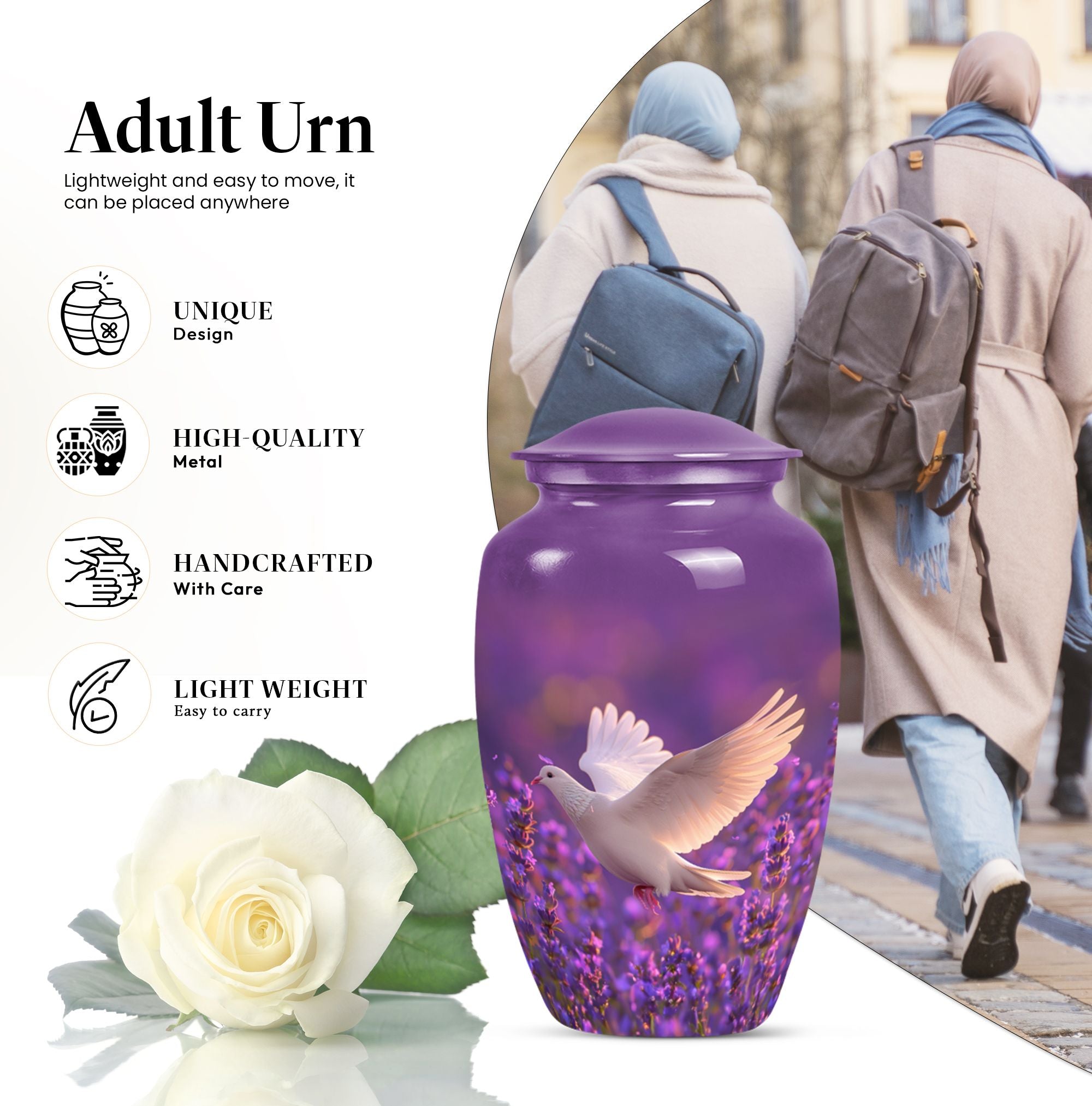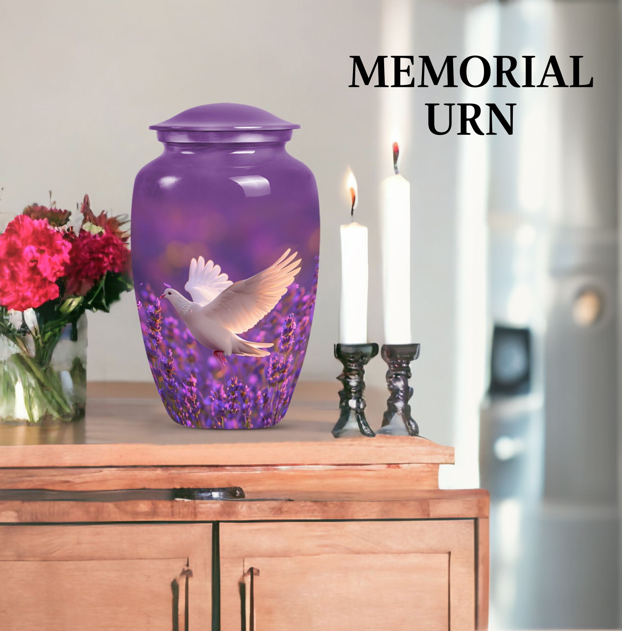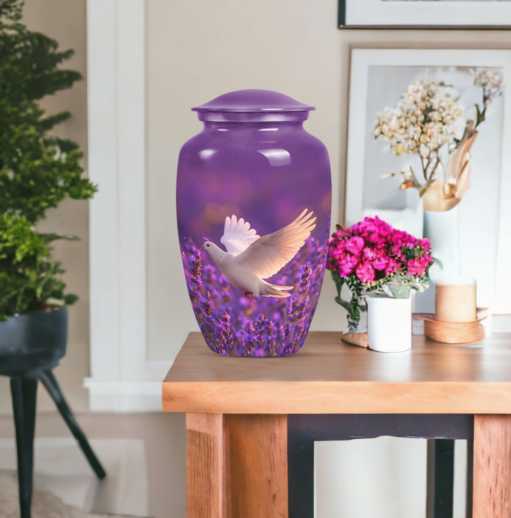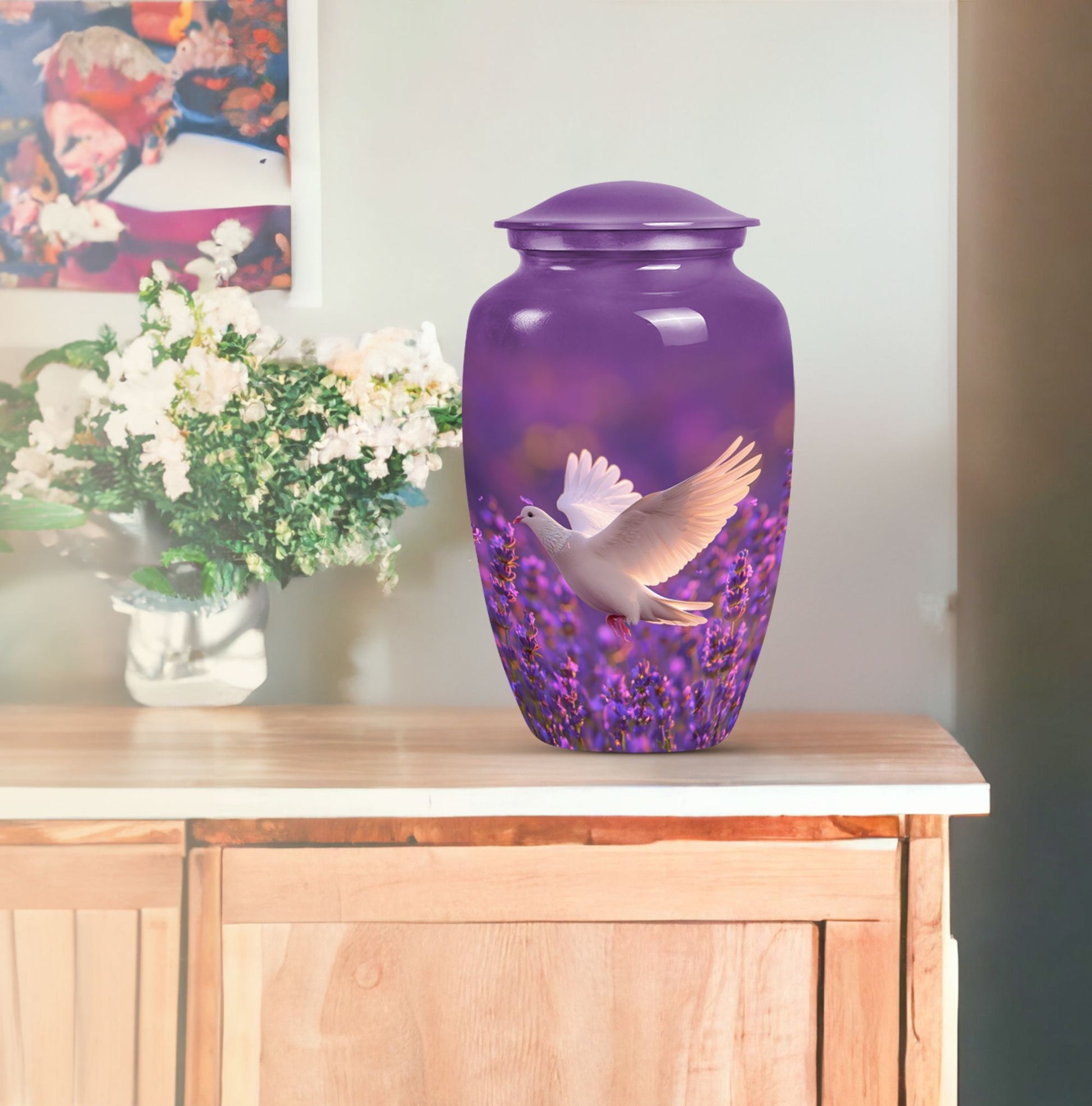 Immerse in the soothing tranquility of honoring your dearly departed with our 'White Dove on Purple Urn'. Reverently crafted from premium aluminium, this 10-inch large urn carries a classic design (barring the Design attribute), radiating a serene gentleness that softly echoes the love you still hold. Ideal for memorial ceremonies, this burial urn comfortably houses 200 cubic inches of ashes, with each package including a velvet pouch for respectful containment. Weighing a mere 3.3 pounds, the urn's sizeable structure doesn't compromise on mobility. Situated atop the design is a gentle butterfly, symbolizing transformation and hope. Personalize this memorial urn with engraved names, adding a touch of warmth to memorialize your loved one. Perfect for adults and seniors drawn to the tasteful heritage of traditional memorial urns, this substantial urn is a dignified commemoration of a life lovingly lived. Explore the serenity of remembrance with our meticulously crafted memorial funeral urn - a stately memento of love eternal.